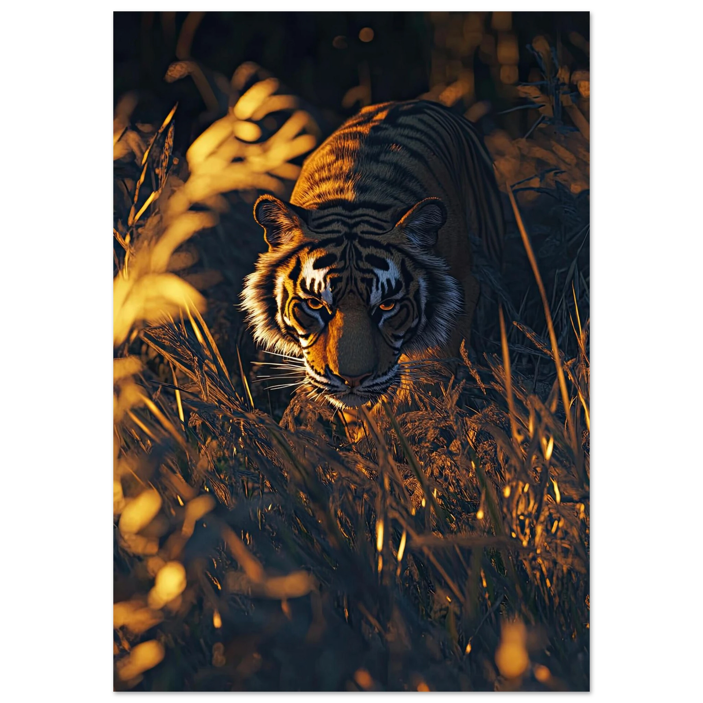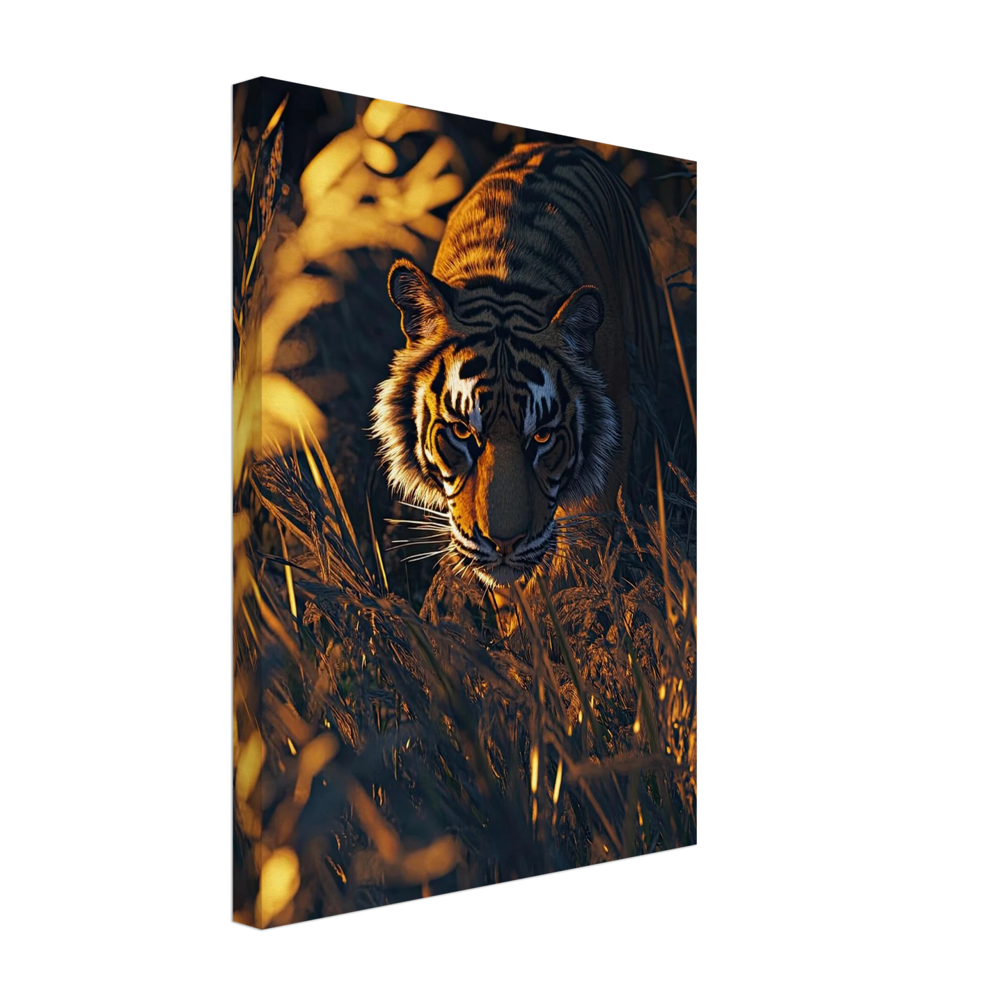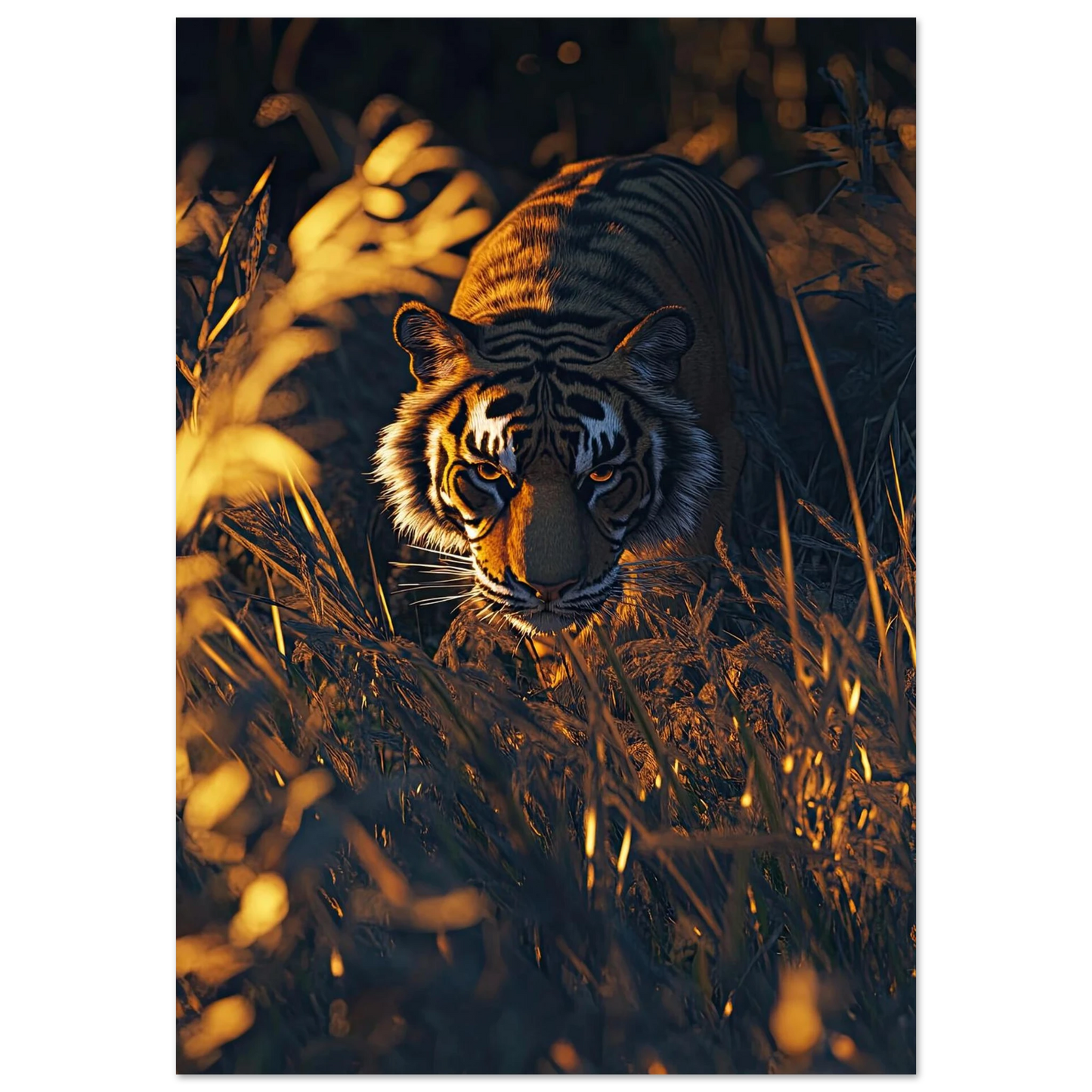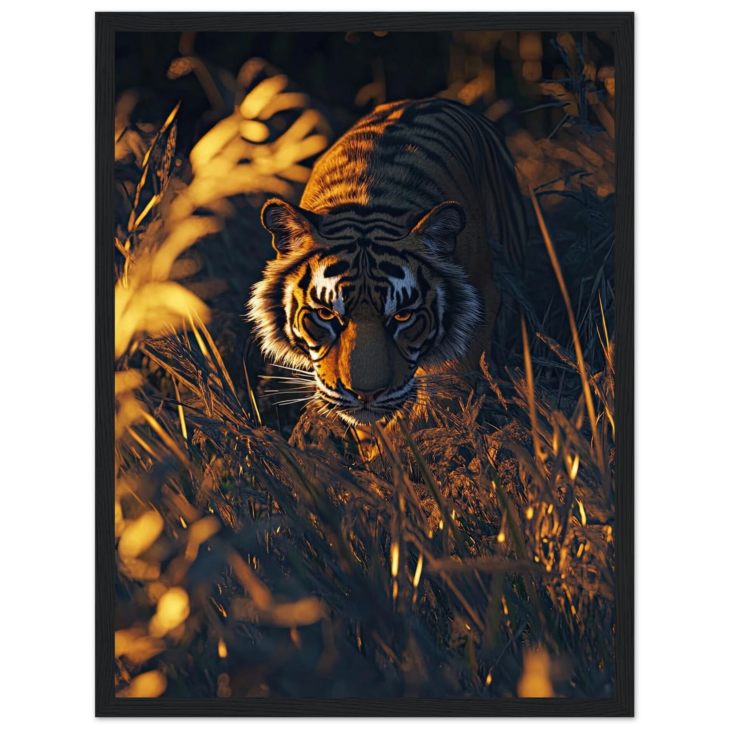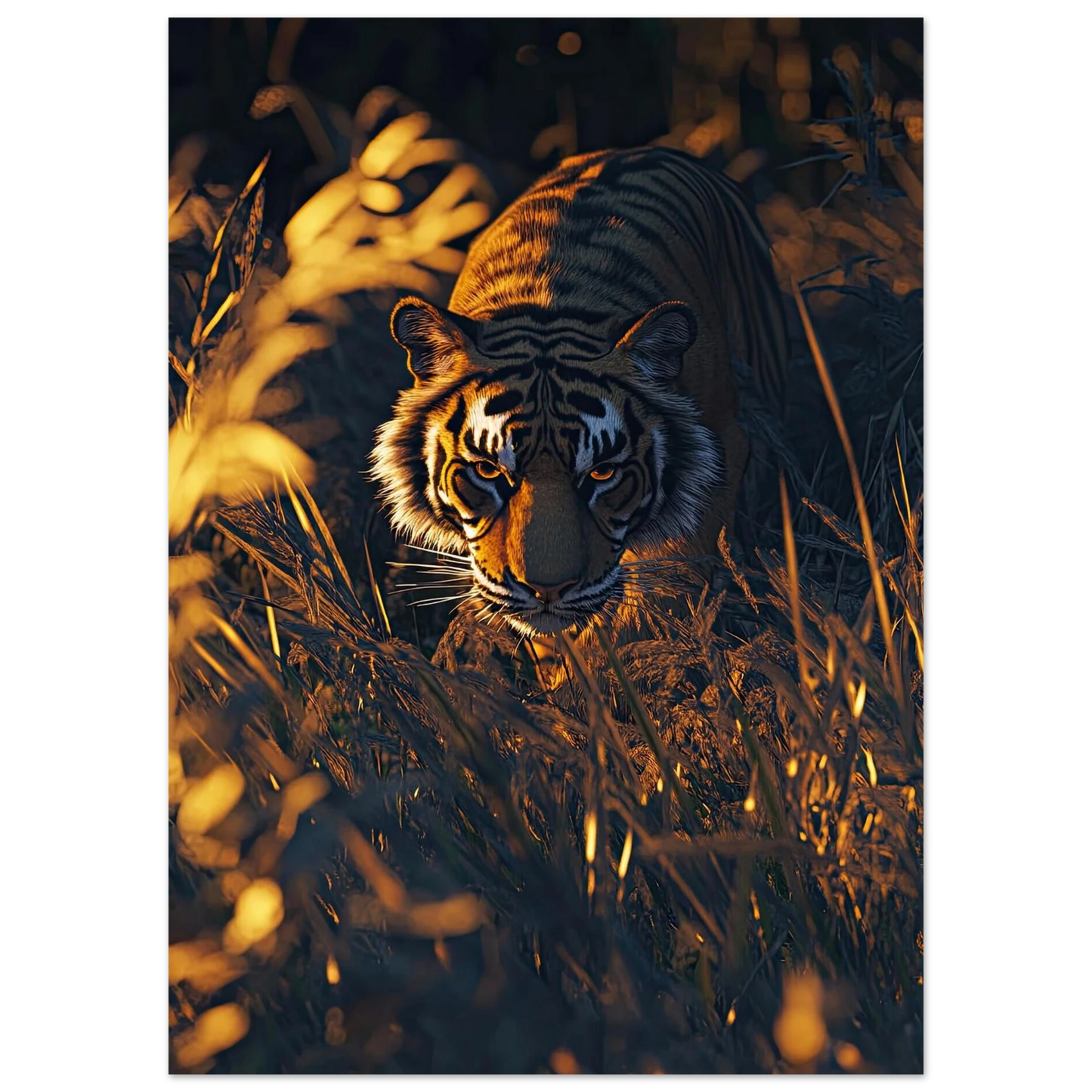 Et kraftfullt kunstverk som fanger tigeren i øyeblikket før handling. Den intense gløden i blikket og det varme lyset gir bildet en elektrisk spenning. Perfekt for deg som ønsker kunst med rå kraft og majestetisk tilstedeværelse.