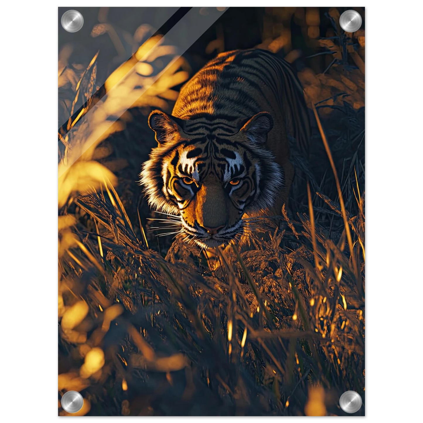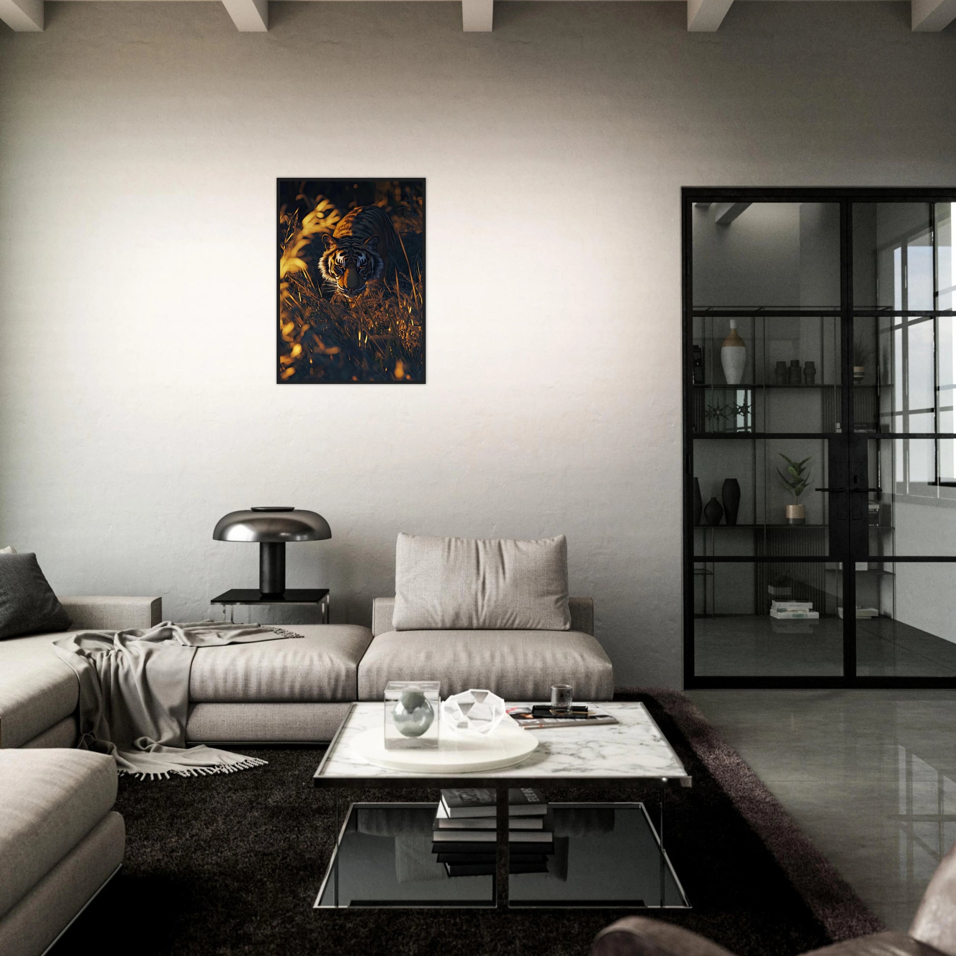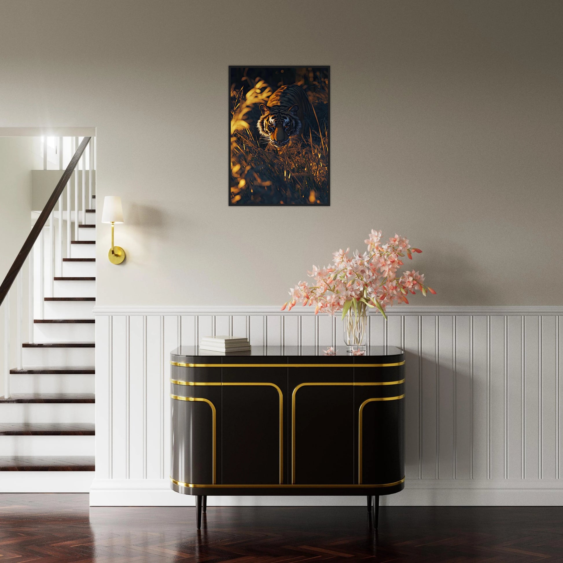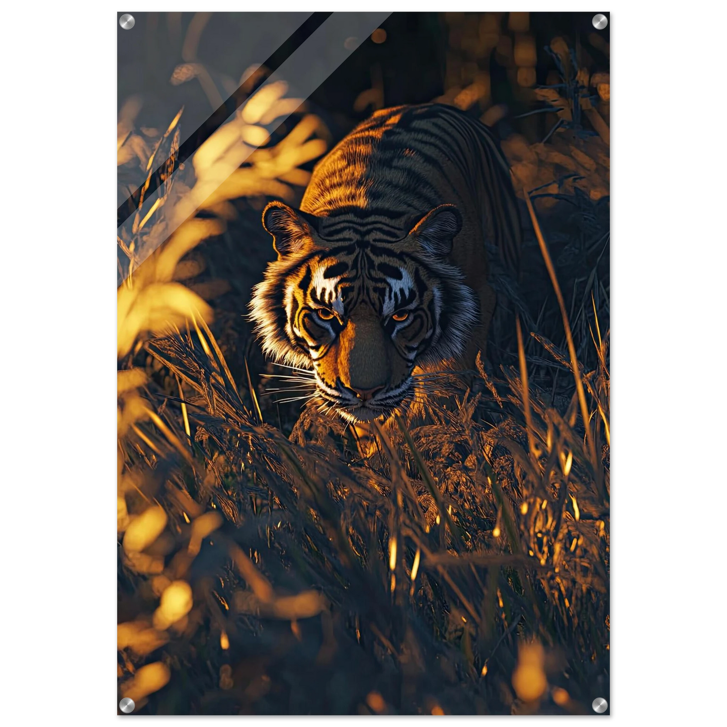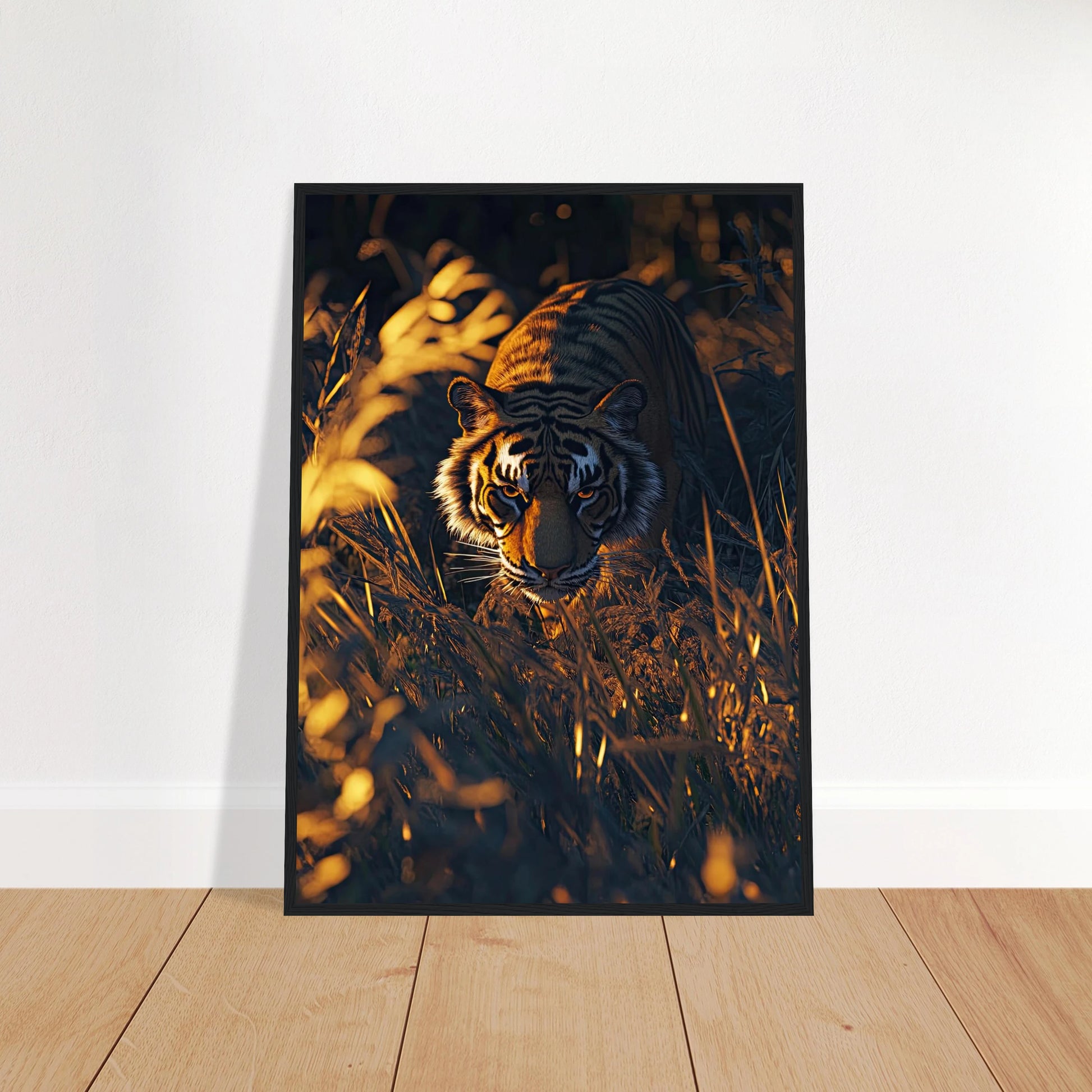 Et kraftfullt kunstverk som fanger tigeren i øyeblikket før handling. Den intense gløden i blikket og det varme lyset gir bildet en elektrisk spenning. Perfekt for deg som ønsker kunst med rå kraft og majestetisk tilstedeværelse.