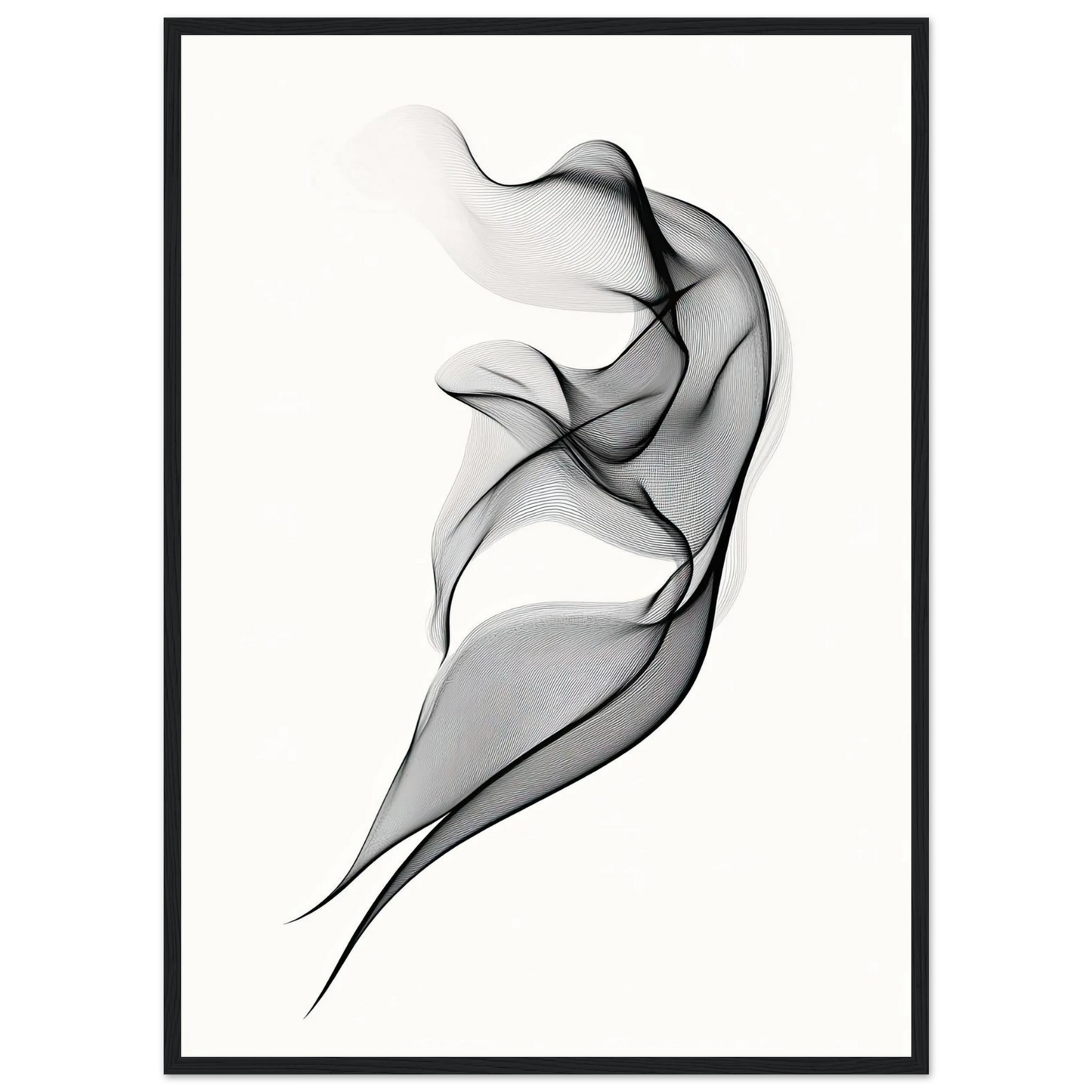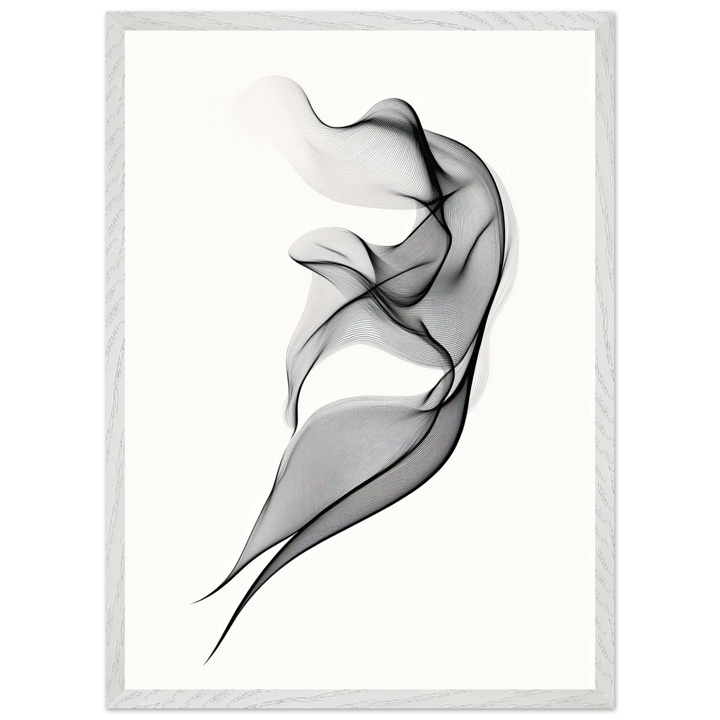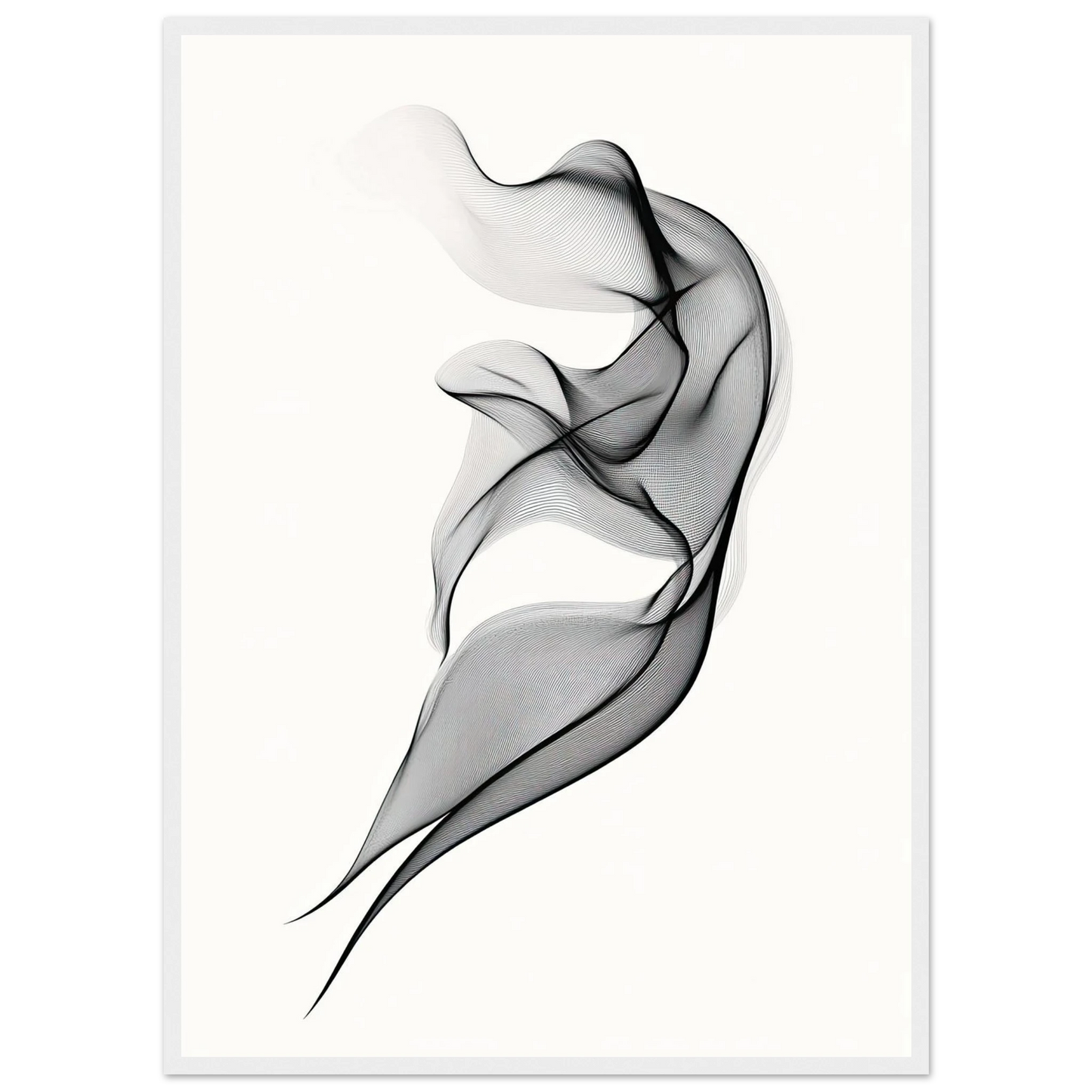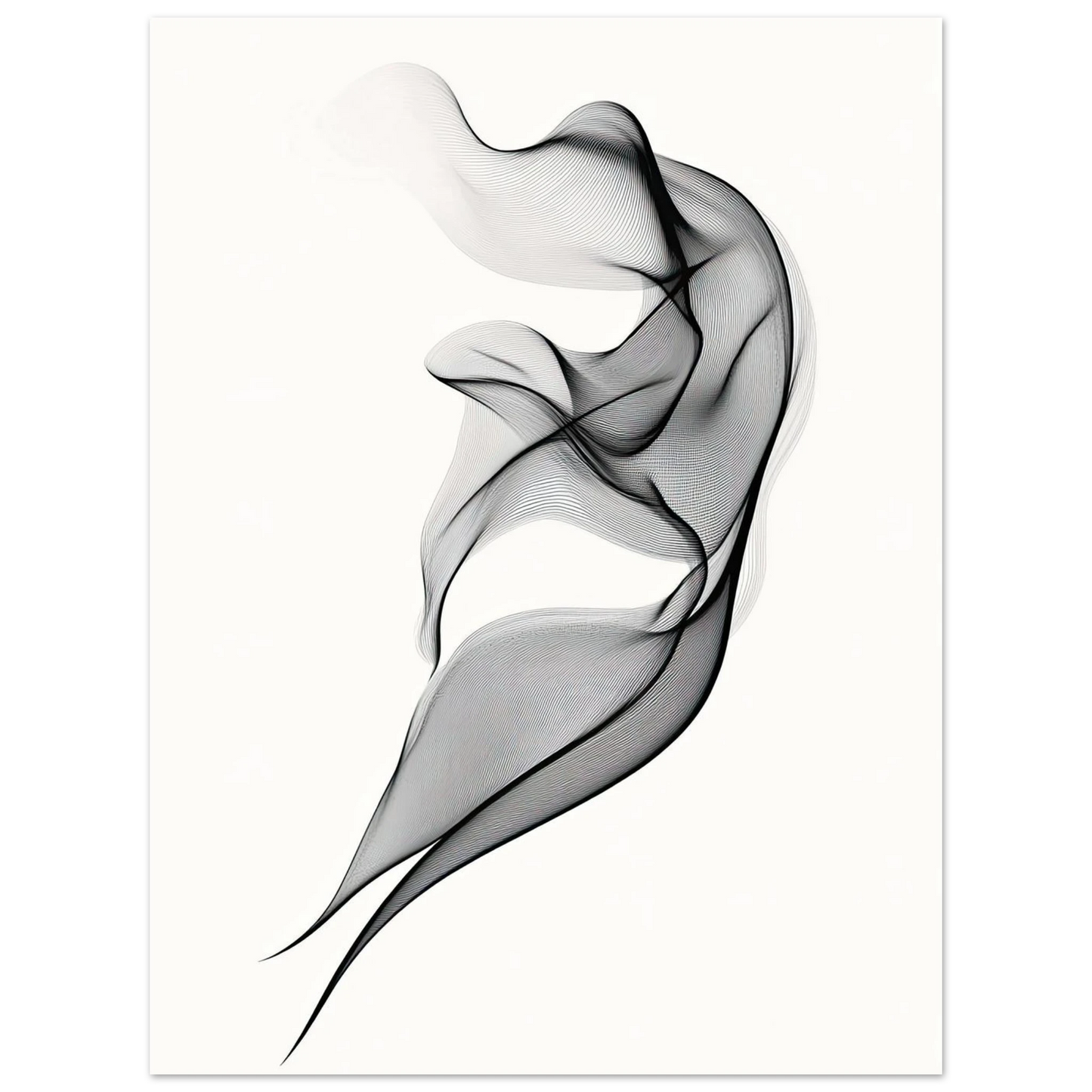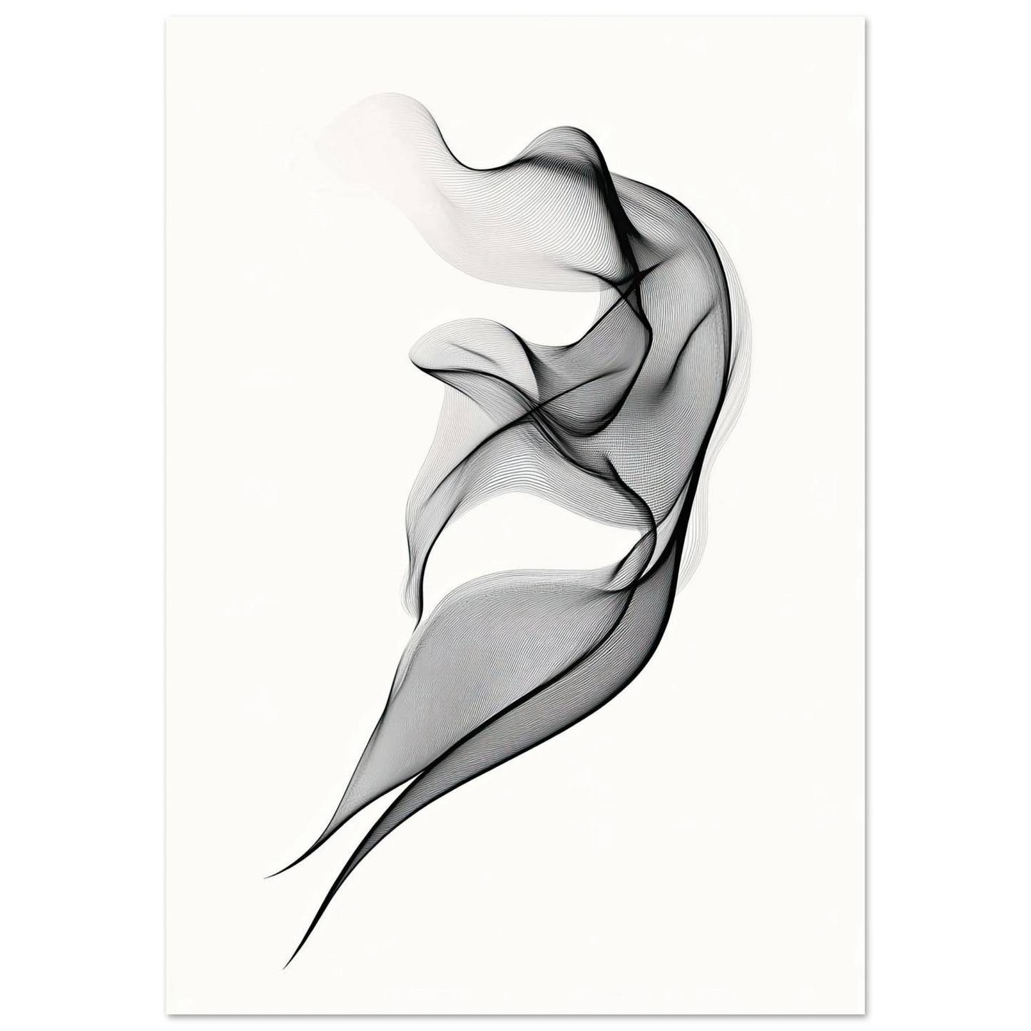 Et elegant minimalistisk kunstverk der tynne svarte linjer danner en svevende form mot en hvit bakgrunn. Den abstrakte figuren minner om både røyk, tekstil og dans, og gir en følelse av letthet og bevegelse. Perfekt for deg som ønsker et motiv som er både subtilt og sofistikert.