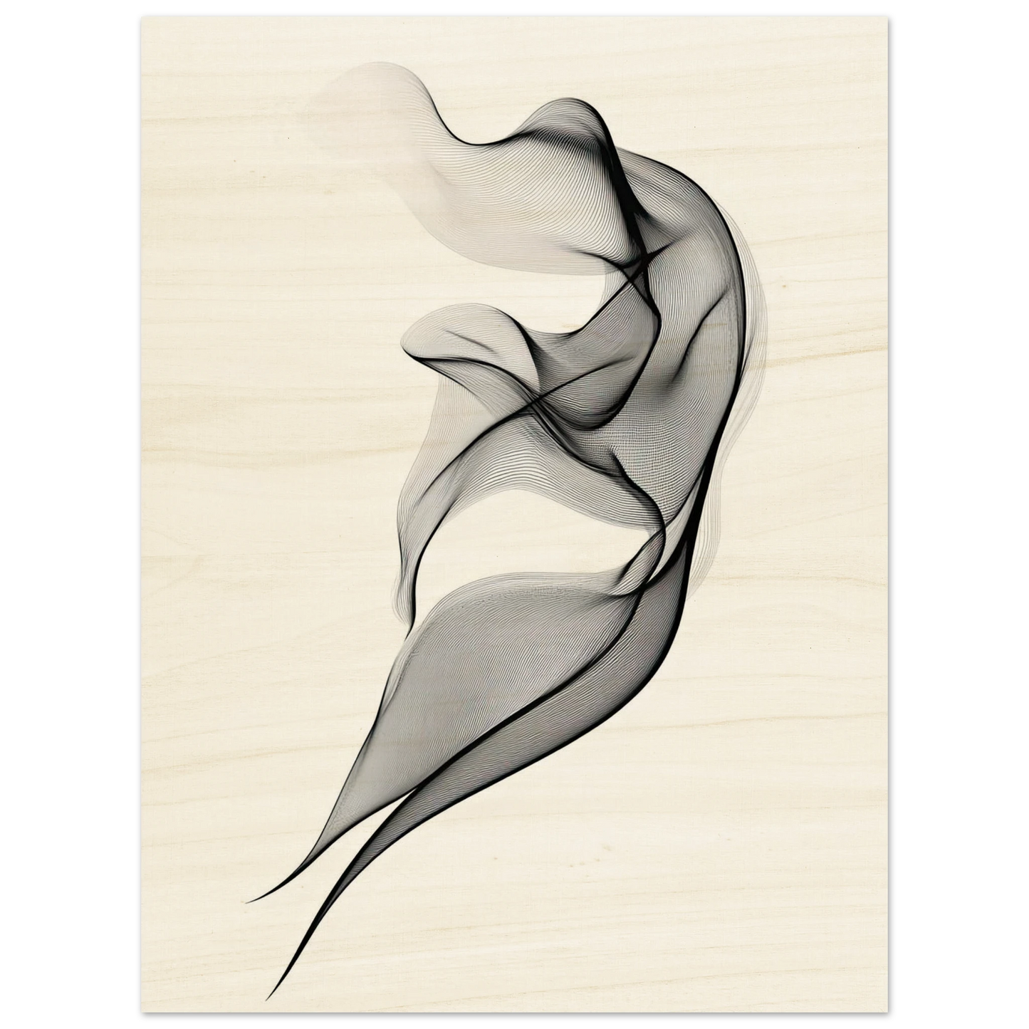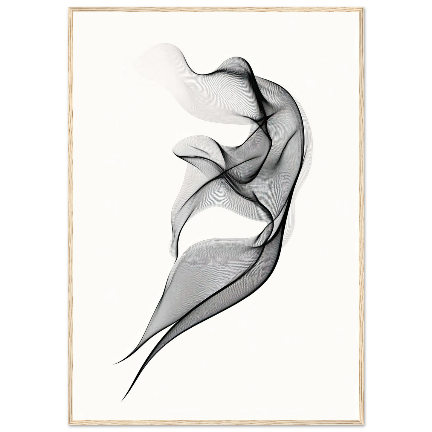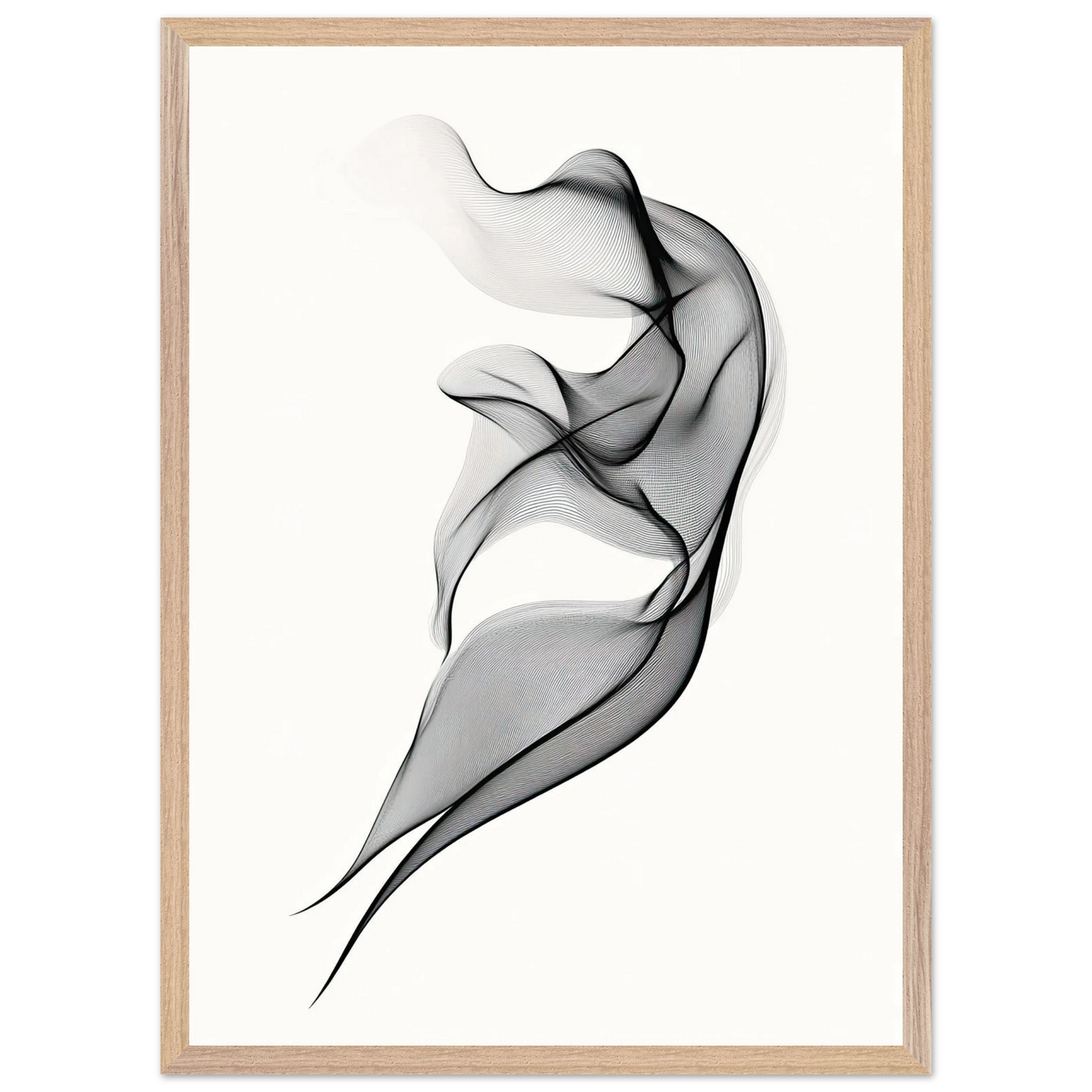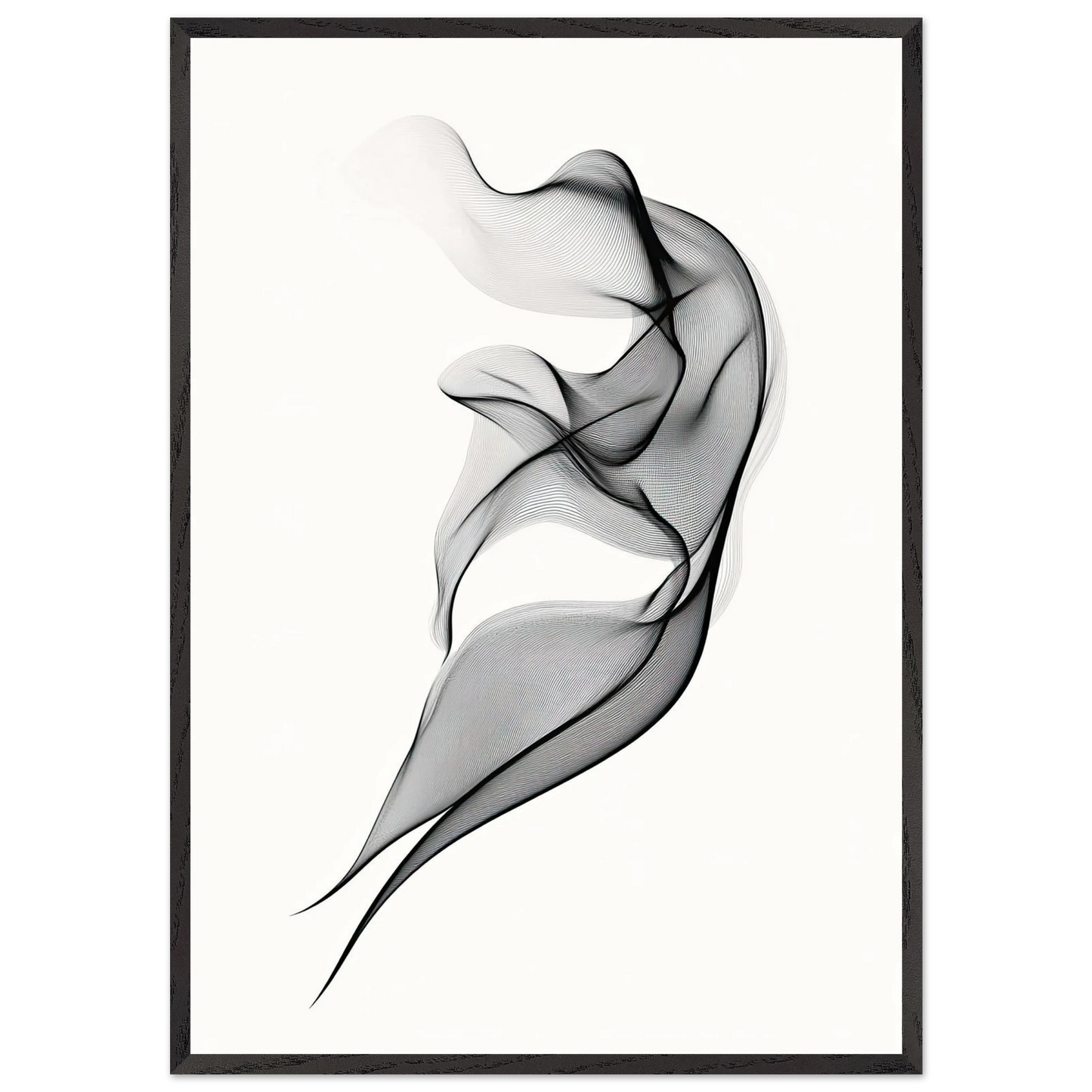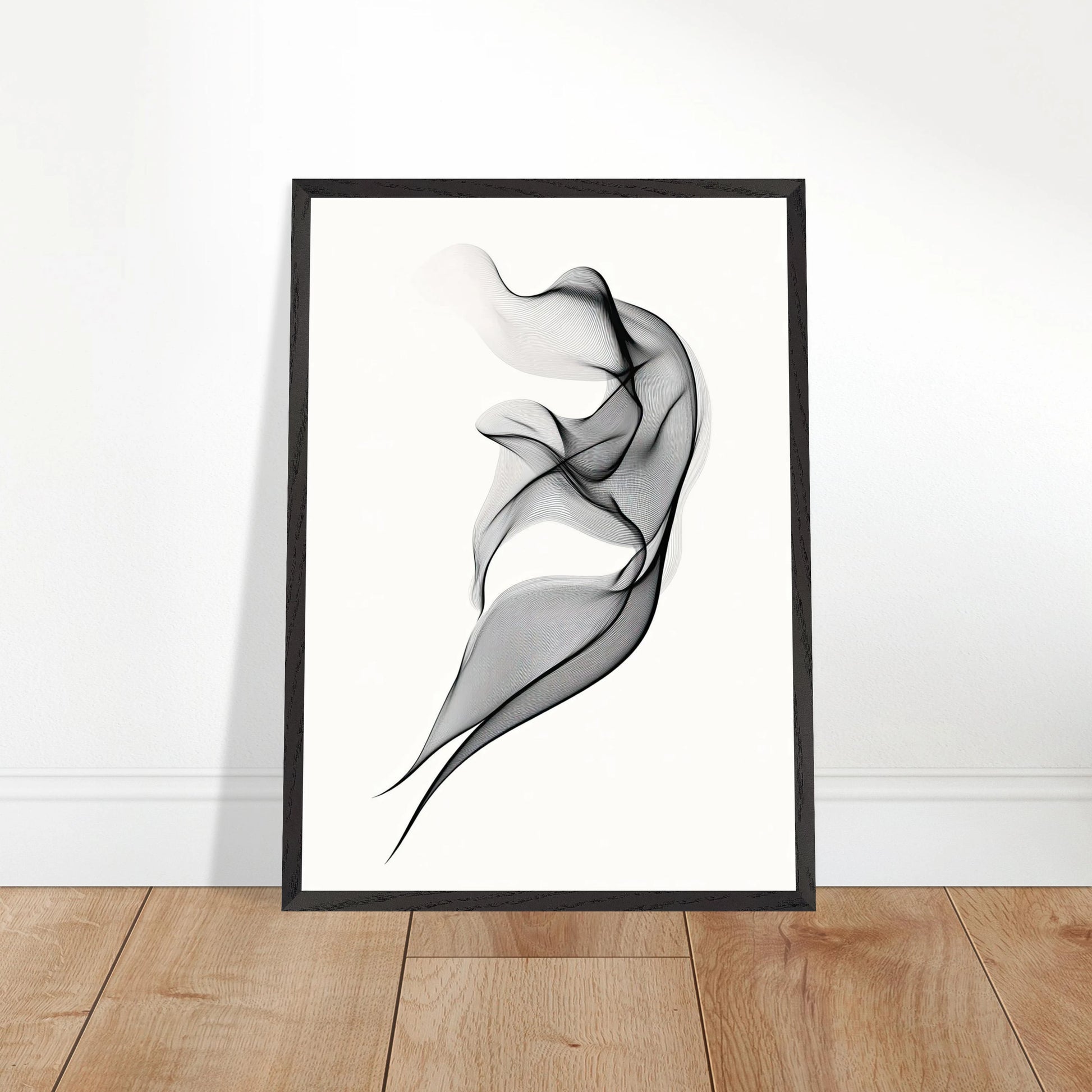 Et elegant minimalistisk kunstverk der tynne svarte linjer danner en svevende form mot en hvit bakgrunn. Den abstrakte figuren minner om både røyk, tekstil og dans, og gir en følelse av letthet og bevegelse. Perfekt for deg som ønsker et motiv som er både subtilt og sofistikert.