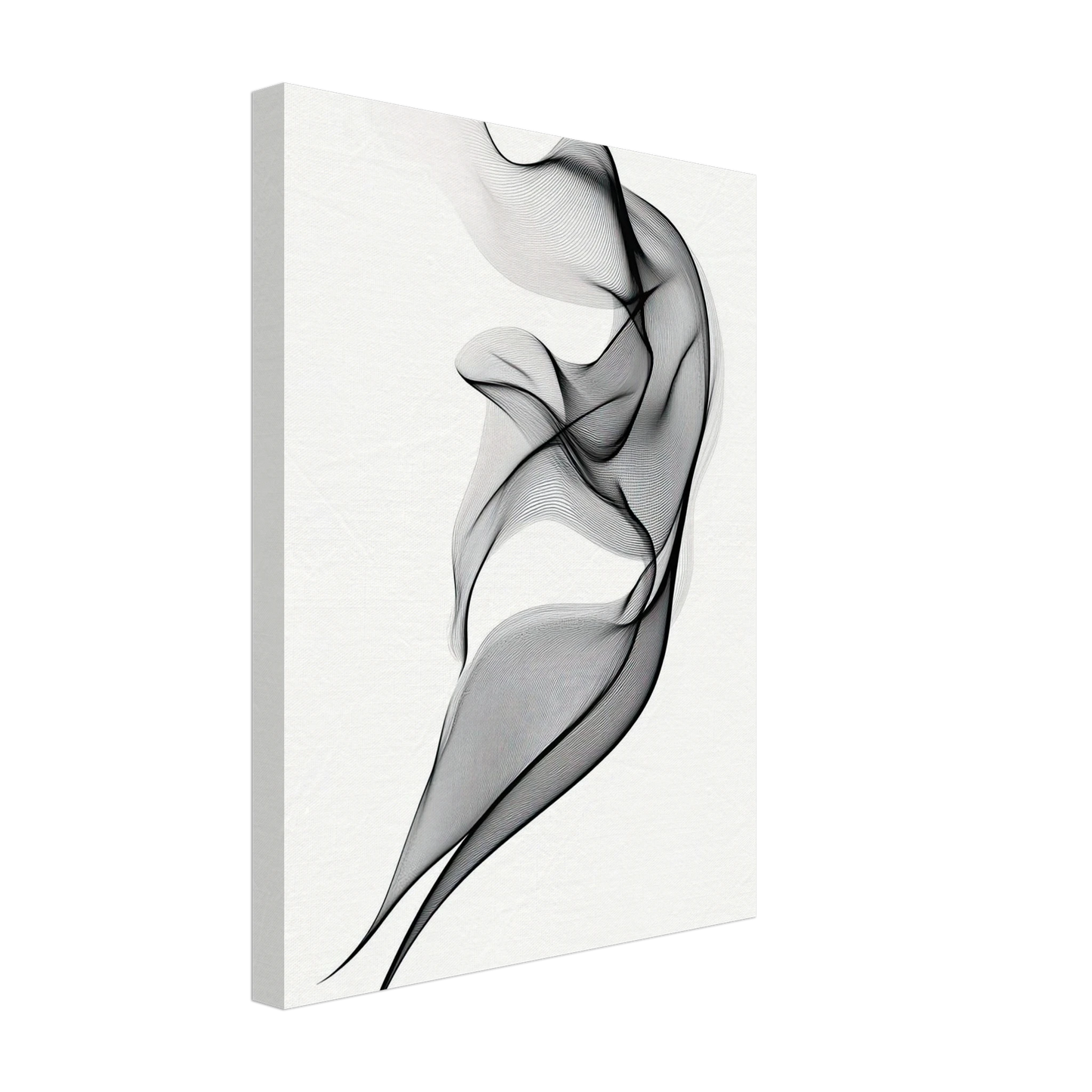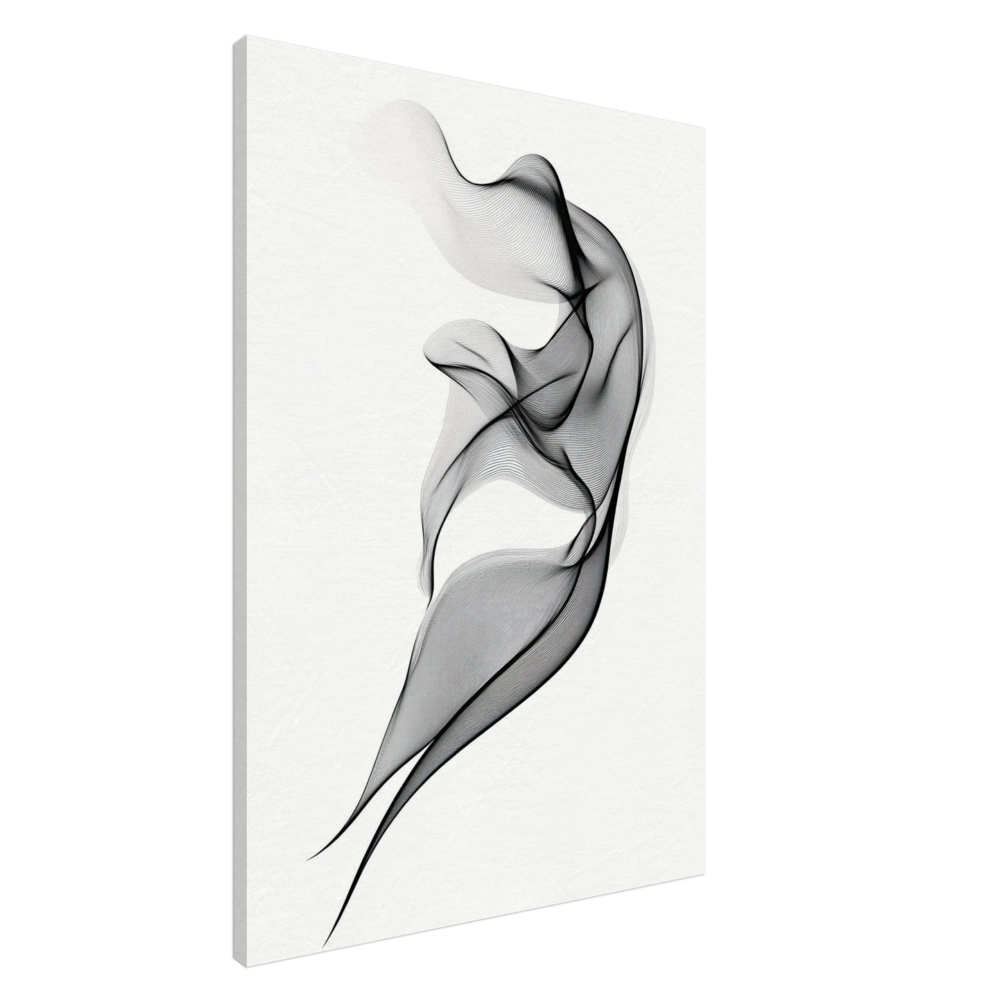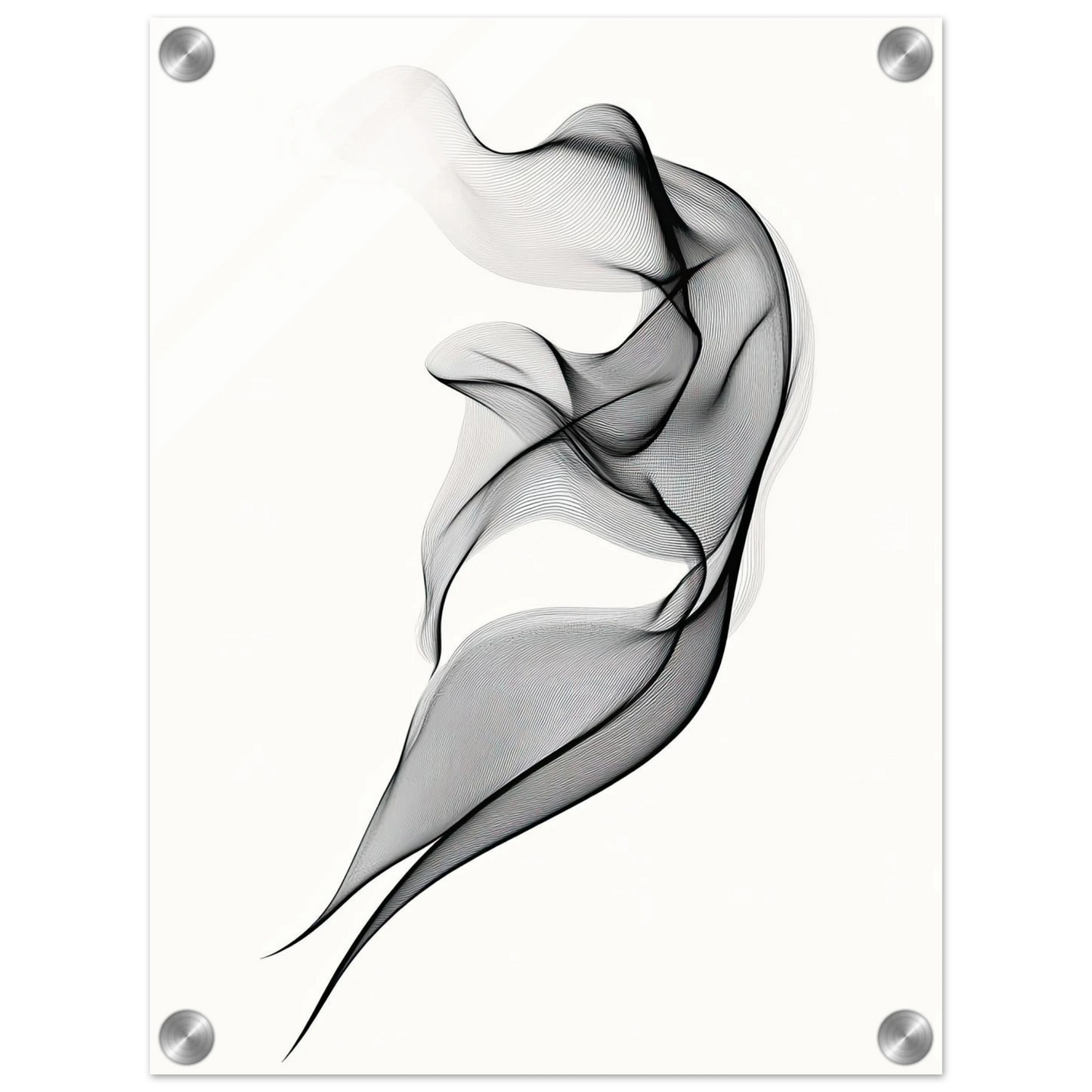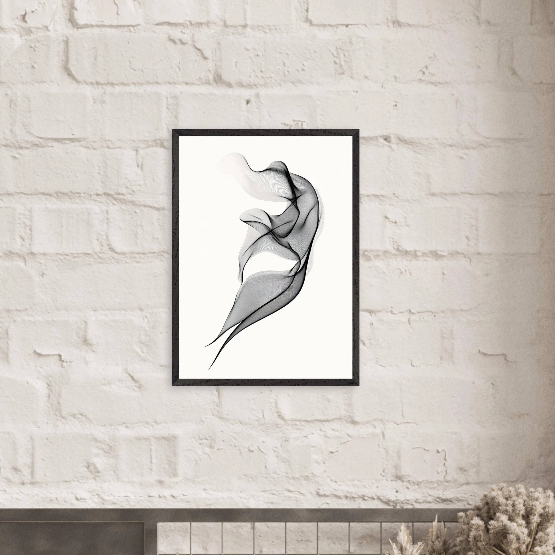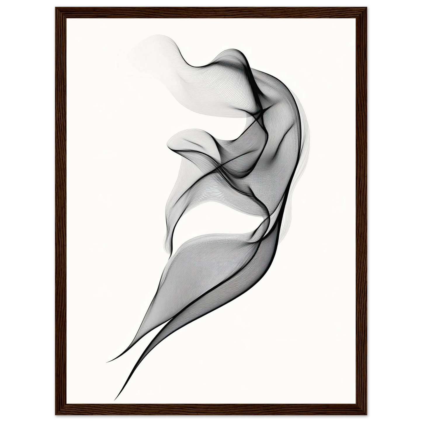 Et elegant minimalistisk kunstverk der tynne svarte linjer danner en svevende form mot en hvit bakgrunn. Den abstrakte figuren minner om både røyk, tekstil og dans, og gir en følelse av letthet og bevegelse. Perfekt for deg som ønsker et motiv som er både subtilt og sofistikert.