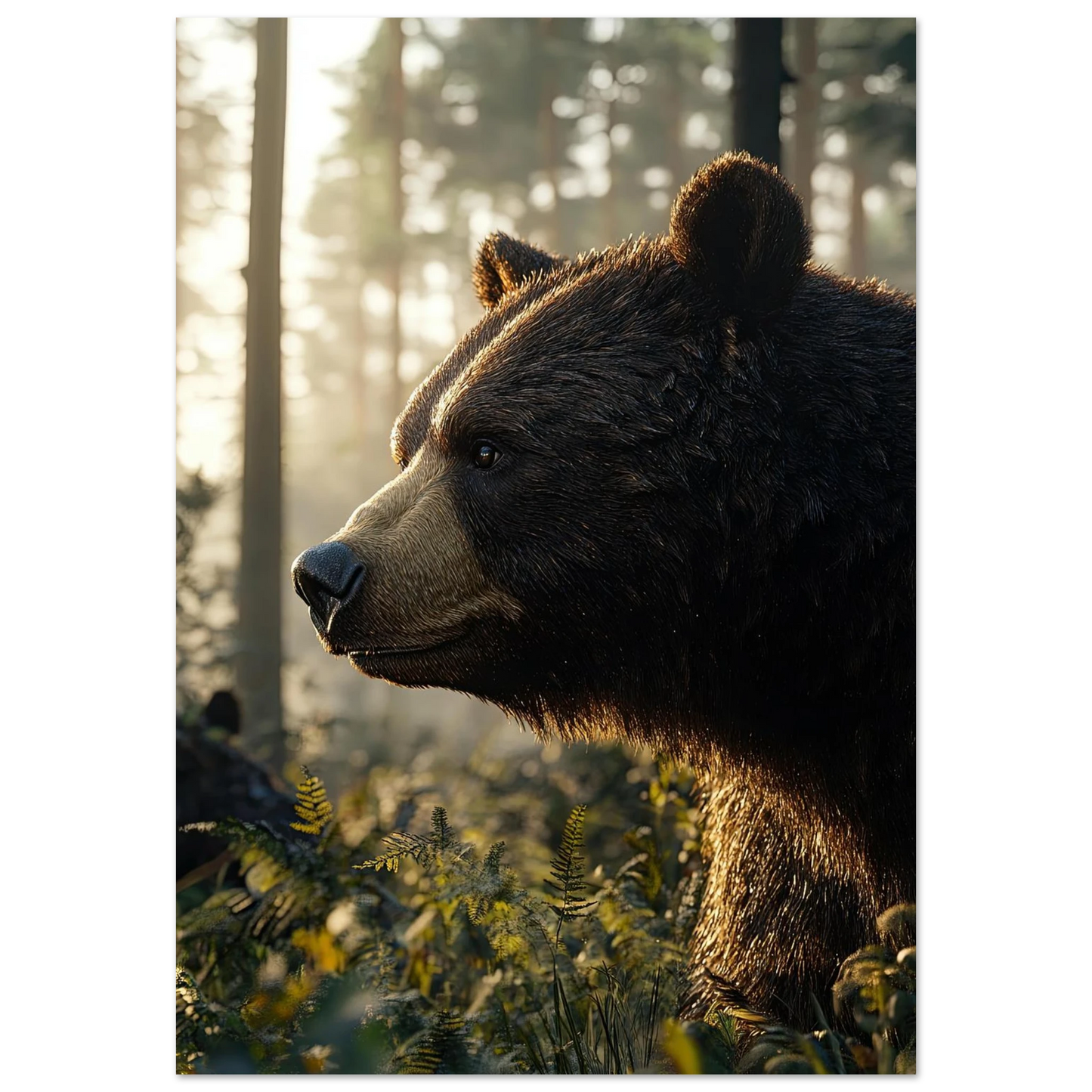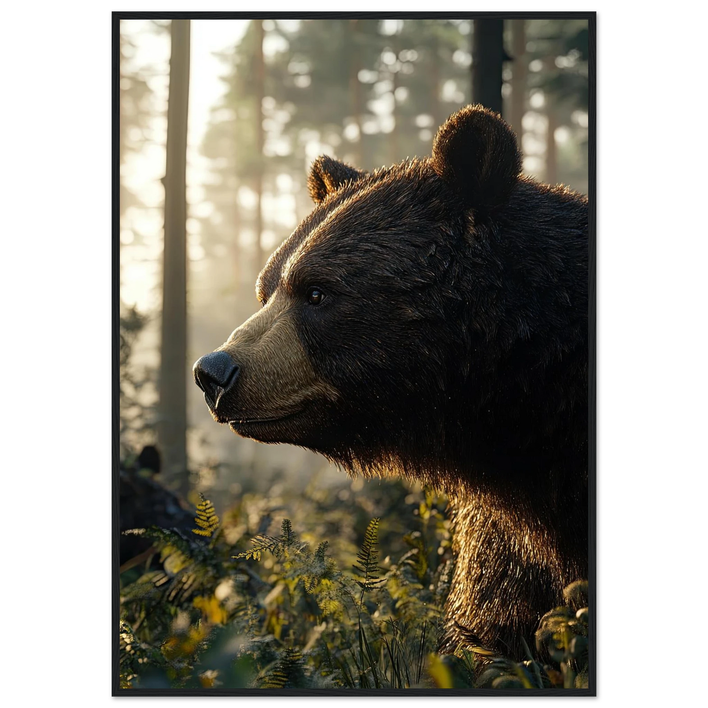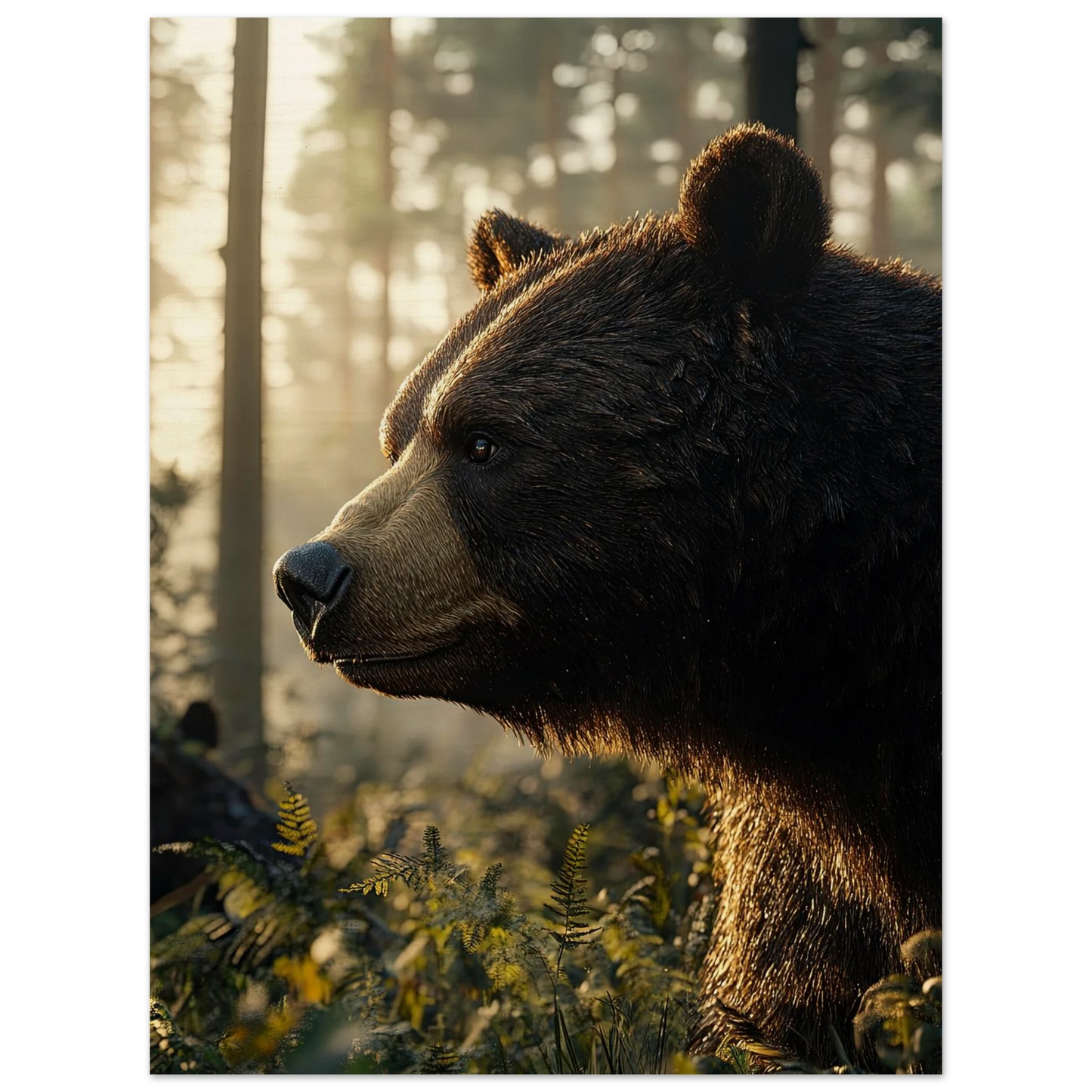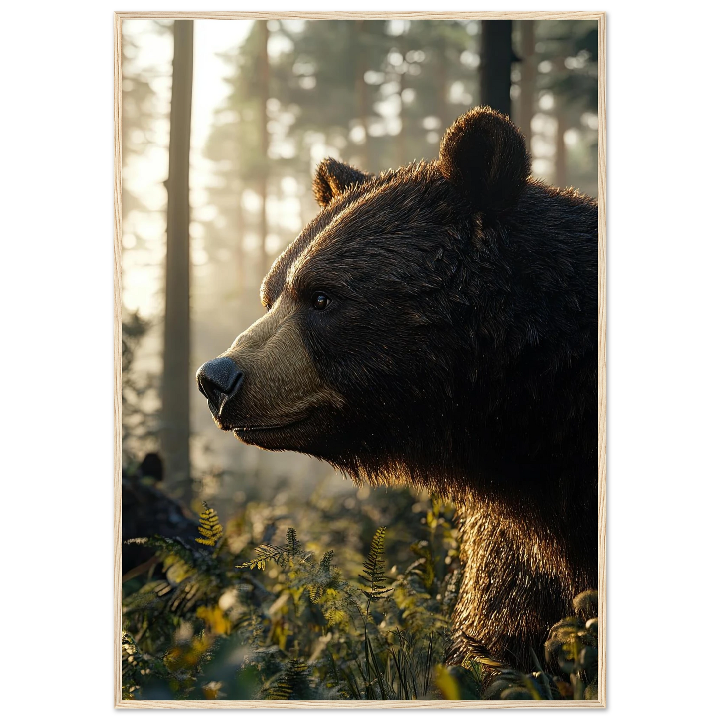 Et nærværende og kraftfullt kunstverk som fanger bjørnens verdige ro midt i skogens myke morgenlys. De varme tonene og det naturlige lyset gir bildet en harmonisk balanse mellom styrke og stillhet. Perfekt for deg som ønsker å bringe villmarkens kraft inn i hjemmet.