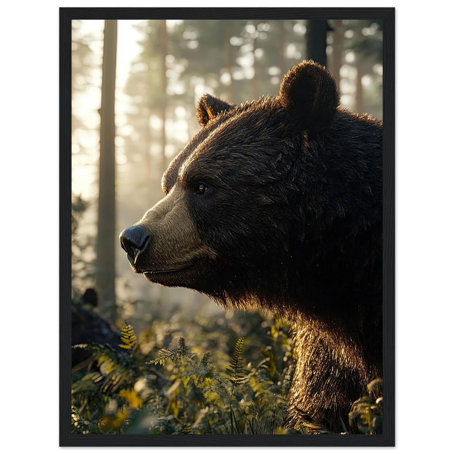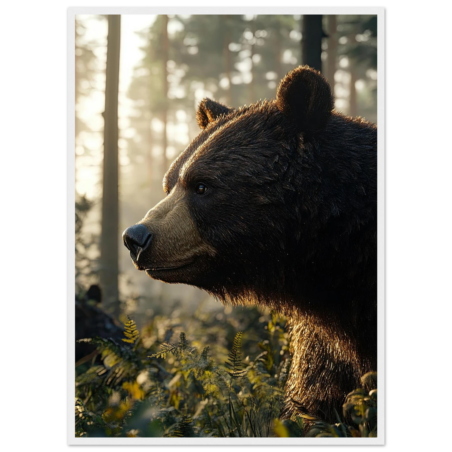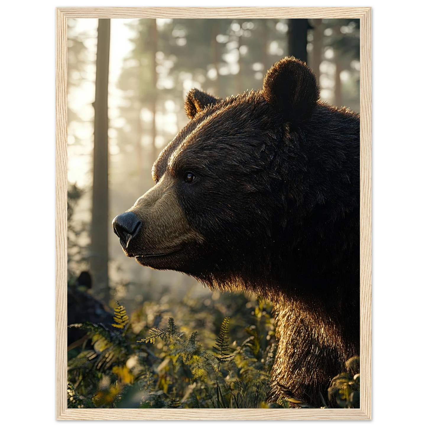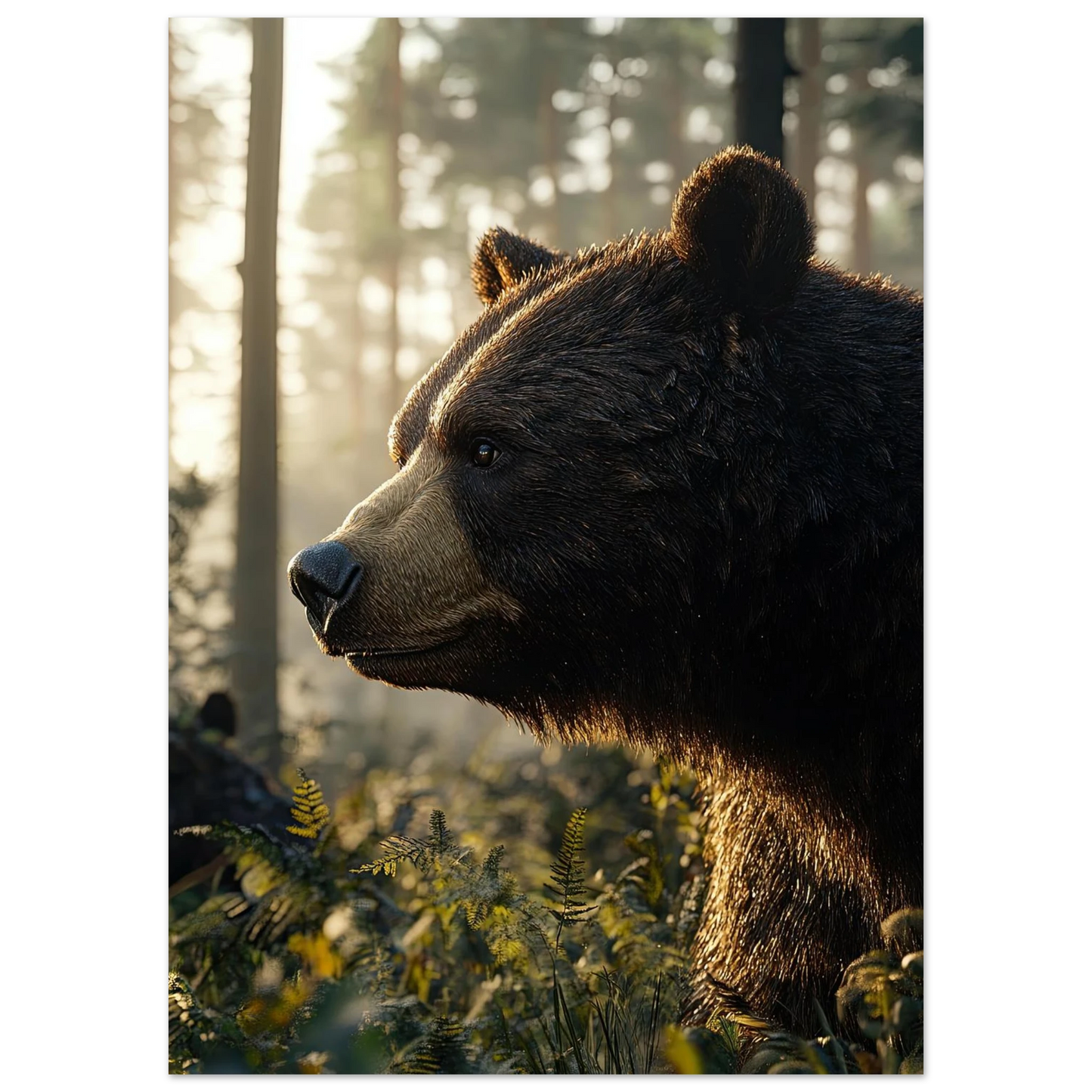 Et nærværende og kraftfullt kunstverk som fanger bjørnens verdige ro midt i skogens myke morgenlys. De varme tonene og det naturlige lyset gir bildet en harmonisk balanse mellom styrke og stillhet. Perfekt for deg som ønsker å bringe villmarkens kraft inn i hjemmet.