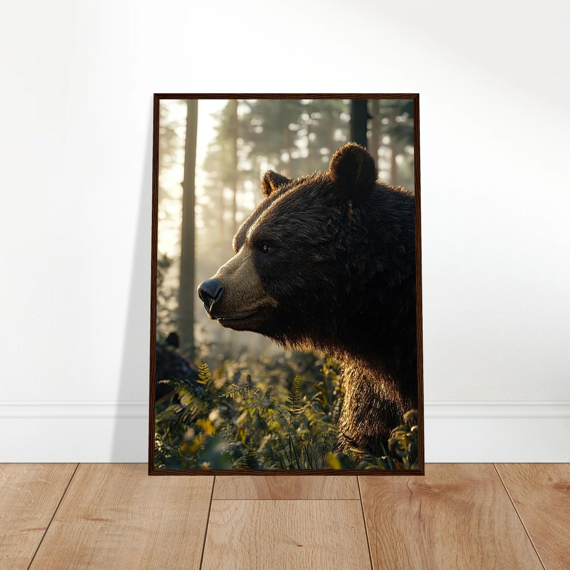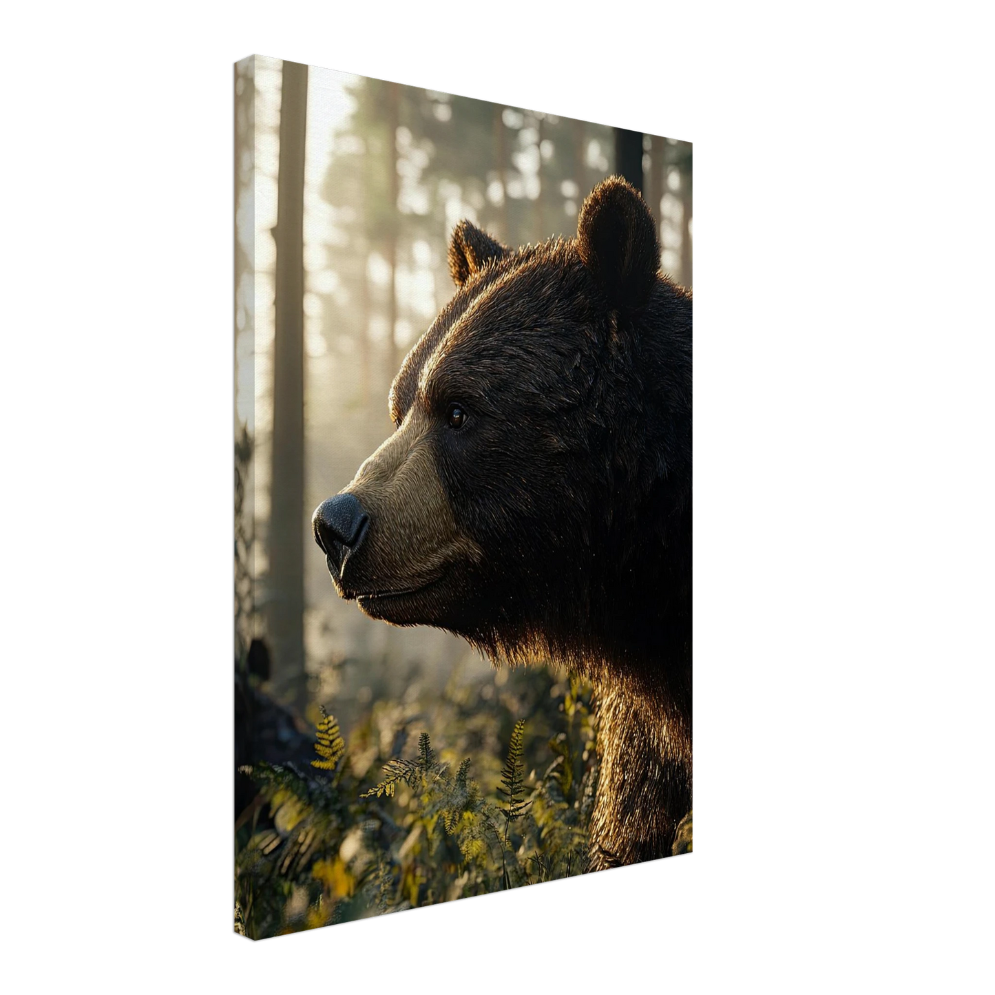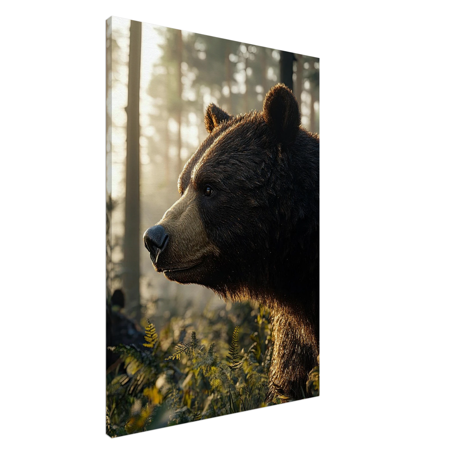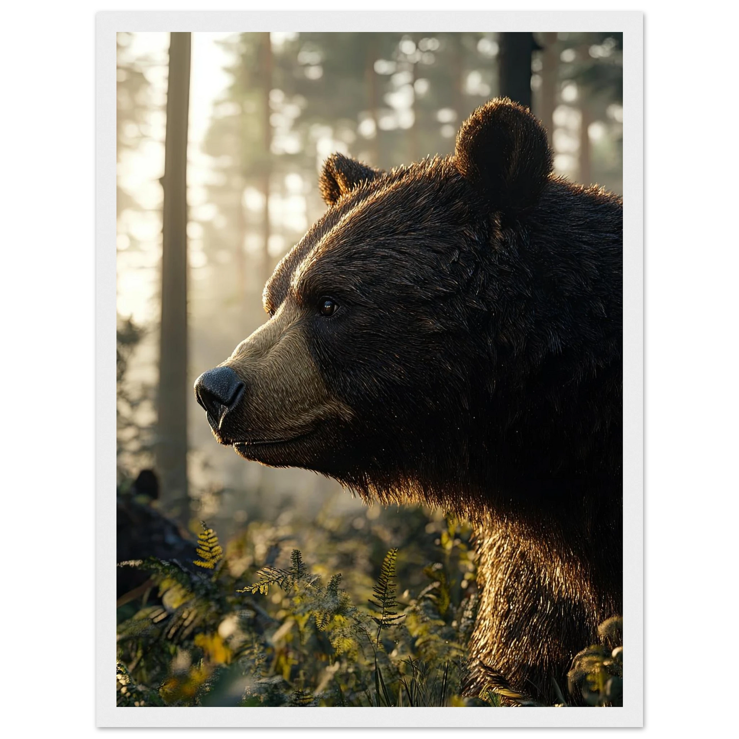 Et nærværende og kraftfullt kunstverk som fanger bjørnens verdige ro midt i skogens myke morgenlys. De varme tonene og det naturlige lyset gir bildet en harmonisk balanse mellom styrke og stillhet. Perfekt for deg som ønsker å bringe villmarkens kraft inn i hjemmet.