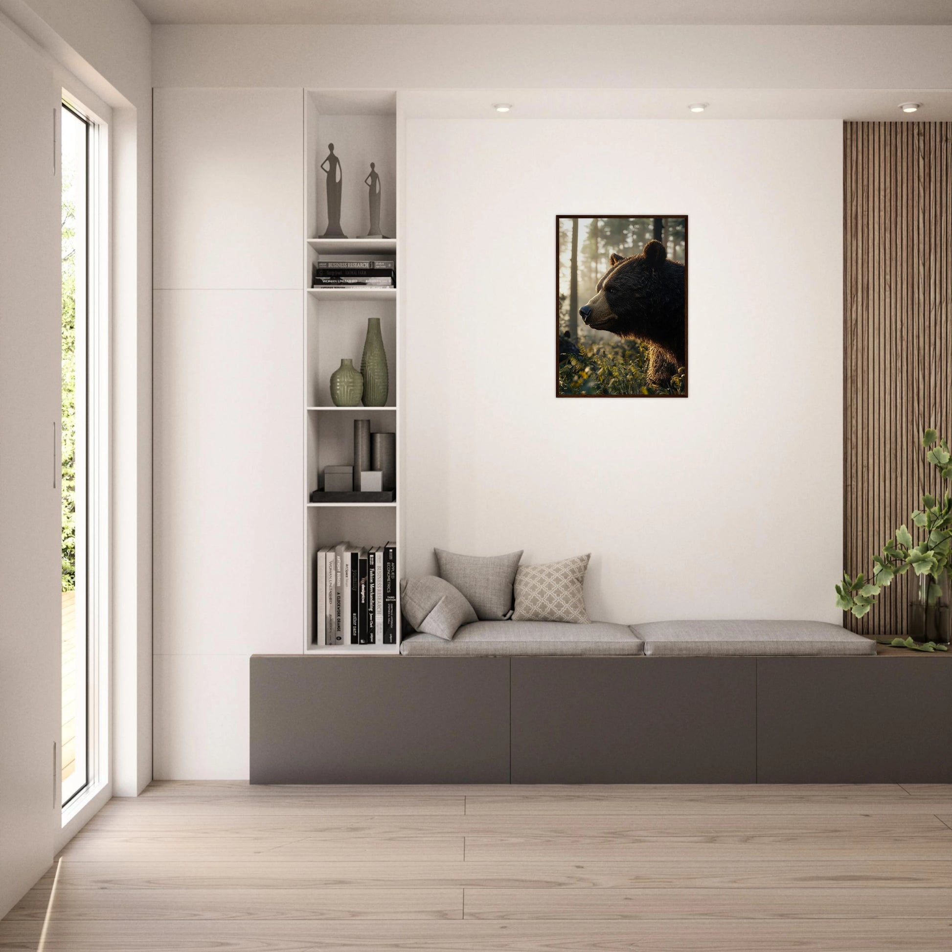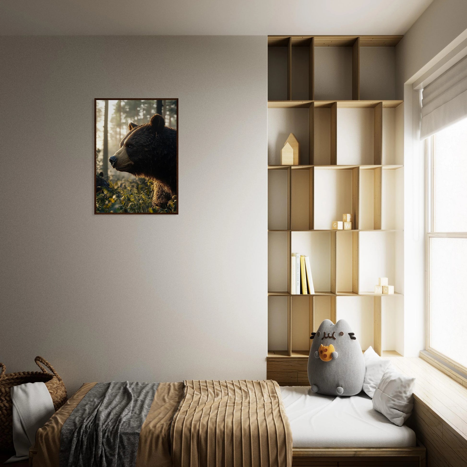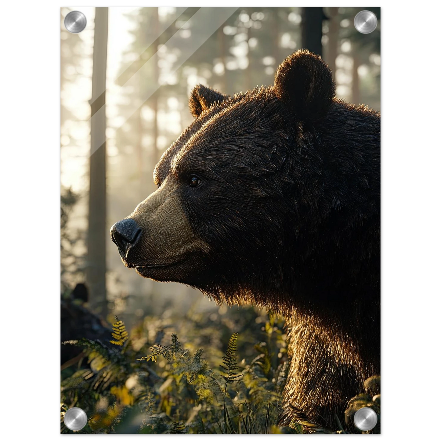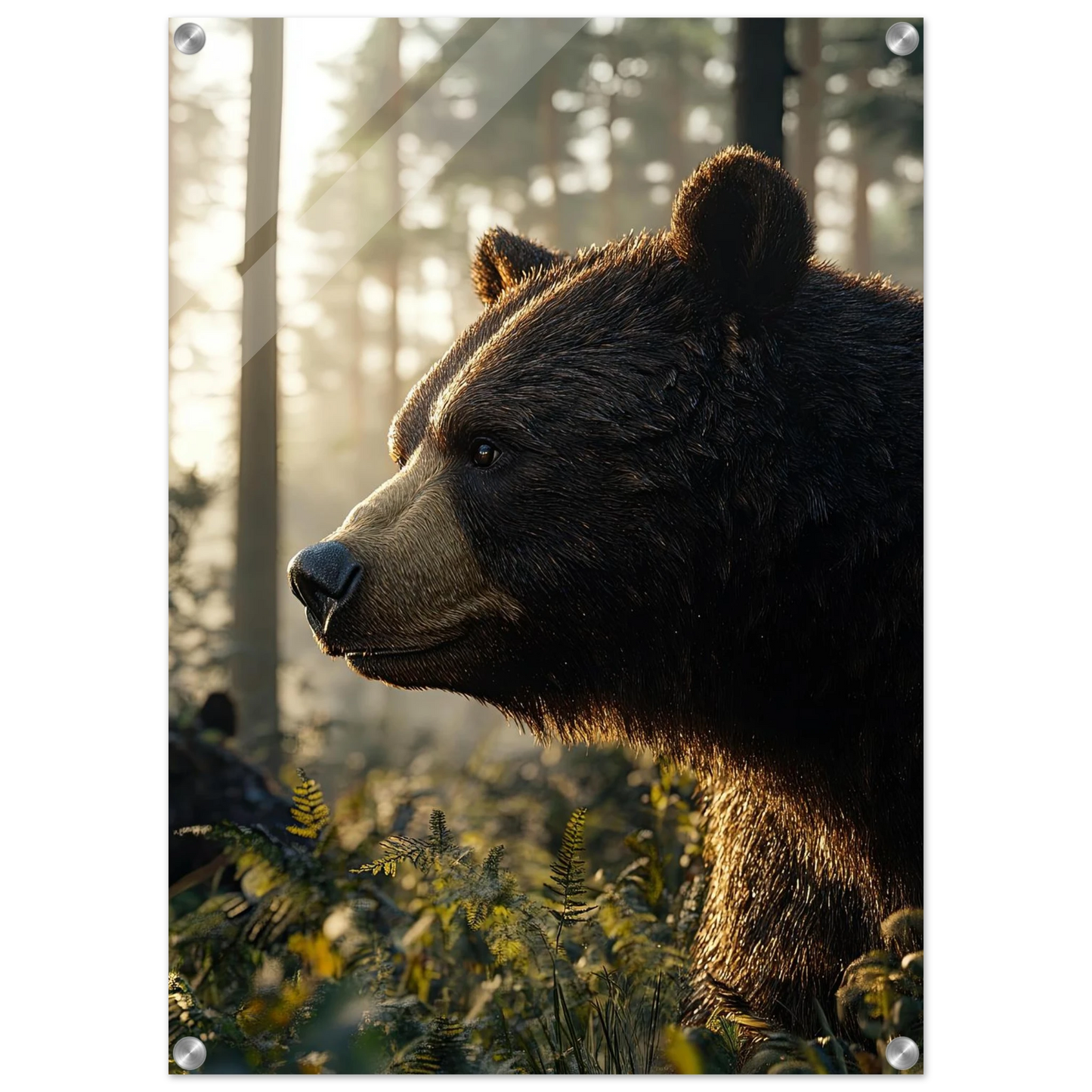 Et nærværende og kraftfullt kunstverk som fanger bjørnens verdige ro midt i skogens myke morgenlys. De varme tonene og det naturlige lyset gir bildet en harmonisk balanse mellom styrke og stillhet. Perfekt for deg som ønsker å bringe villmarkens kraft inn i hjemmet.