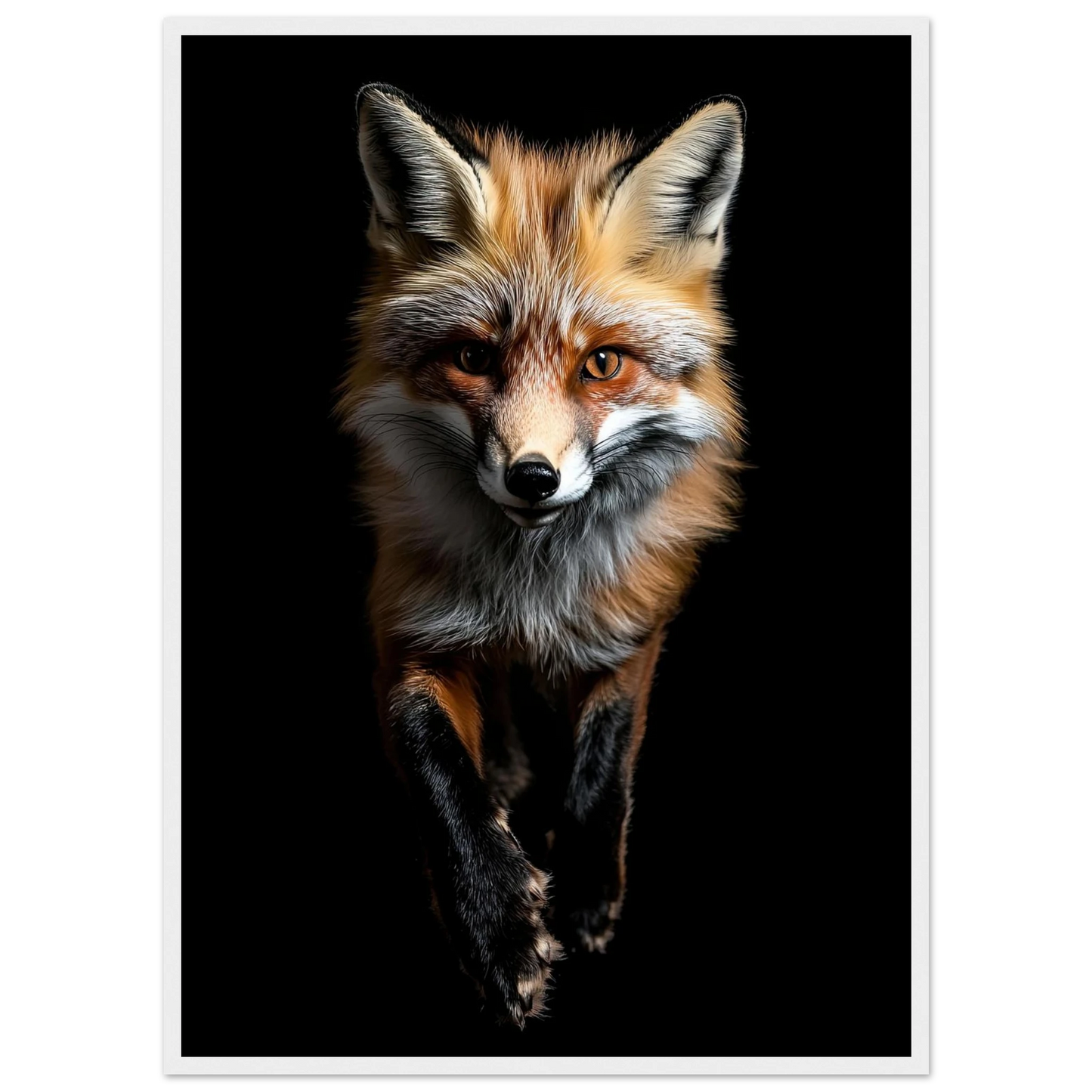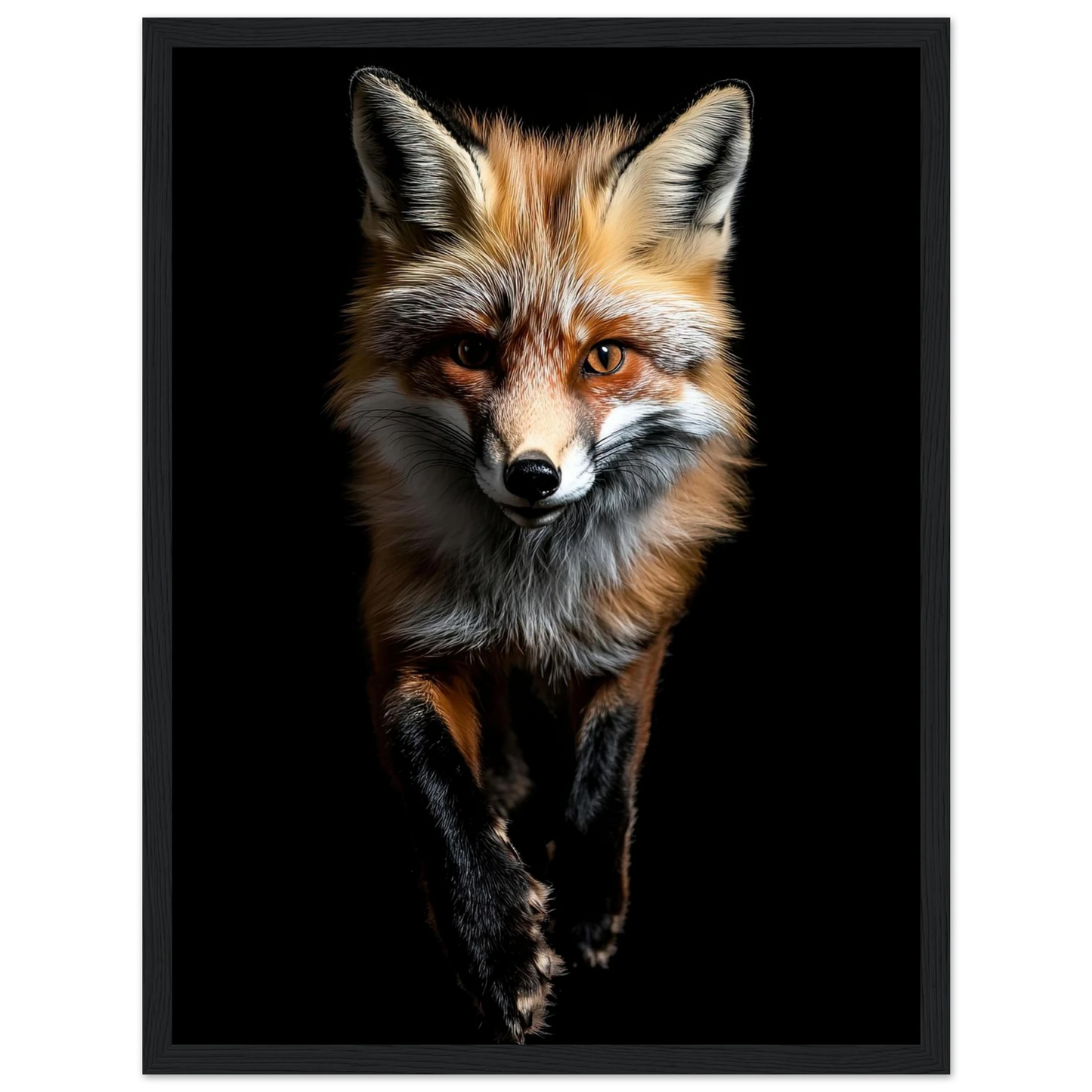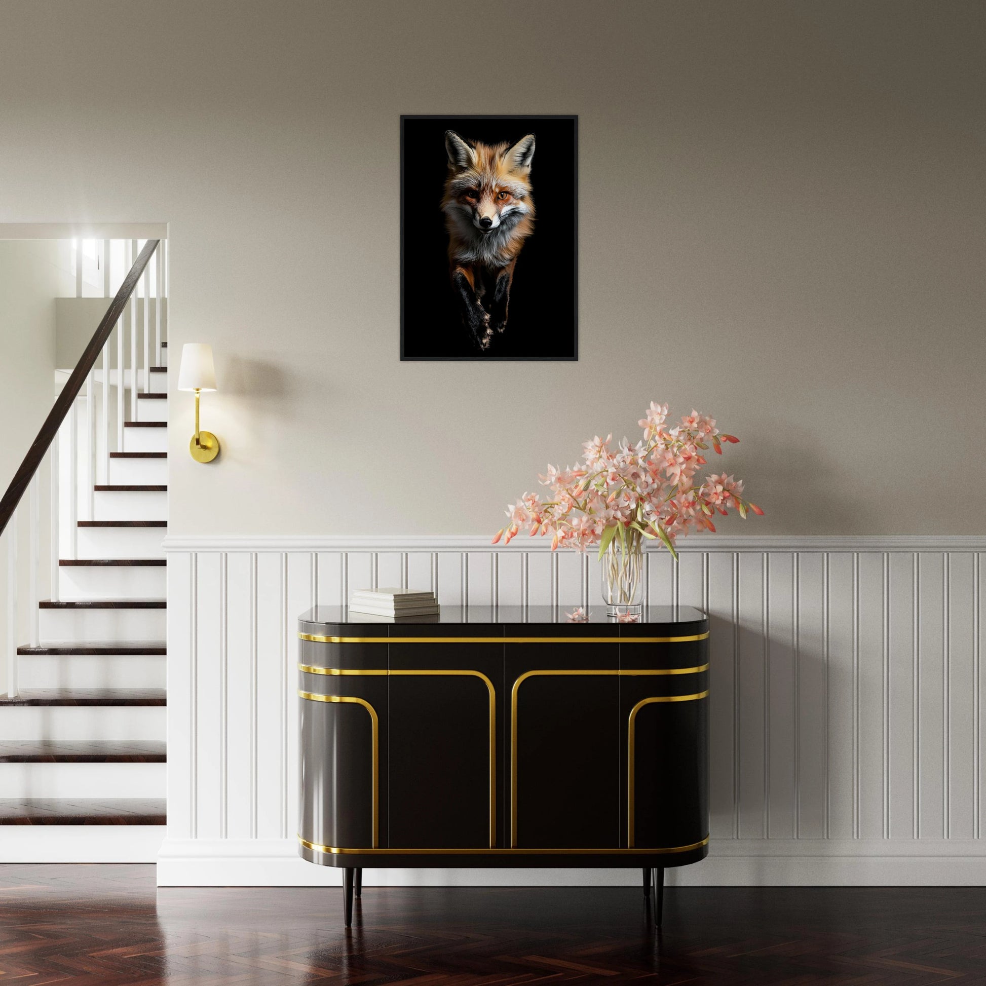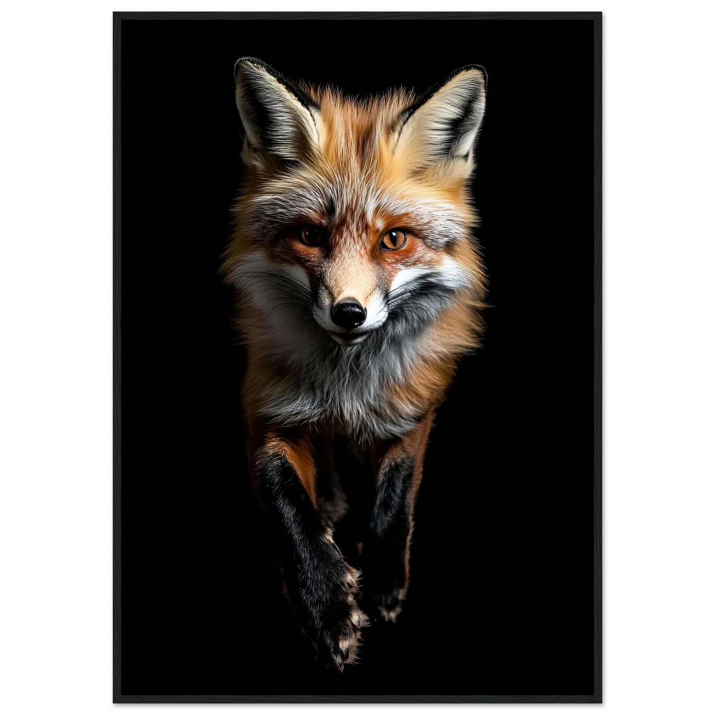 Et slående kunstverk som fanger reven i perfekt bevegelse, med skarp intensitet og karakter. Den mørke bakgrunnen setter fullt fokus på dyrets elegante linjer og varme fargetoner. Perfekt for deg som ønsker et bilde med energi, styrke og naturens mystikk.