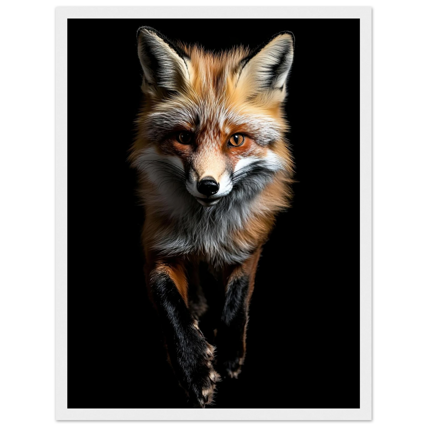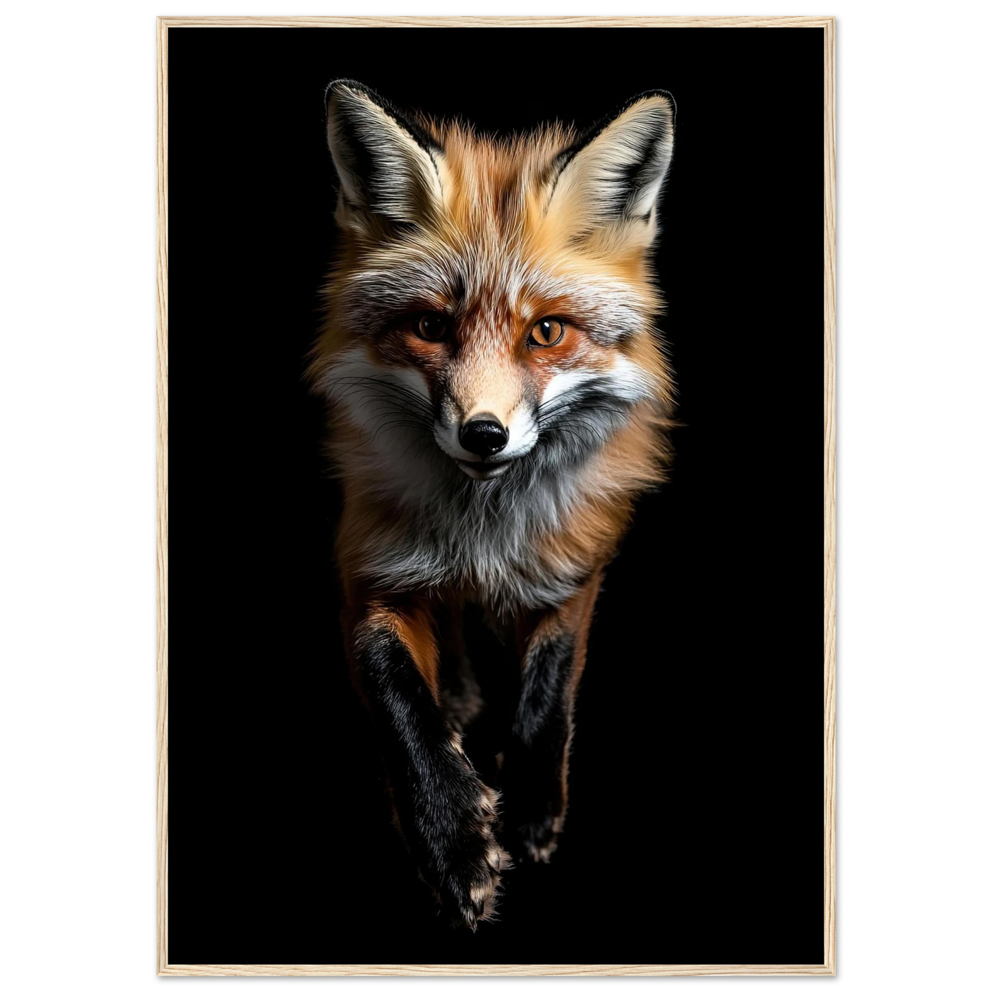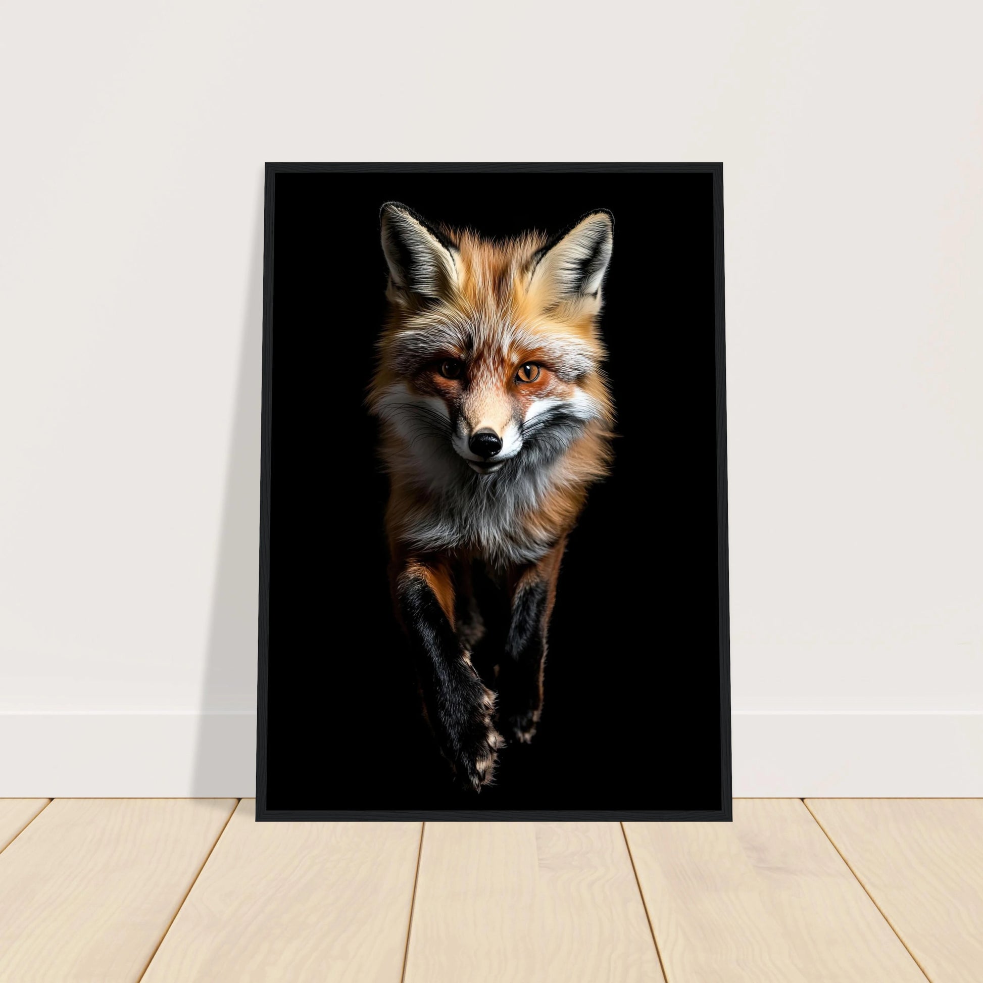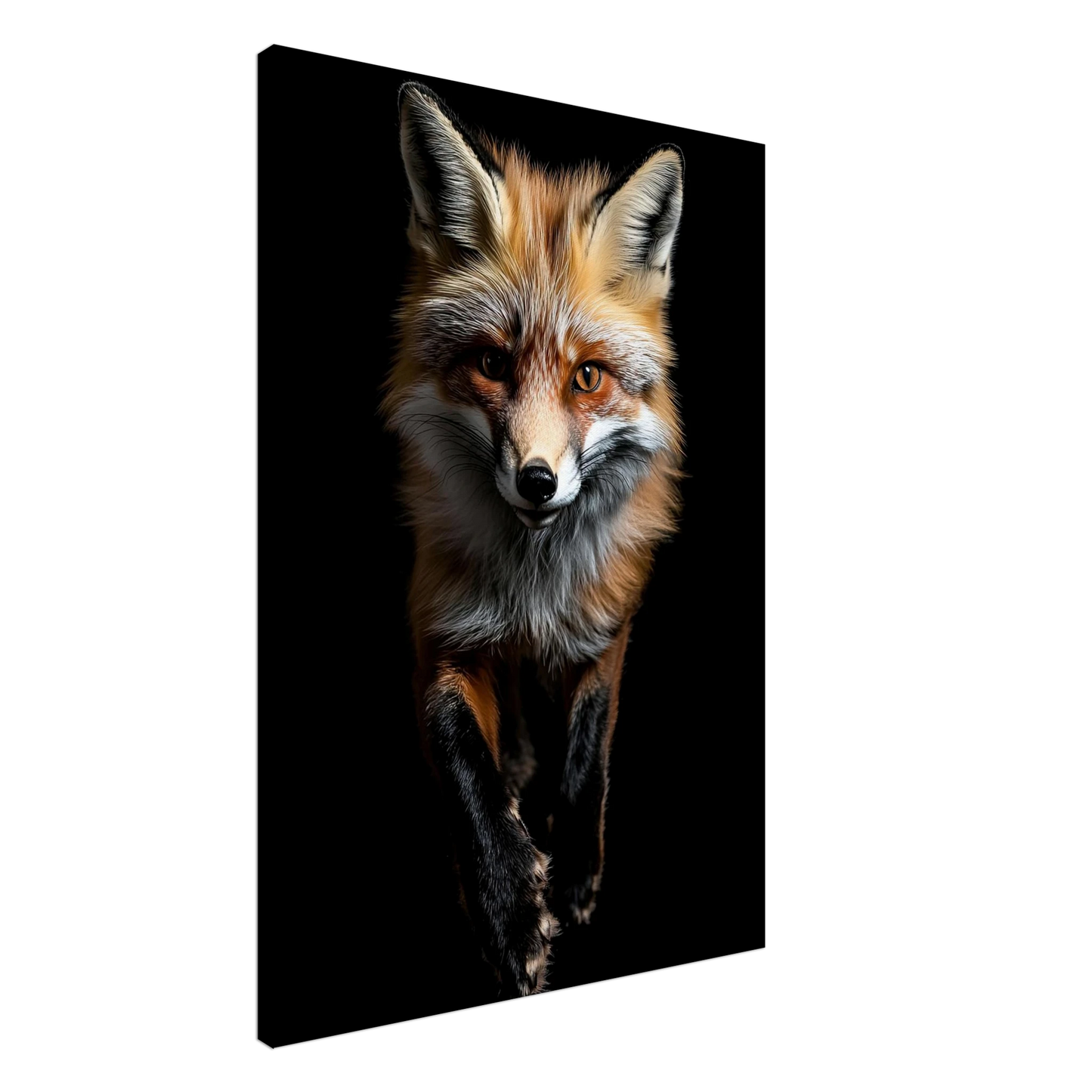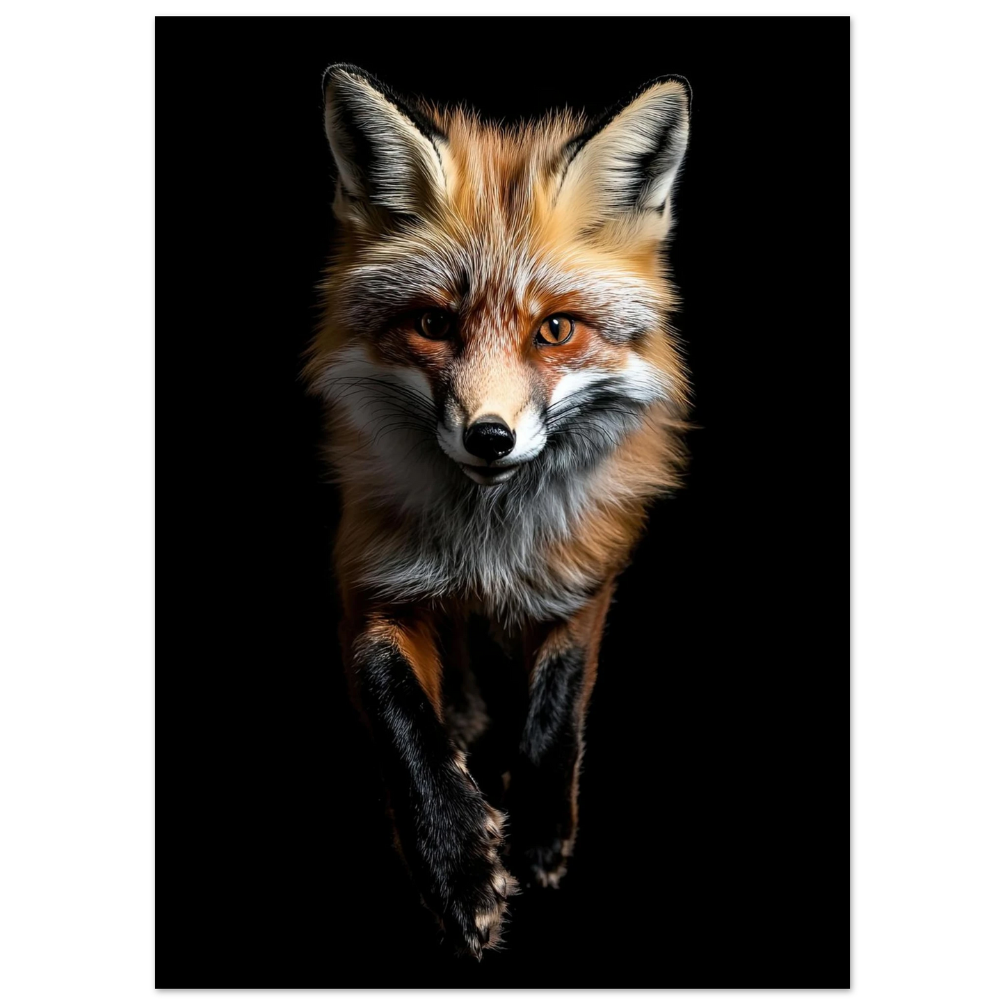 Et slående kunstverk som fanger reven i perfekt bevegelse, med skarp intensitet og karakter. Den mørke bakgrunnen setter fullt fokus på dyrets elegante linjer og varme fargetoner. Perfekt for deg som ønsker et bilde med energi, styrke og naturens mystikk.