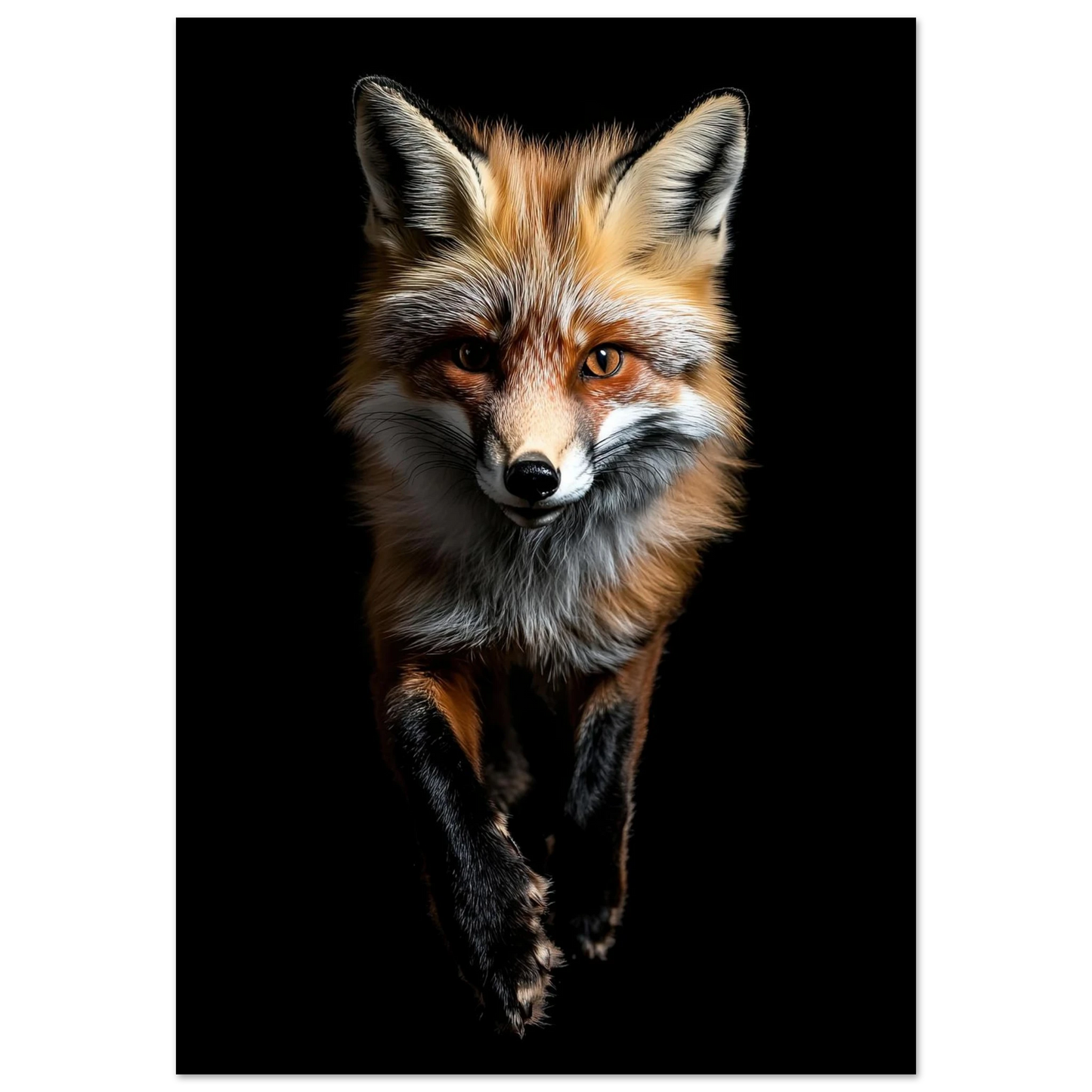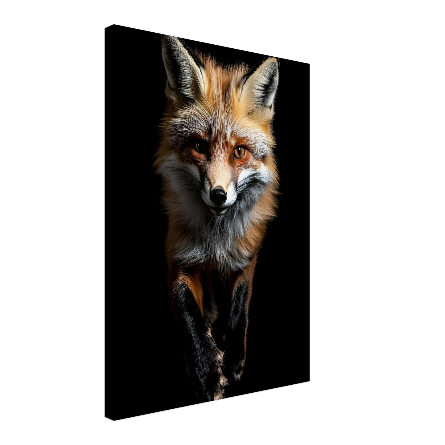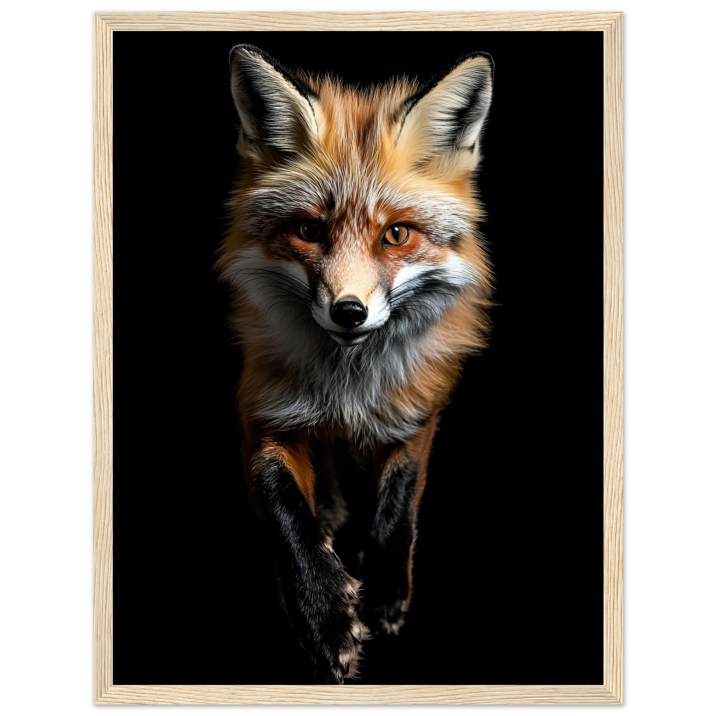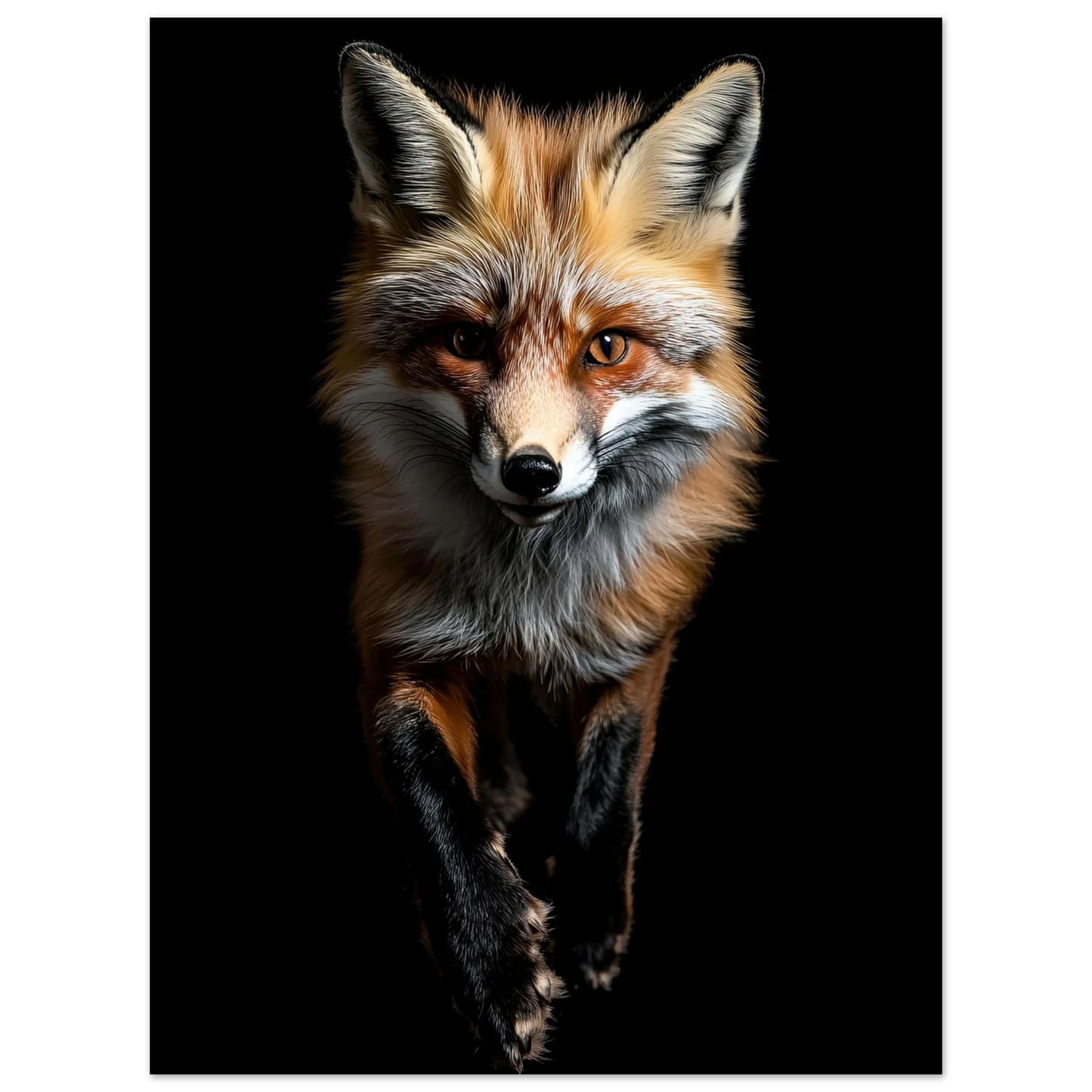 Et slående kunstverk som fanger reven i perfekt bevegelse, med skarp intensitet og karakter. Den mørke bakgrunnen setter fullt fokus på dyrets elegante linjer og varme fargetoner. Perfekt for deg som ønsker et bilde med energi, styrke og naturens mystikk.