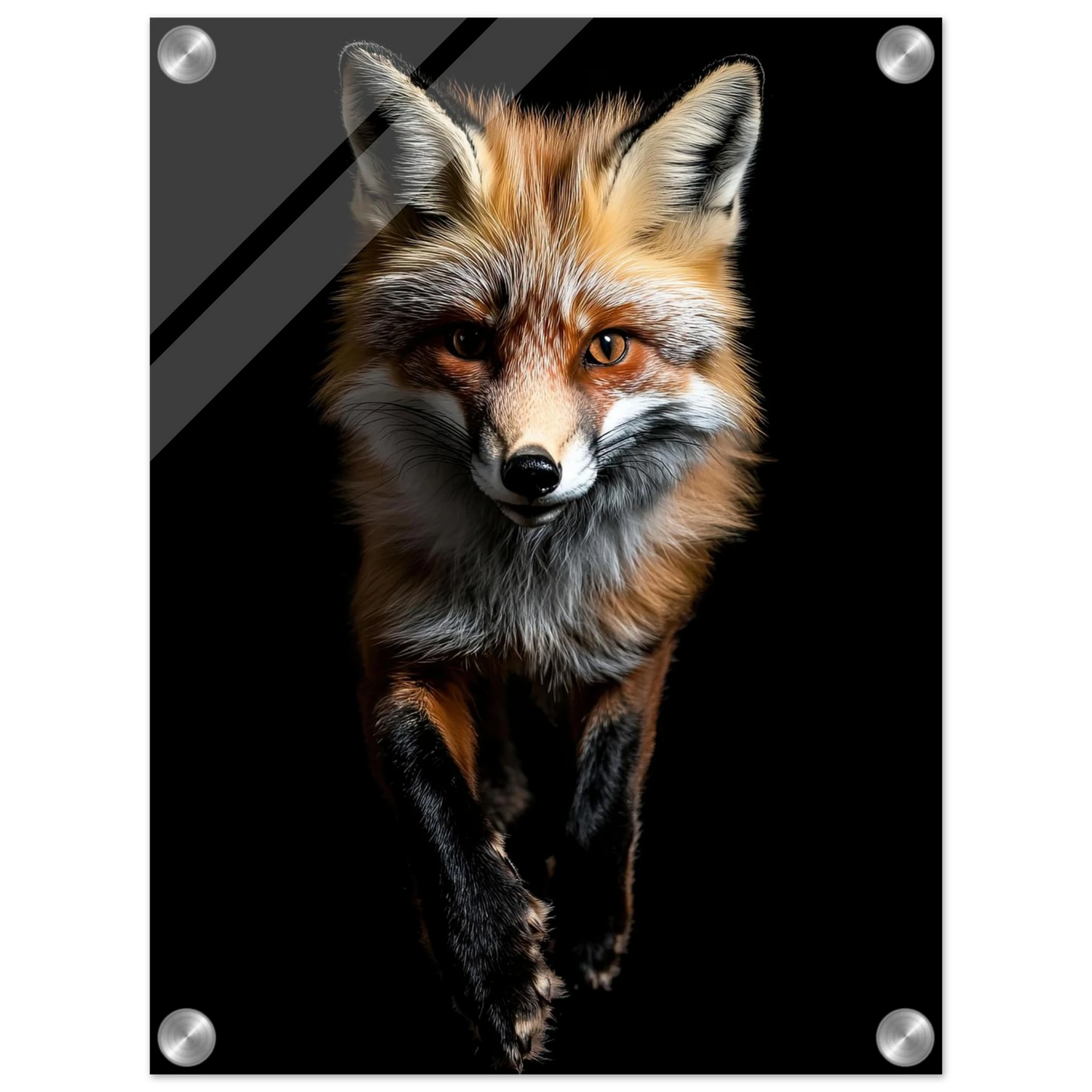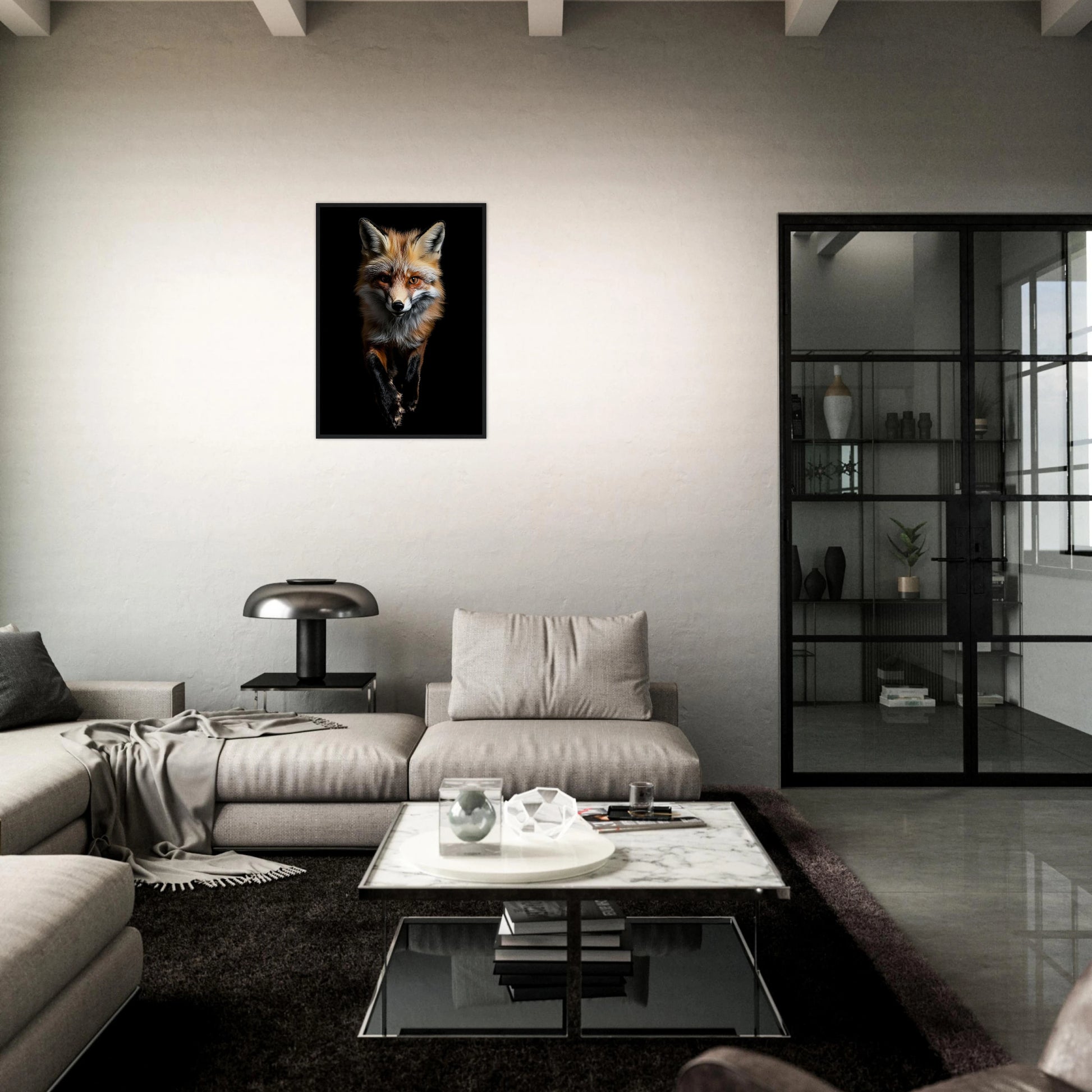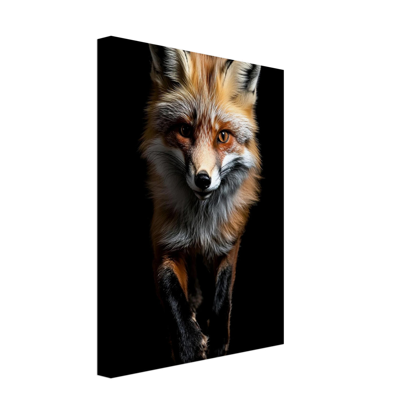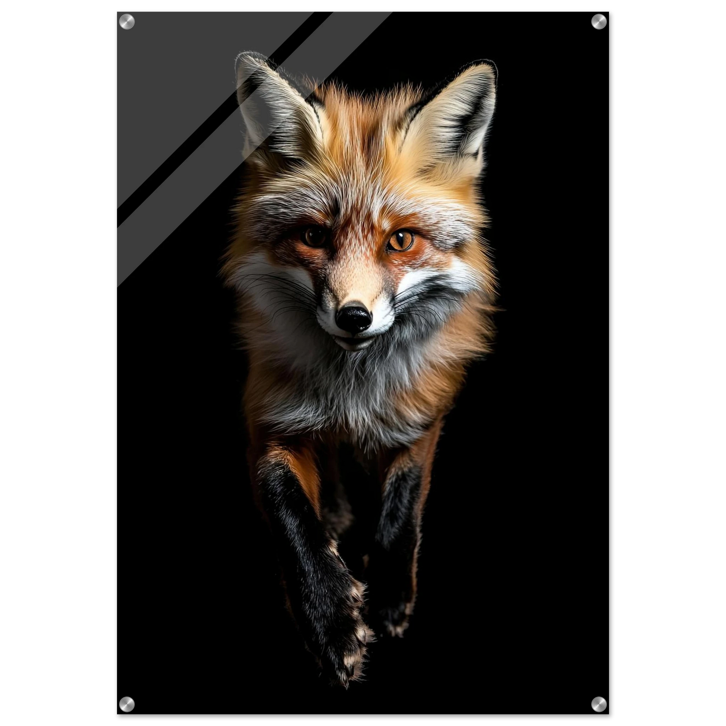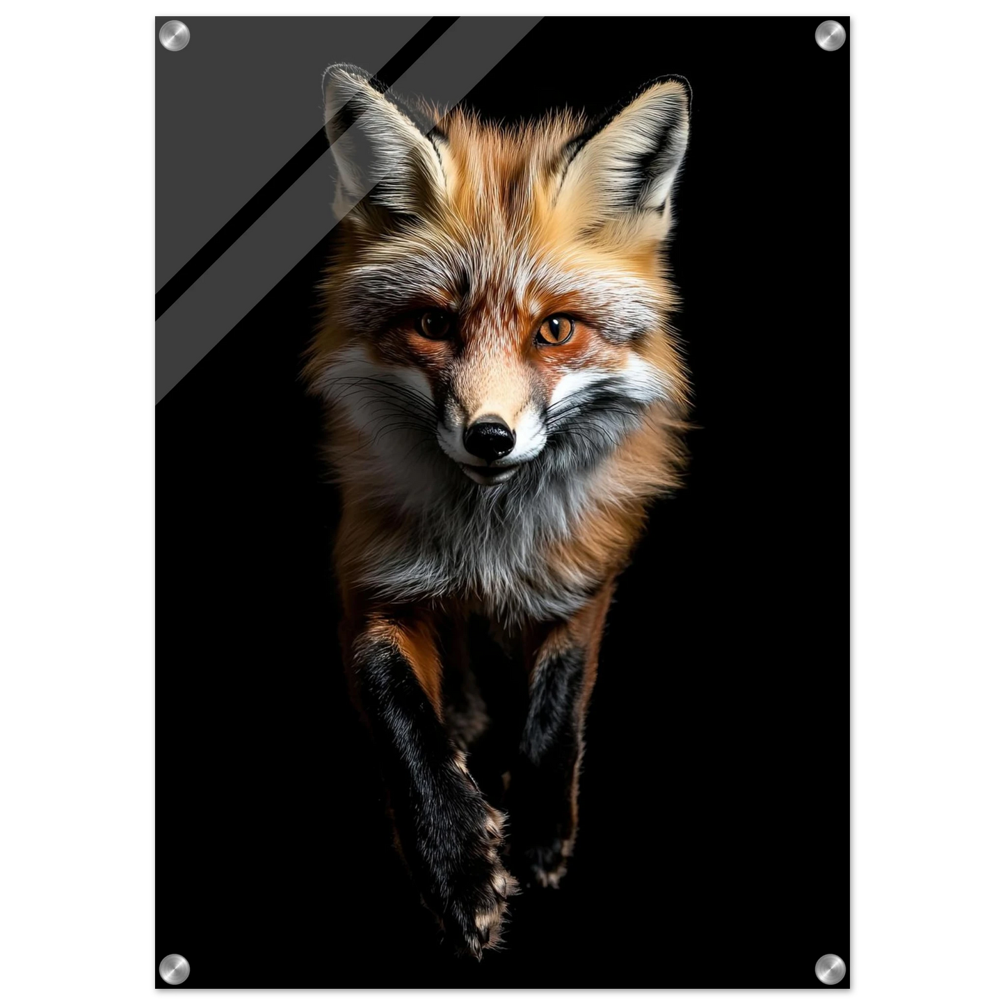 Et slående kunstverk som fanger reven i perfekt bevegelse, med skarp intensitet og karakter. Den mørke bakgrunnen setter fullt fokus på dyrets elegante linjer og varme fargetoner. Perfekt for deg som ønsker et bilde med energi, styrke og naturens mystikk.