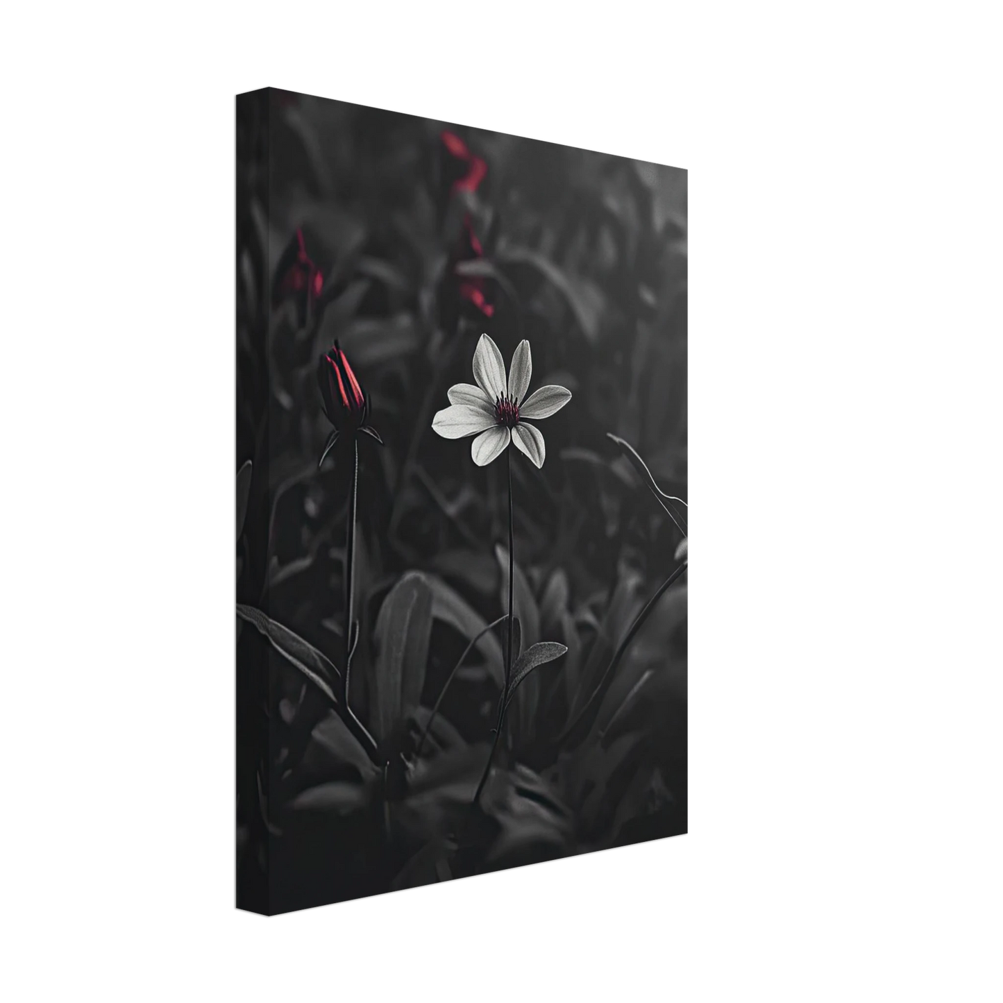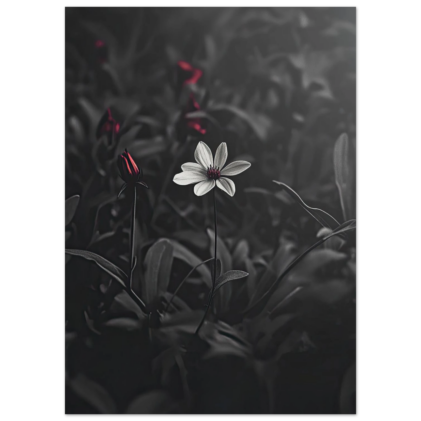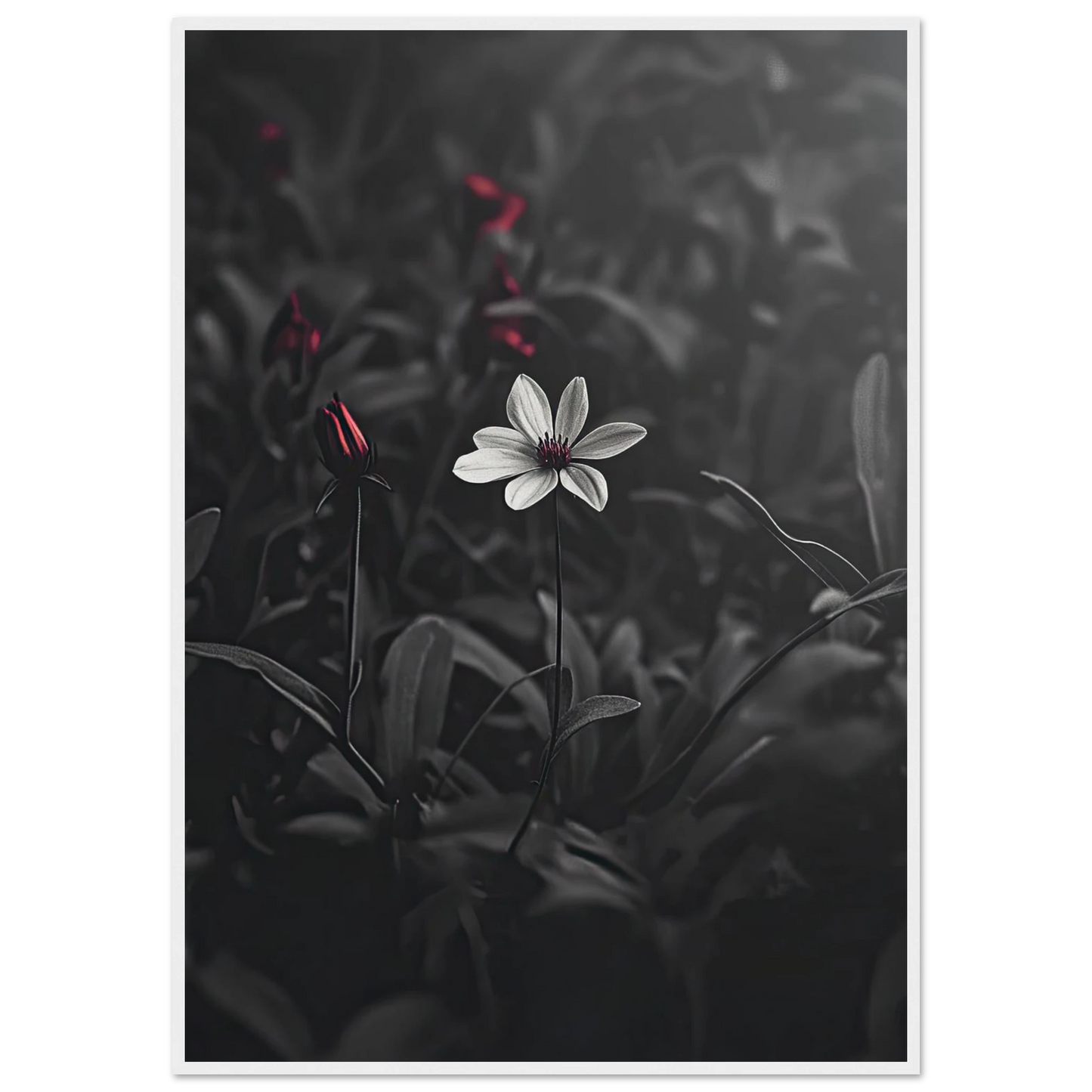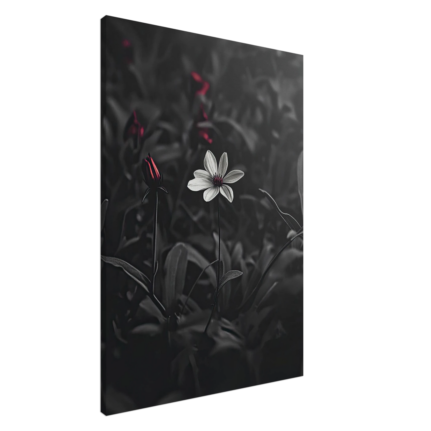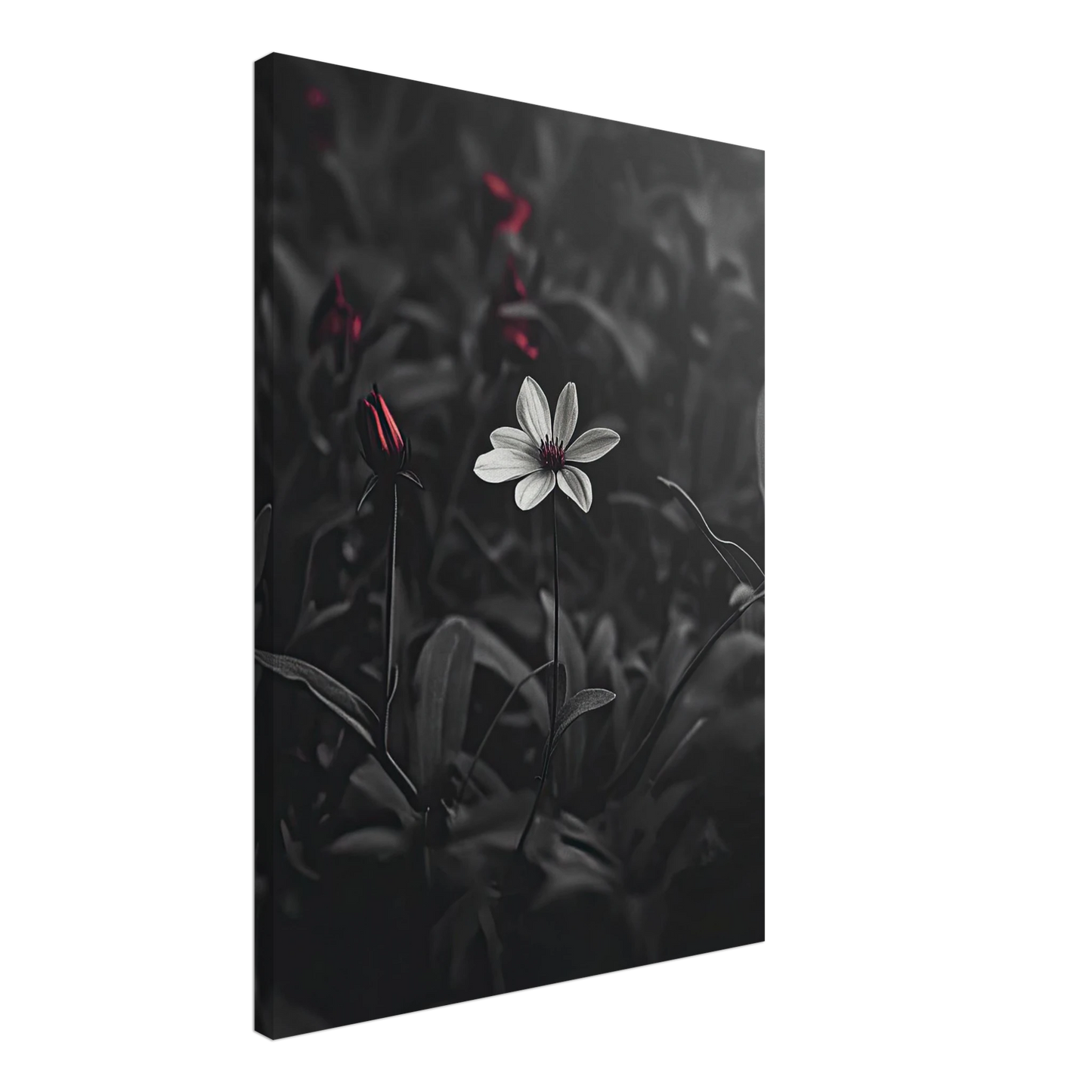 Et enkelt og sofistikert kunstverk der en lys blomst trer frem mot en dempet bakgrunn. Et visuelt blikkfang med mørk atmosfære og stilren kontrast.