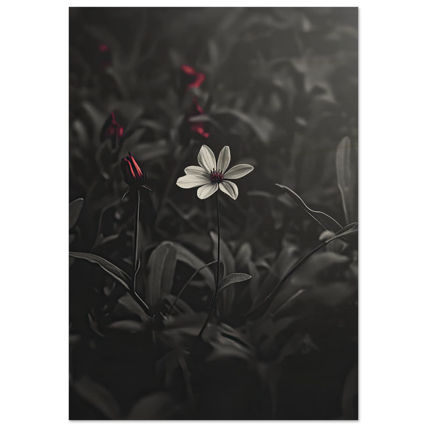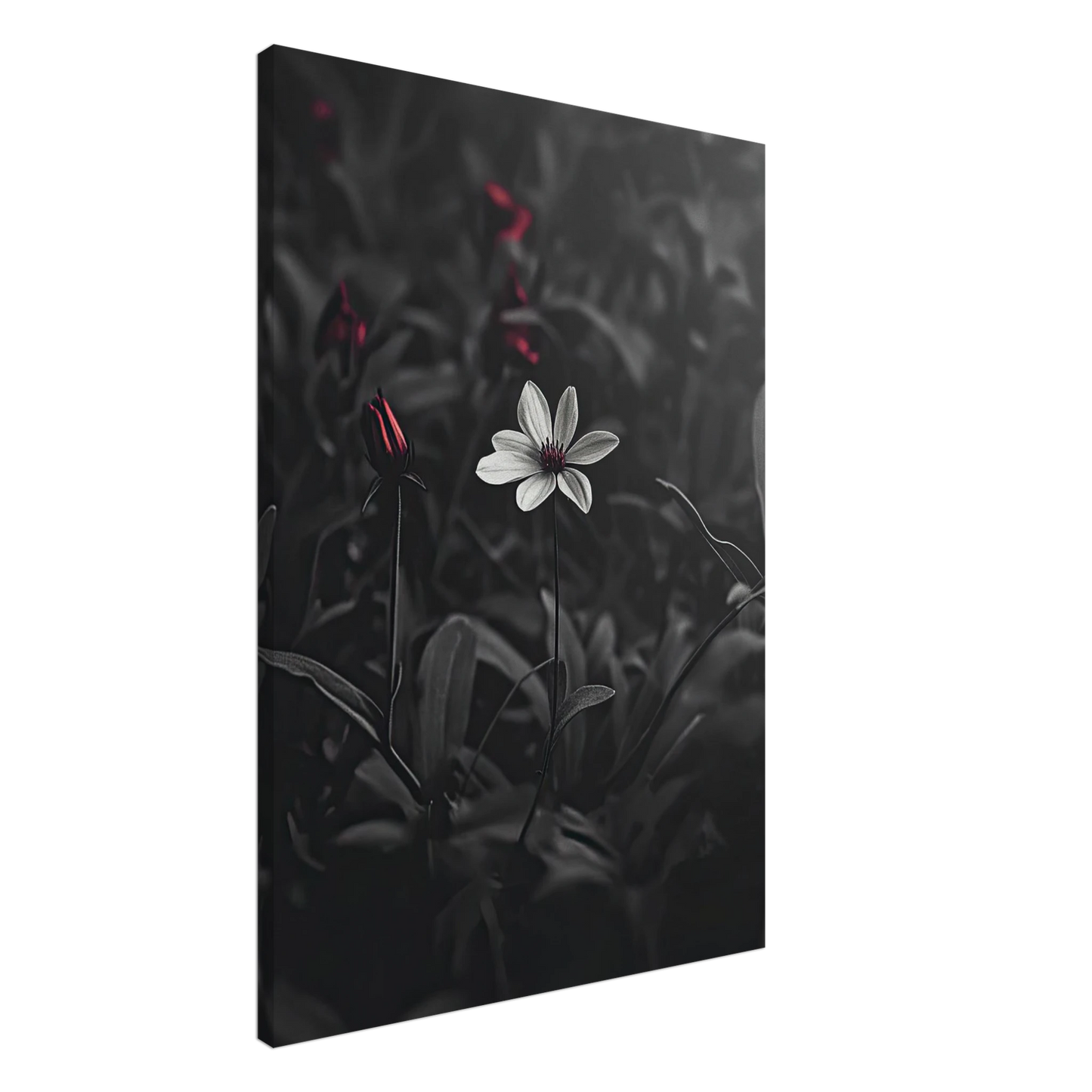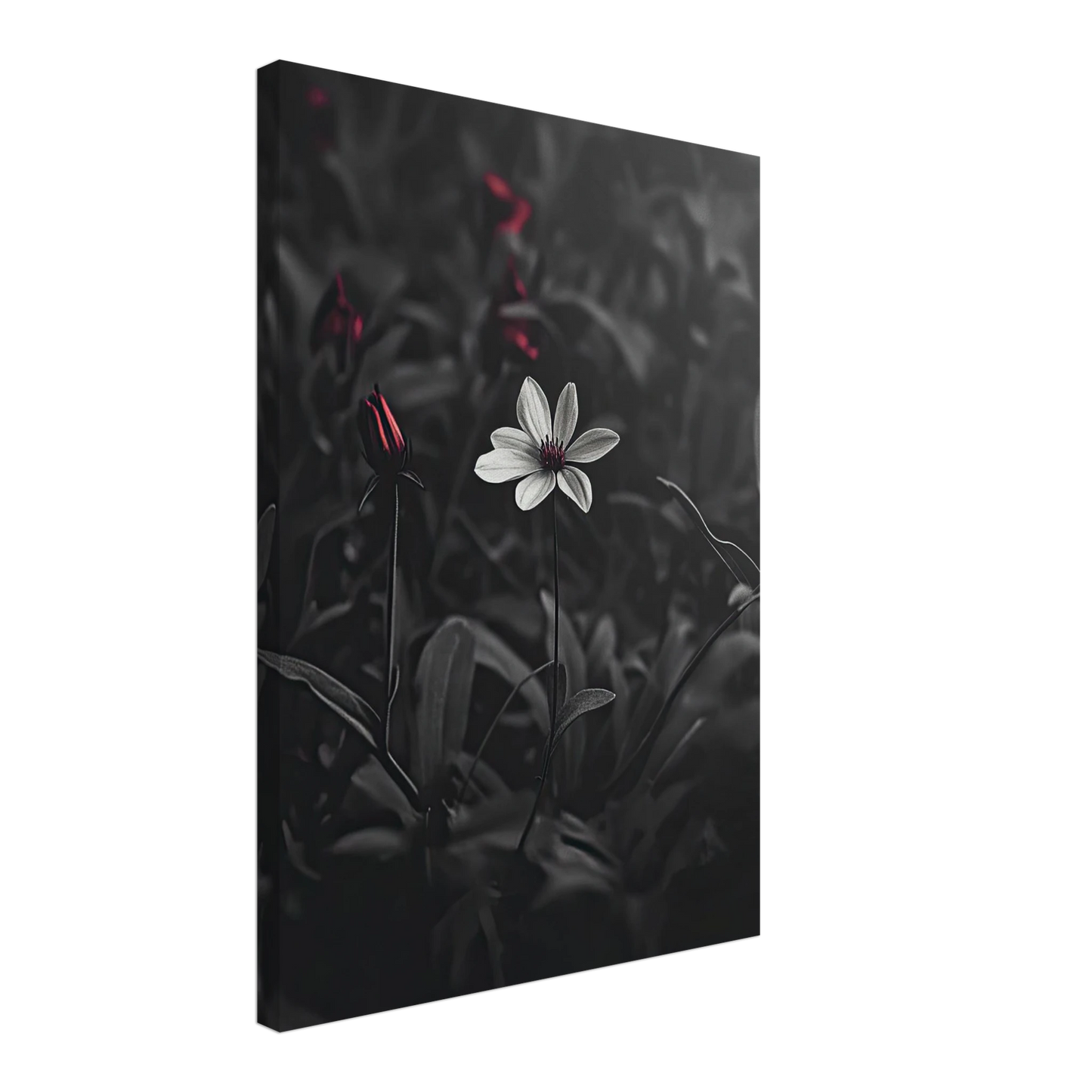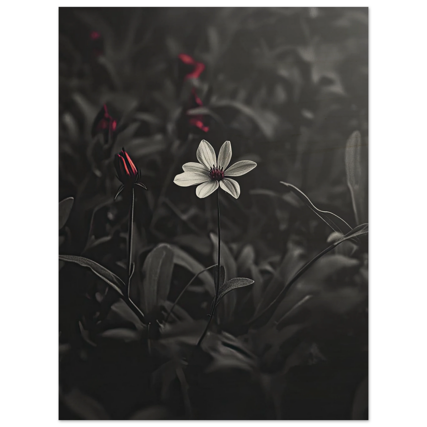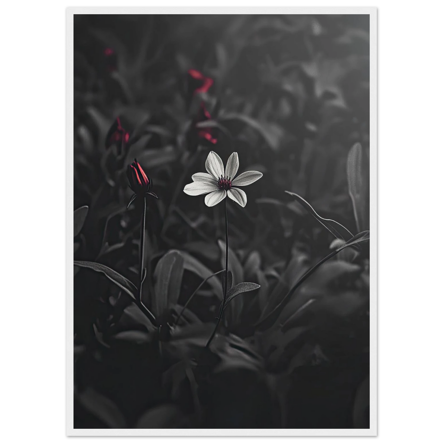 Et enkelt og sofistikert kunstverk der en lys blomst trer frem mot en dempet bakgrunn. Et visuelt blikkfang med mørk atmosfære og stilren kontrast.