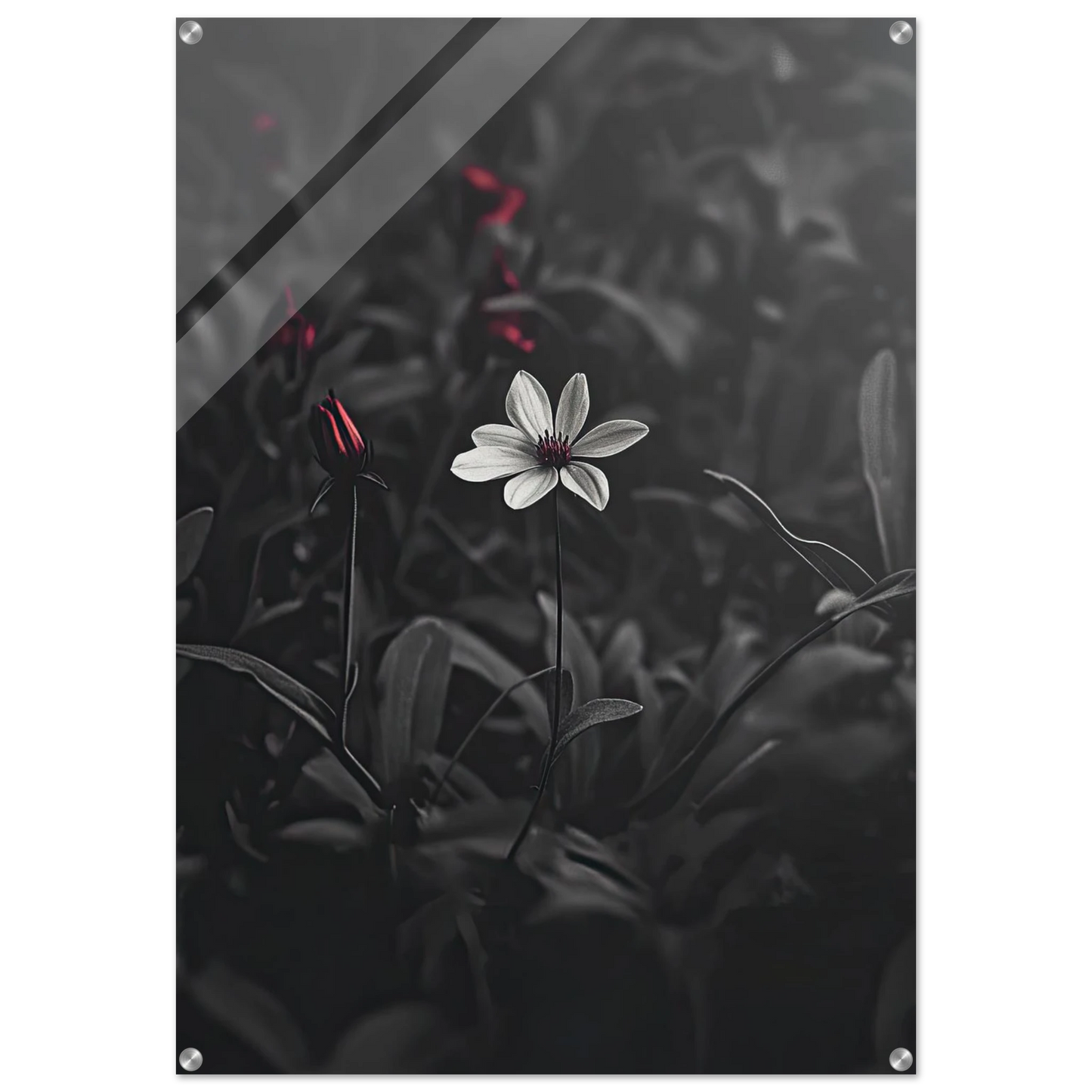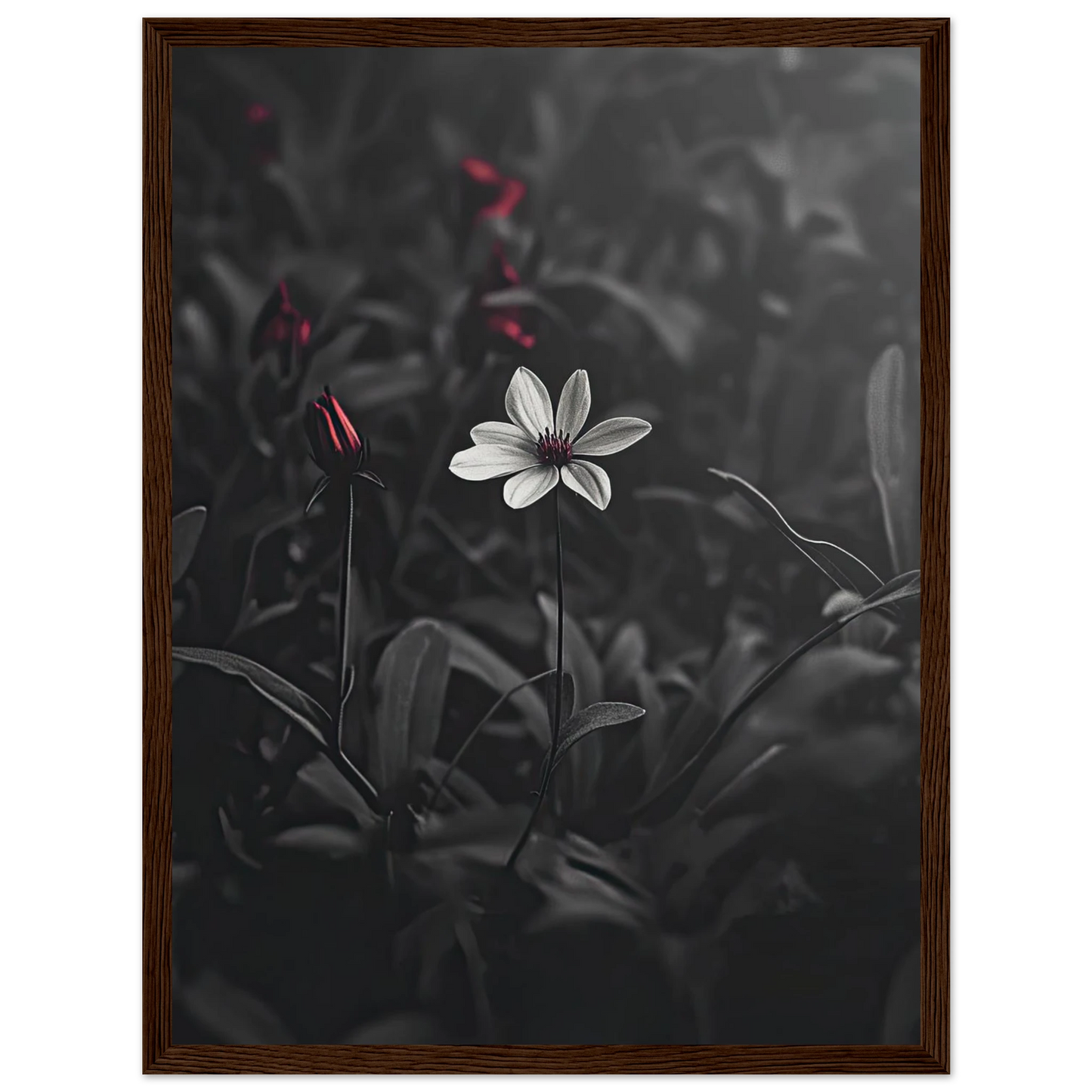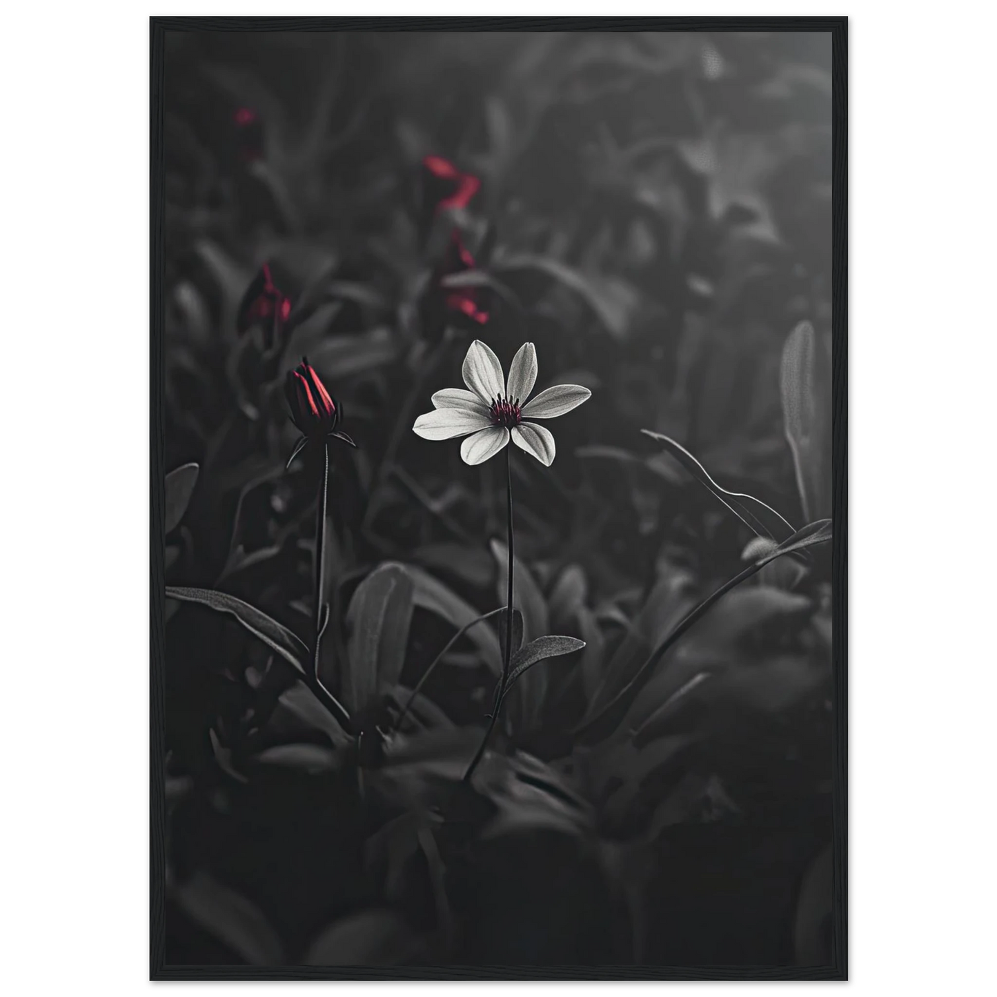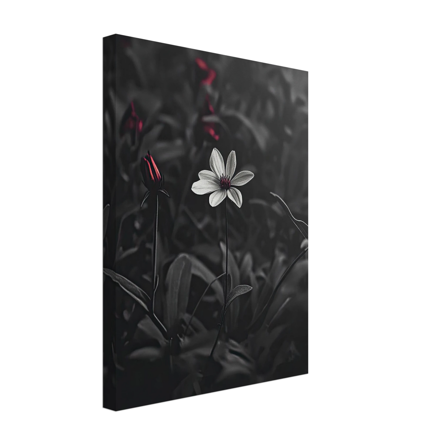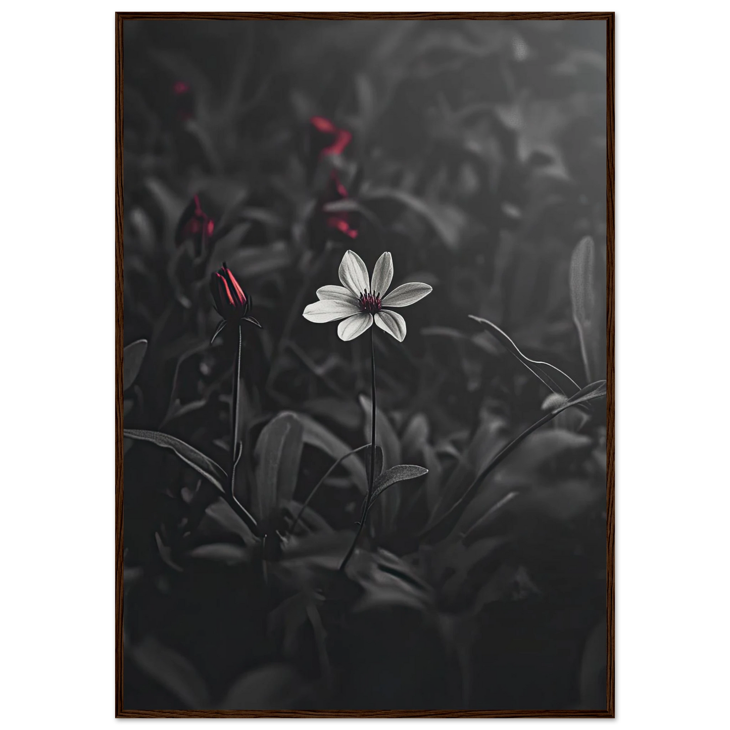 Et enkelt og sofistikert kunstverk der en lys blomst trer frem mot en dempet bakgrunn. Et visuelt blikkfang med mørk atmosfære og stilren kontrast.