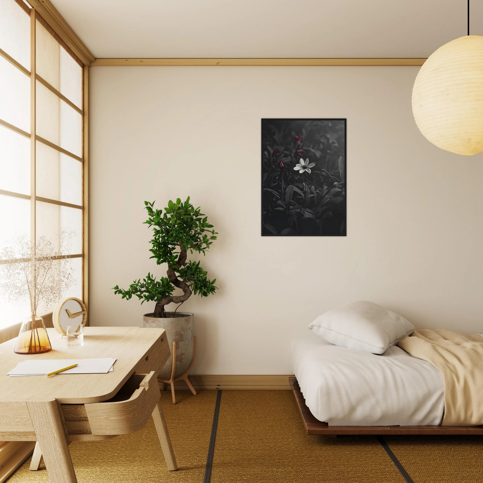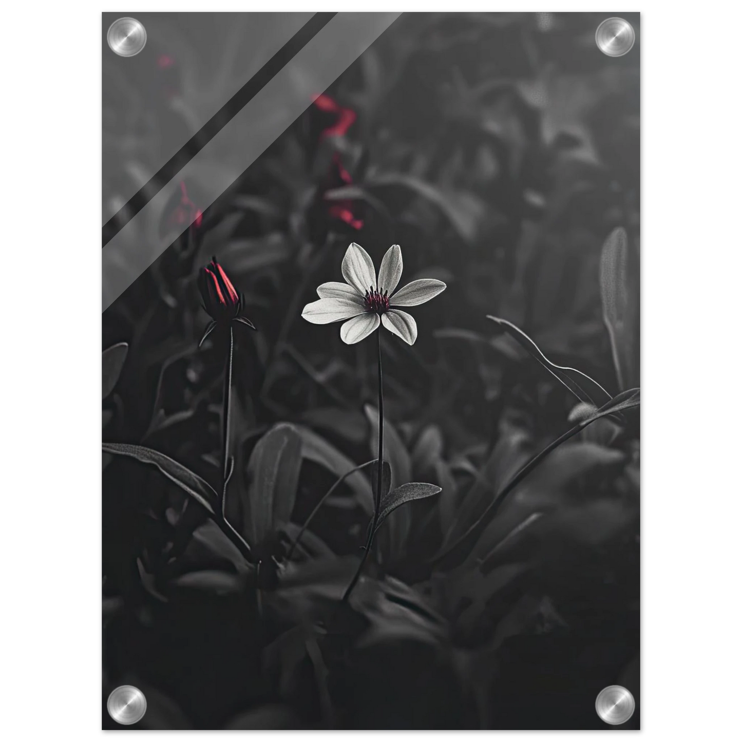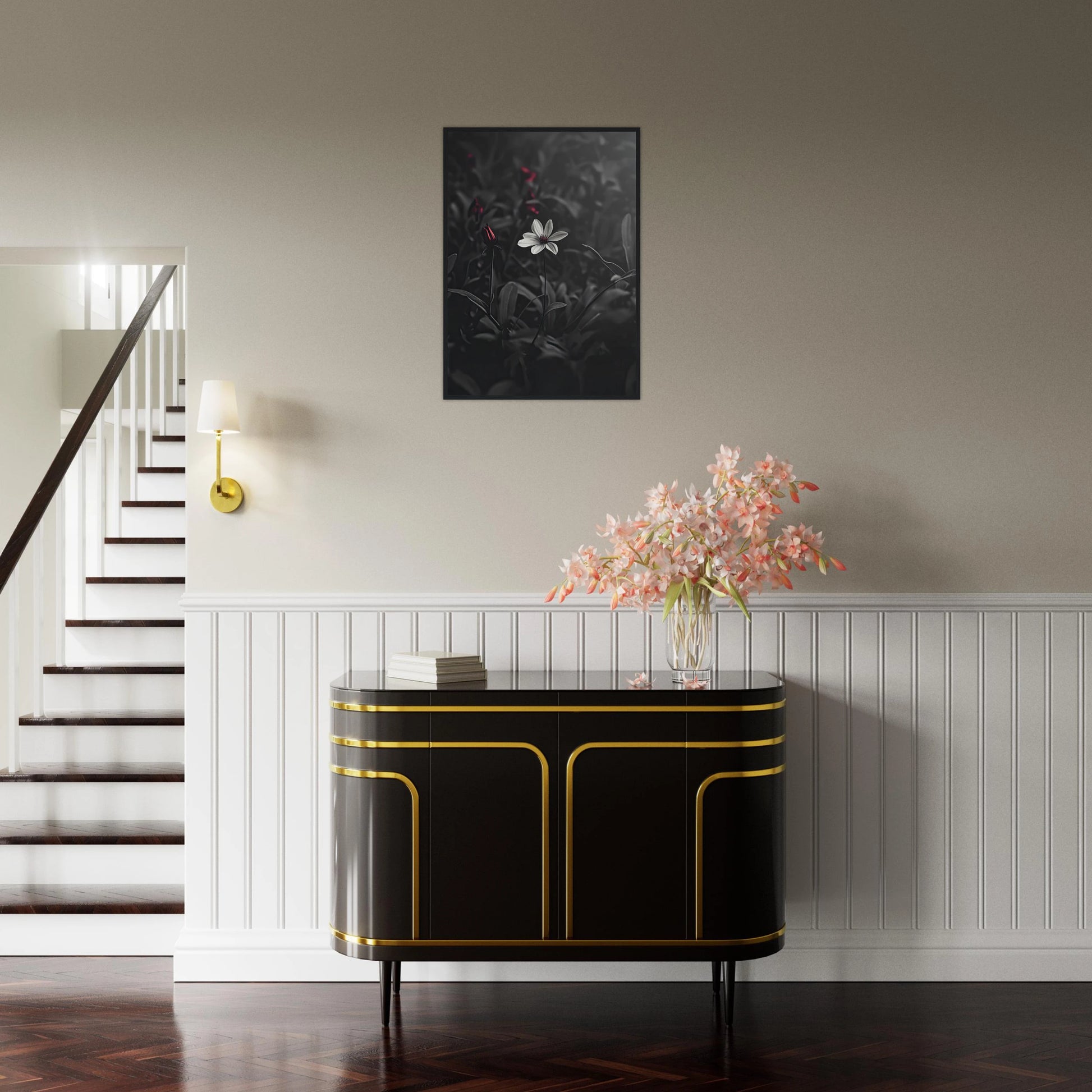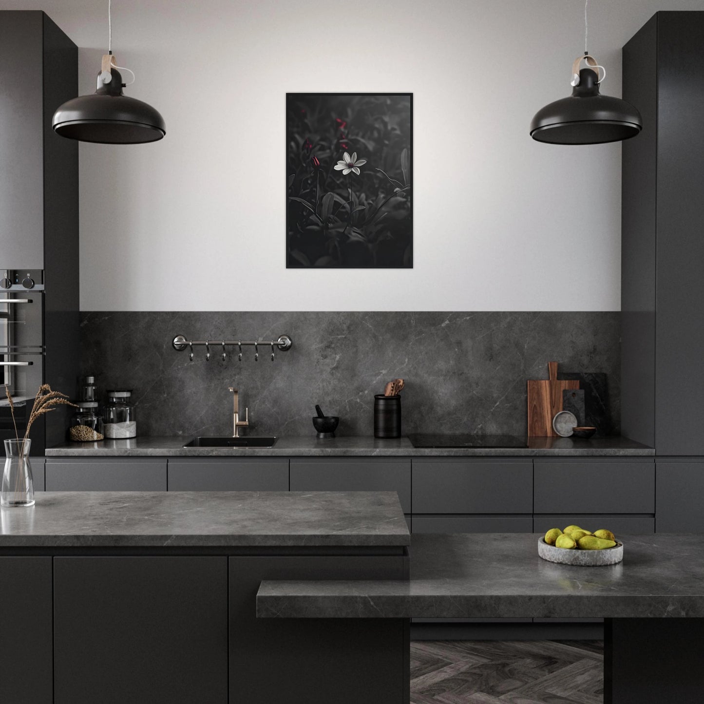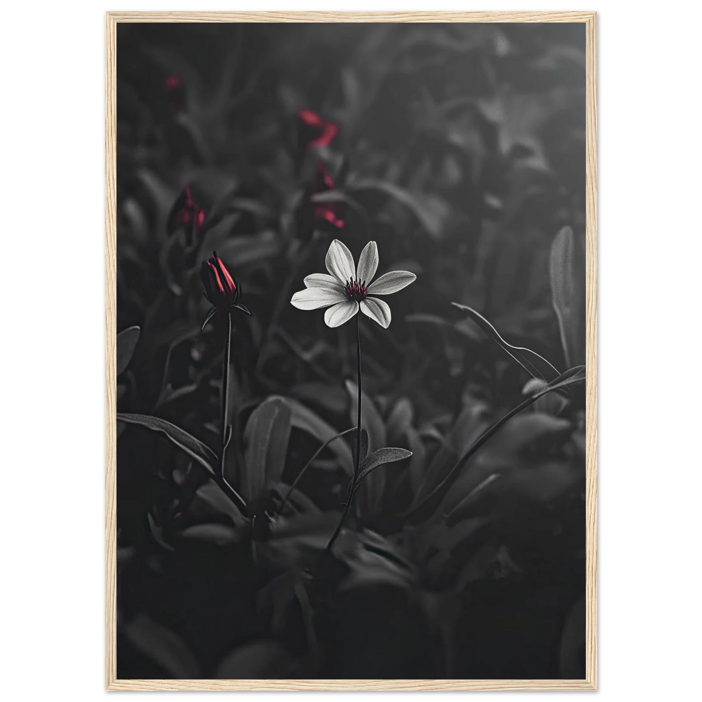 Et enkelt og sofistikert kunstverk der en lys blomst trer frem mot en dempet bakgrunn. Et visuelt blikkfang med mørk atmosfære og stilren kontrast.