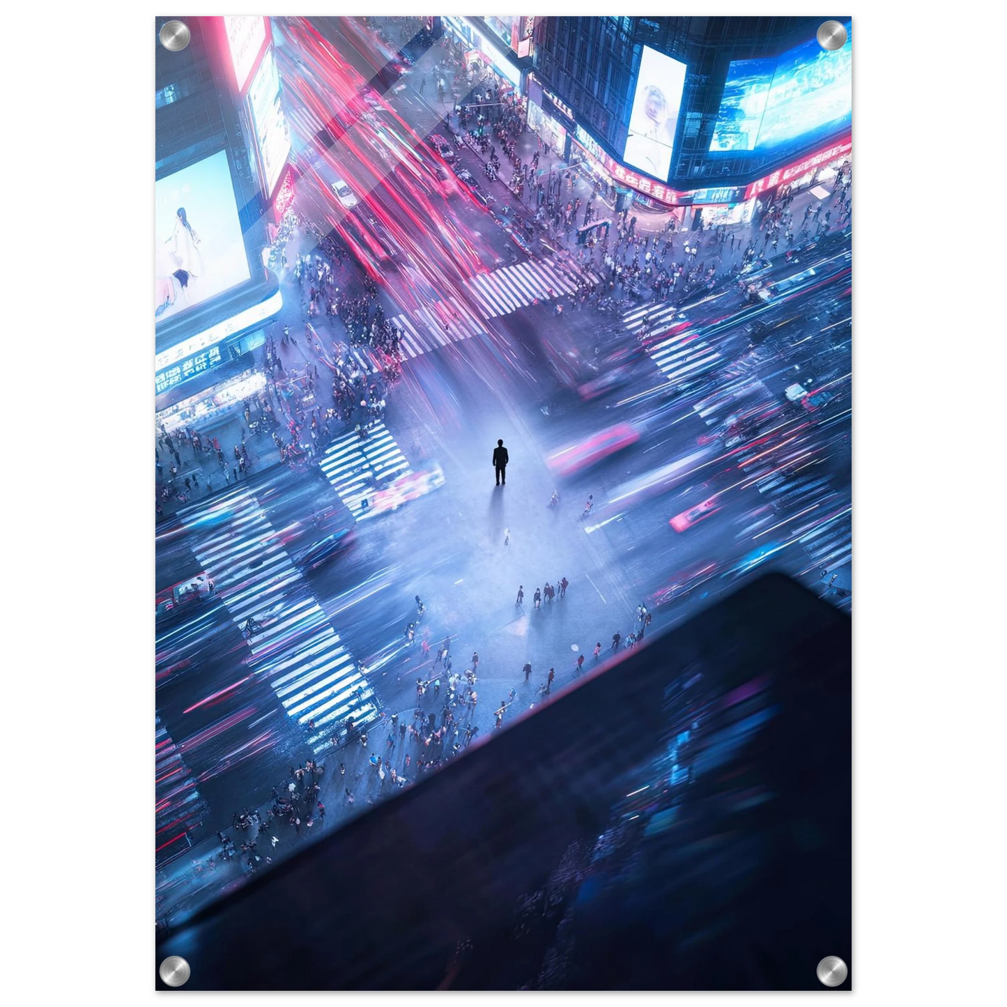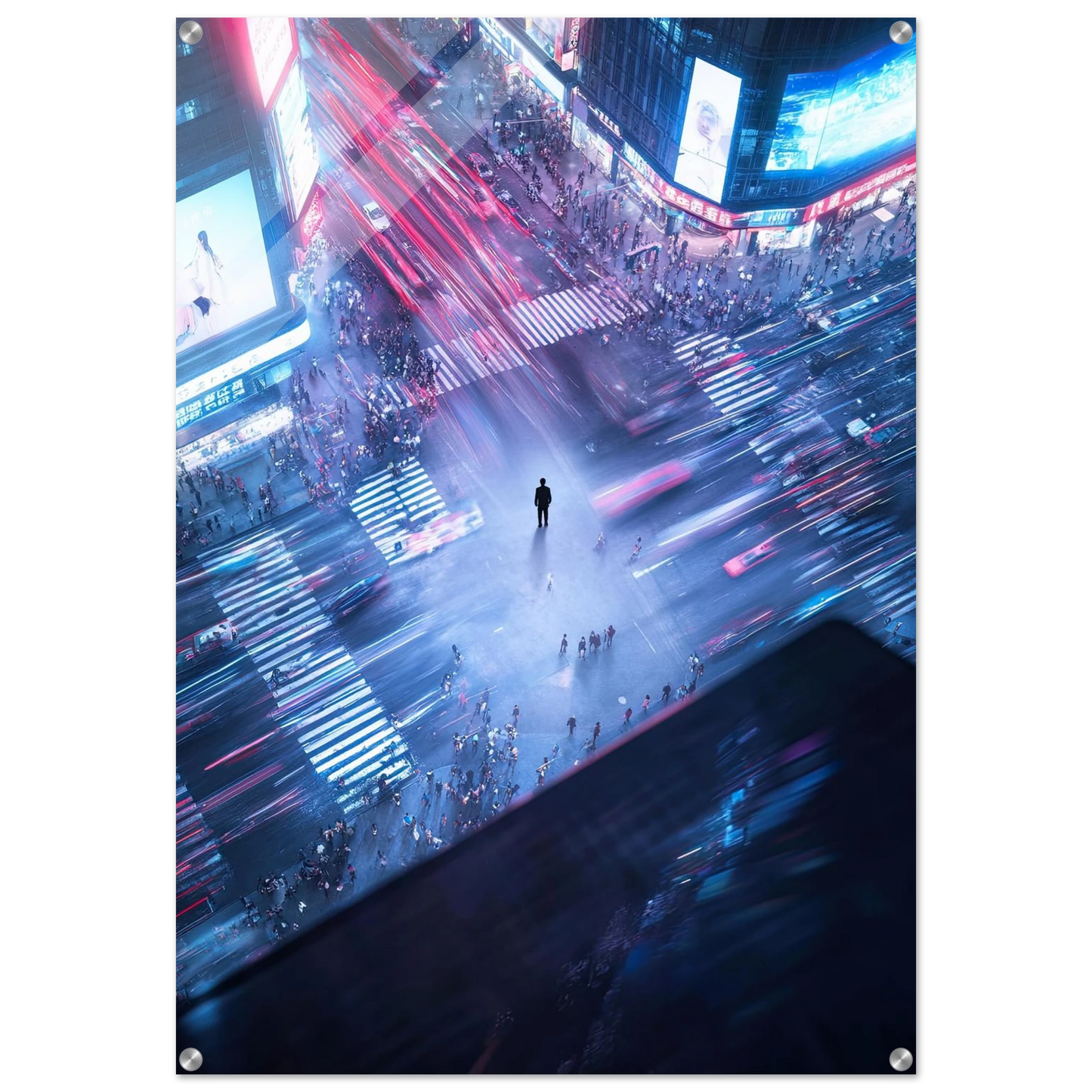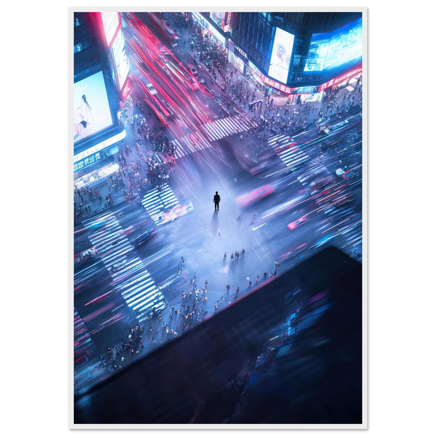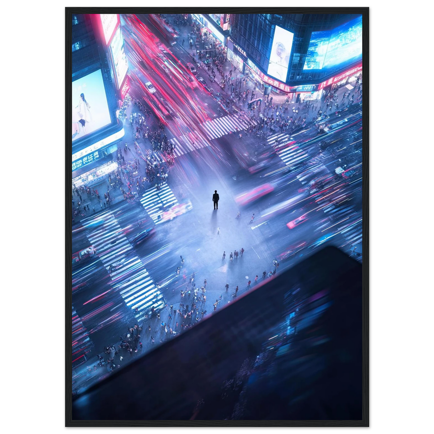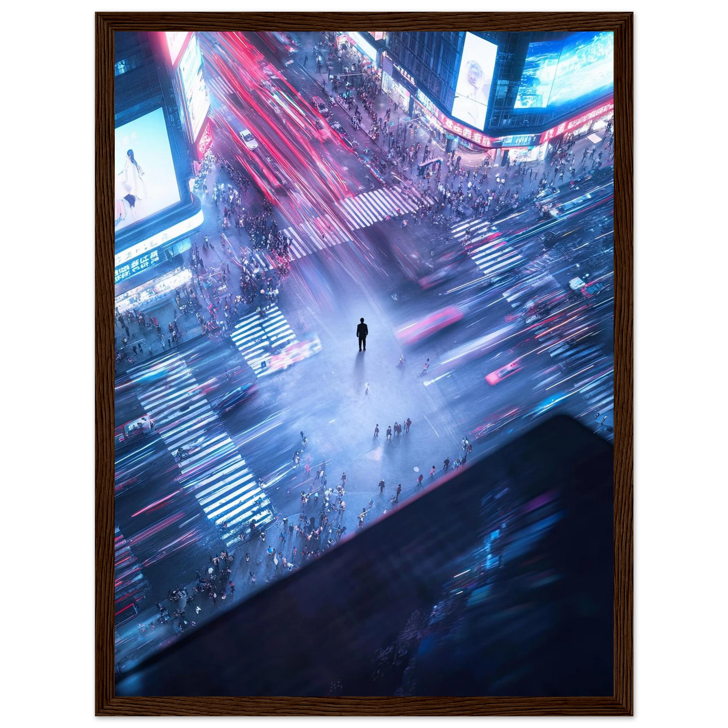 Et kraftfullt kunstverk som fanger øyeblikket der individet står stille mens byen pulserer rundt. Sett ovenfra gir bildet et nesten overjordisk perspektiv, der lys og bevegelse smelter sammen i et levende bylandskap. Perfekt for deg som vil tilføre hjemmet energi, dybde og refleksjon.