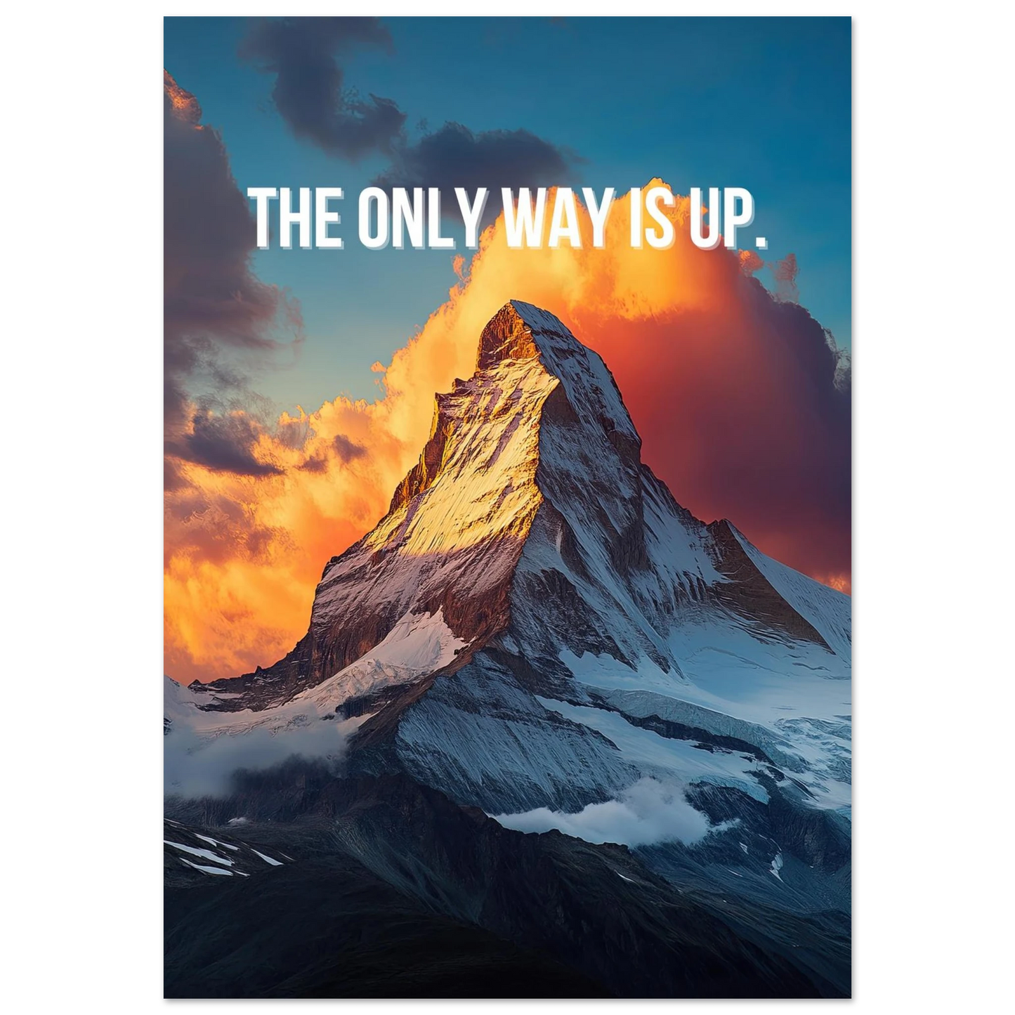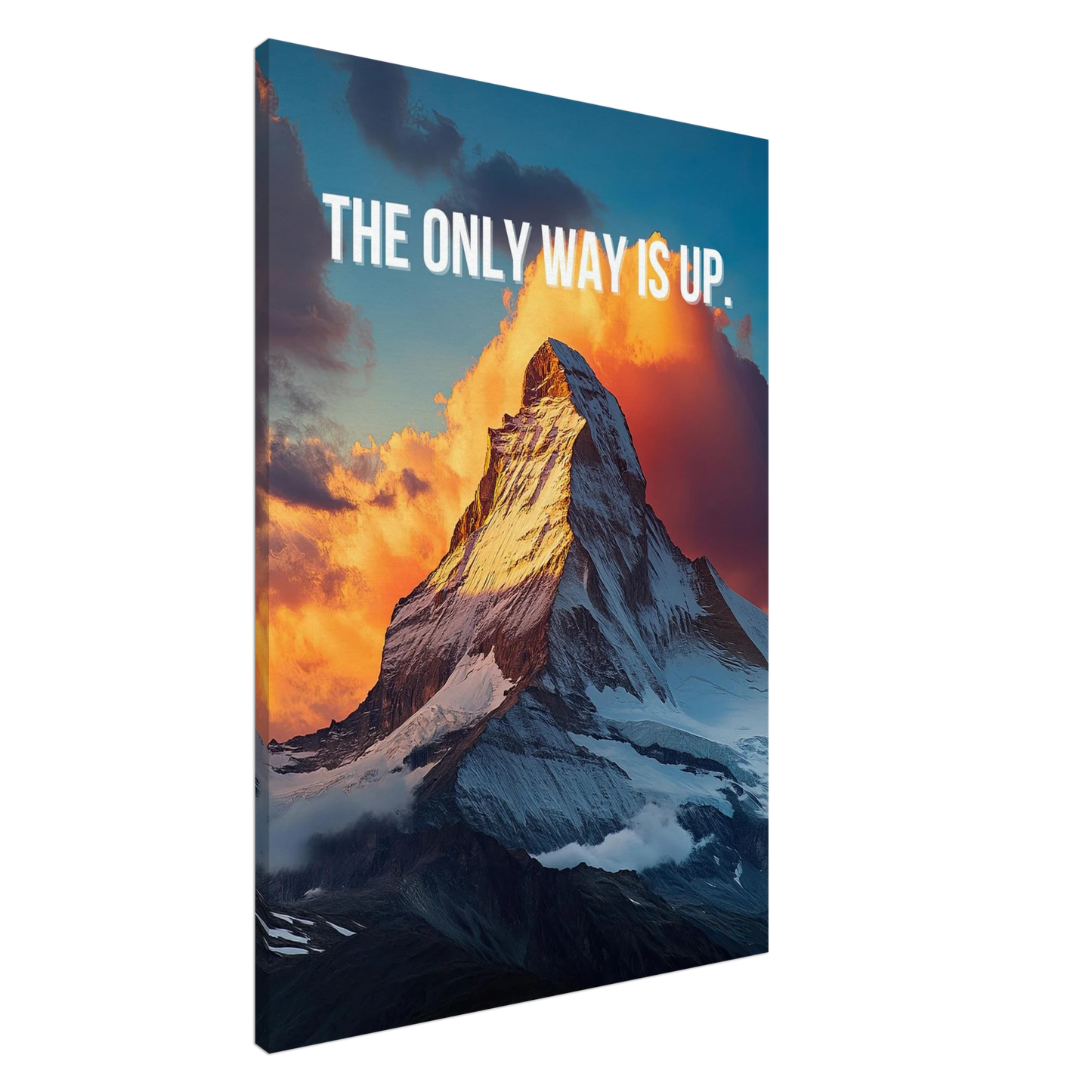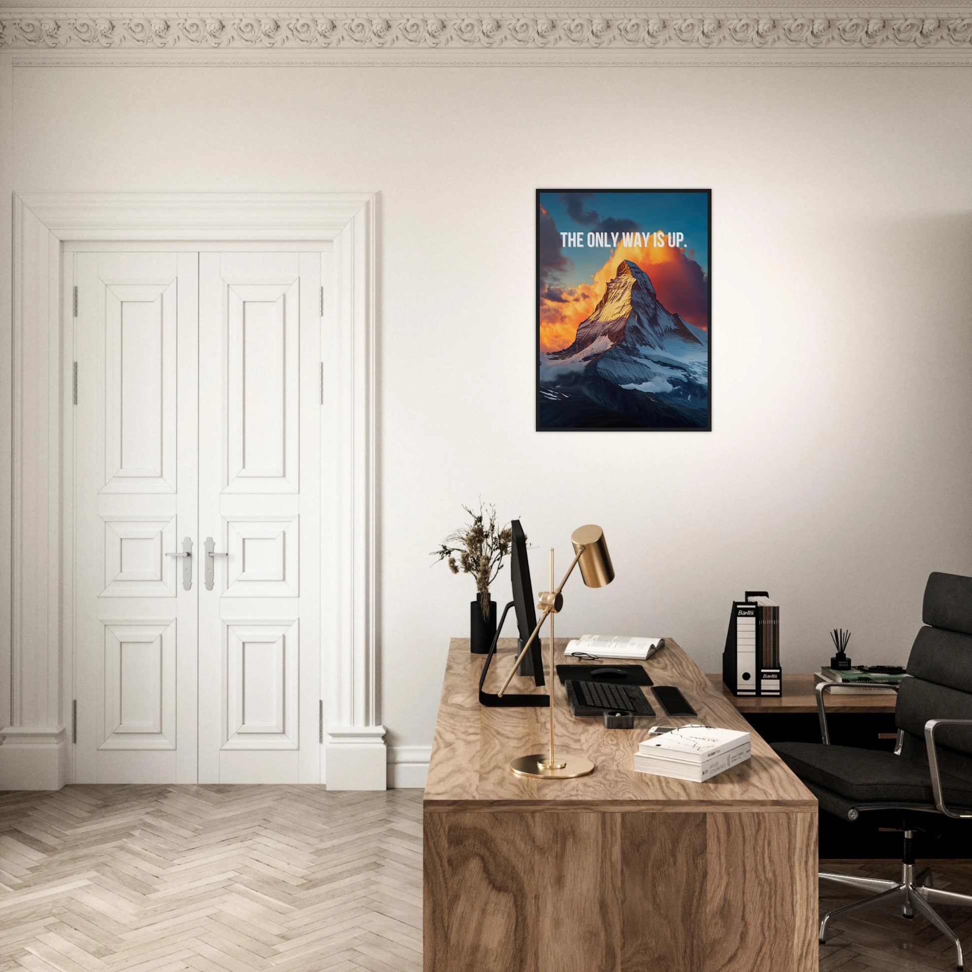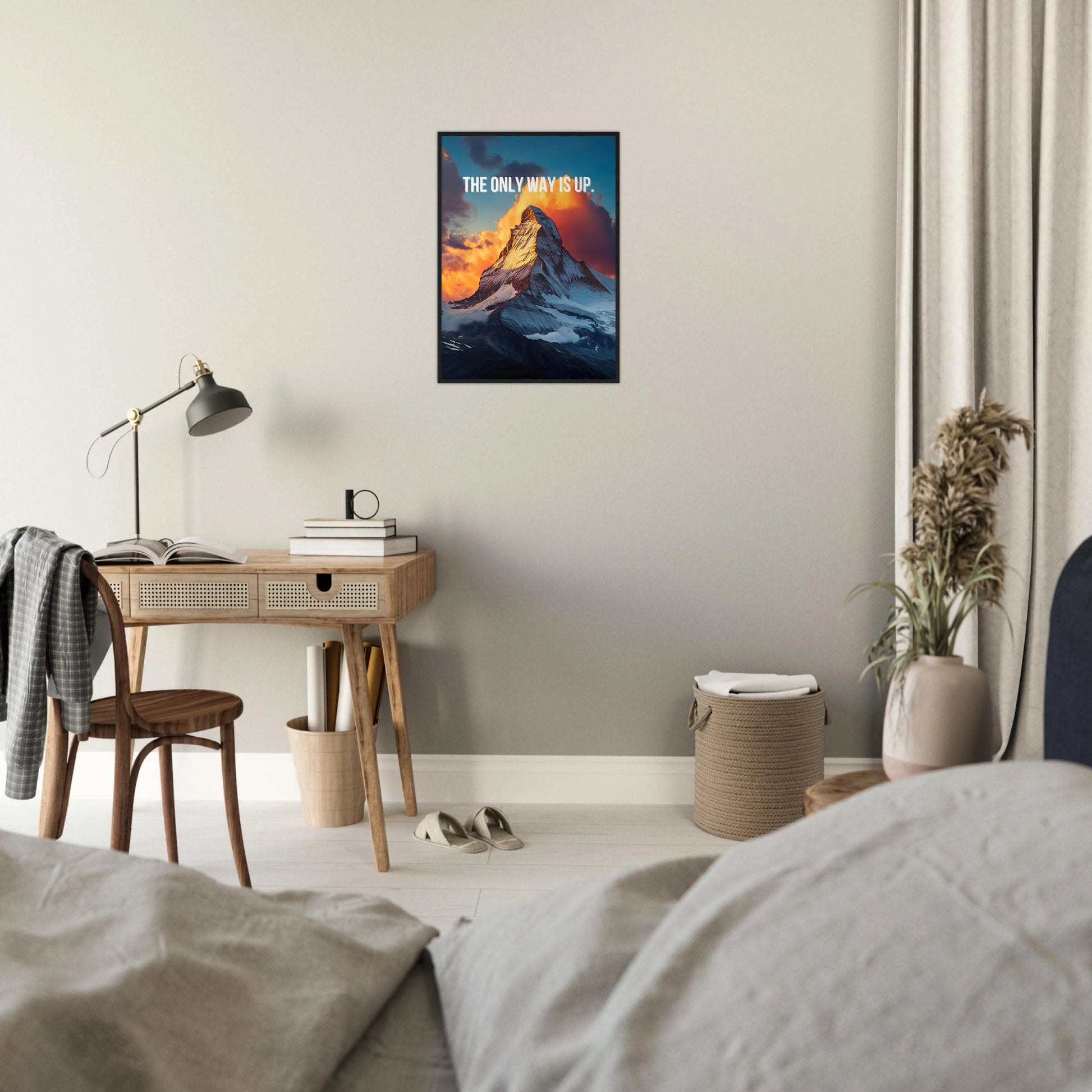 Et majestetisk fjellmotiv som symboliserer vekst, mot og uendelige muligheter. Den glødende himmelen mot fjelltoppens skarpe linjer skaper en kraftfull påminnelse om å alltid sikte høyere og aldri gi opp. Perfekt for å inspirere til fremdrift, ambisjon og troen på at veien videre alltid går oppover.