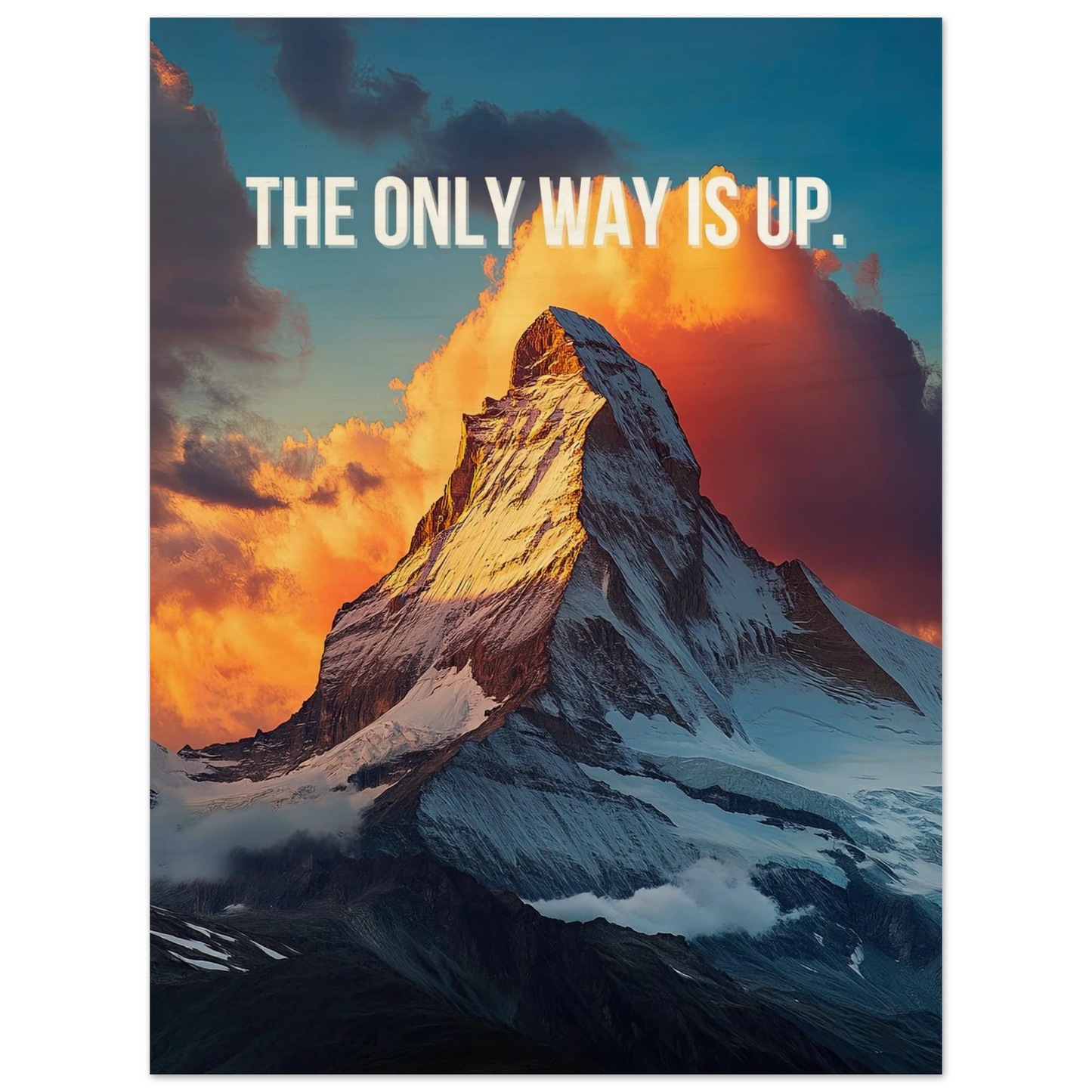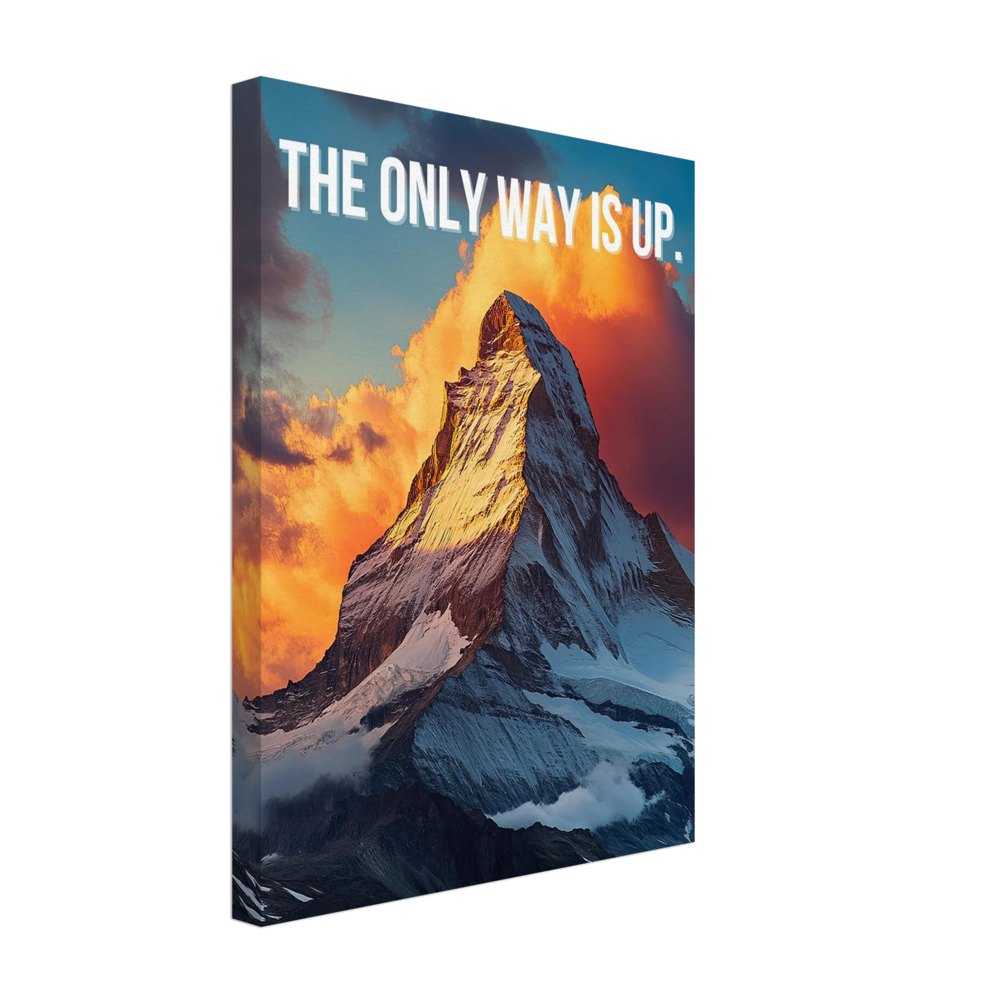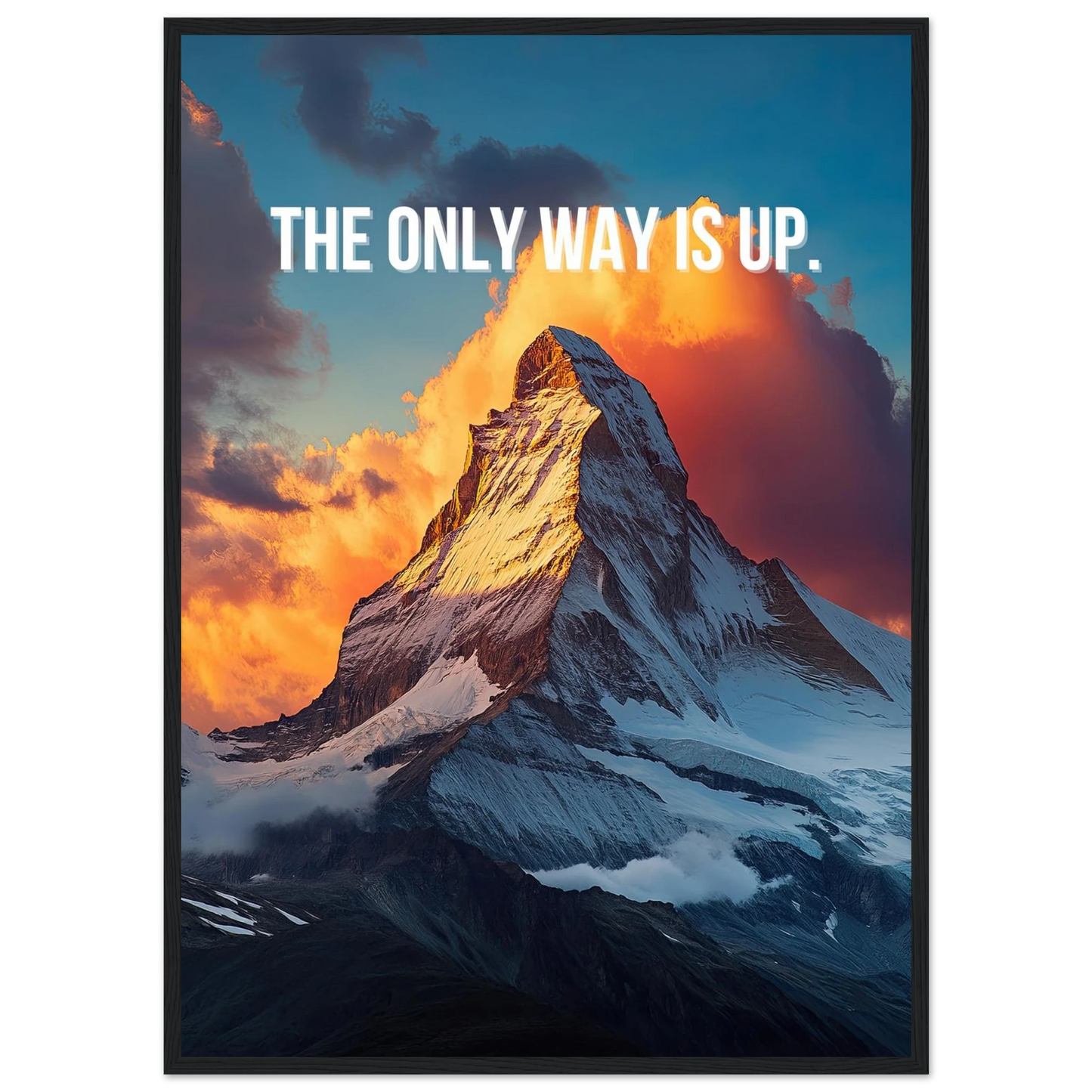 Et majestetisk fjellmotiv som symboliserer vekst, mot og uendelige muligheter. Den glødende himmelen mot fjelltoppens skarpe linjer skaper en kraftfull påminnelse om å alltid sikte høyere og aldri gi opp. Perfekt for å inspirere til fremdrift, ambisjon og troen på at veien videre alltid går oppover.