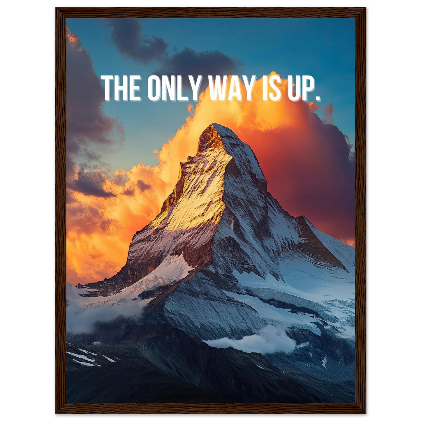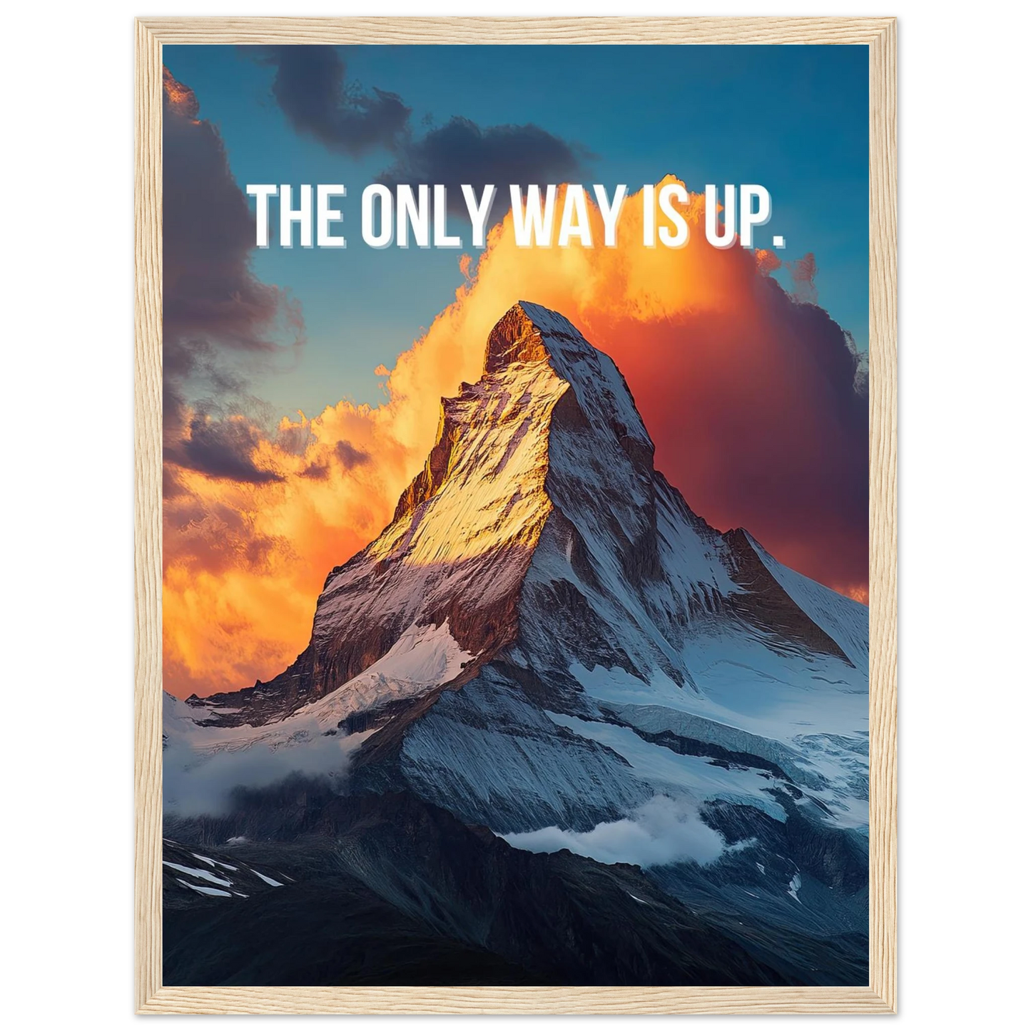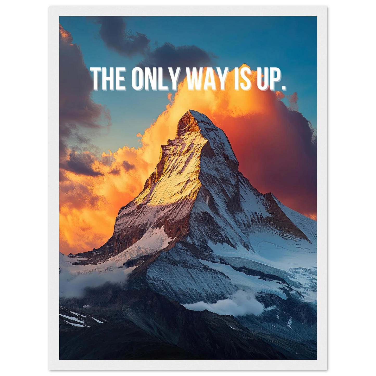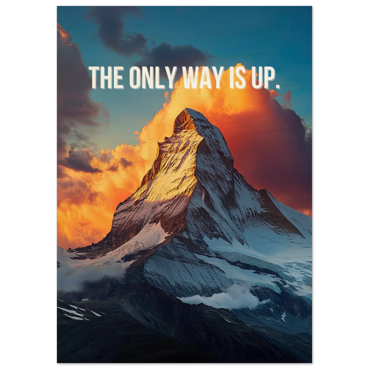 Et majestetisk fjellmotiv som symboliserer vekst, mot og uendelige muligheter. Den glødende himmelen mot fjelltoppens skarpe linjer skaper en kraftfull påminnelse om å alltid sikte høyere og aldri gi opp. Perfekt for å inspirere til fremdrift, ambisjon og troen på at veien videre alltid går oppover.