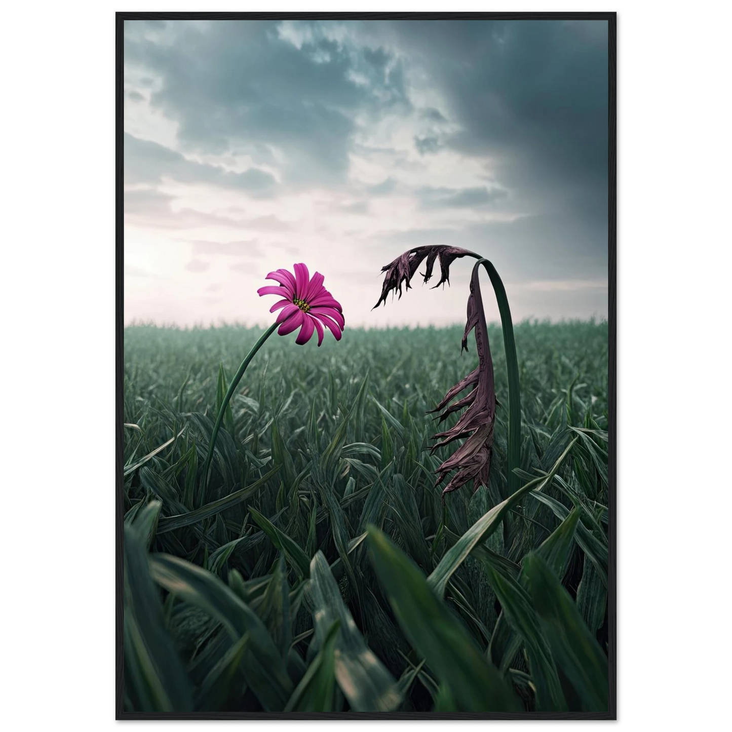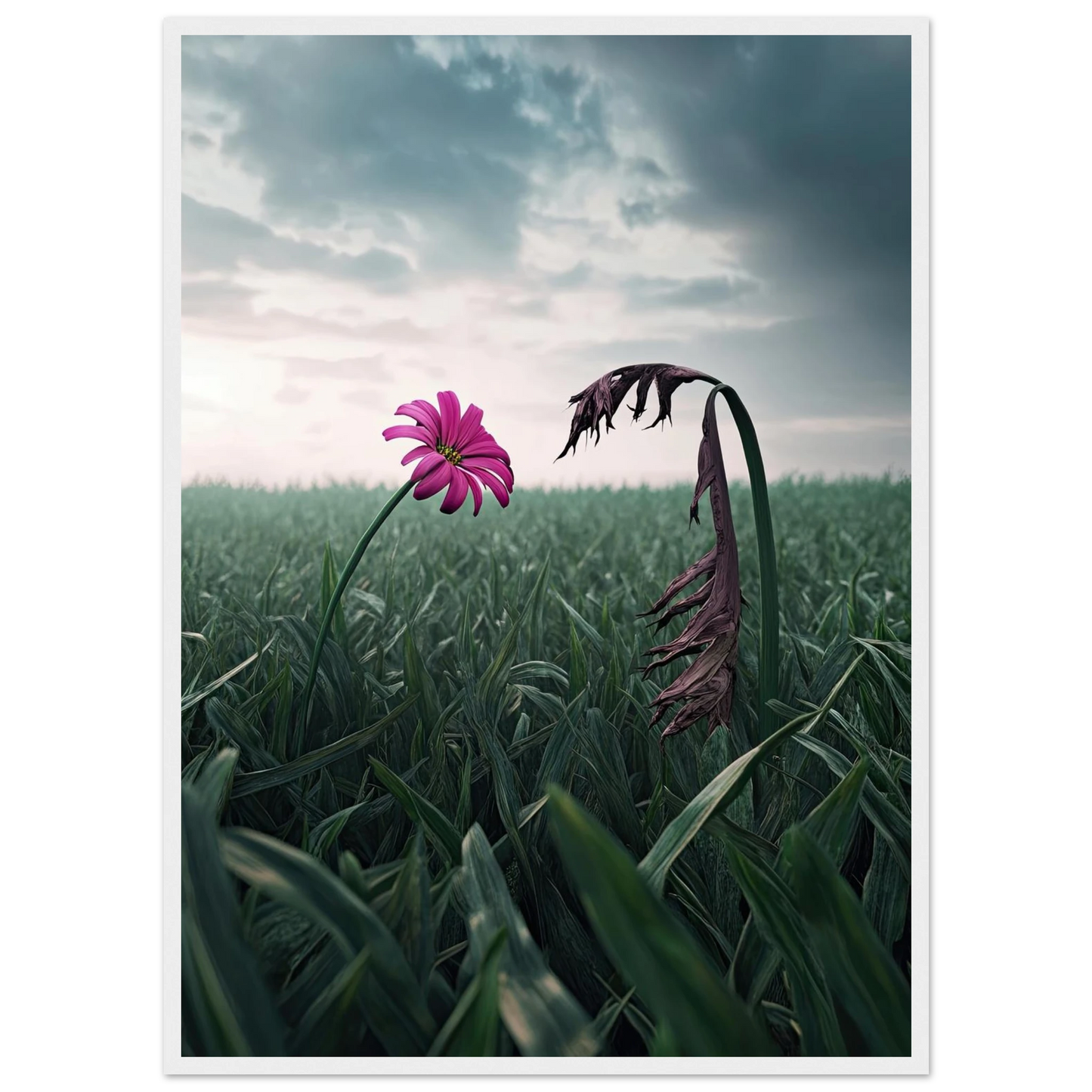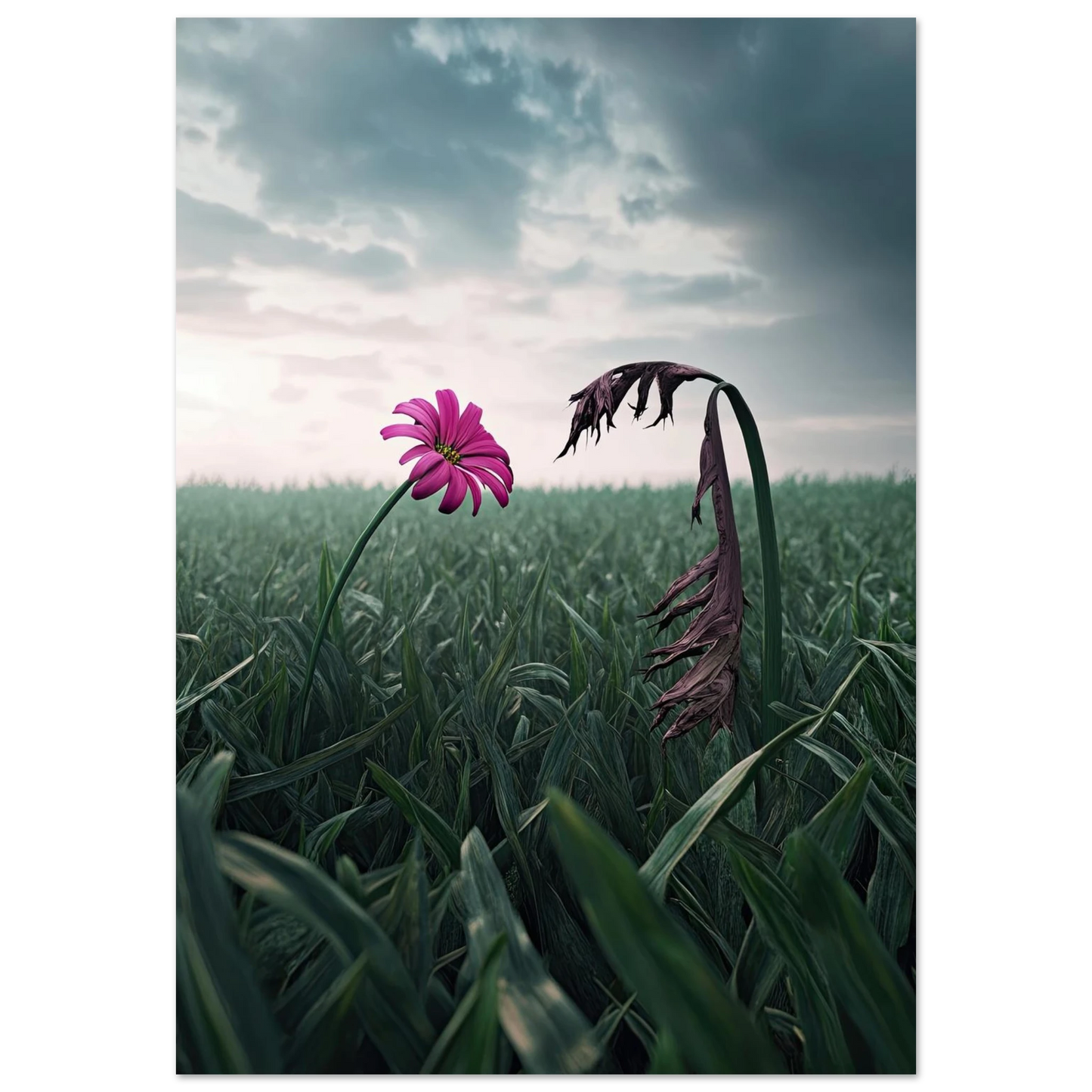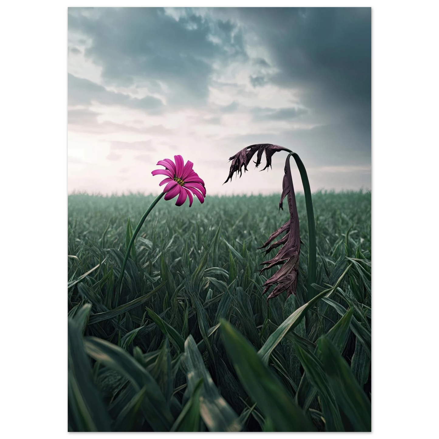En frisk rosa blomst står ved siden av en vissen – et stille og sterkt symbol på livets kontraster og syklus. Et kunstverk som vekker følelser og gir rom for refleksjon.