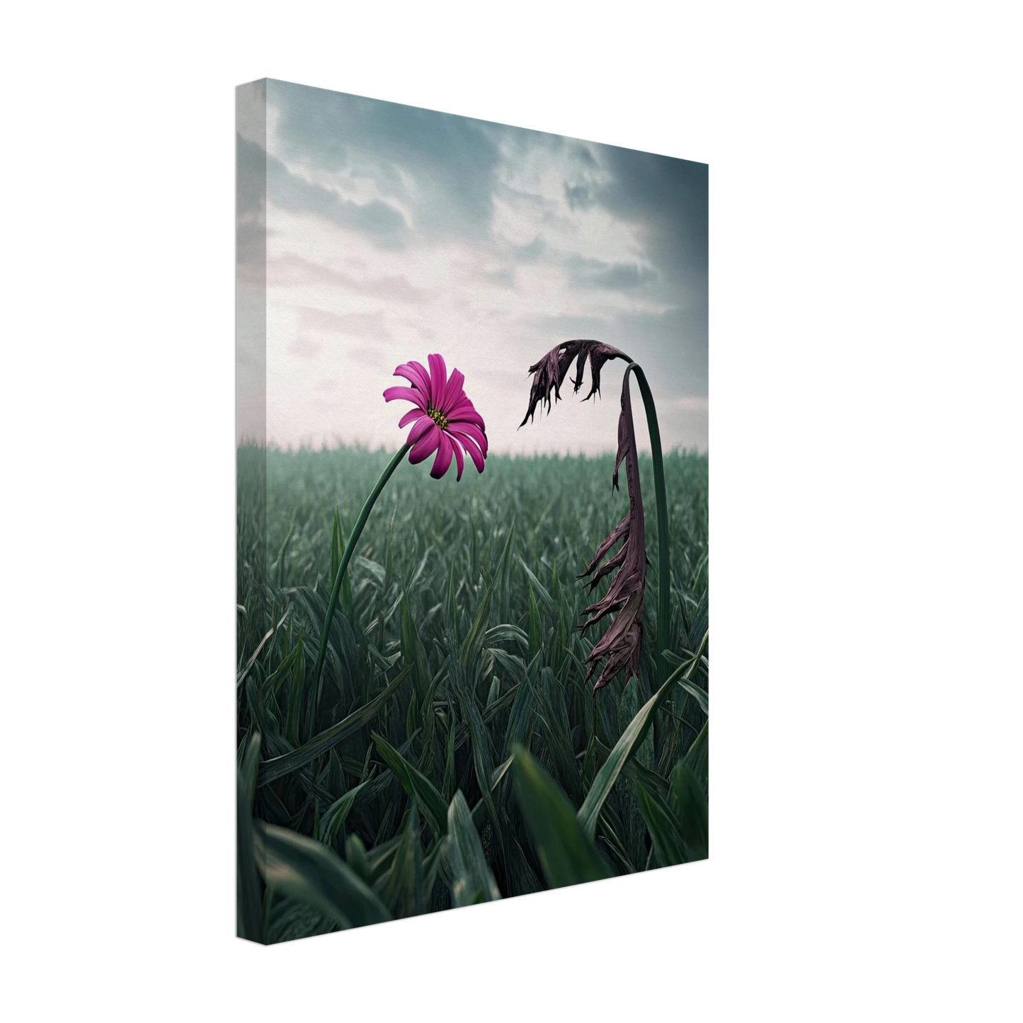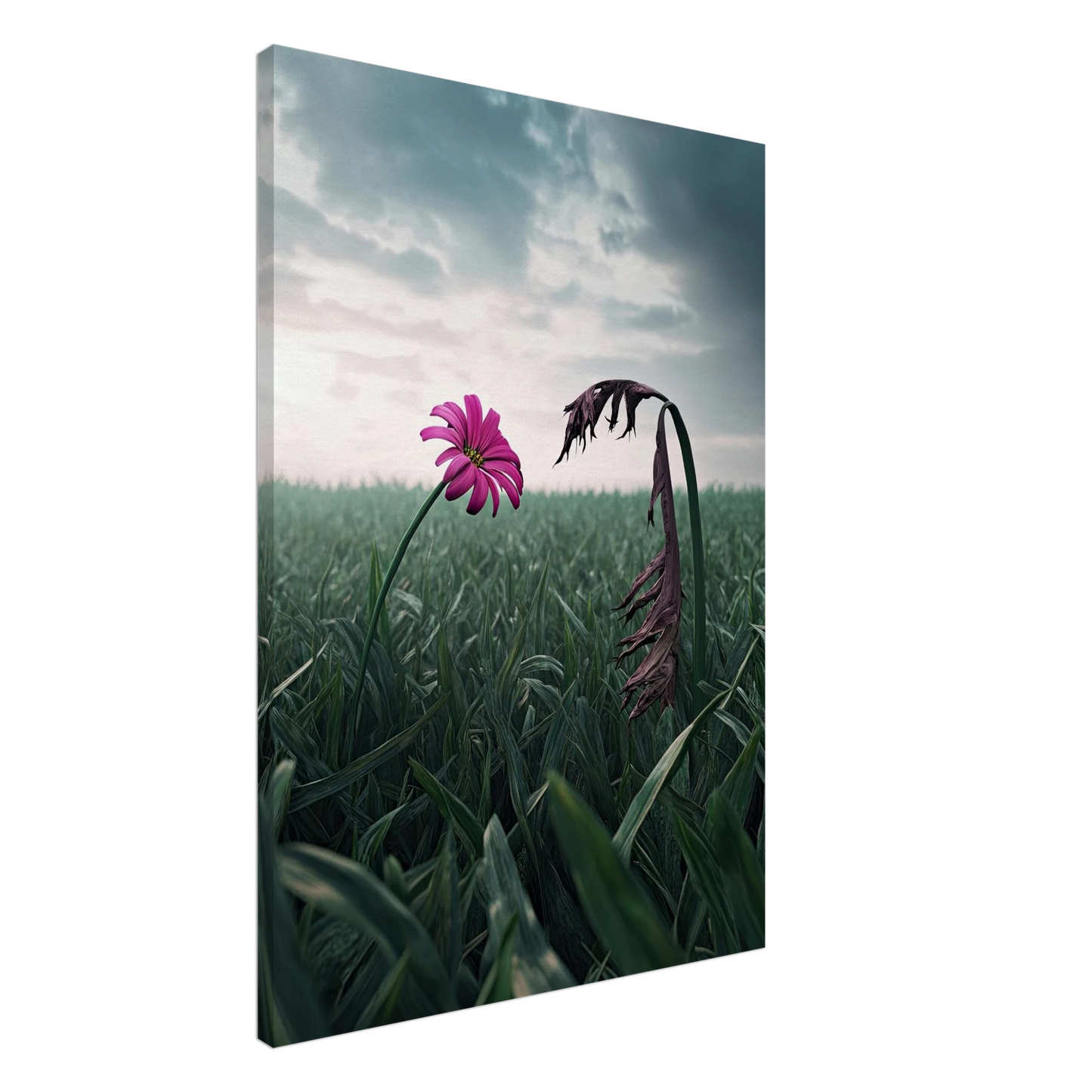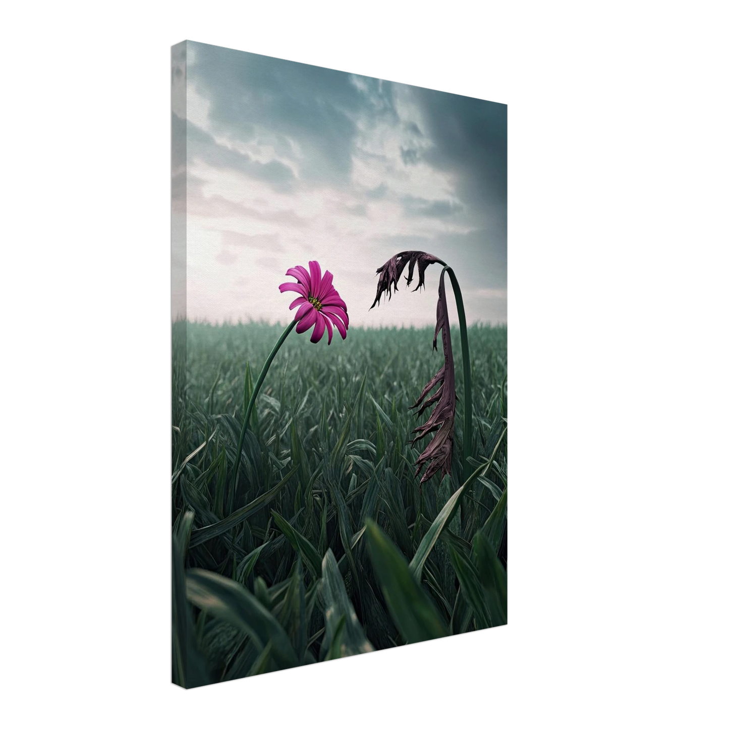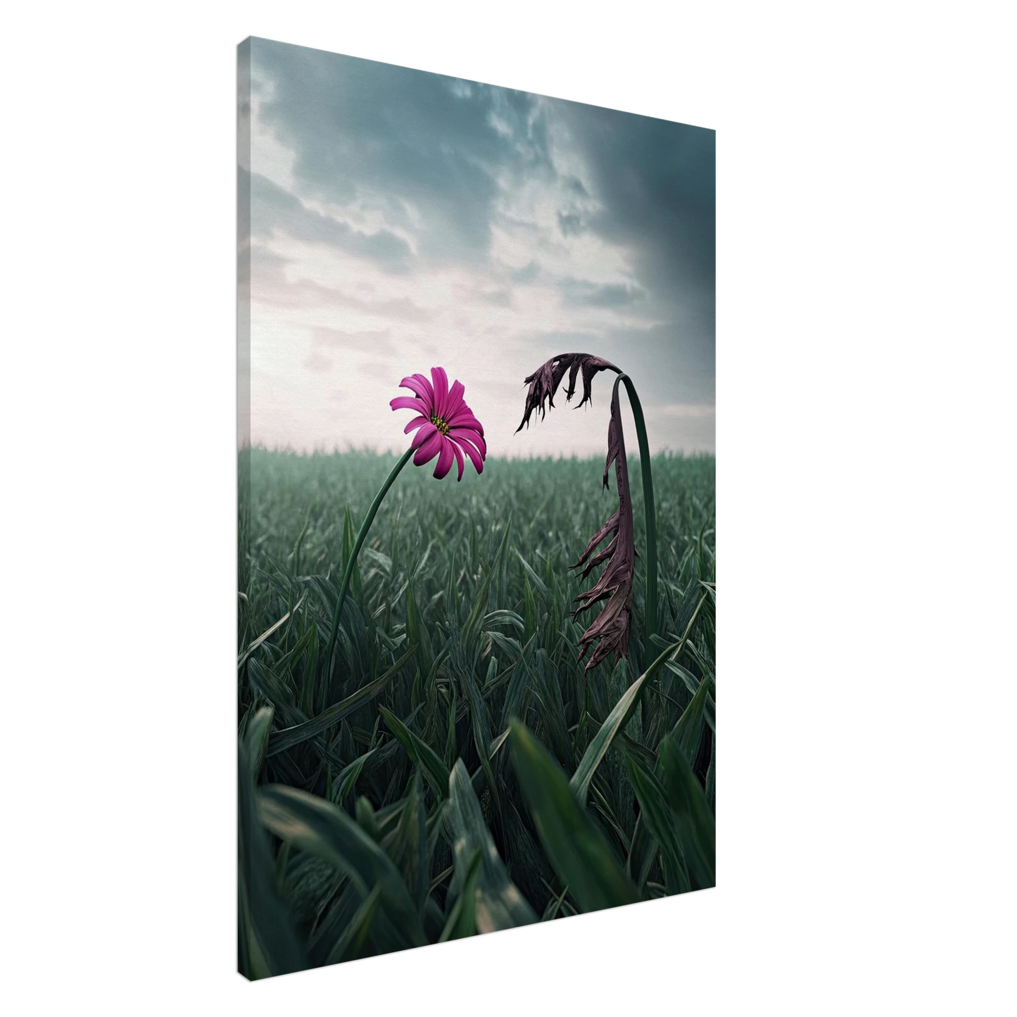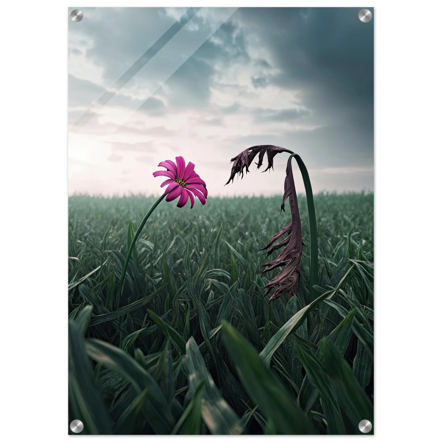 En frisk rosa blomst står ved siden av en vissen – et stille og sterkt symbol på livets kontraster og syklus. Et kunstverk som vekker følelser og gir rom for refleksjon.