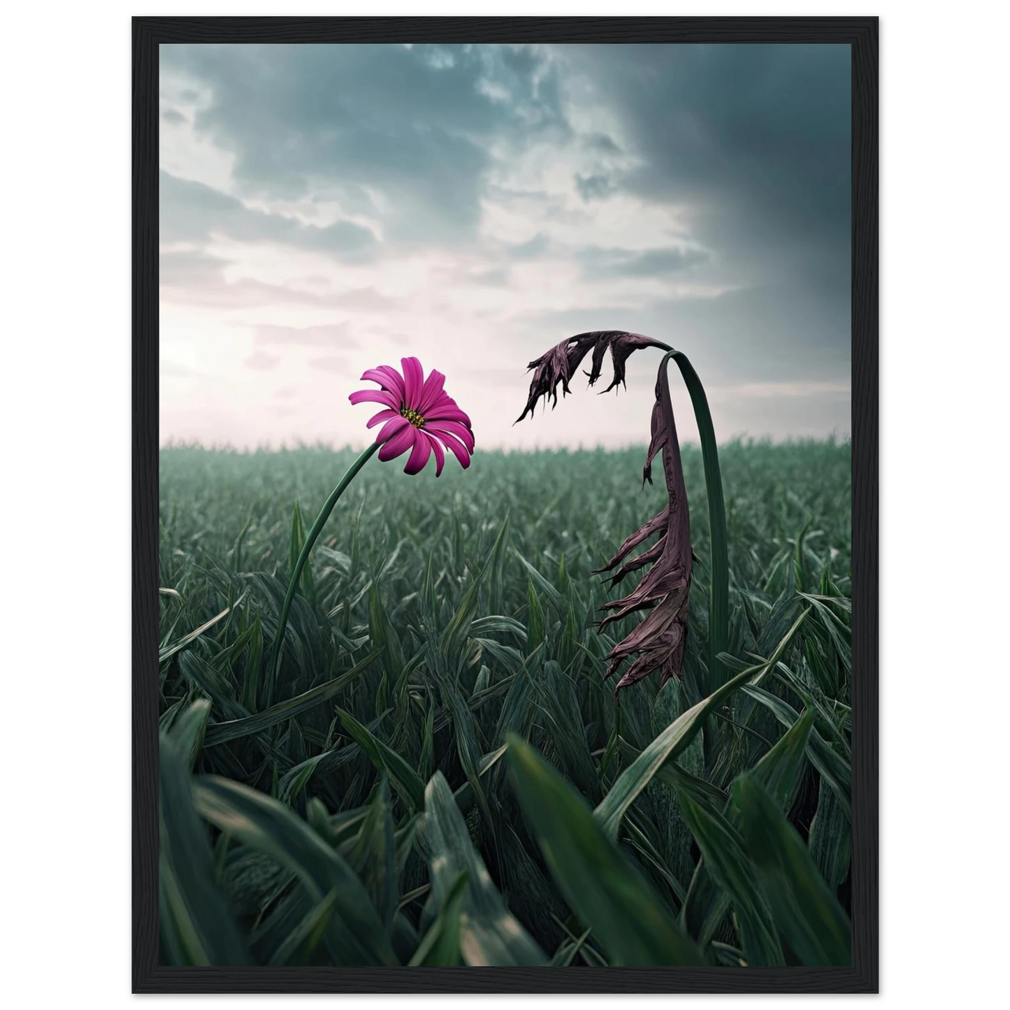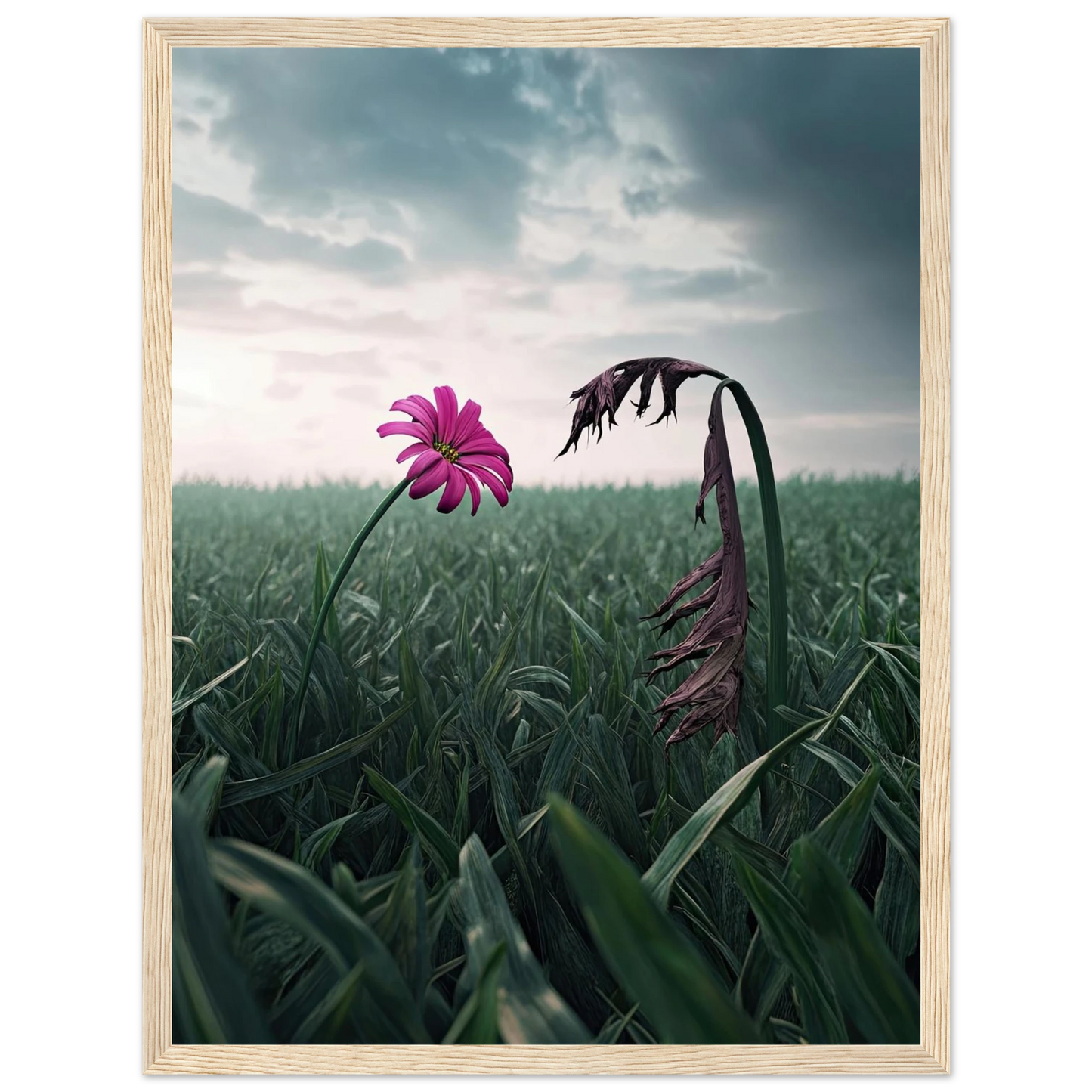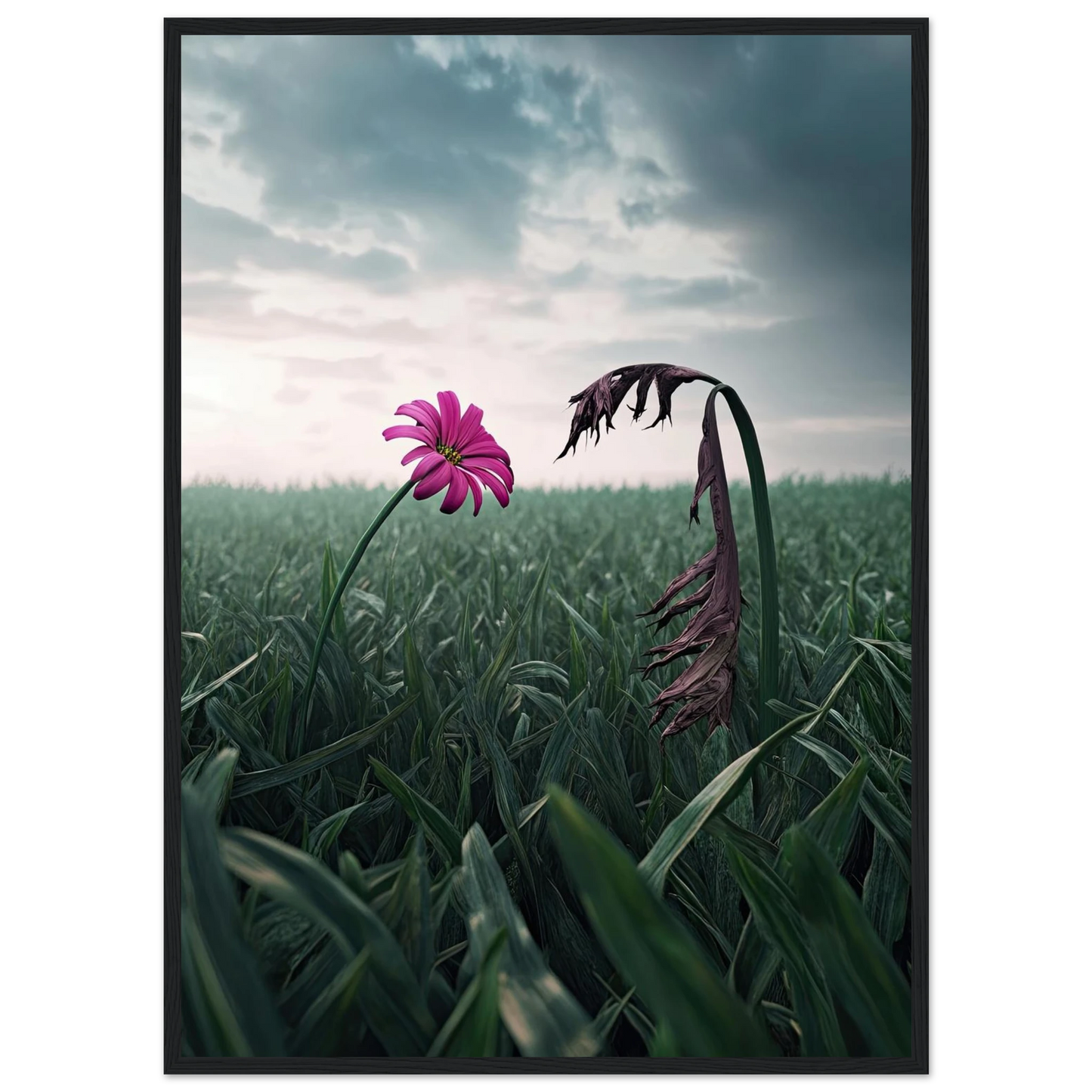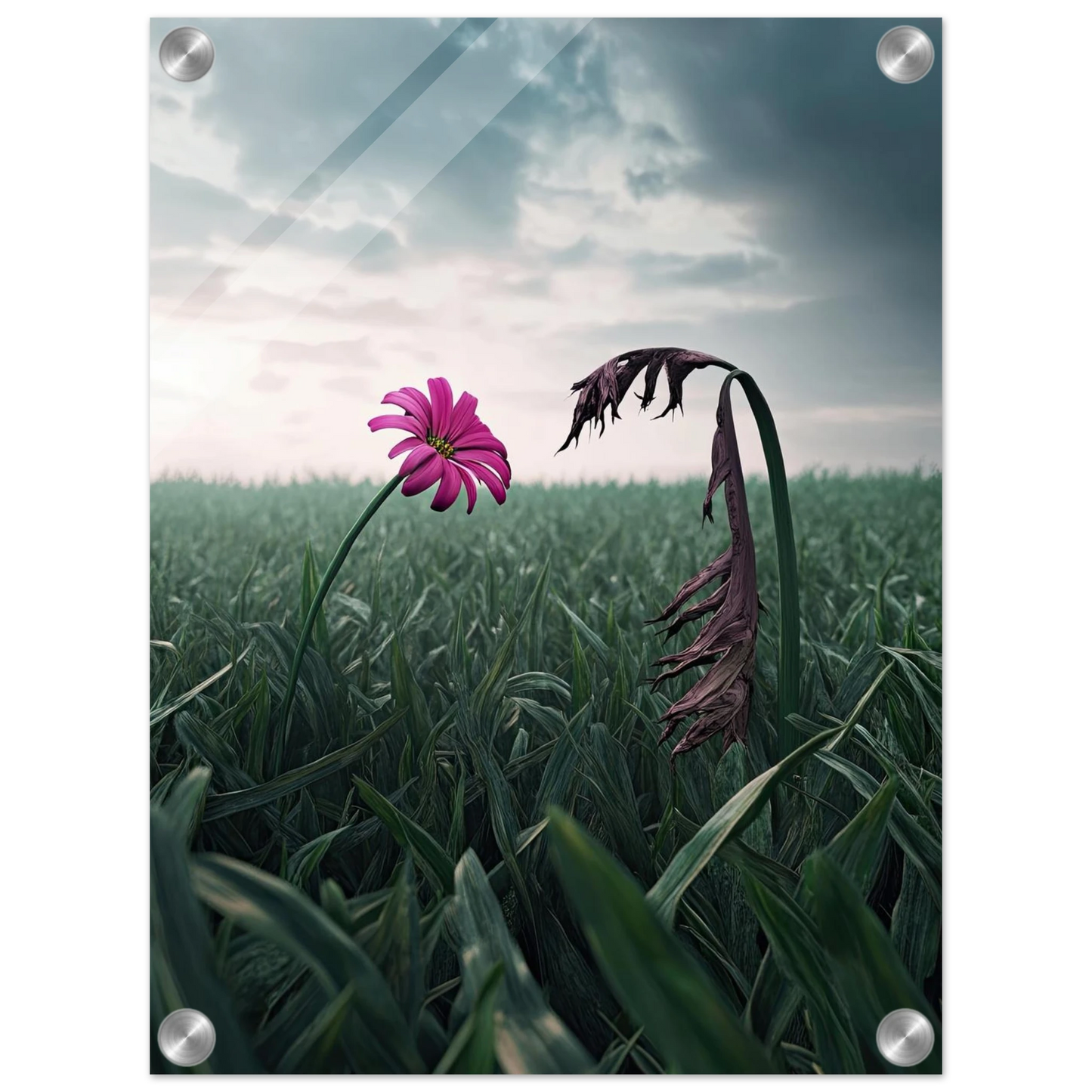 En frisk rosa blomst står ved siden av en vissen – et stille og sterkt symbol på livets kontraster og syklus. Et kunstverk som vekker følelser og gir rom for refleksjon.