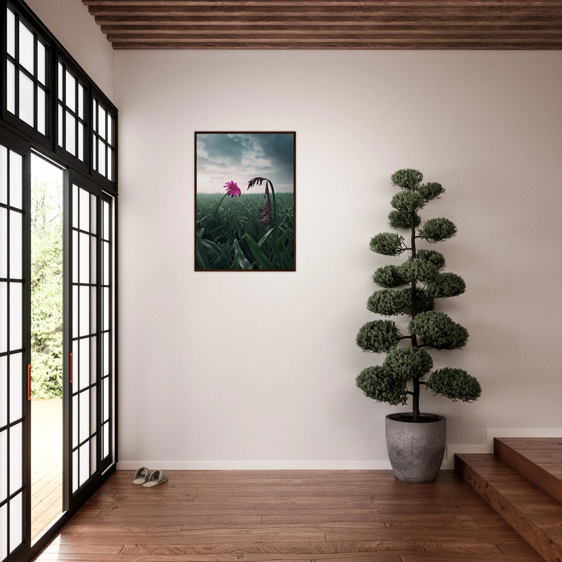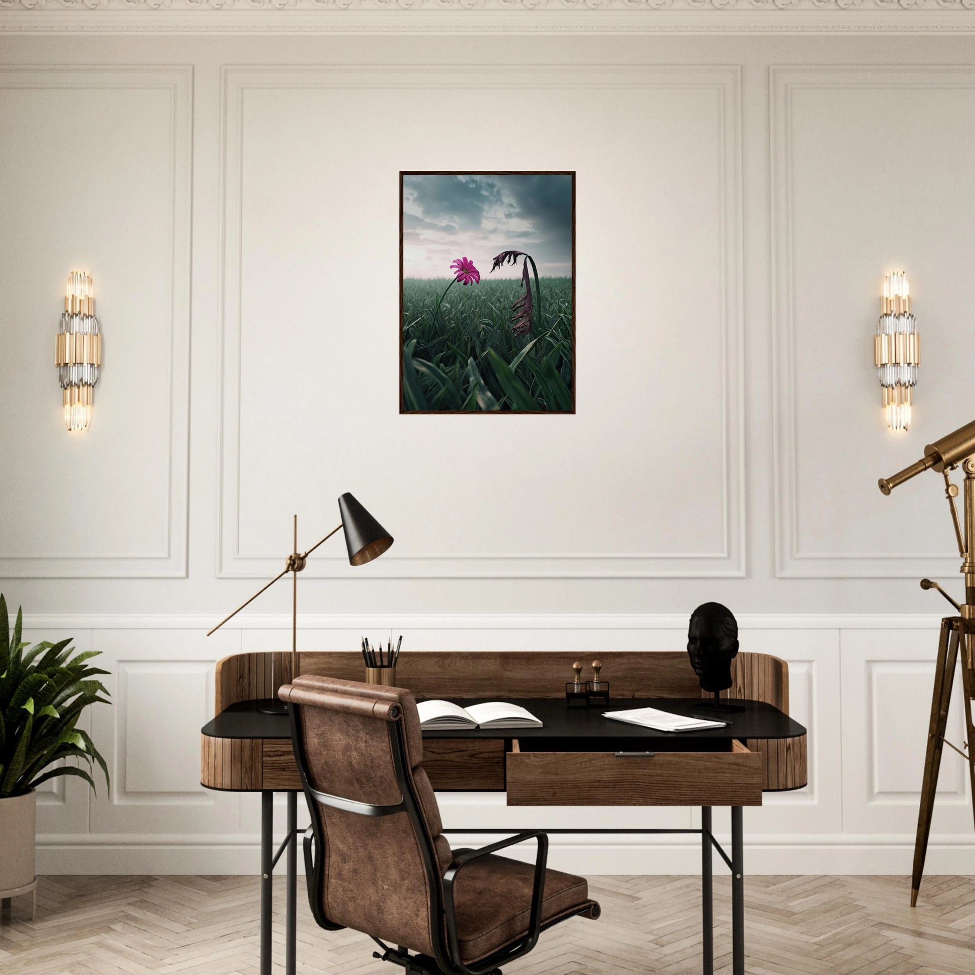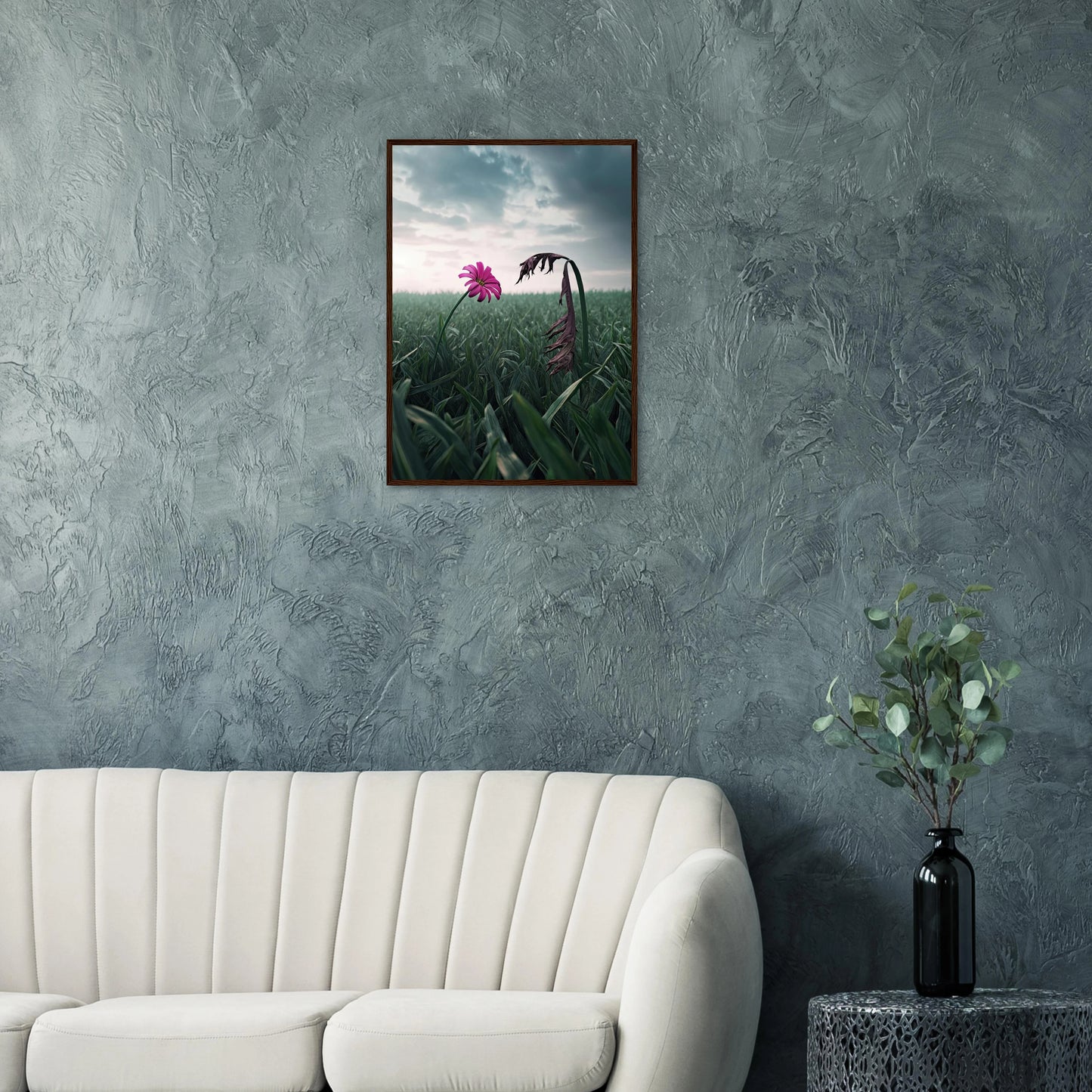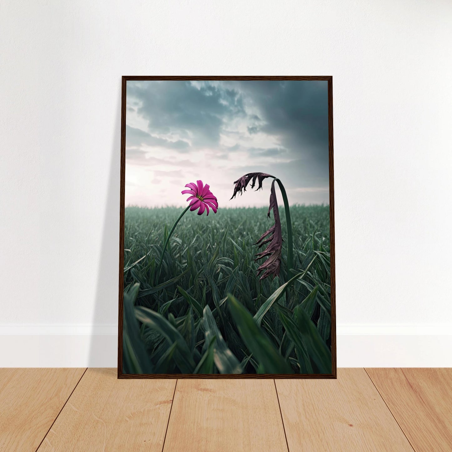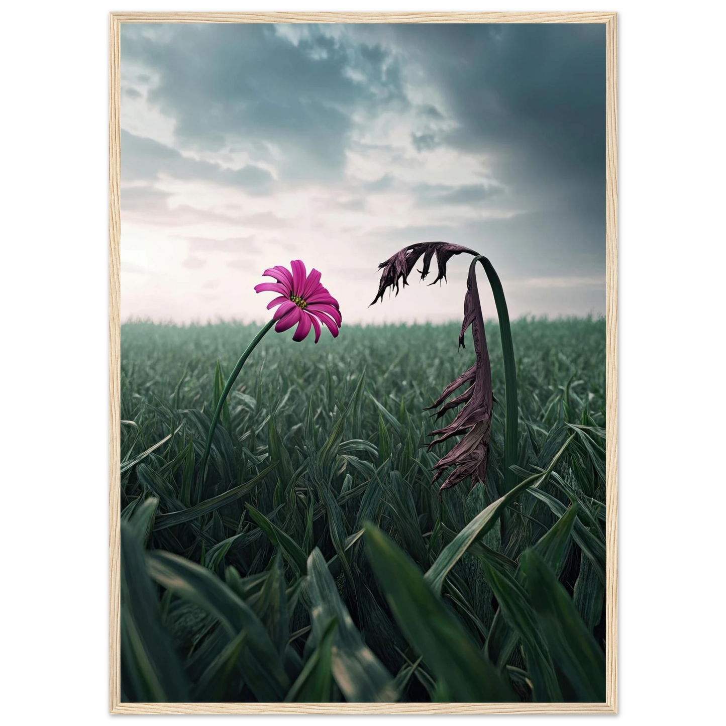 En frisk rosa blomst står ved siden av en vissen – et stille og sterkt symbol på livets kontraster og syklus. Et kunstverk som vekker følelser og gir rom for refleksjon.