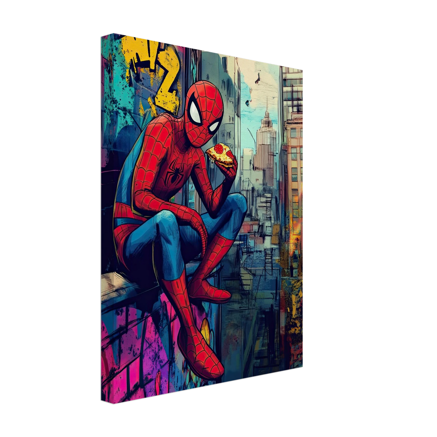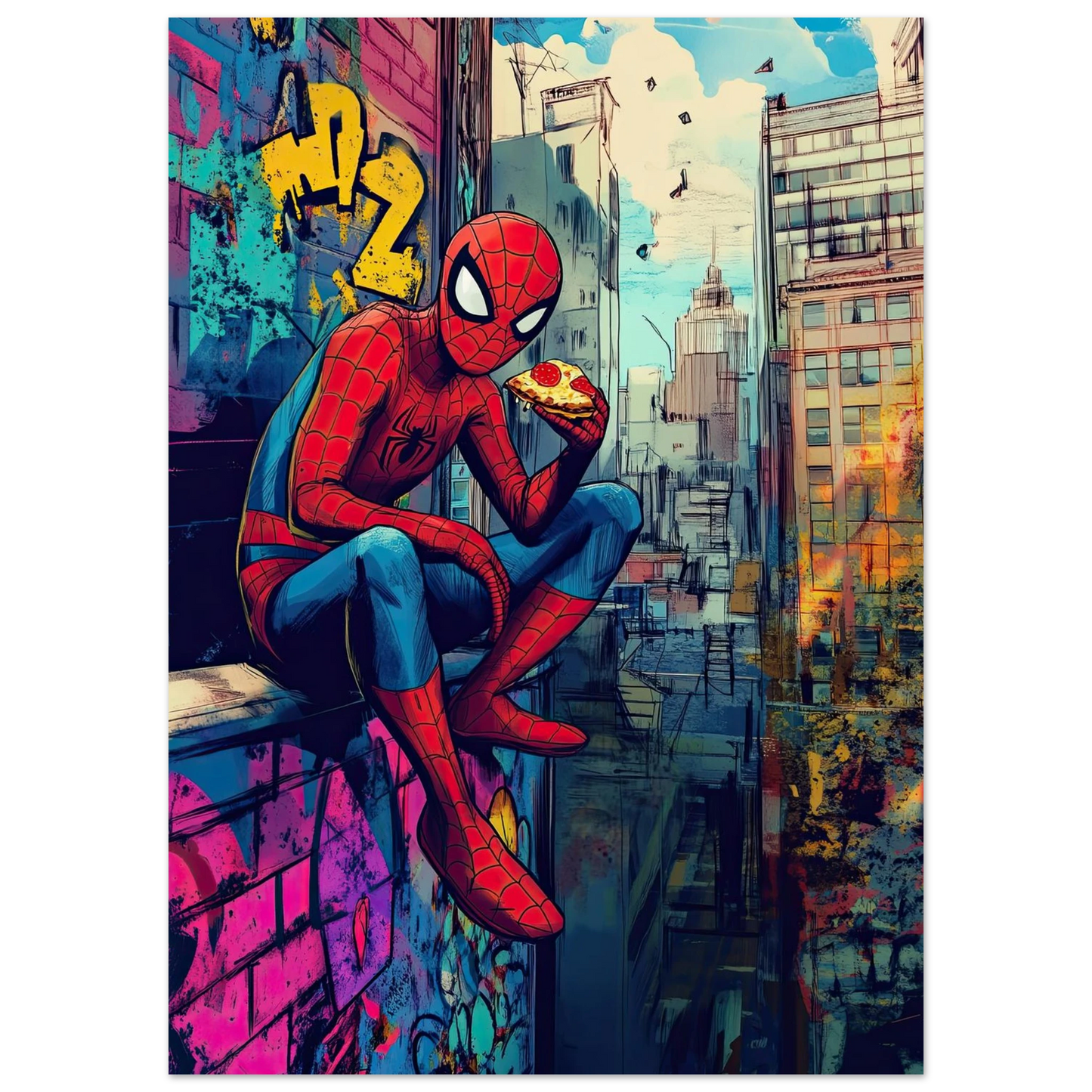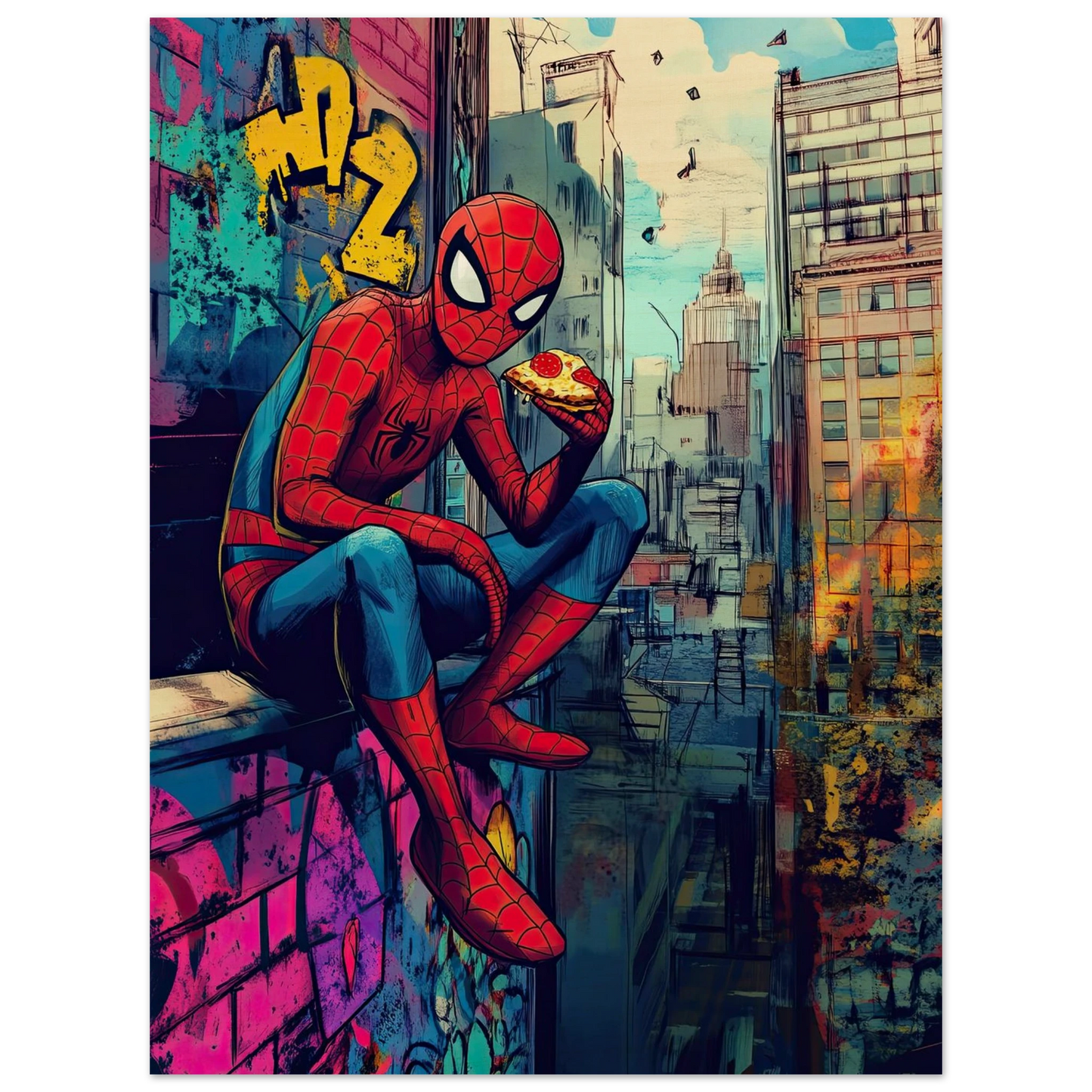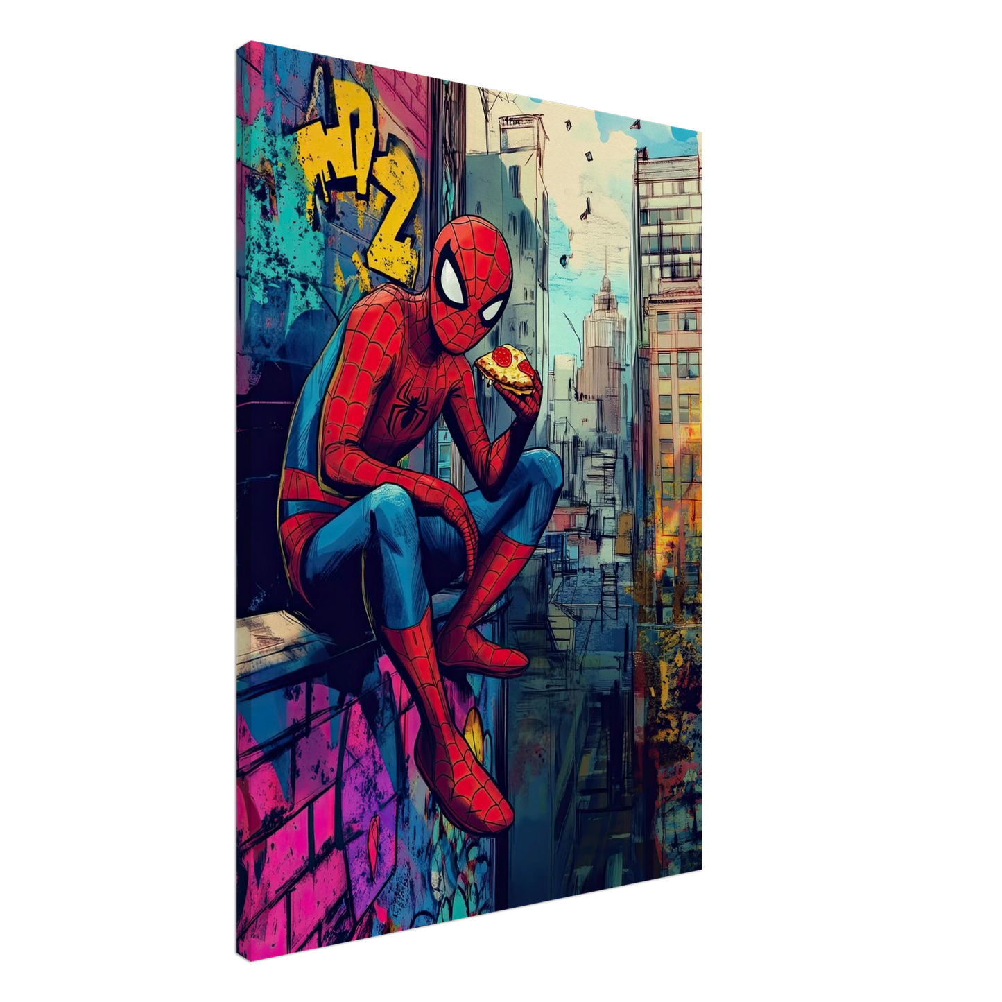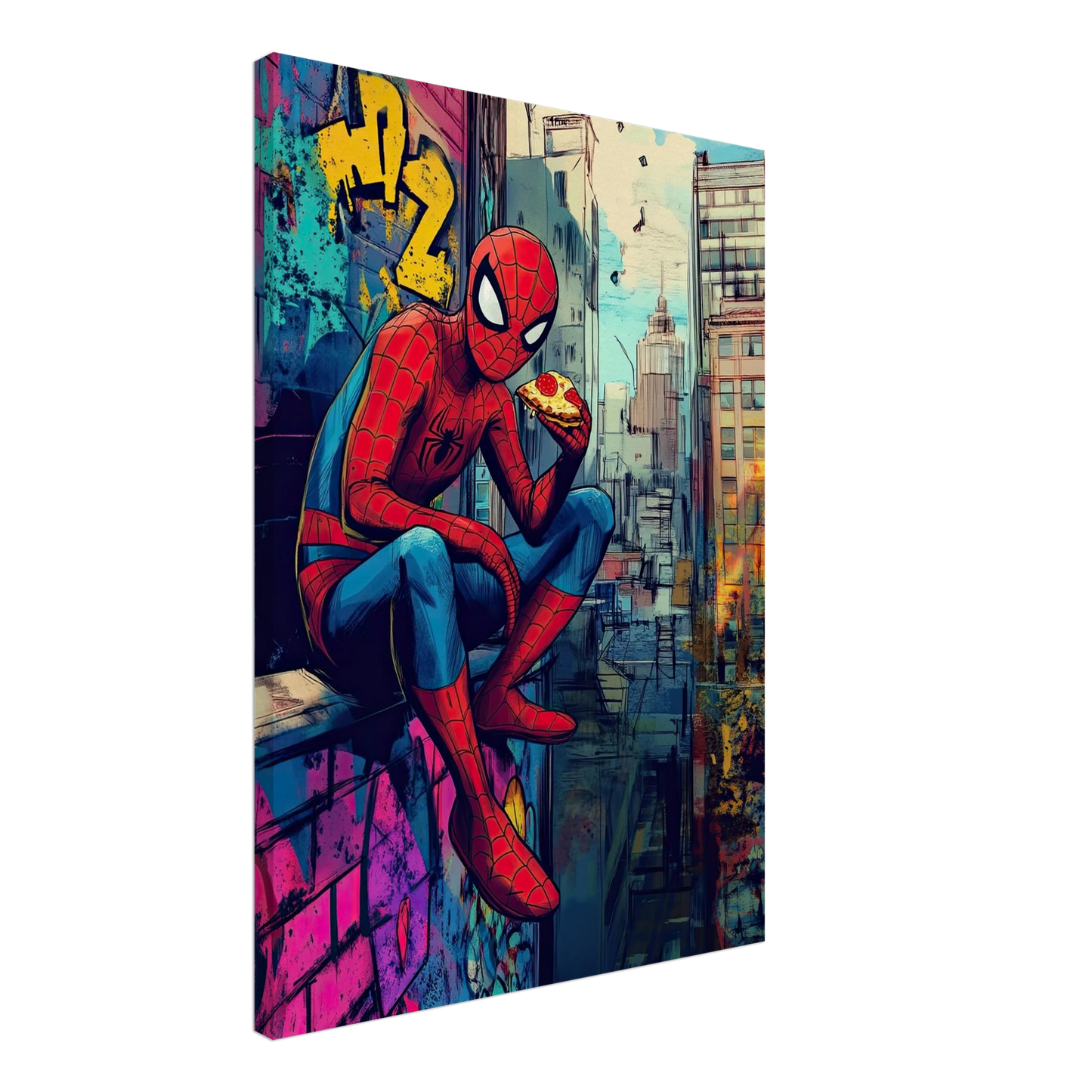 En leken street art-tolkning av Spiderman, avbildet i full drakt mens han nyter en pizza på en graffitidekket takkant. Det urbane bymiljøet og de fargerike detaljene gir en frisk miks av superhelt-energi og street culture. Perfekt kunstverk for deg som vil kombinere ikonisk popkultur med humor og attityde i interiøret.