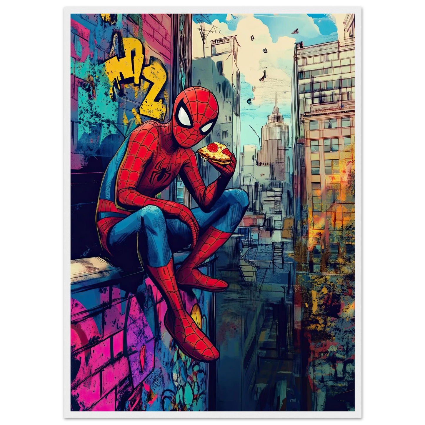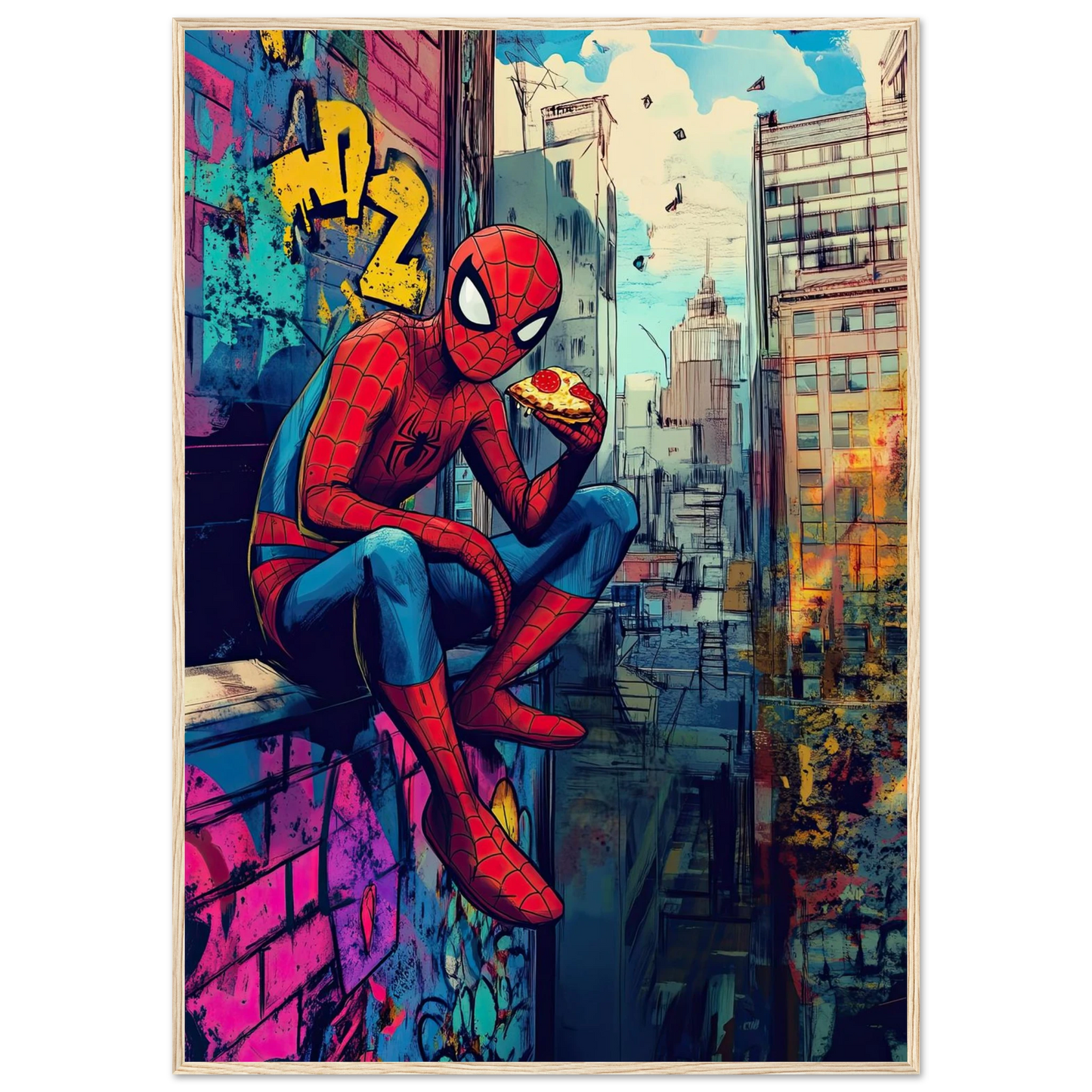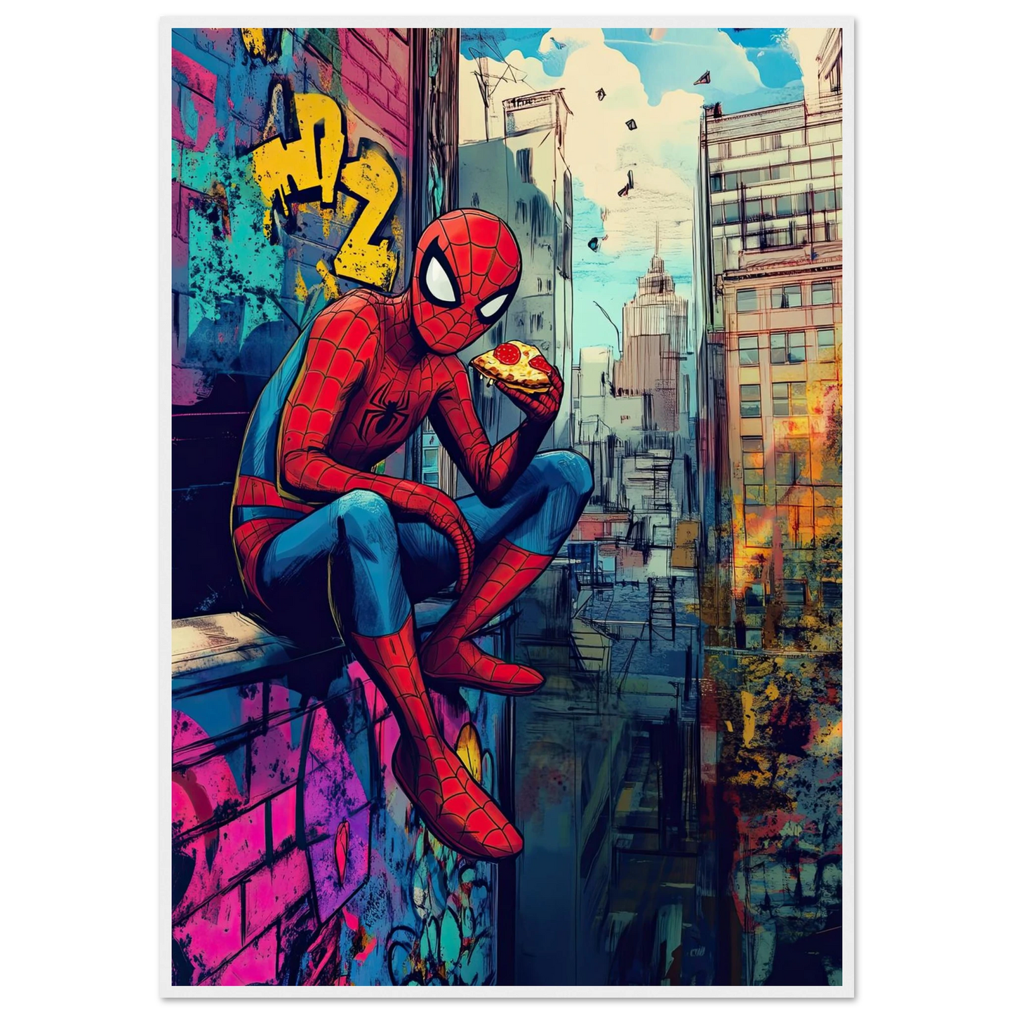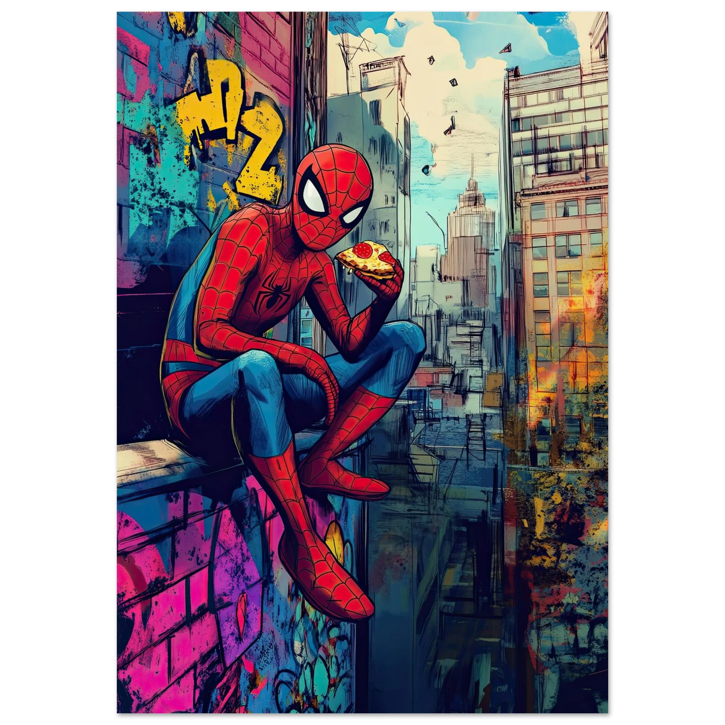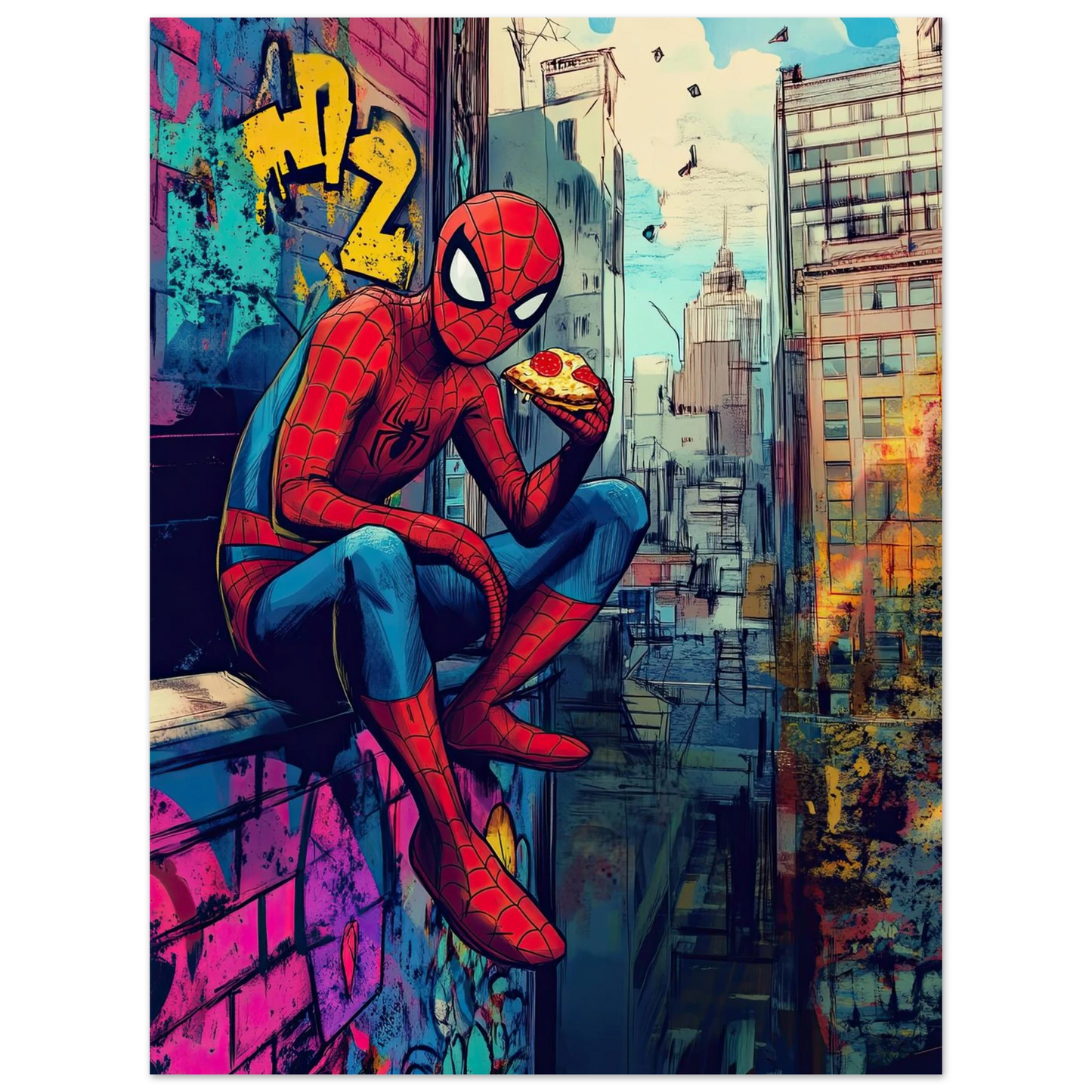 En leken street art-tolkning av Spiderman, avbildet i full drakt mens han nyter en pizza på en graffitidekket takkant. Det urbane bymiljøet og de fargerike detaljene gir en frisk miks av superhelt-energi og street culture. Perfekt kunstverk for deg som vil kombinere ikonisk popkultur med humor og attityde i interiøret.