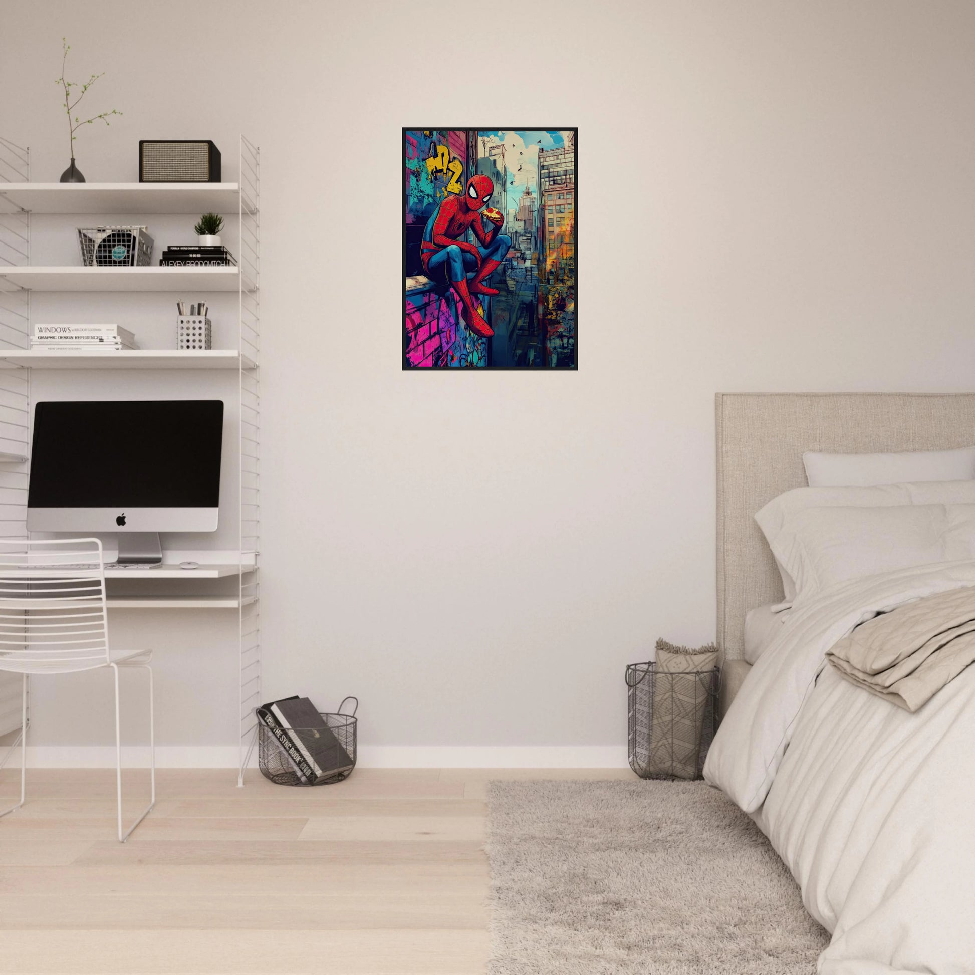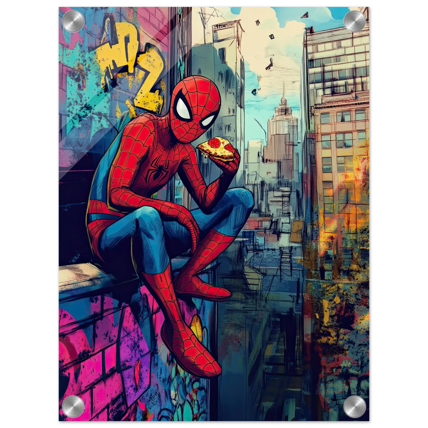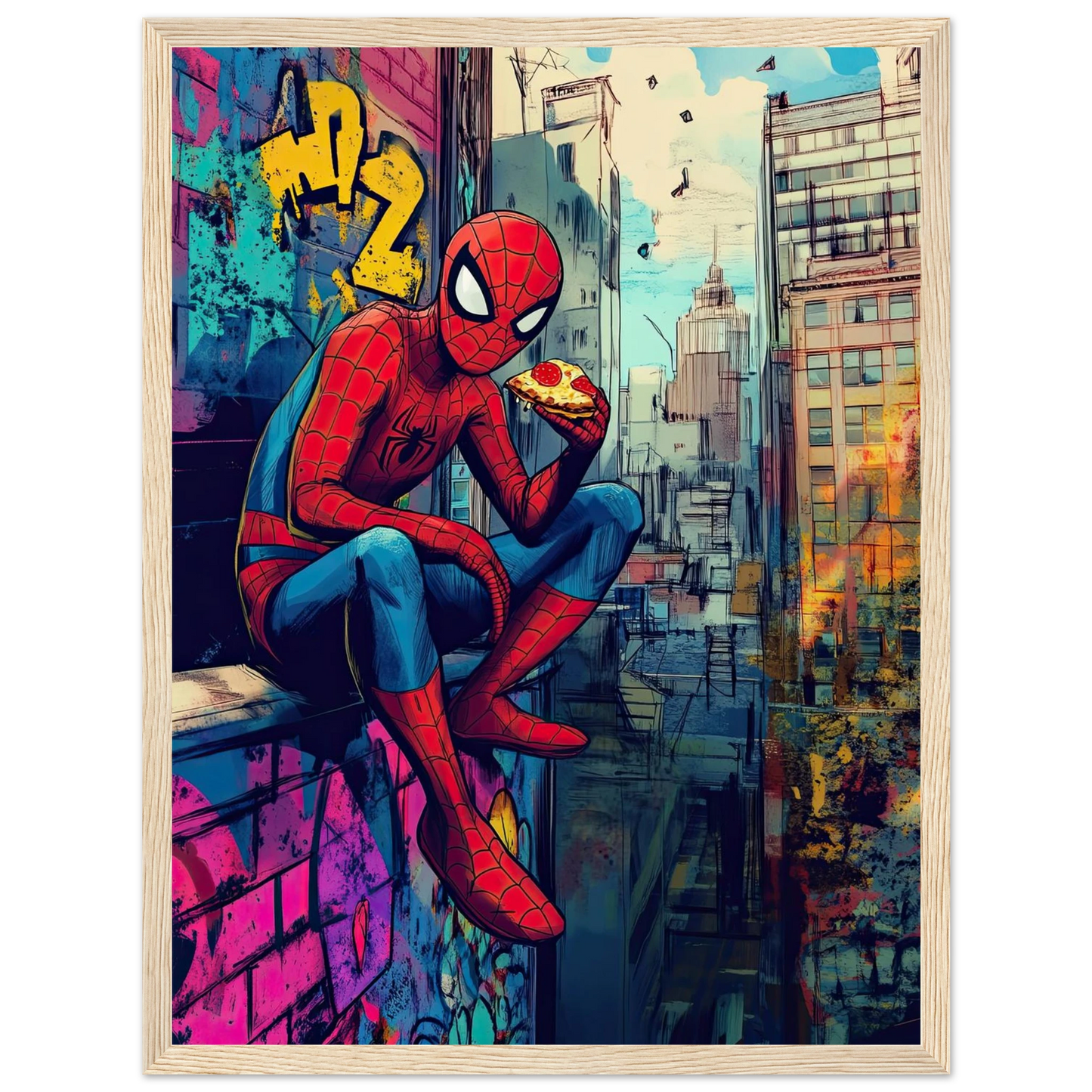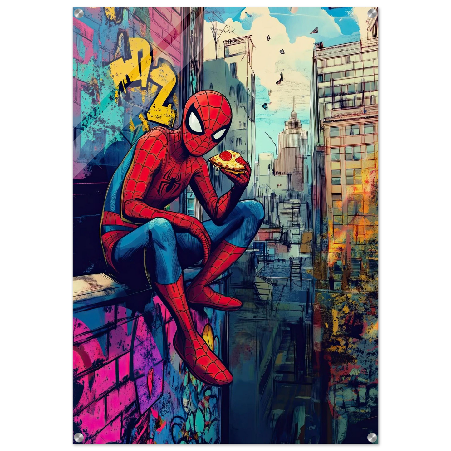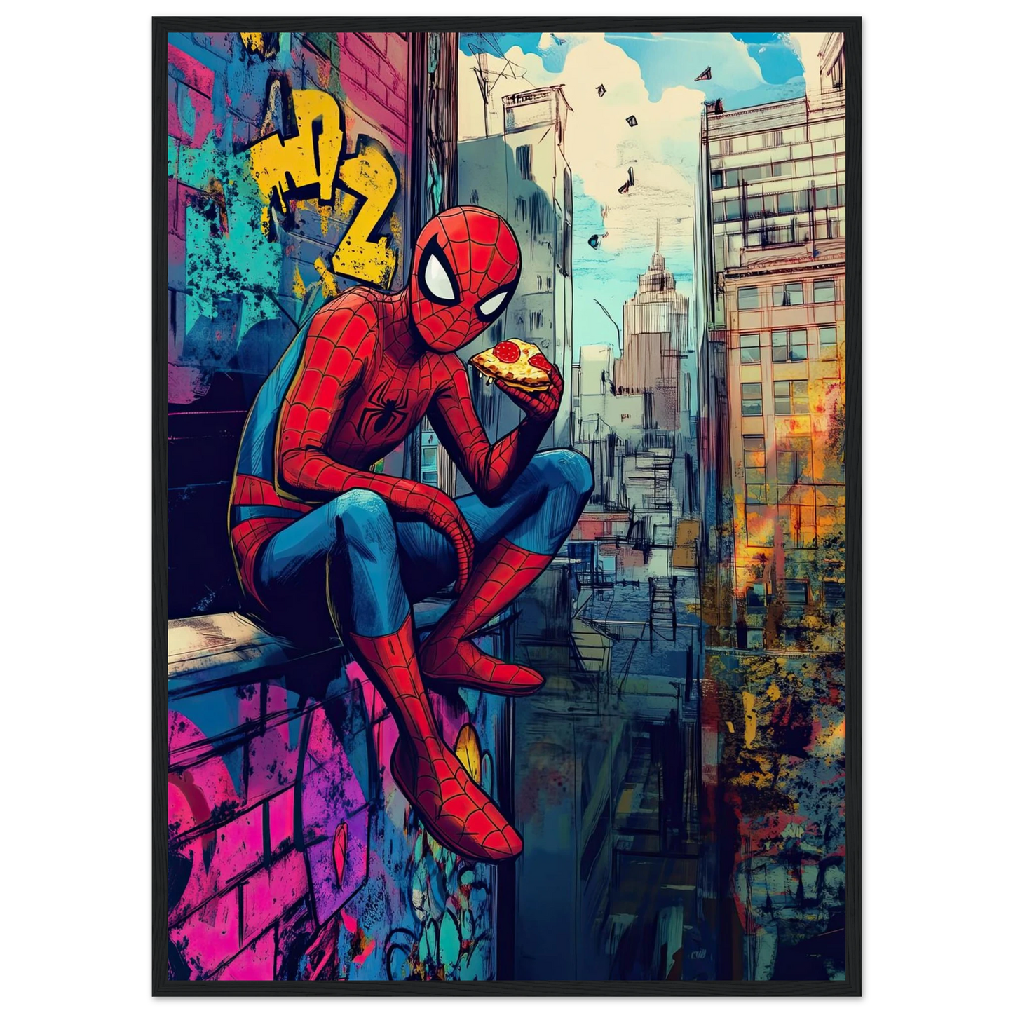 En leken street art-tolkning av Spiderman, avbildet i full drakt mens han nyter en pizza på en graffitidekket takkant. Det urbane bymiljøet og de fargerike detaljene gir en frisk miks av superhelt-energi og street culture. Perfekt kunstverk for deg som vil kombinere ikonisk popkultur med humor og attityde i interiøret.