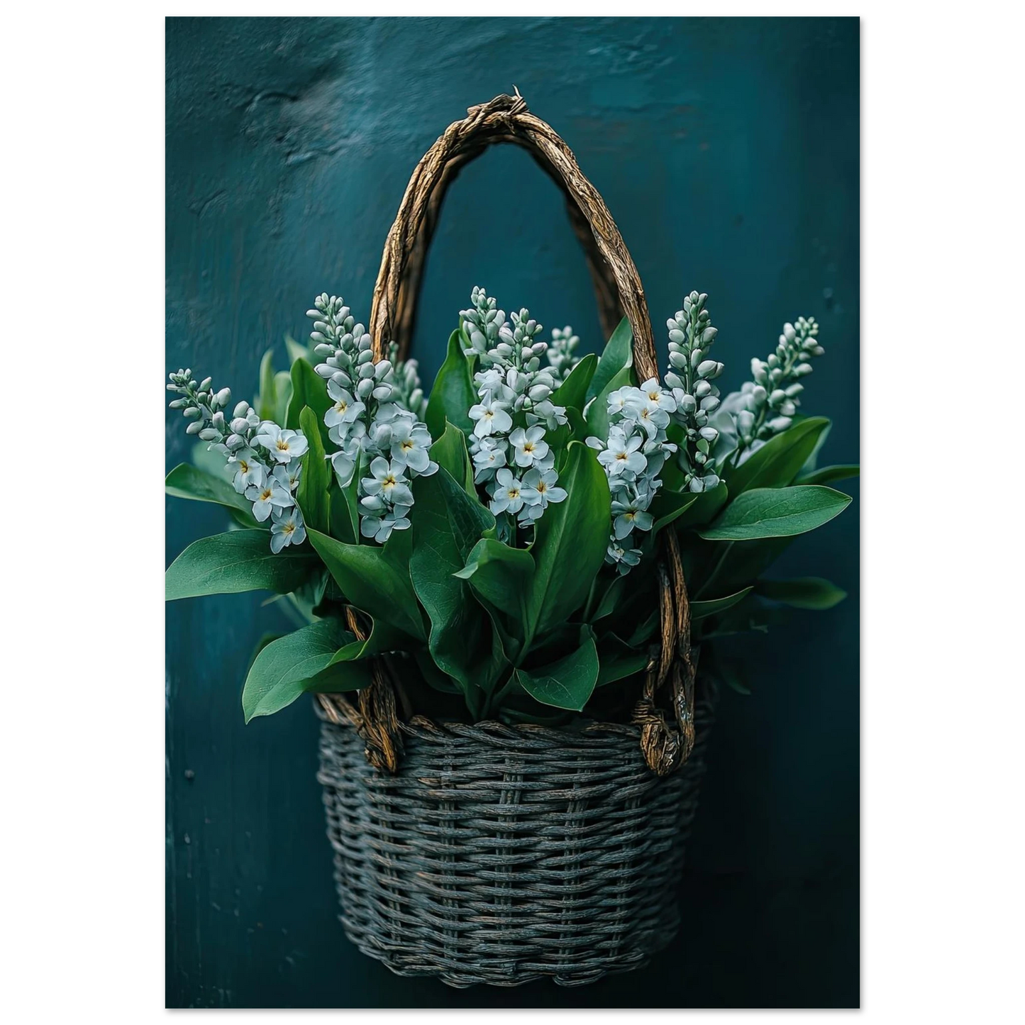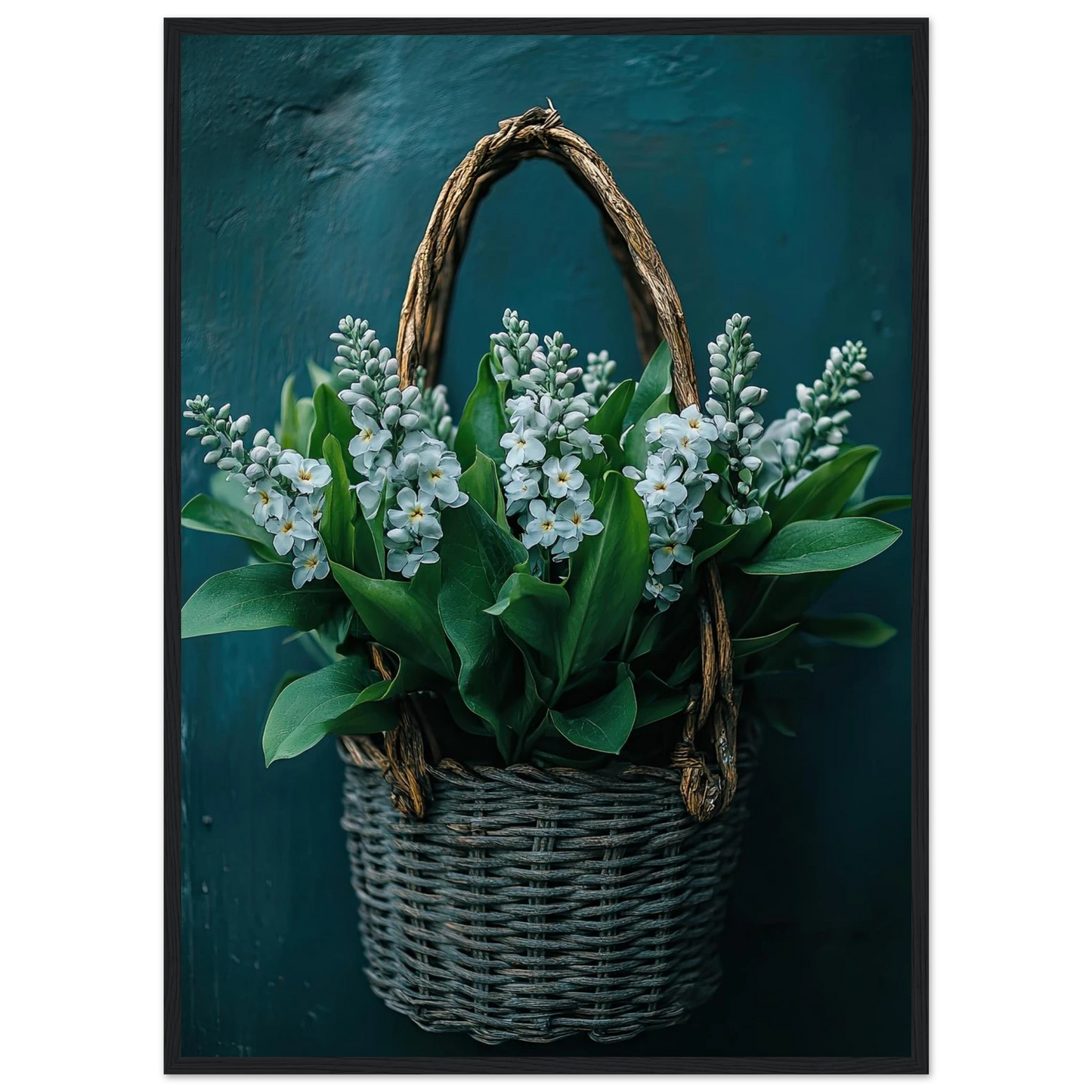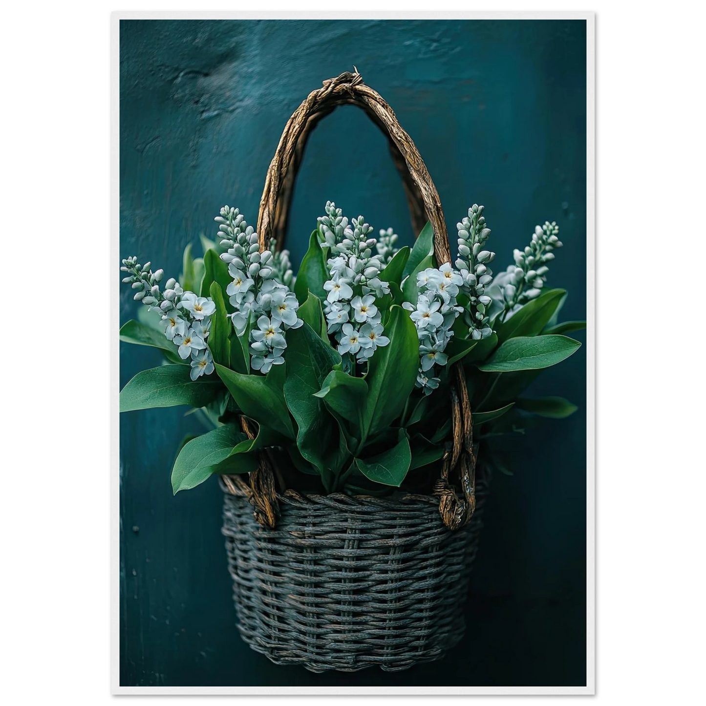 Et sjarmerende kunstverk med lyse blomster i en rustikk flettet kurv. De grønne bladene og de hvite blomstene gir en frisk, ren følelse – perfekt for deg som ønsker en rolig, men livfull detalj i interiøret. Den dype, mørkgrønne bakgrunnen gir bildet dybde og eleganse, samtidig som det fremhever motivets naturlige skjønnhet.