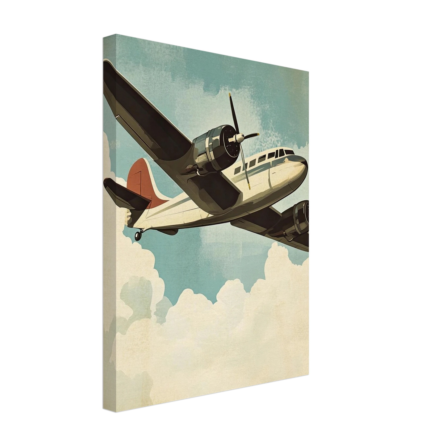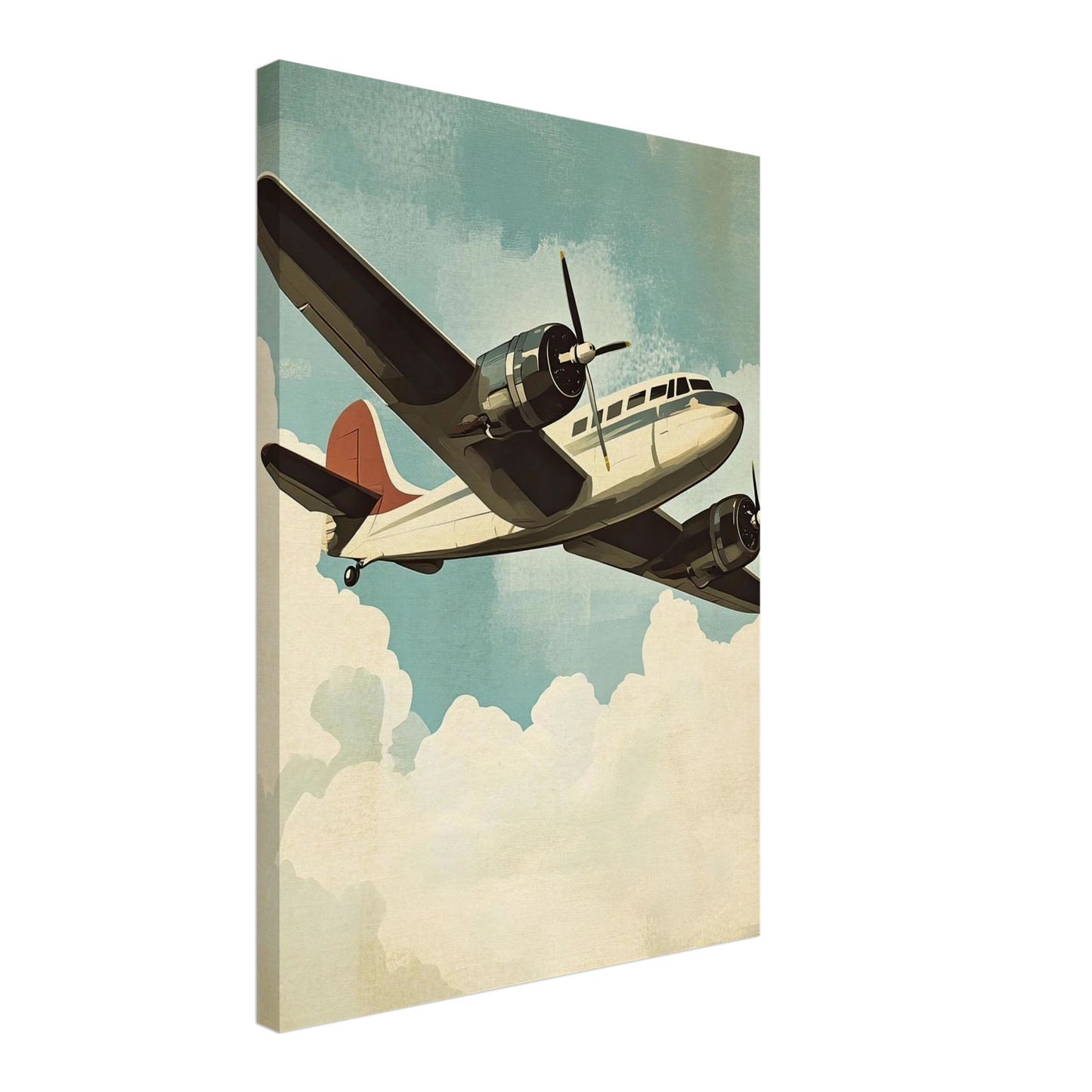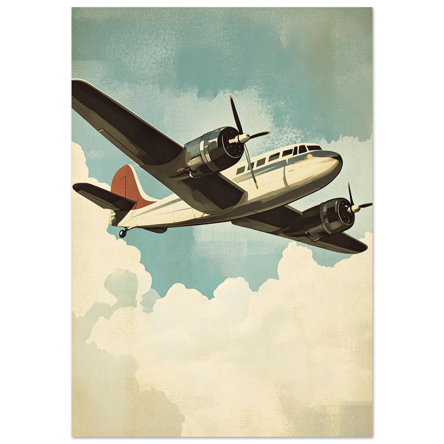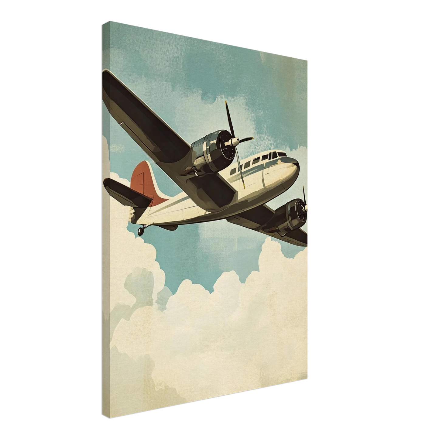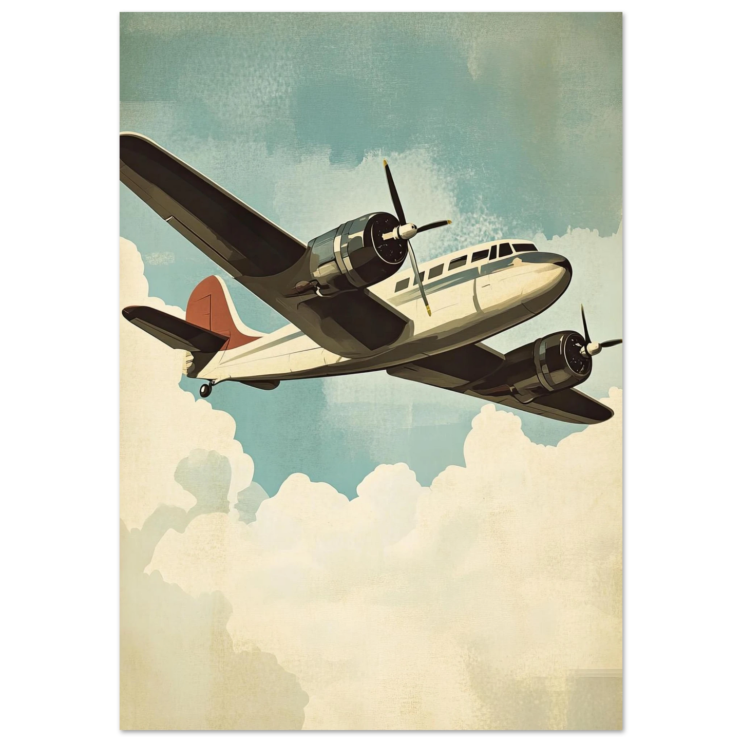Et stemningsfullt vintage-motiv av et klassisk propellfly som svever over skyene. De myke fargetonene og den nostalgiske stilen gir kunstverket en tidløs reiselyst og minner om luftfartens gullalder. Perfekt for deg som vil tilføre interiøret en følelse av eventyr, frihet og retro eleganse.