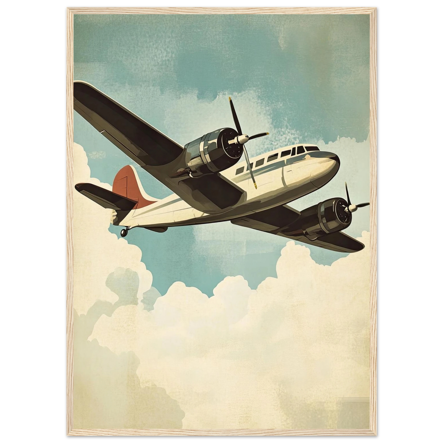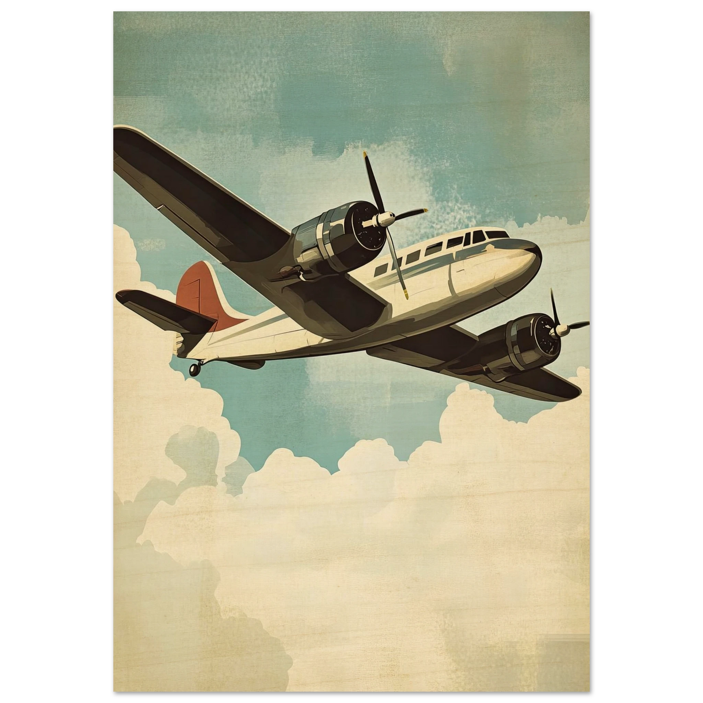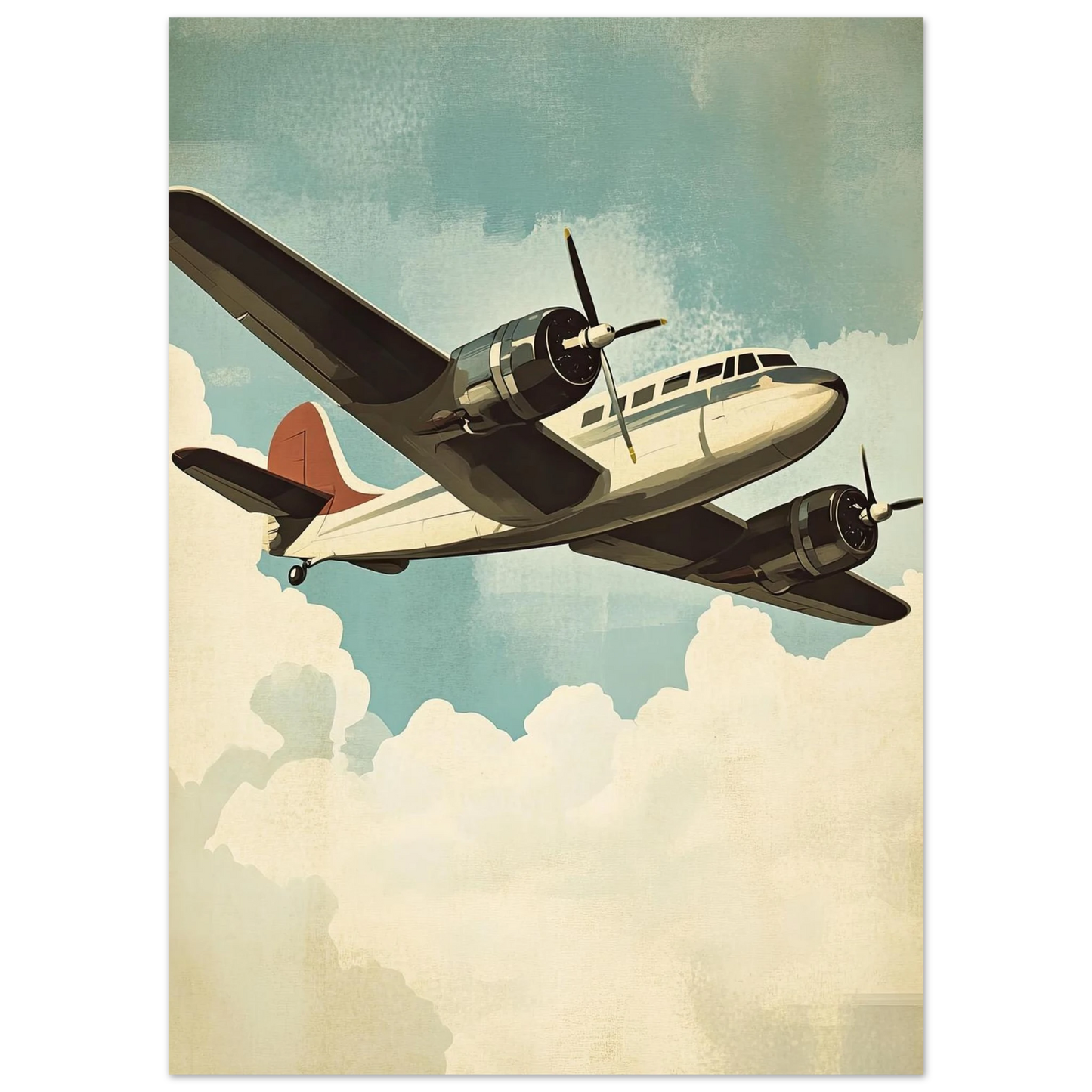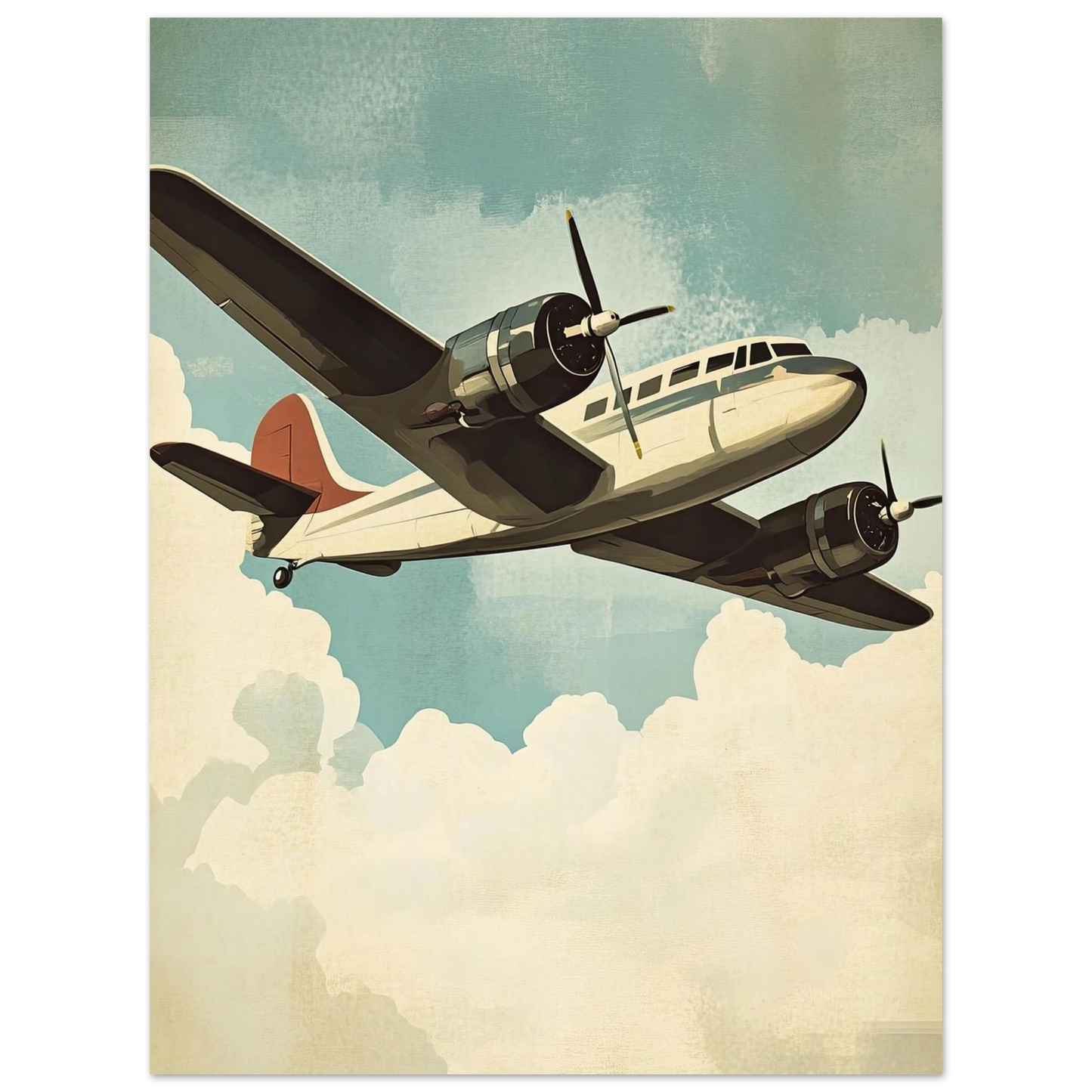Et stemningsfullt vintage-motiv av et klassisk propellfly som svever over skyene. De myke fargetonene og den nostalgiske stilen gir kunstverket en tidløs reiselyst og minner om luftfartens gullalder. Perfekt for deg som vil tilføre interiøret en følelse av eventyr, frihet og retro eleganse.
