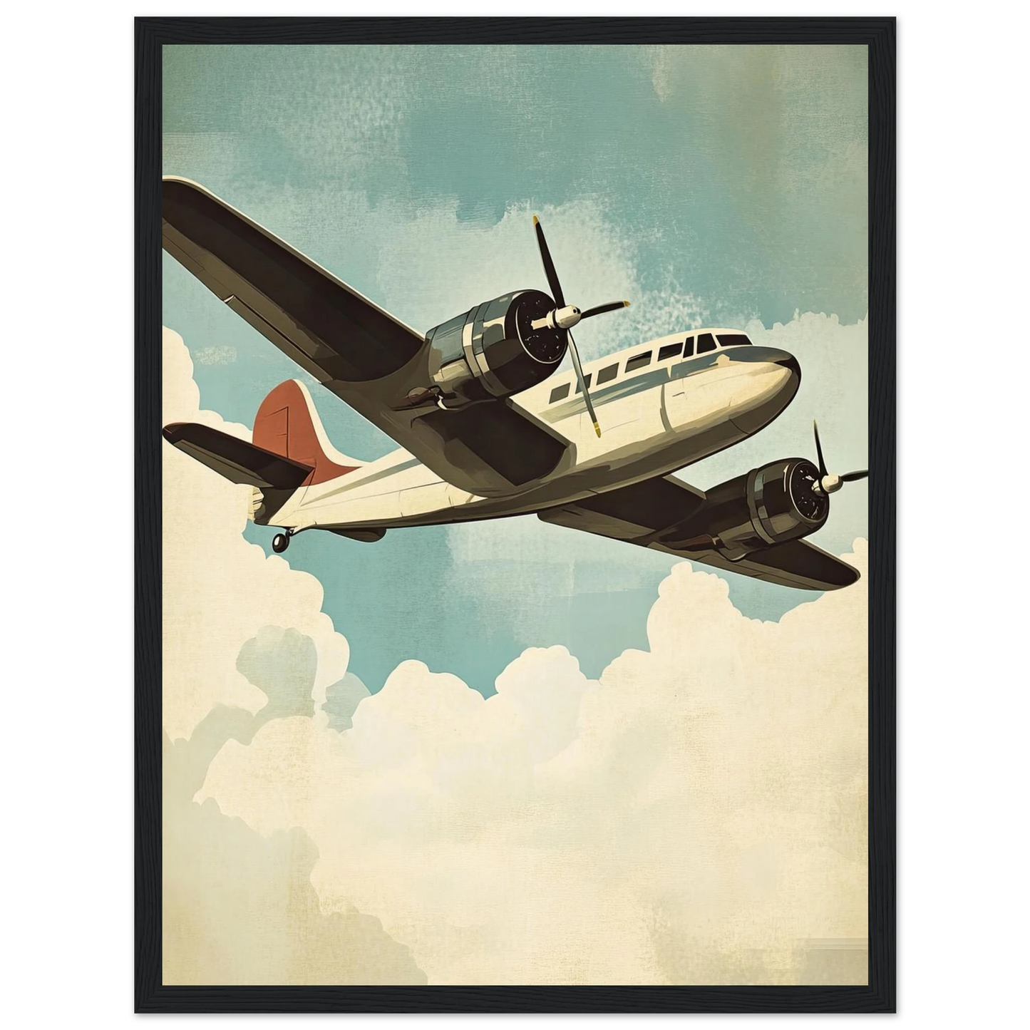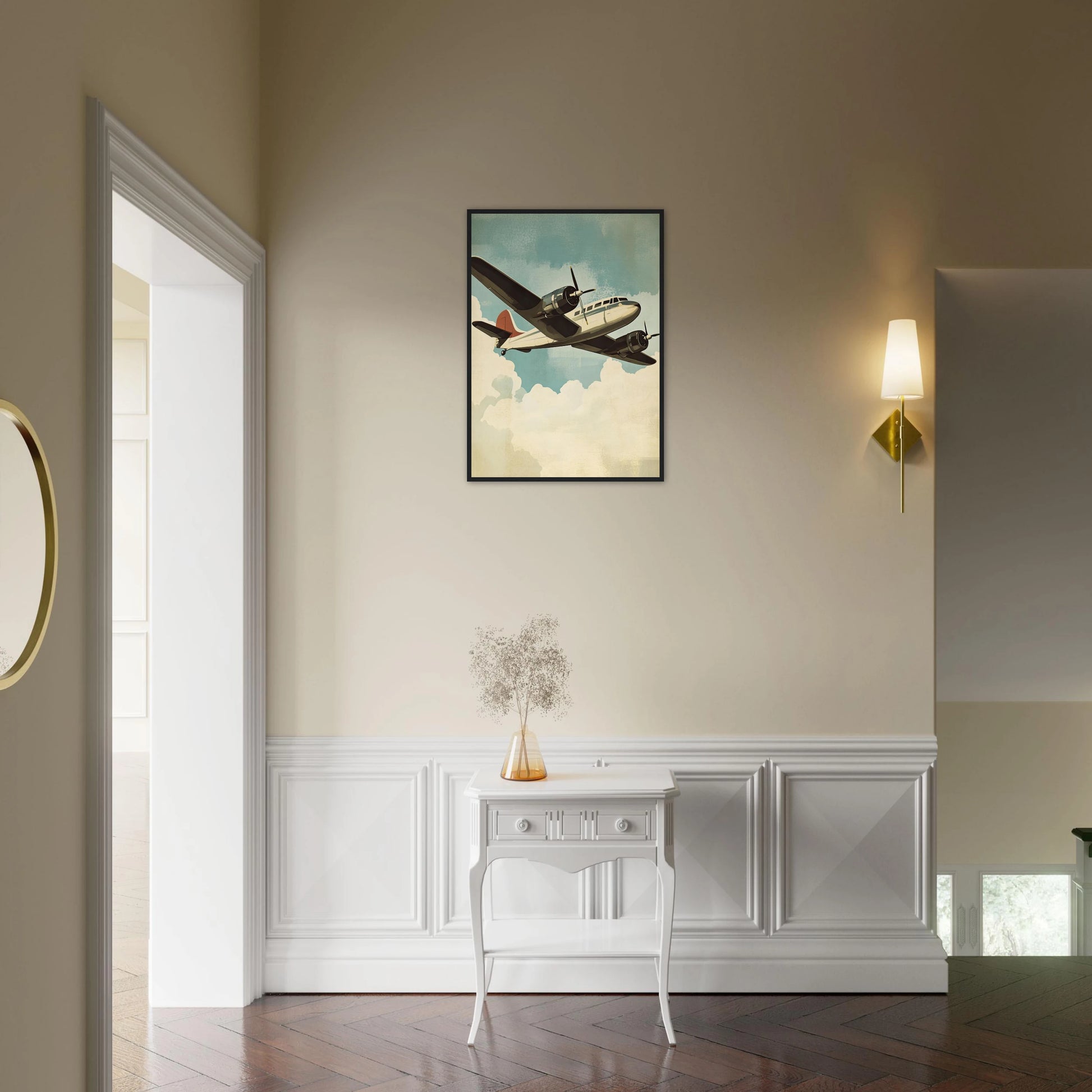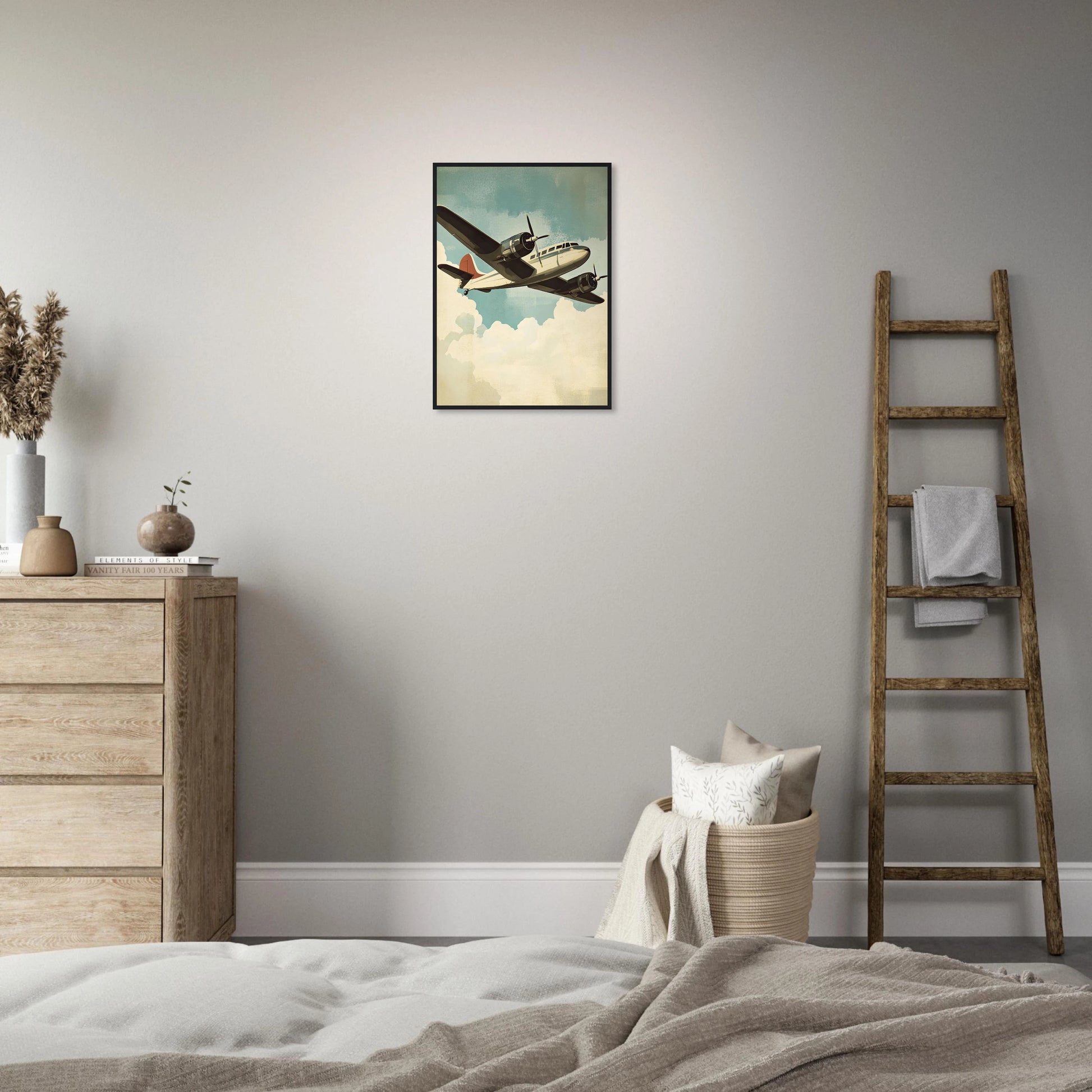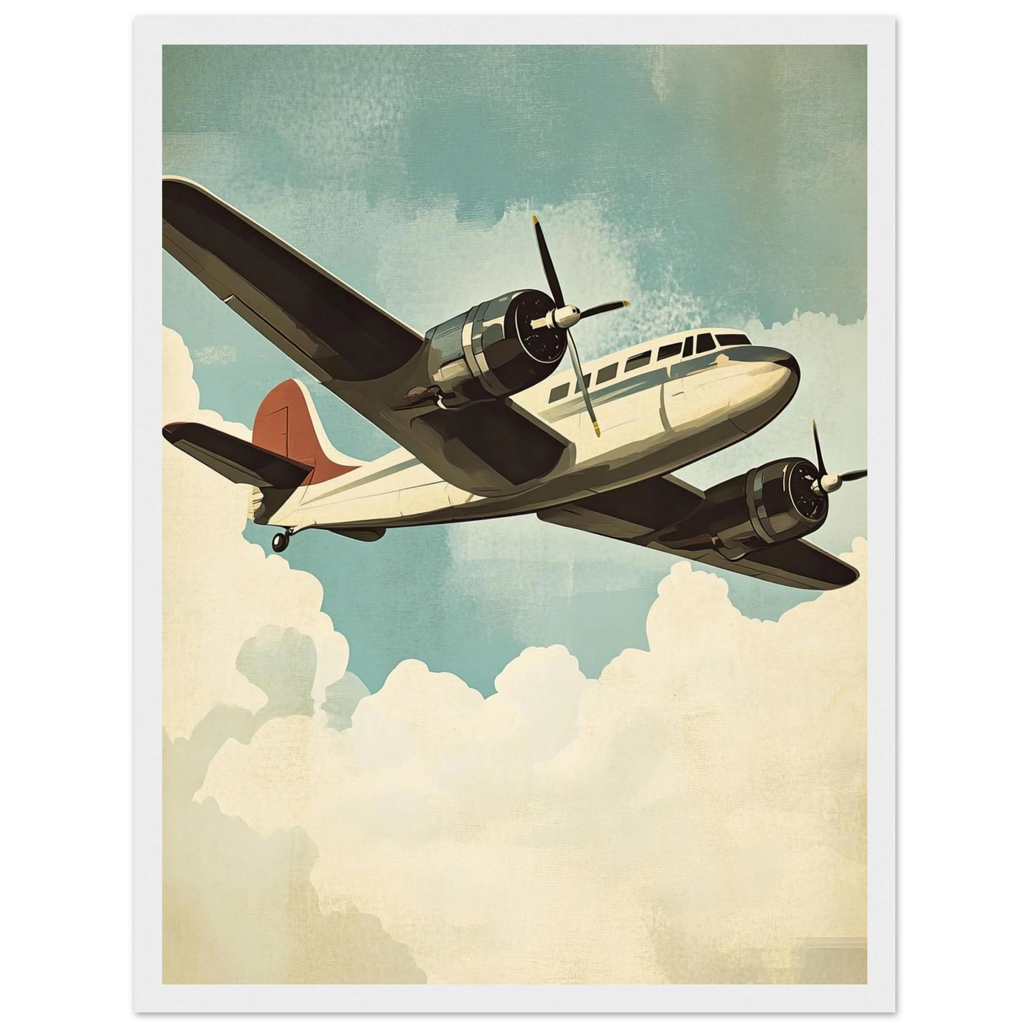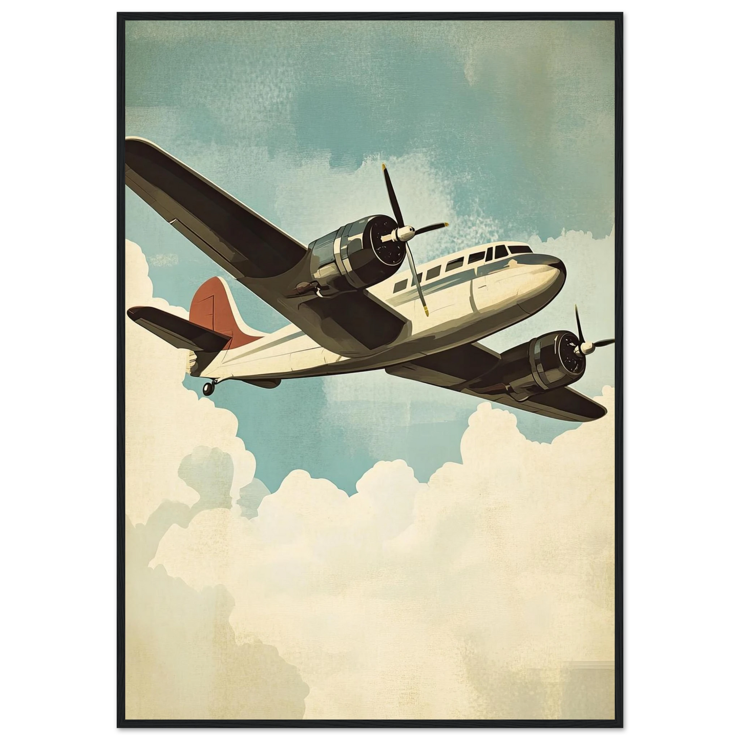 Et stemningsfullt vintage-motiv av et klassisk propellfly som svever over skyene. De myke fargetonene og den nostalgiske stilen gir kunstverket en tidløs reiselyst og minner om luftfartens gullalder. Perfekt for deg som vil tilføre interiøret en følelse av eventyr, frihet og retro eleganse.