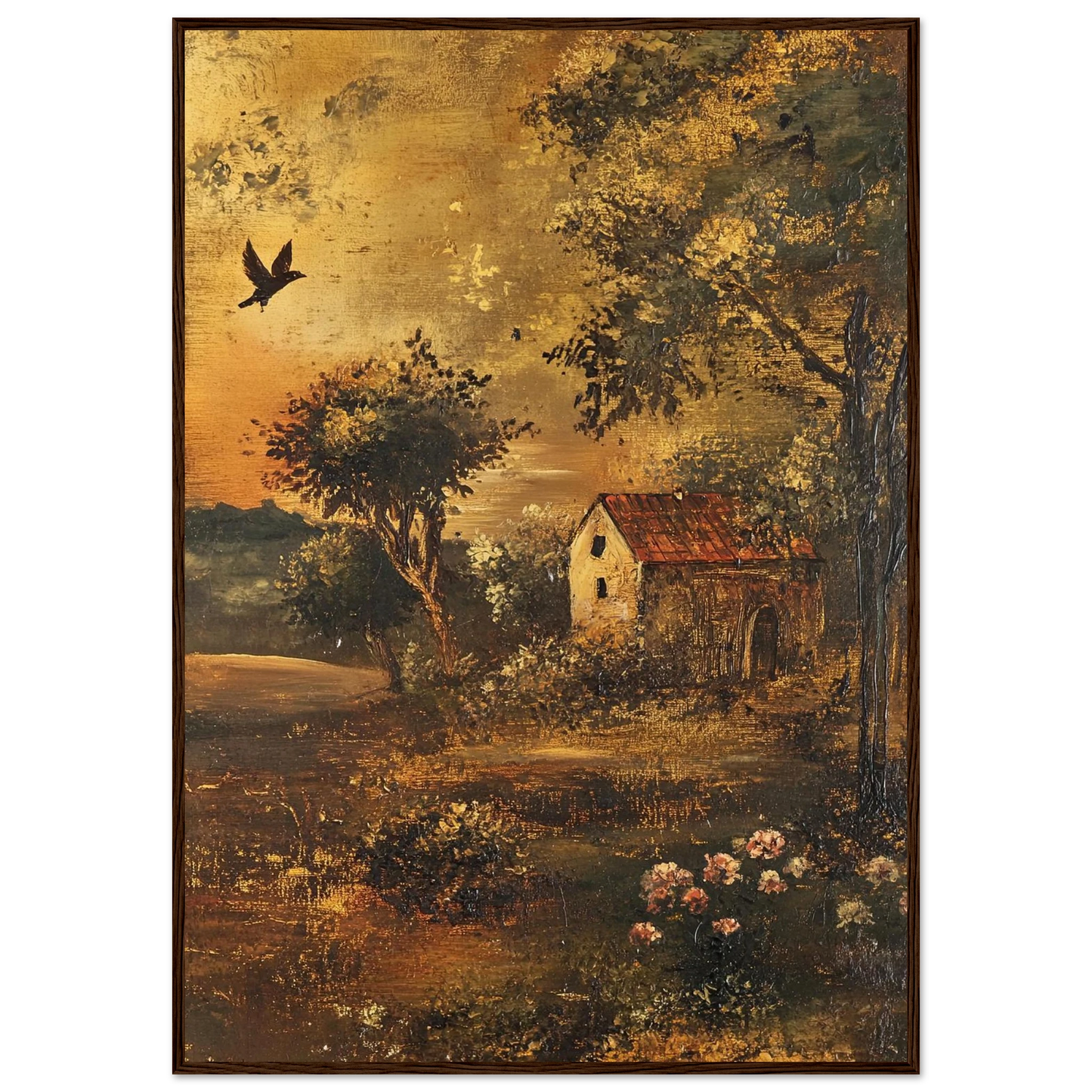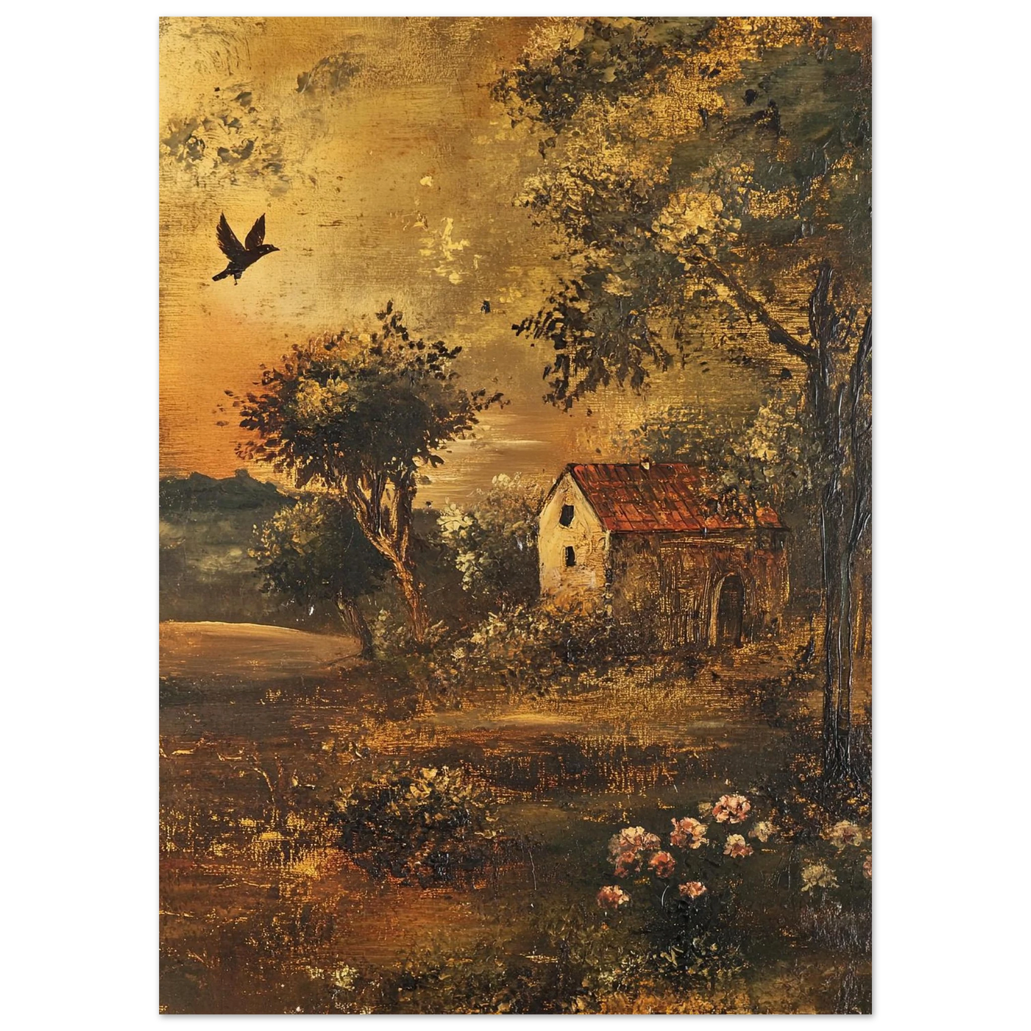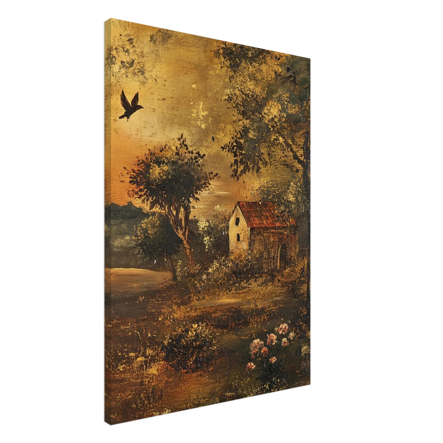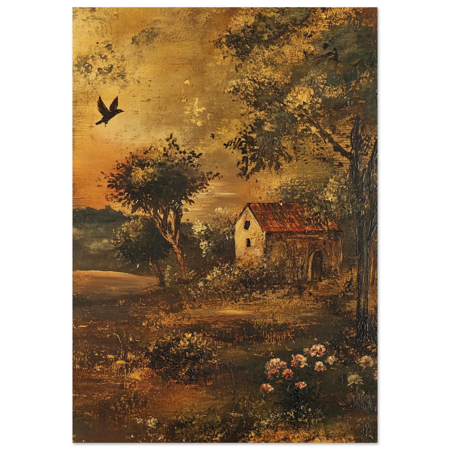 Et varmt og stemningsfullt landskapsmotiv med en liten hytte omgitt av trær, blomster og en flyvende fugl i kveldssolen. Den klassiske malerstilen og de dype fargetonene gir bildet en nostalgisk atmosfære som minner om en enklere tid. Perfekt for deg som vil tilføre hjemmet ditt en følelse av ro, natur og tidløs sjarm.