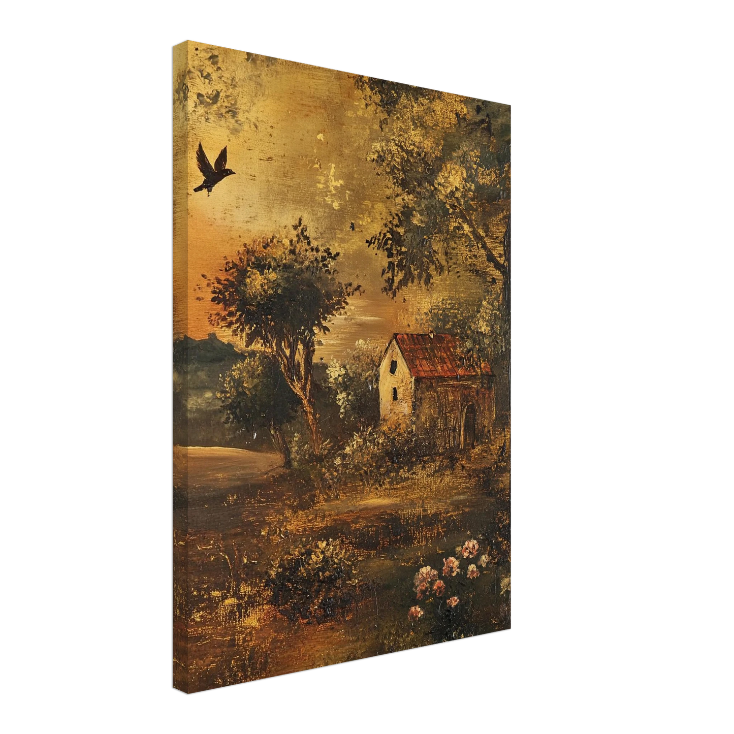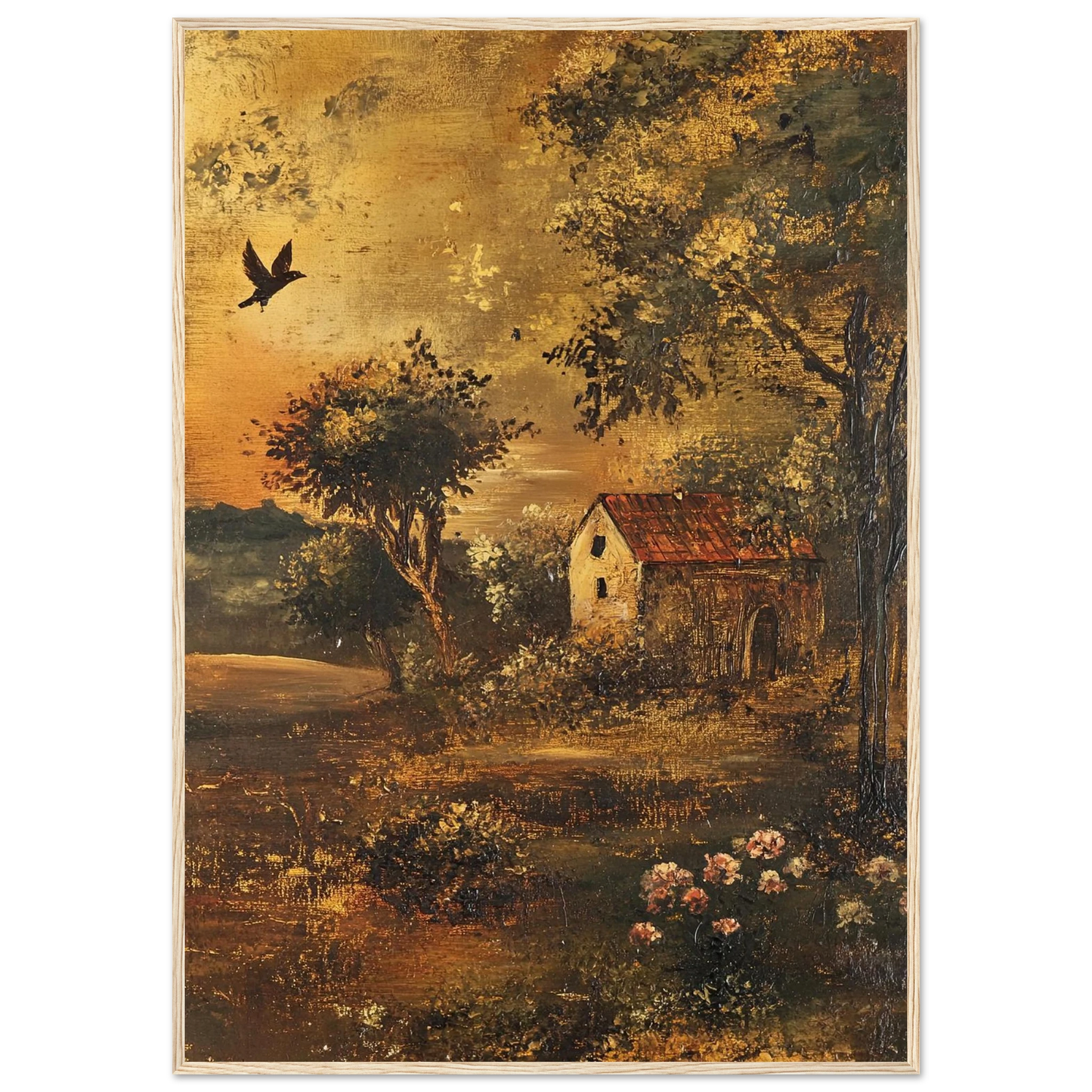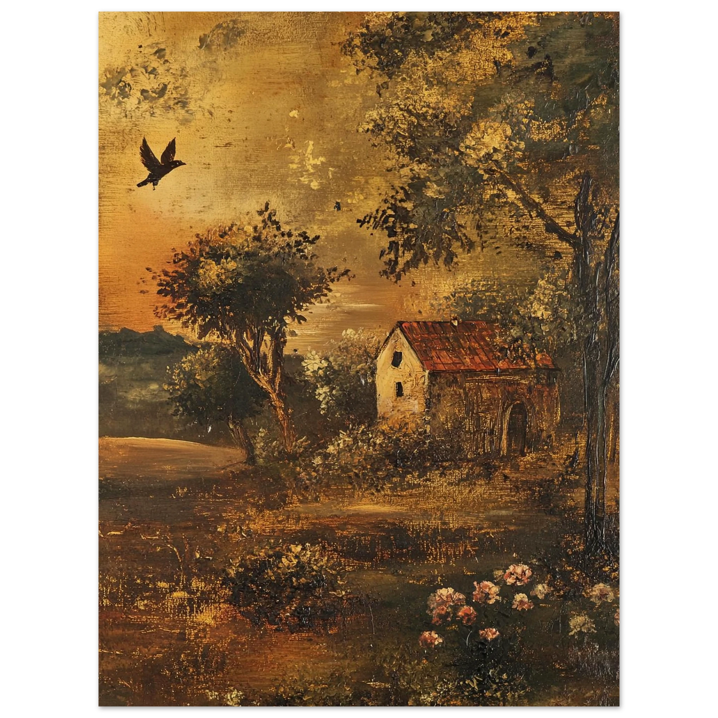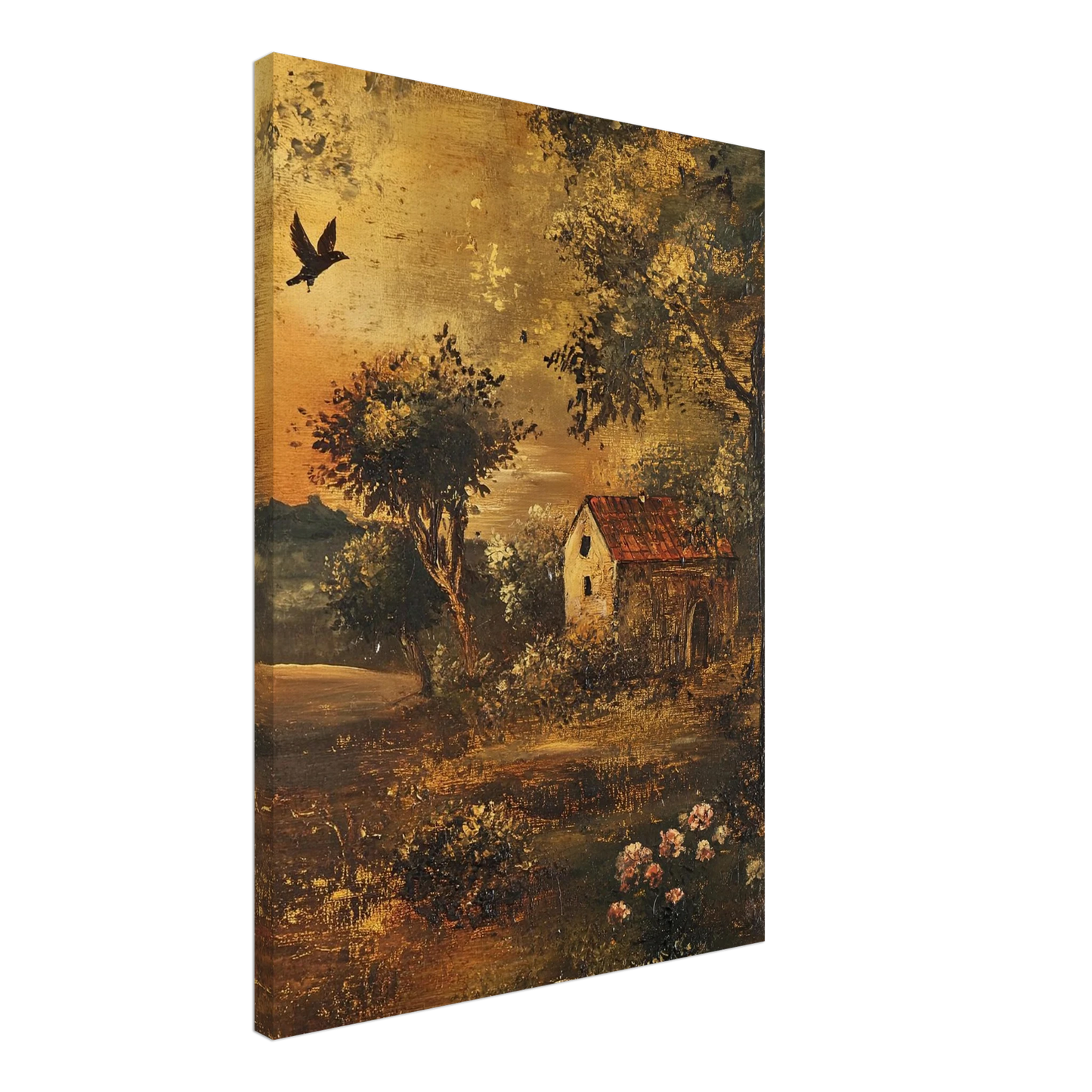 Et varmt og stemningsfullt landskapsmotiv med en liten hytte omgitt av trær, blomster og en flyvende fugl i kveldssolen. Den klassiske malerstilen og de dype fargetonene gir bildet en nostalgisk atmosfære som minner om en enklere tid. Perfekt for deg som vil tilføre hjemmet ditt en følelse av ro, natur og tidløs sjarm.