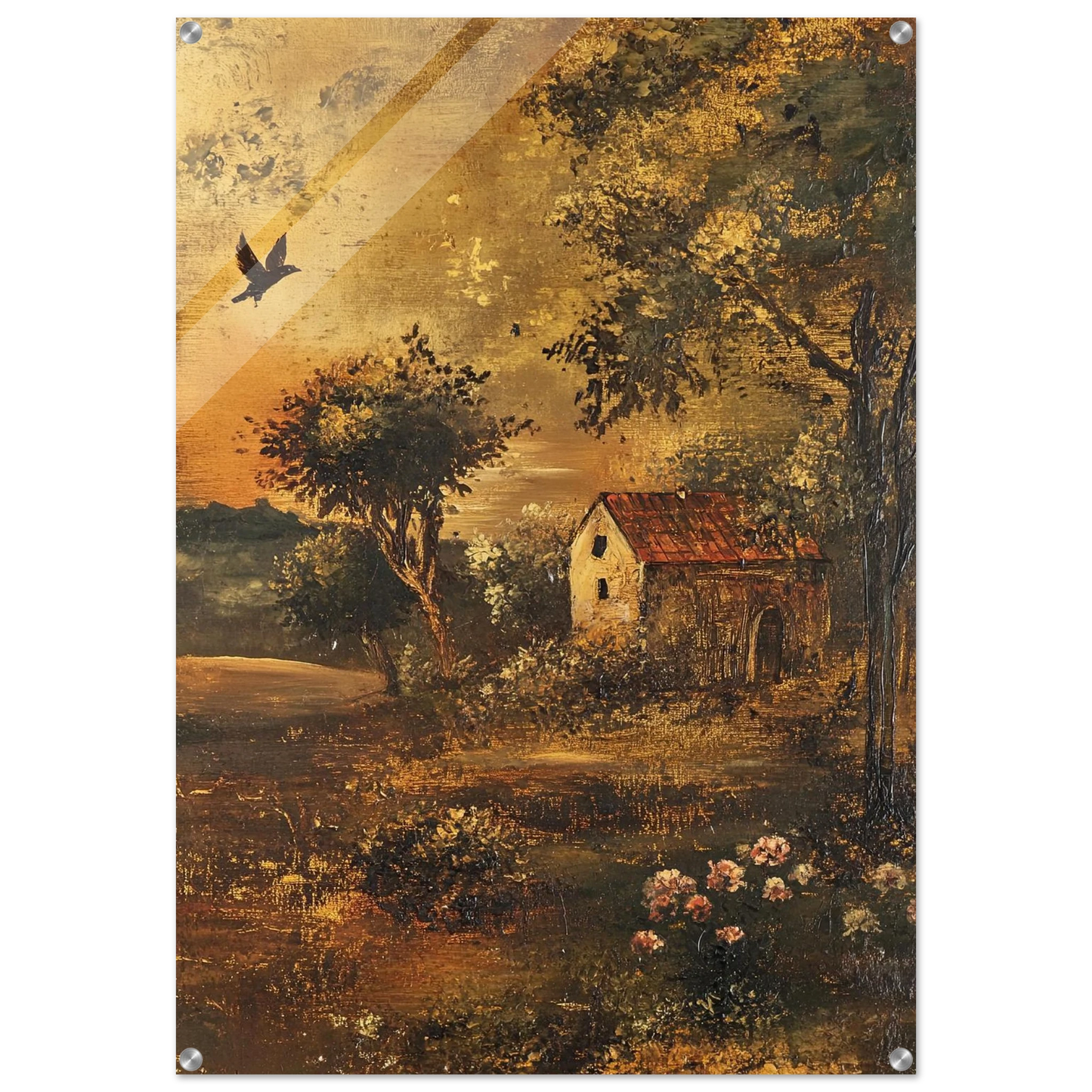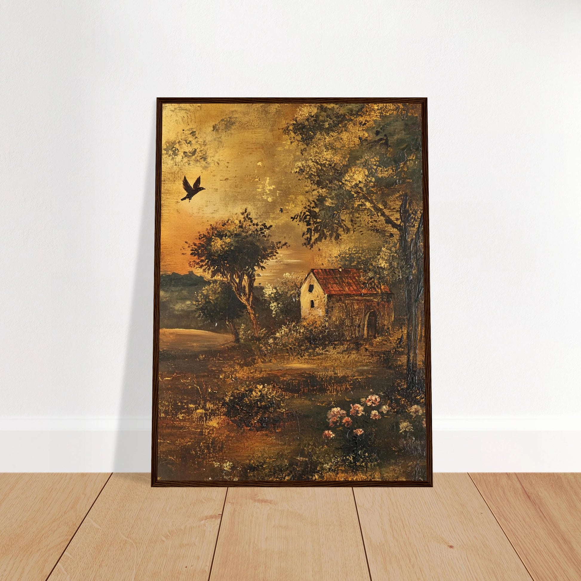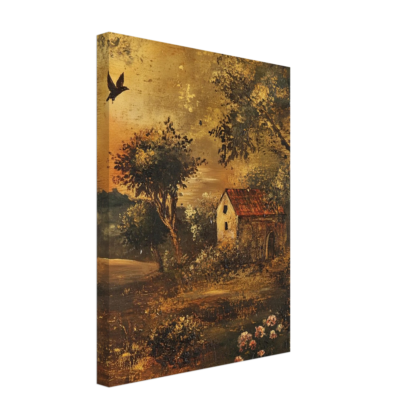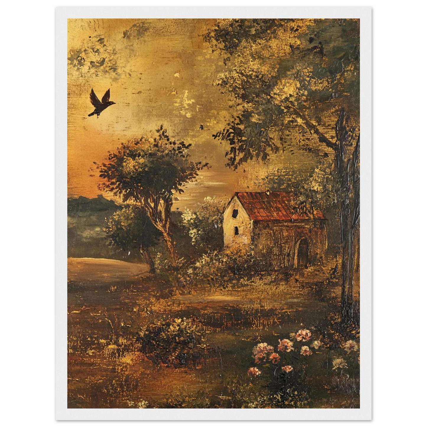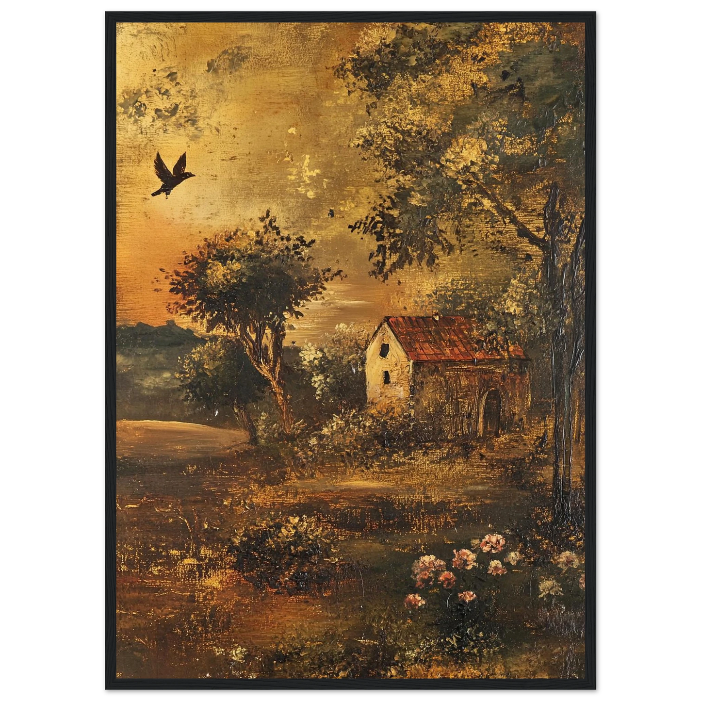 Et varmt og stemningsfullt landskapsmotiv med en liten hytte omgitt av trær, blomster og en flyvende fugl i kveldssolen. Den klassiske malerstilen og de dype fargetonene gir bildet en nostalgisk atmosfære som minner om en enklere tid. Perfekt for deg som vil tilføre hjemmet ditt en følelse av ro, natur og tidløs sjarm.
