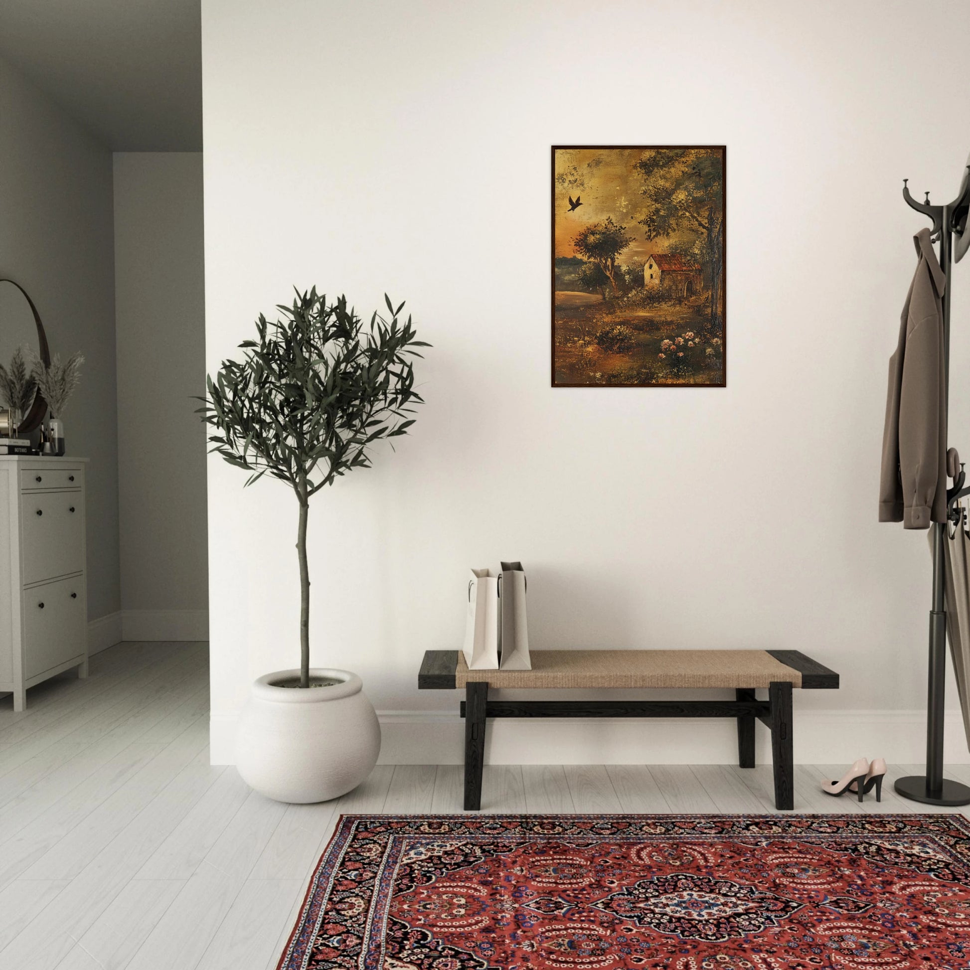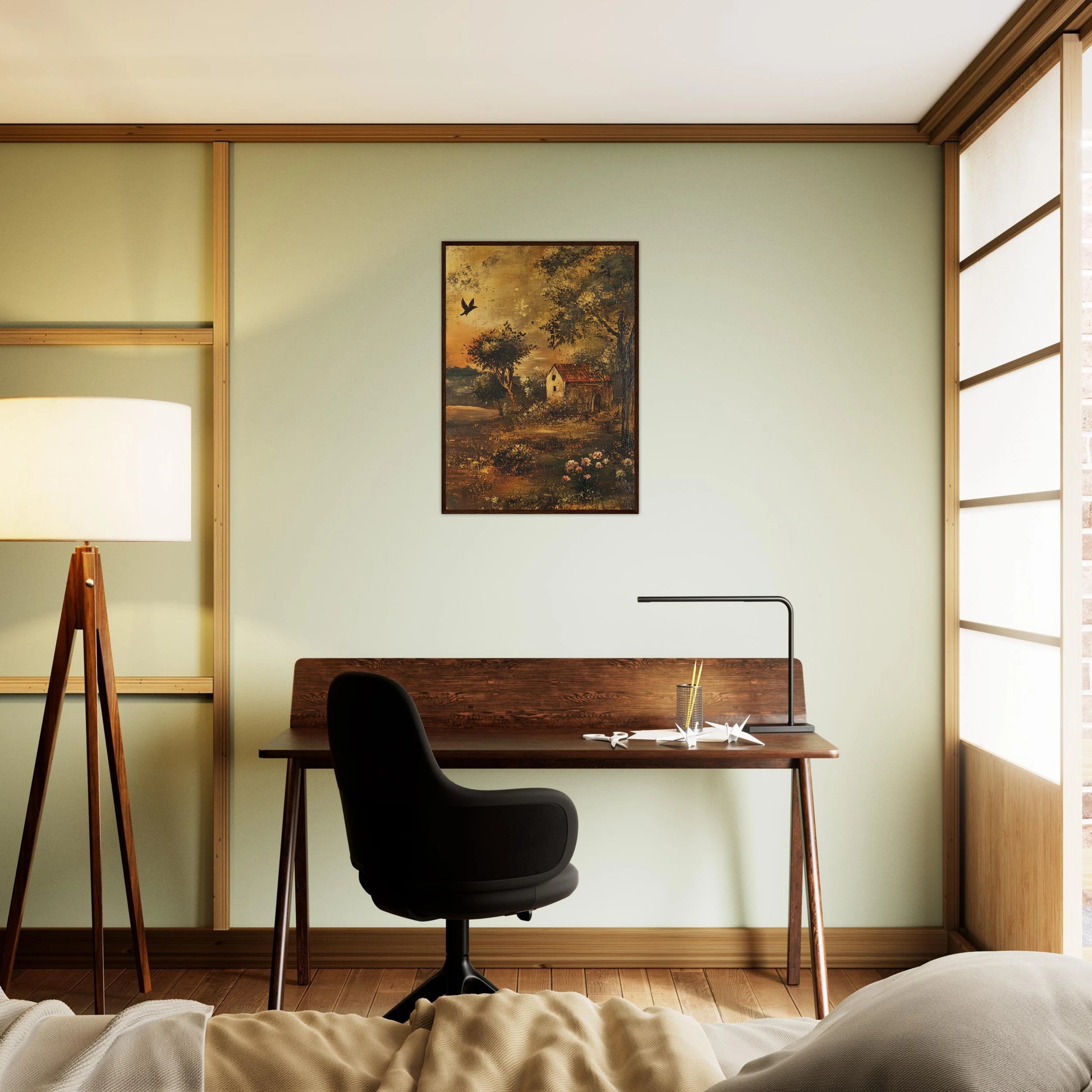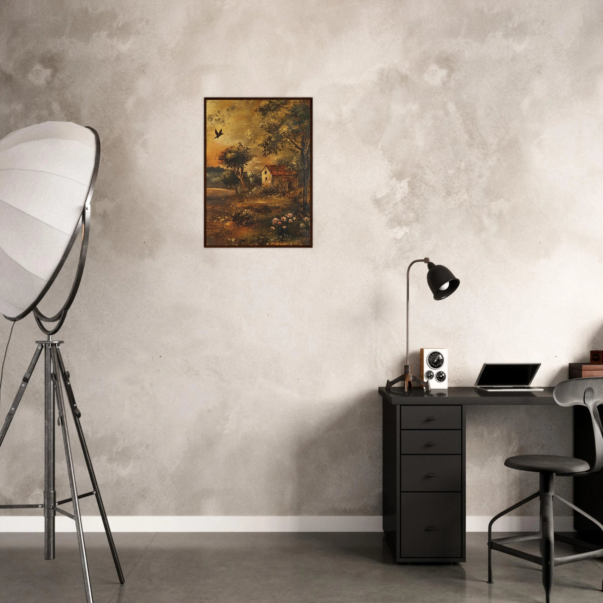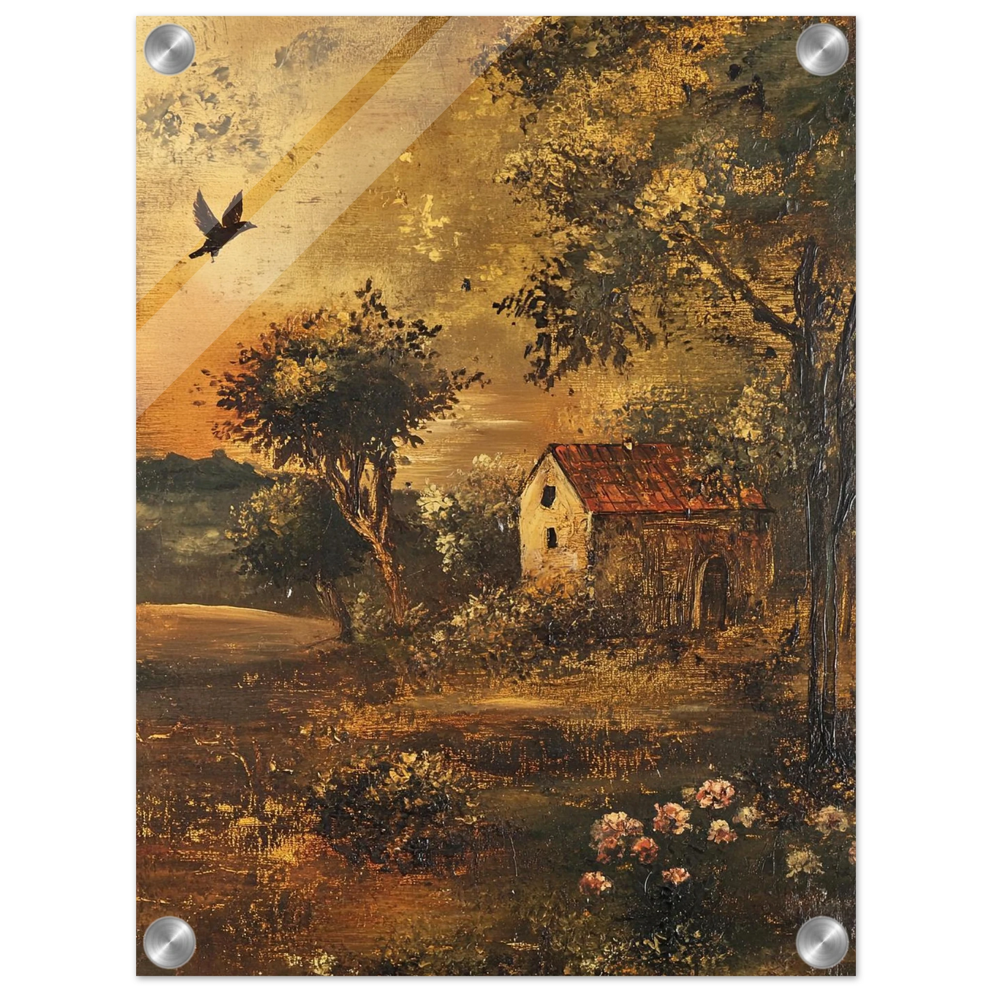 Et varmt og stemningsfullt landskapsmotiv med en liten hytte omgitt av trær, blomster og en flyvende fugl i kveldssolen. Den klassiske malerstilen og de dype fargetonene gir bildet en nostalgisk atmosfære som minner om en enklere tid. Perfekt for deg som vil tilføre hjemmet ditt en følelse av ro, natur og tidløs sjarm.