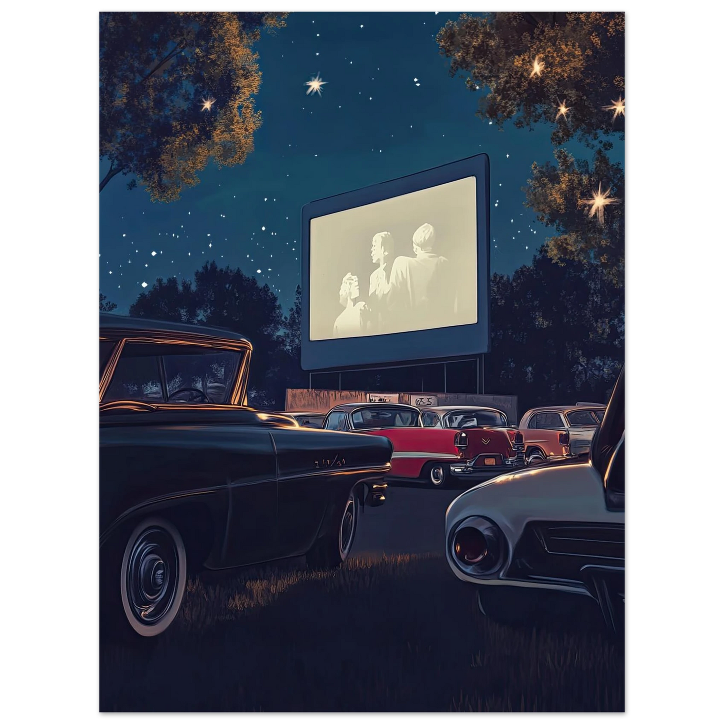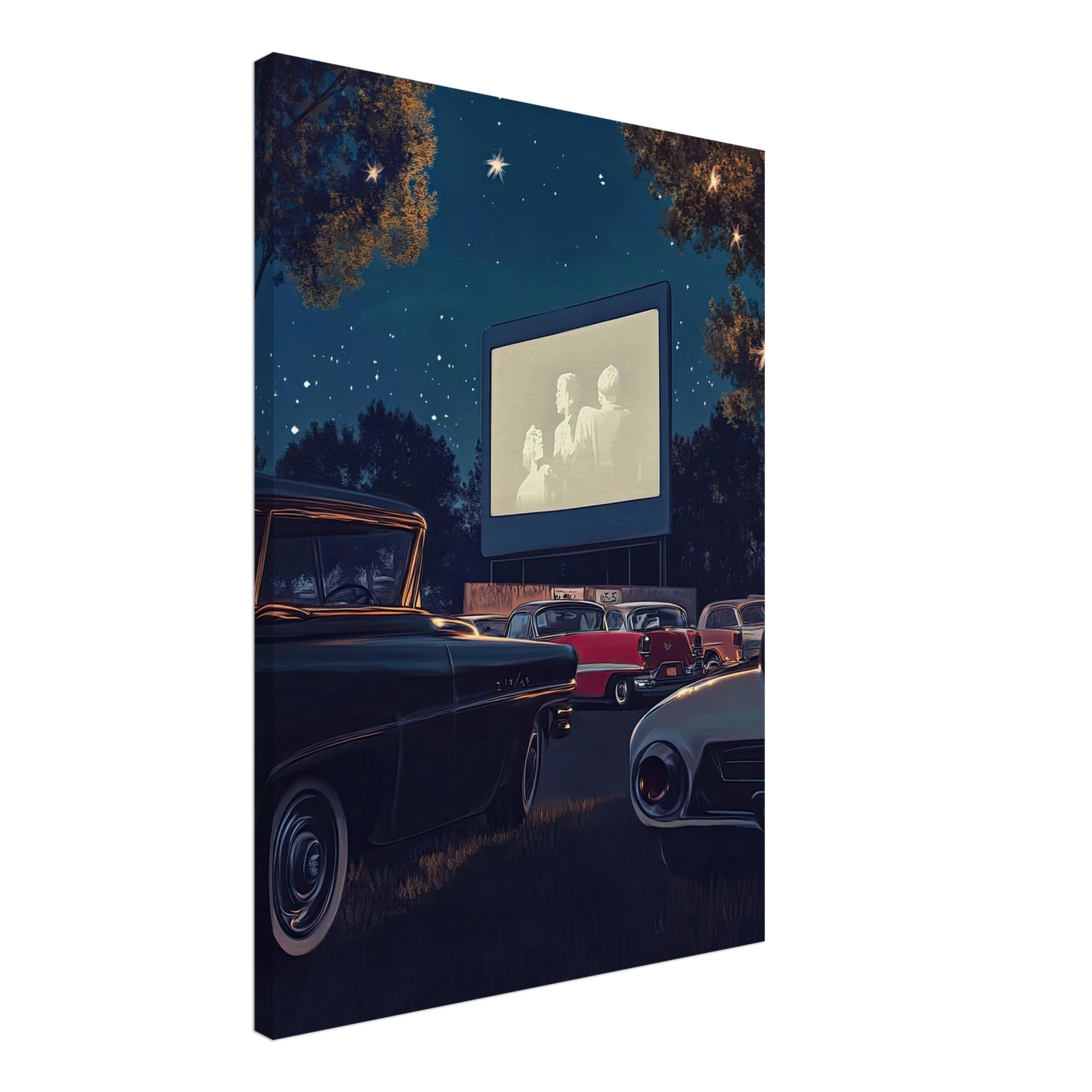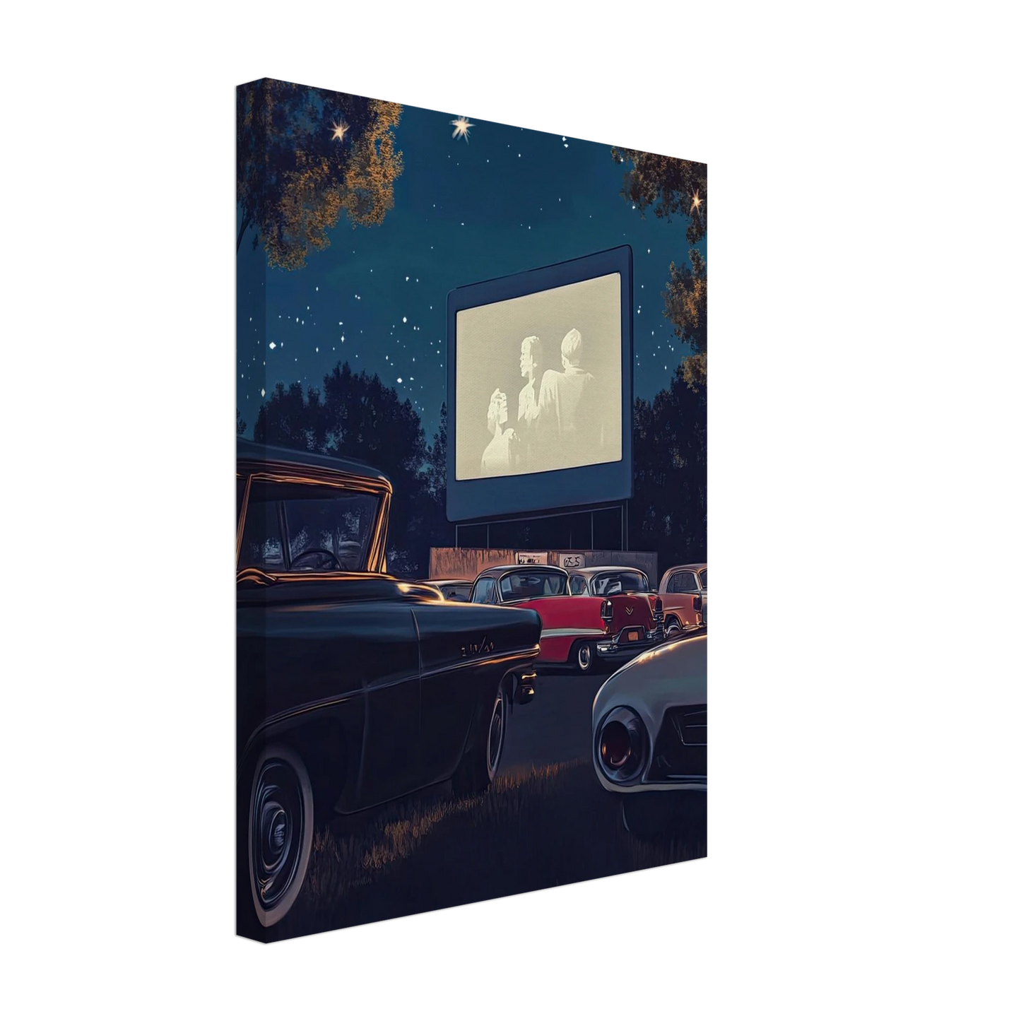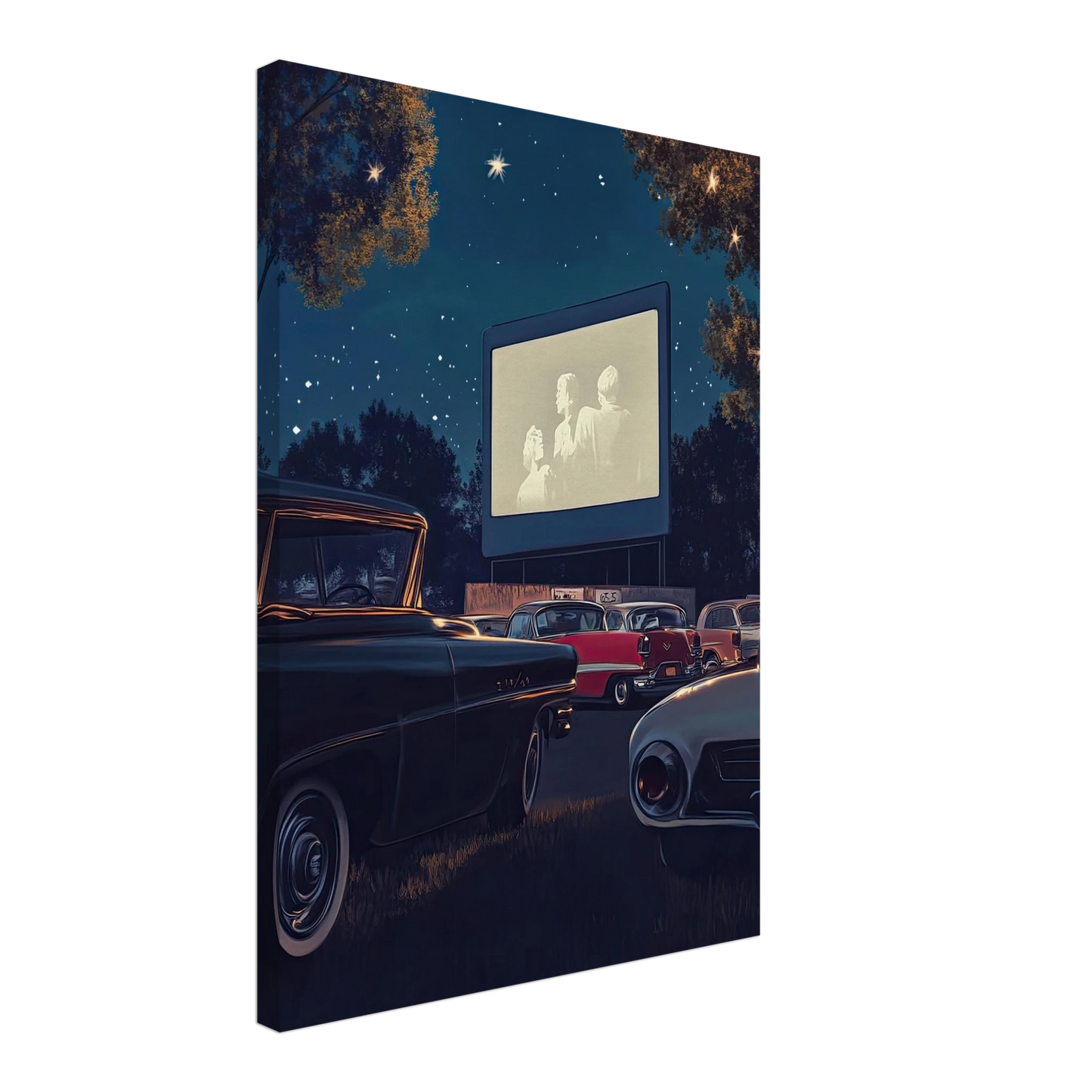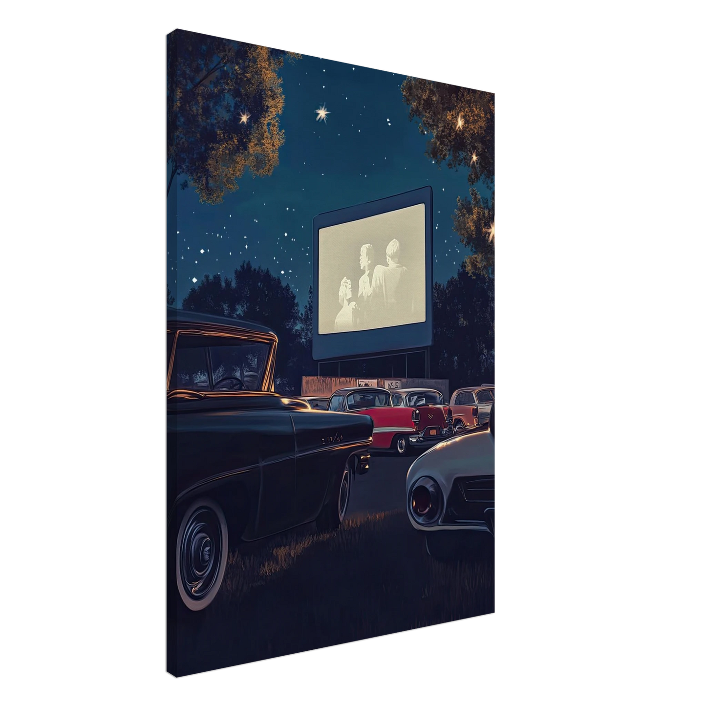 Et nostalgisk motiv fra en drive-in kino under stjernehimmelen, med klassiske biler parkert foran lerretet som viser en svart-hvitt film. Den varme, romantiske stemningen og tidstypiske detaljene fanger 50- og 60-tallets unike atmosfære. Perfekt kunstverk for deg som vil tilføre interiøret en følelse av retro romantikk, filmnostalgi og tidløs sjarm.