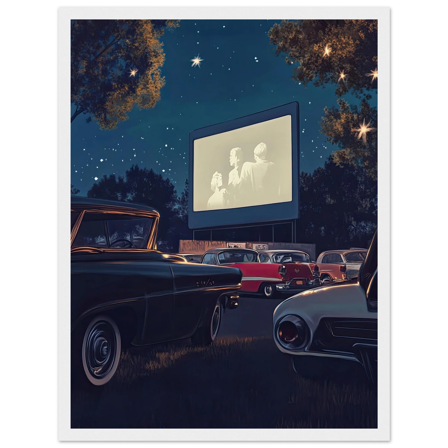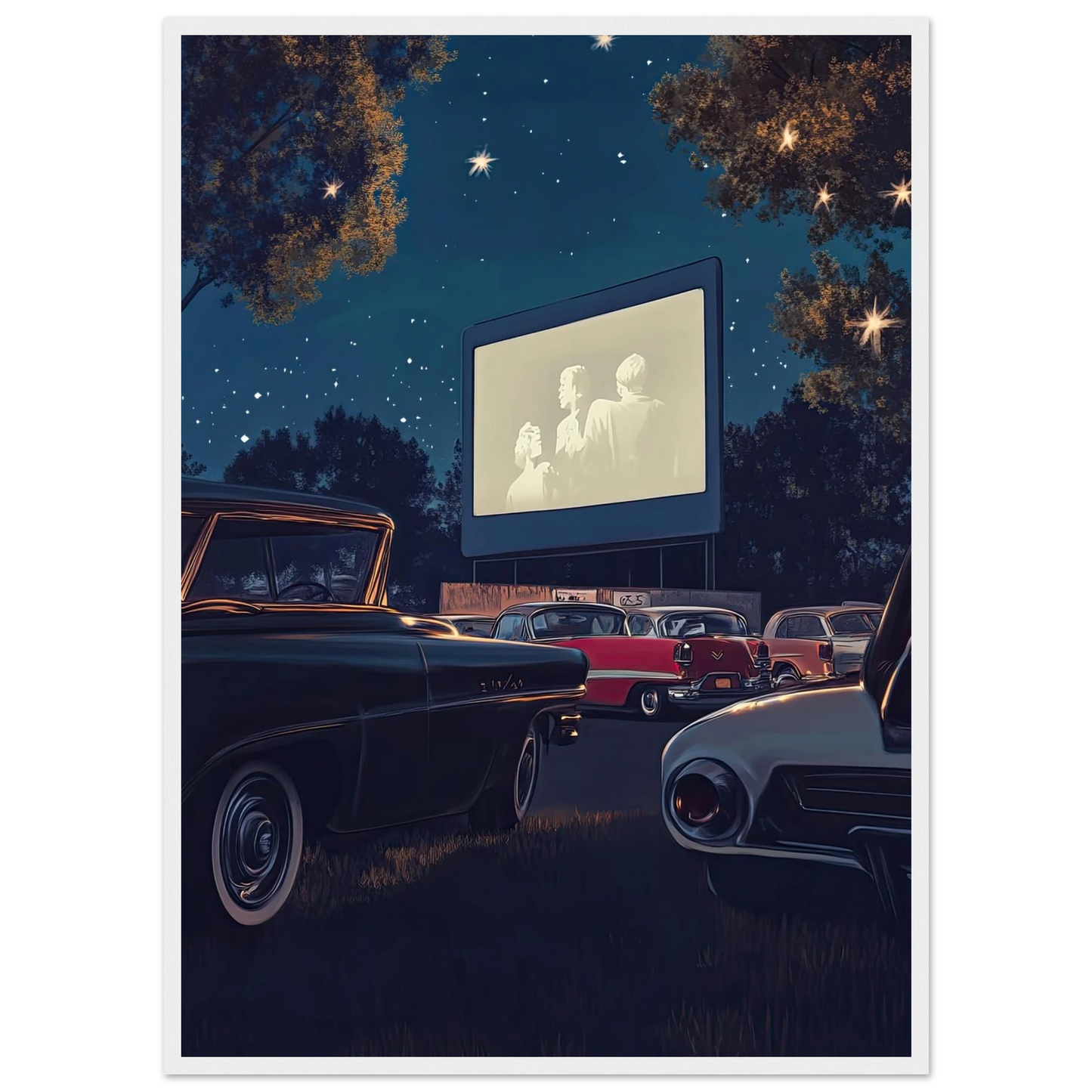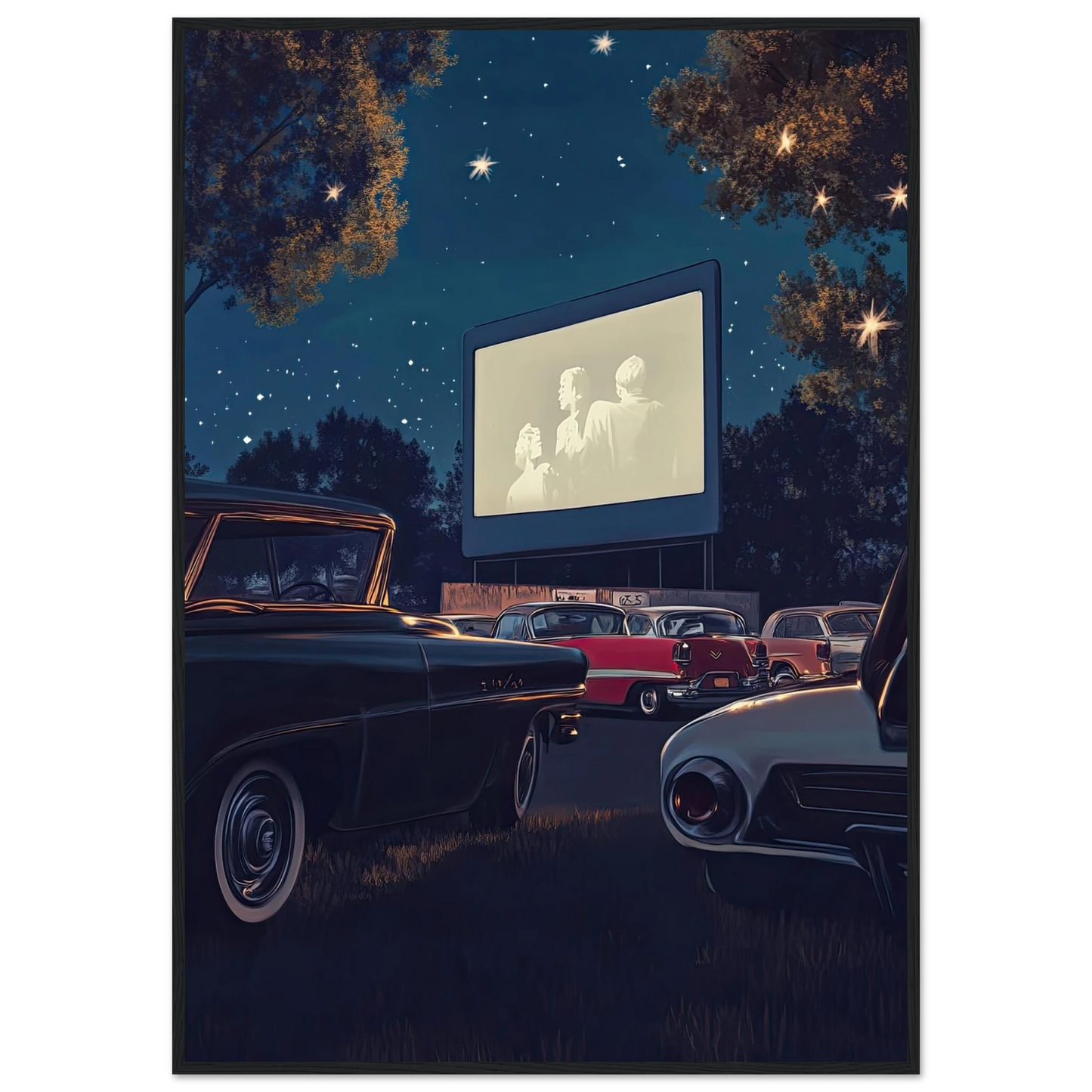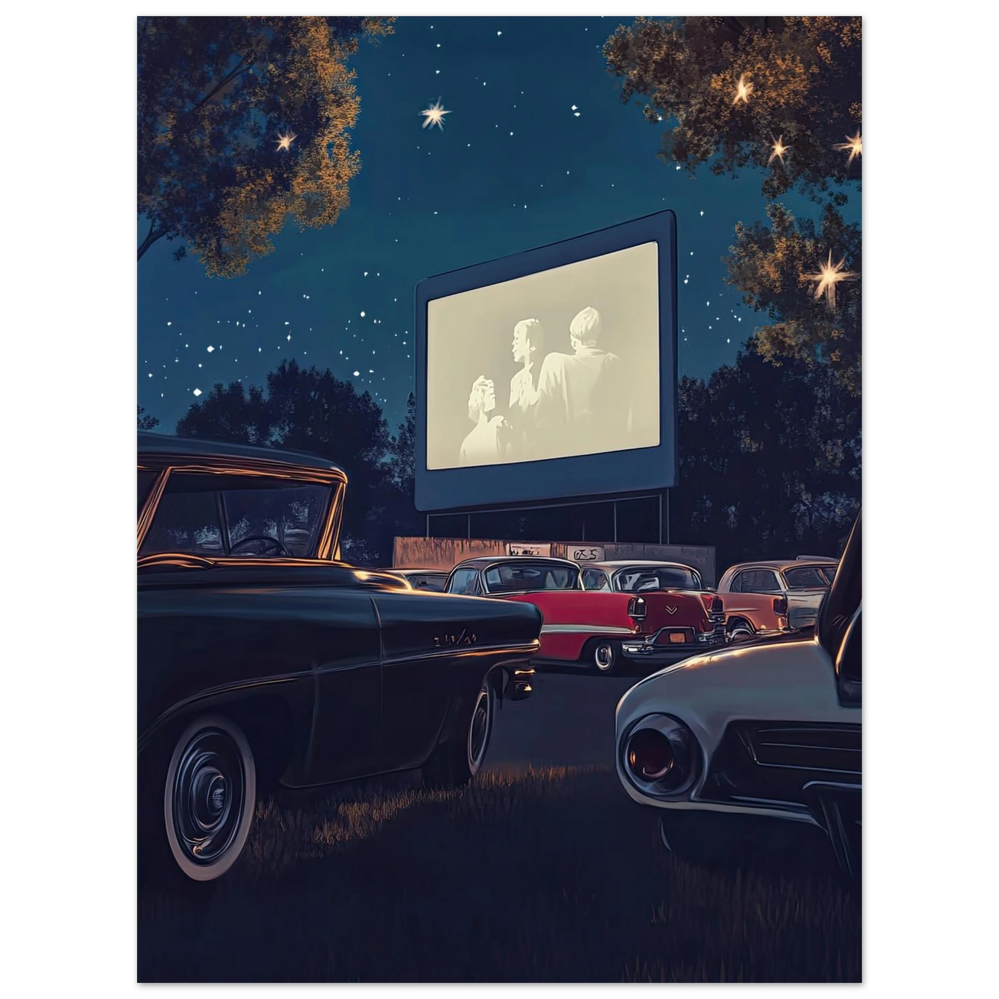 Et nostalgisk motiv fra en drive-in kino under stjernehimmelen, med klassiske biler parkert foran lerretet som viser en svart-hvitt film. Den varme, romantiske stemningen og tidstypiske detaljene fanger 50- og 60-tallets unike atmosfære. Perfekt kunstverk for deg som vil tilføre interiøret en følelse av retro romantikk, filmnostalgi og tidløs sjarm.