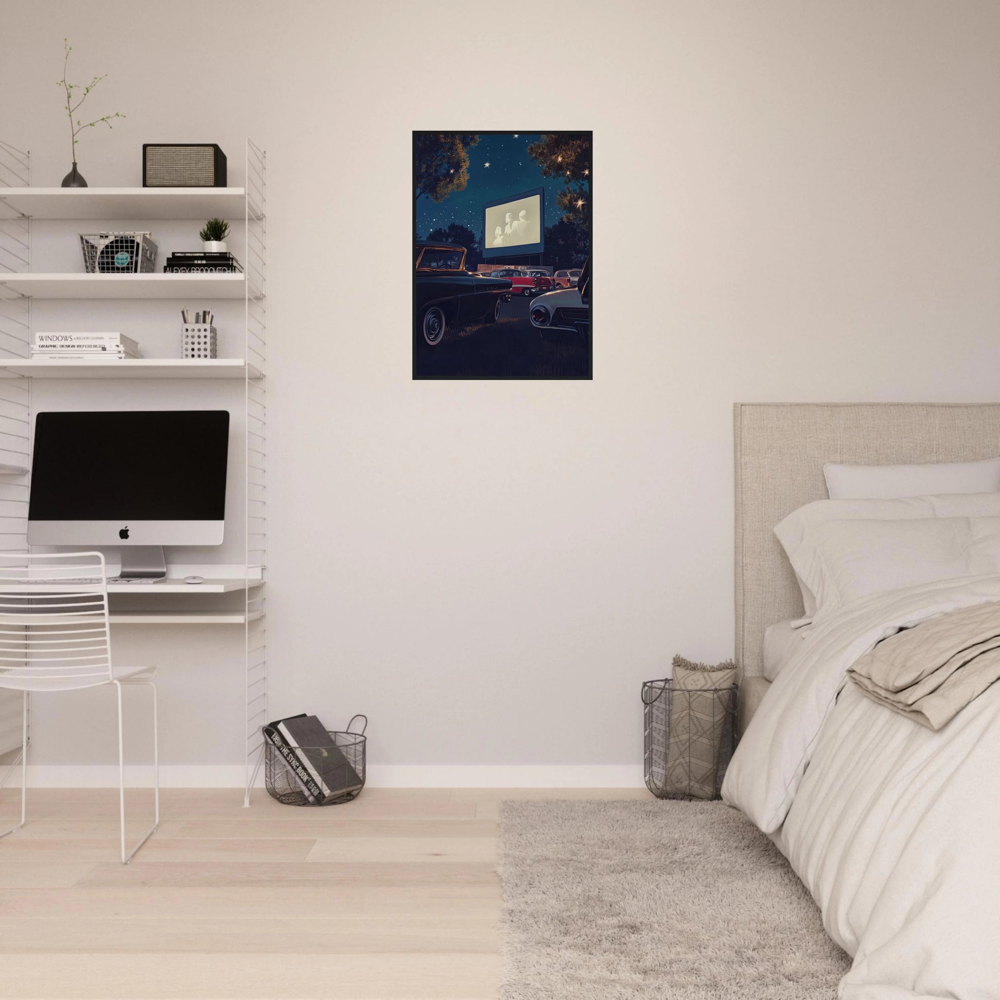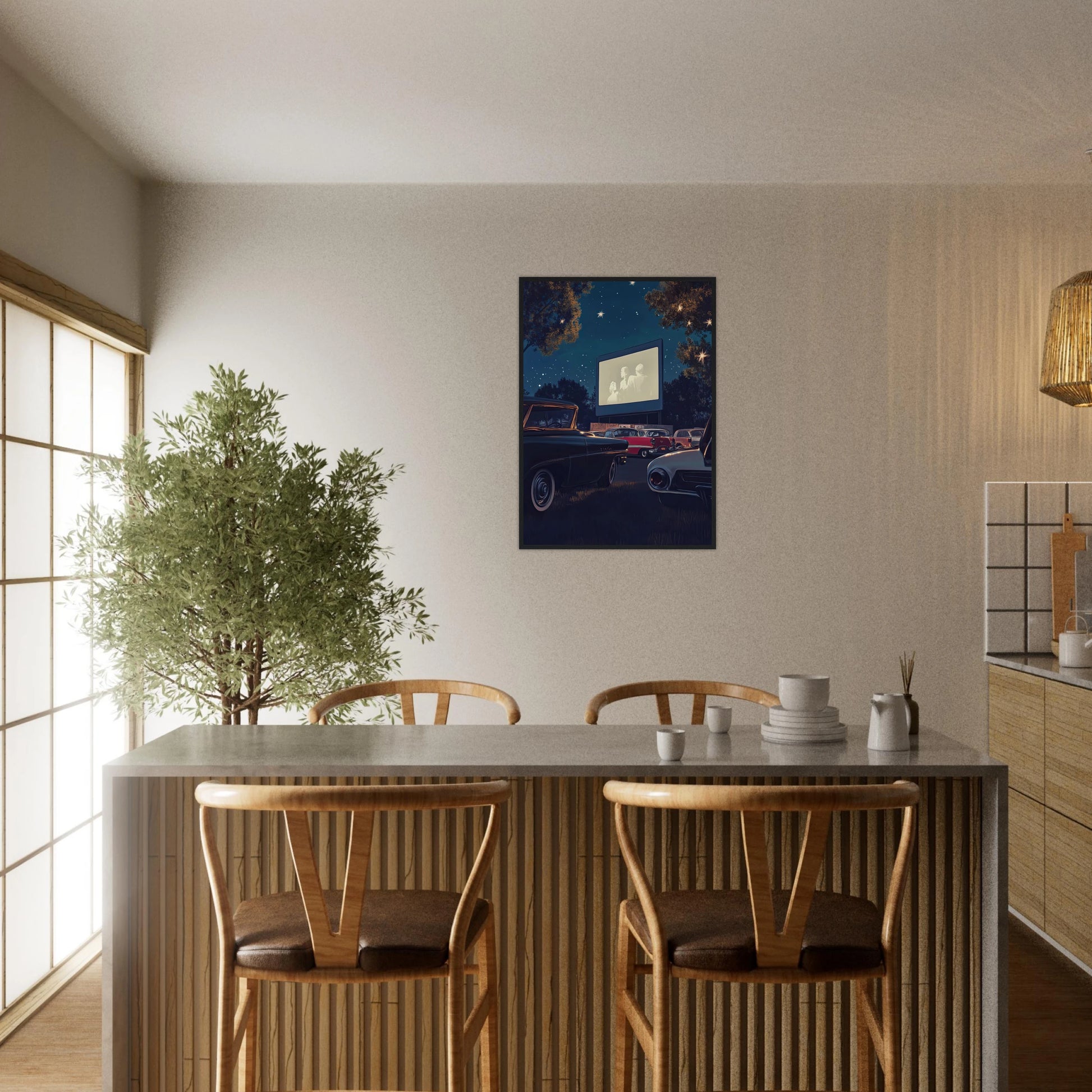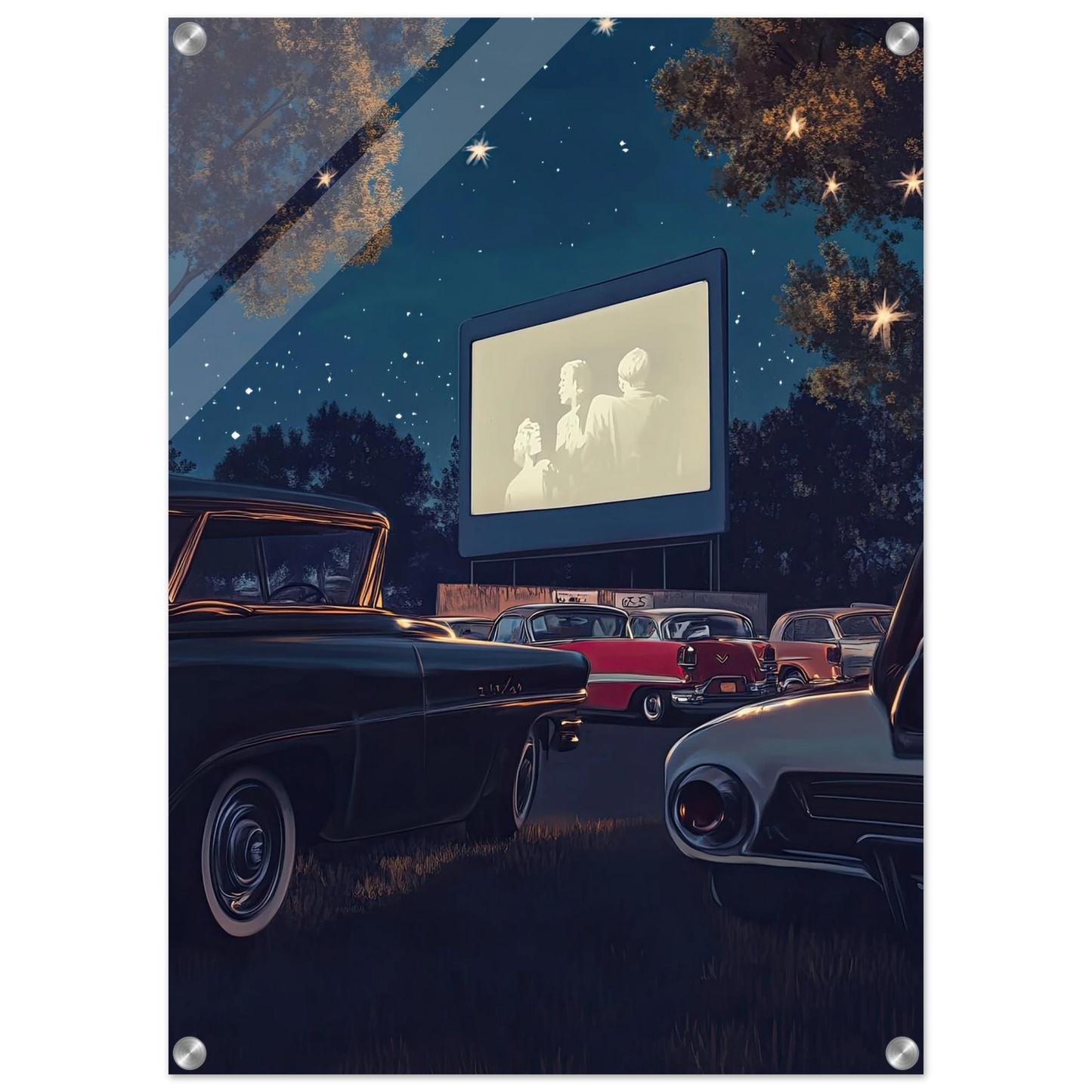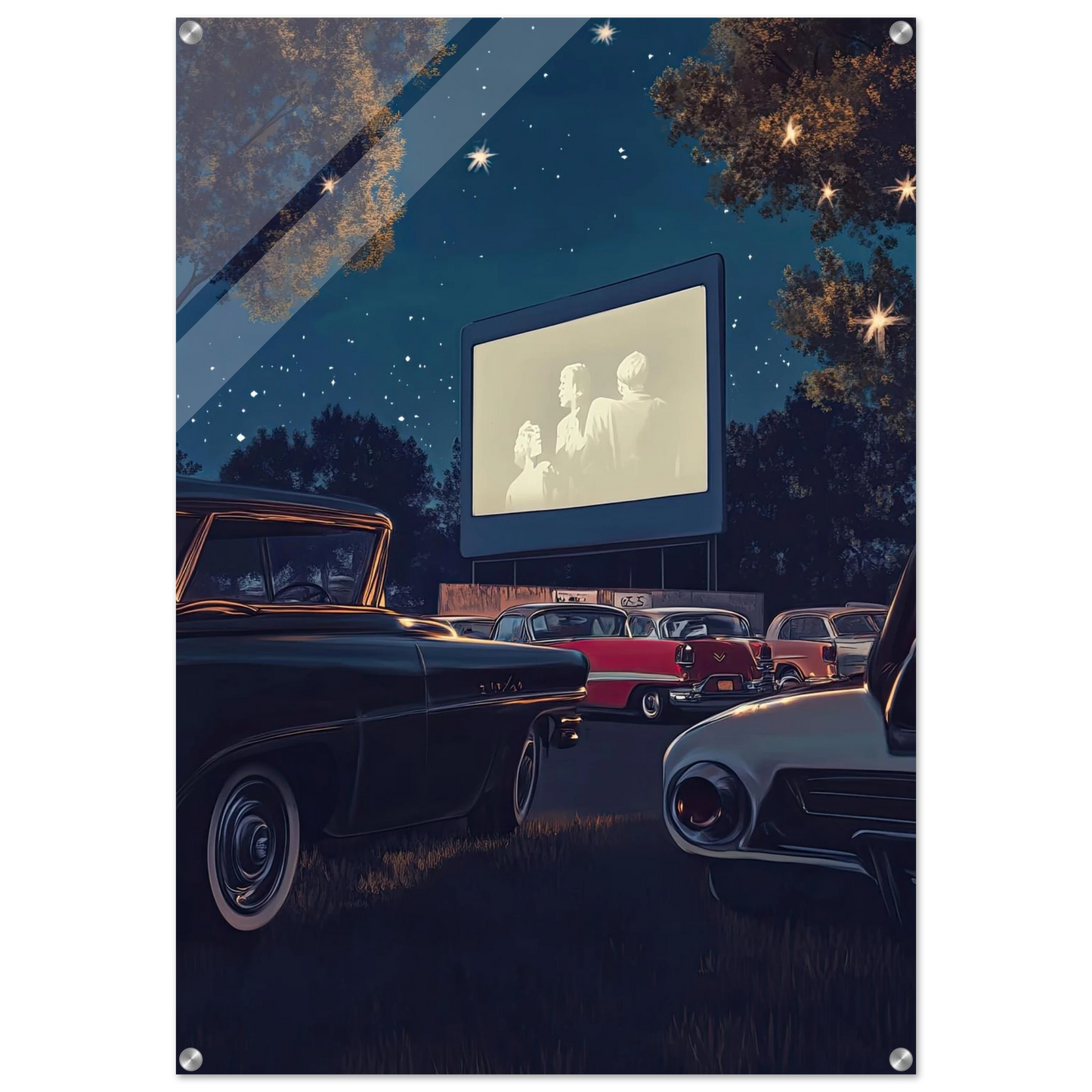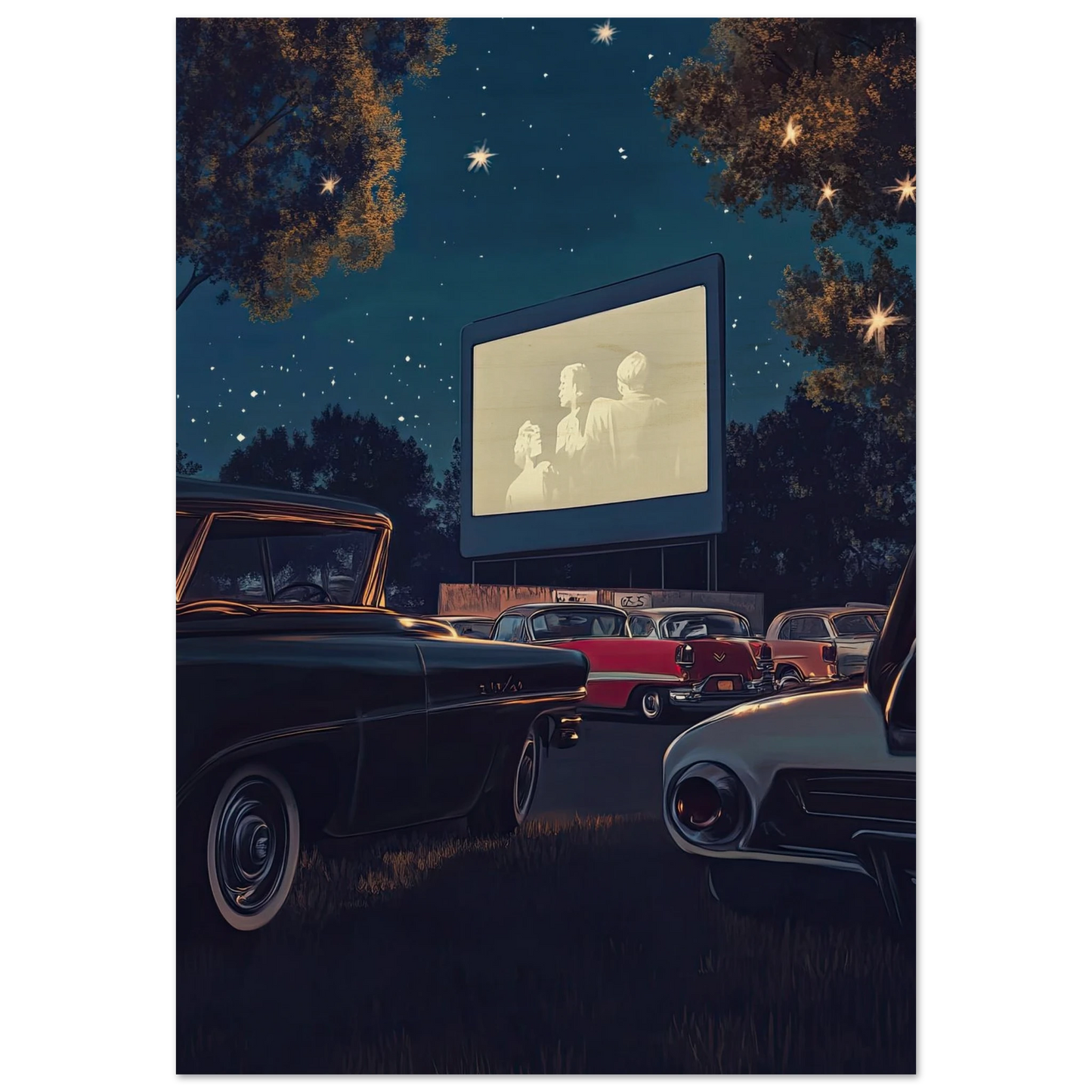 Et nostalgisk motiv fra en drive-in kino under stjernehimmelen, med klassiske biler parkert foran lerretet som viser en svart-hvitt film. Den varme, romantiske stemningen og tidstypiske detaljene fanger 50- og 60-tallets unike atmosfære. Perfekt kunstverk for deg som vil tilføre interiøret en følelse av retro romantikk, filmnostalgi og tidløs sjarm.
