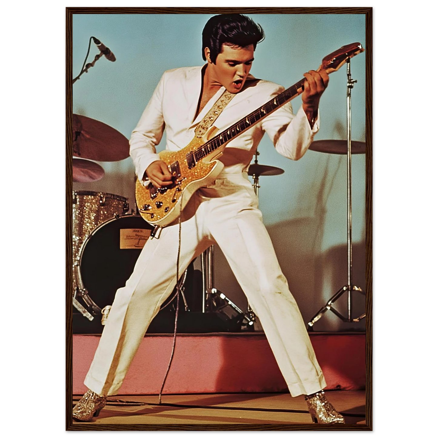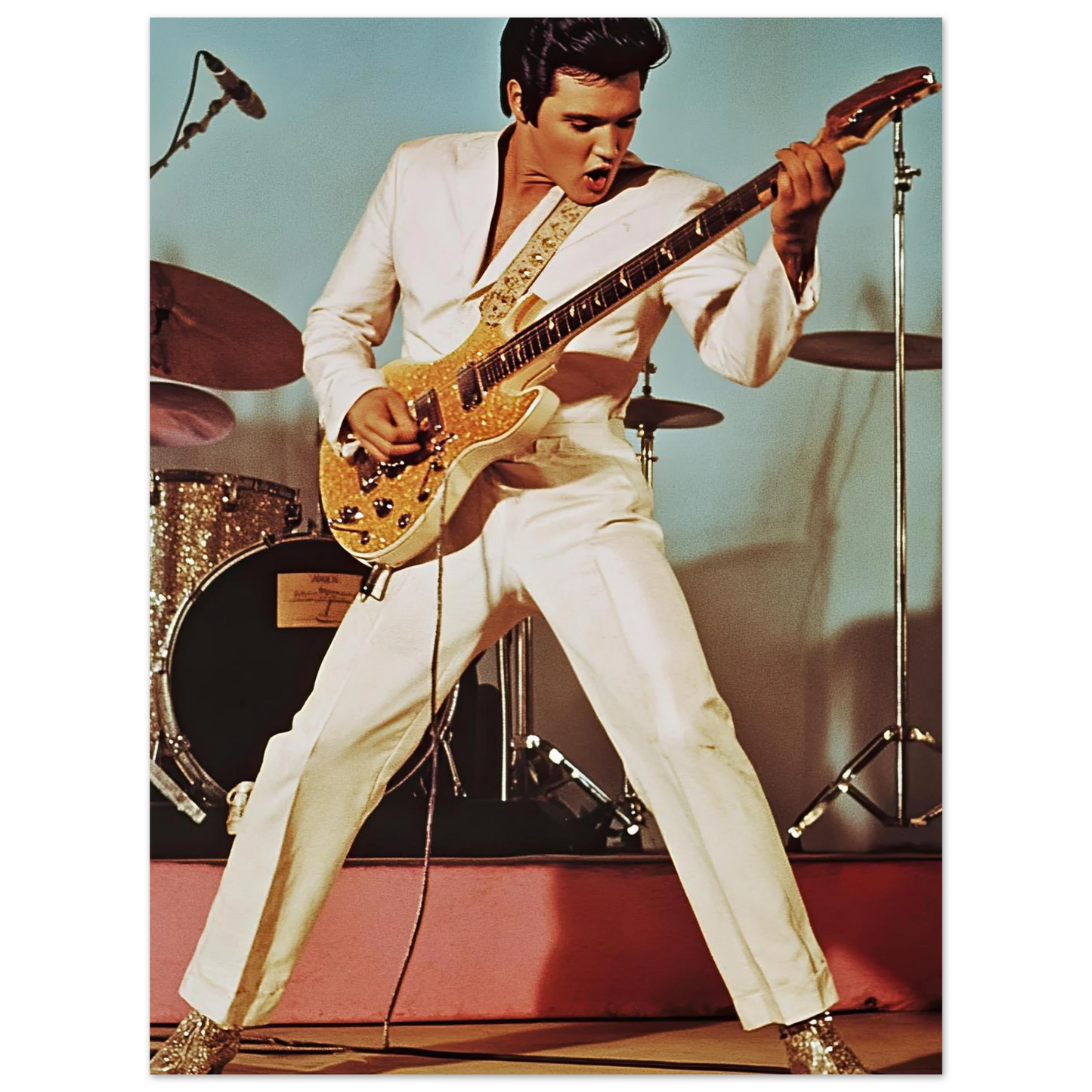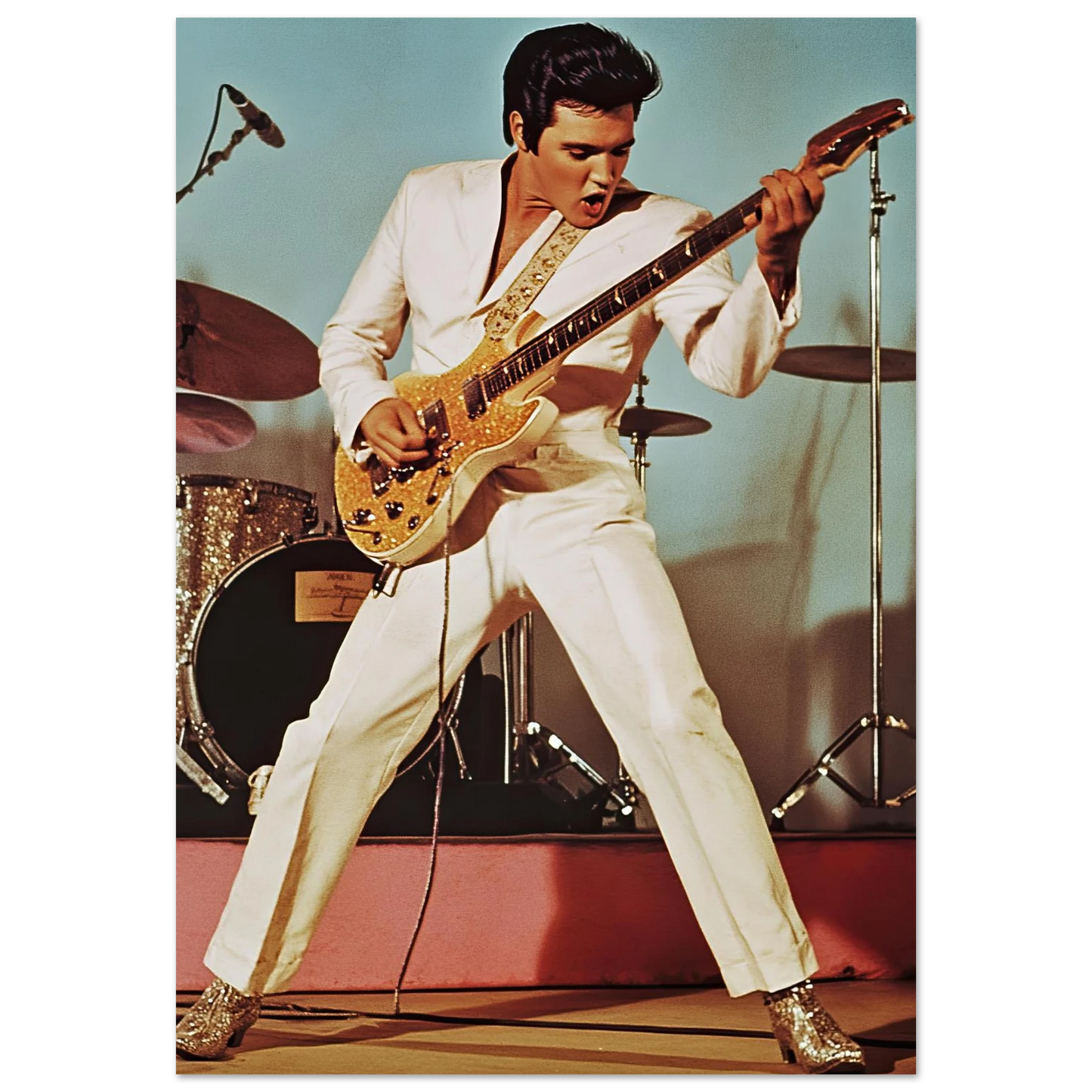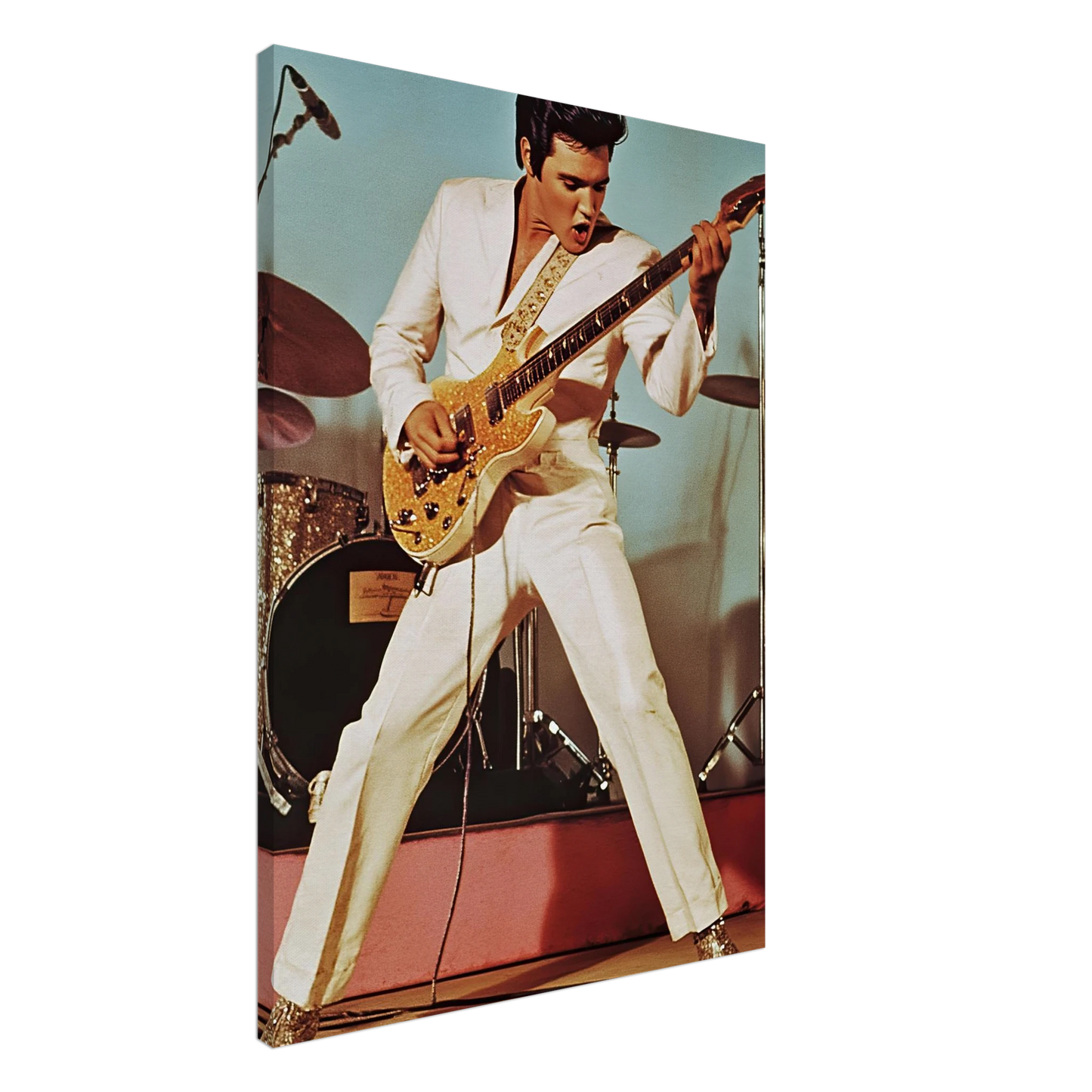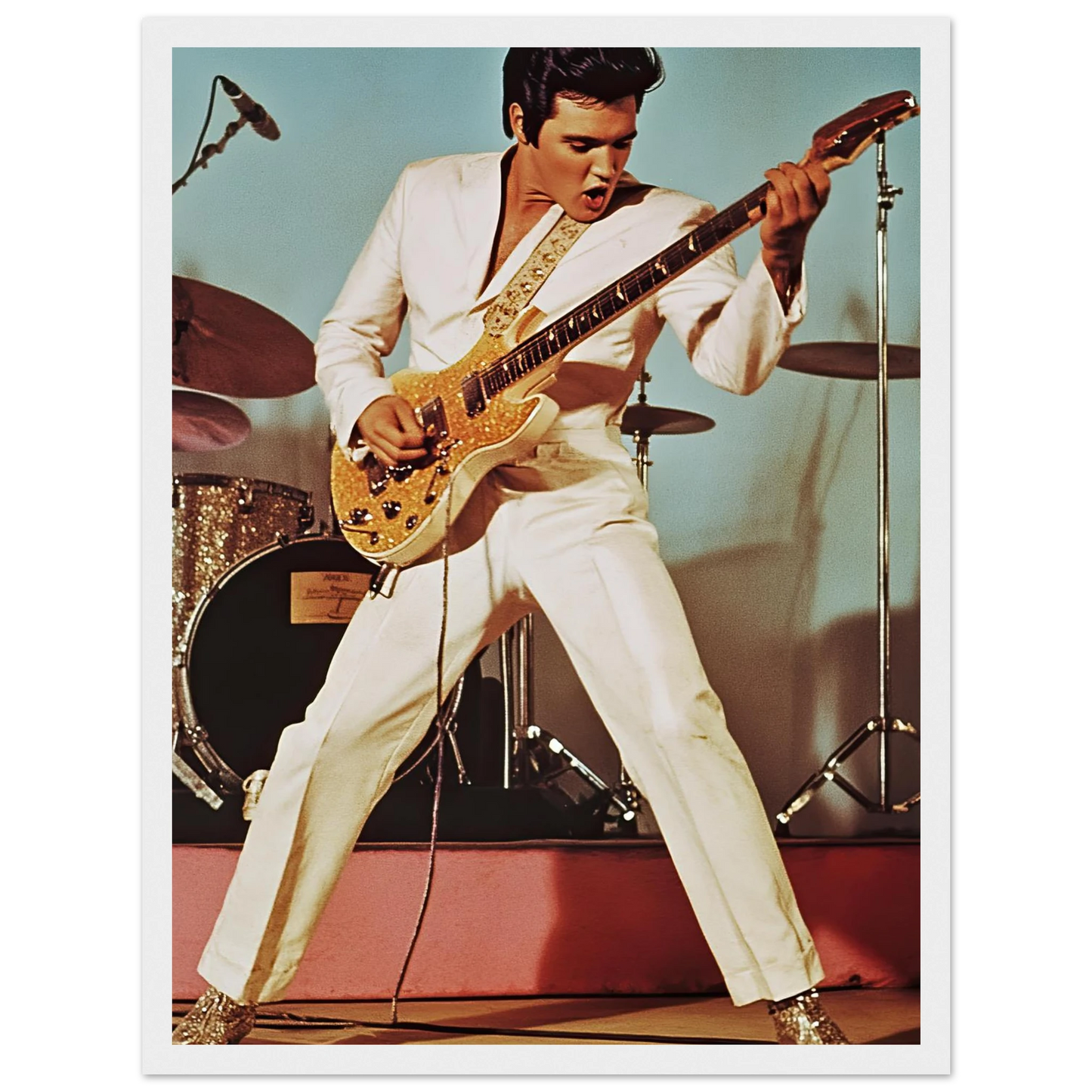 Et legendarisk motiv av Elvis Presley på scenen, kledd i hvit dress og i full aksjon med gitaren. Den autentiske retro-stilen og de tidstypiske detaljene fanger energien, karismaen og sjarmen til rockens ubestridte konge. Perfekt kunstverk for deg som vil tilføre hjemmet en kombinasjon av musikkhistorie, nostalgi og tidløs rock’n’roll.