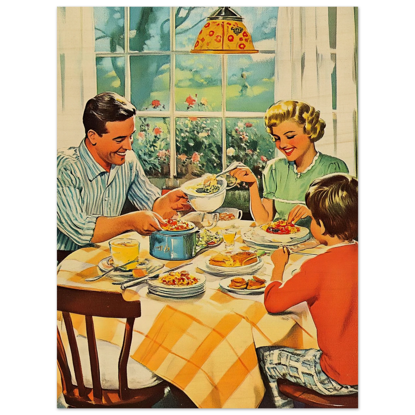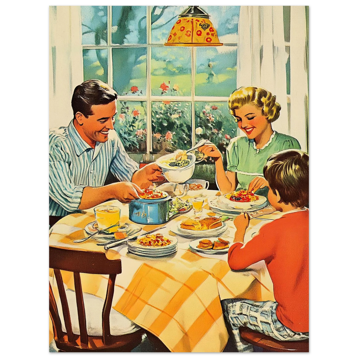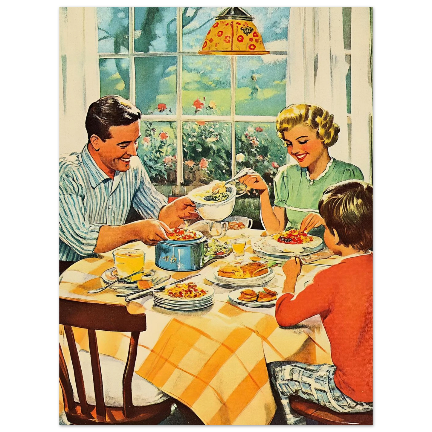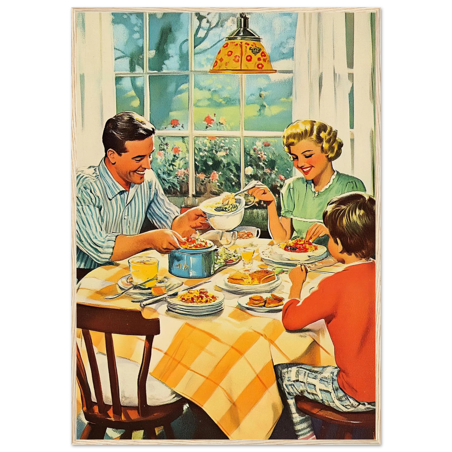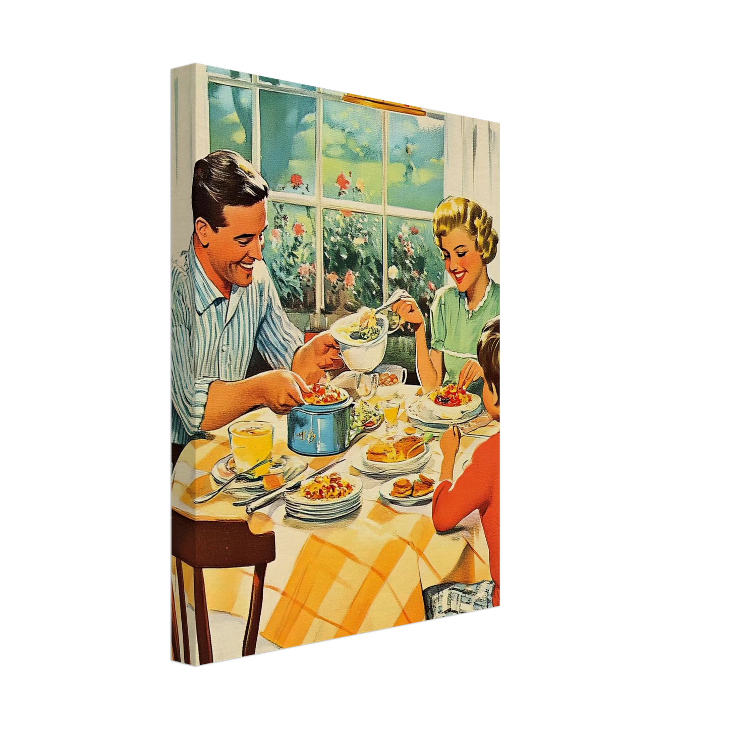 Et varmt og nostalgisk motiv som viser en klassisk familie samlet rundt middagsbordet, omgitt av lys, glede og fellesskap. De klare fargene, de tidstypiske detaljene og den idylliske stemningen gir bildet en ekte 50-talls atmosfære. Perfekt kunstverk for deg som vil tilføre hjemmet en følelse av trygghet, nostalgi og tidløs familiekos.