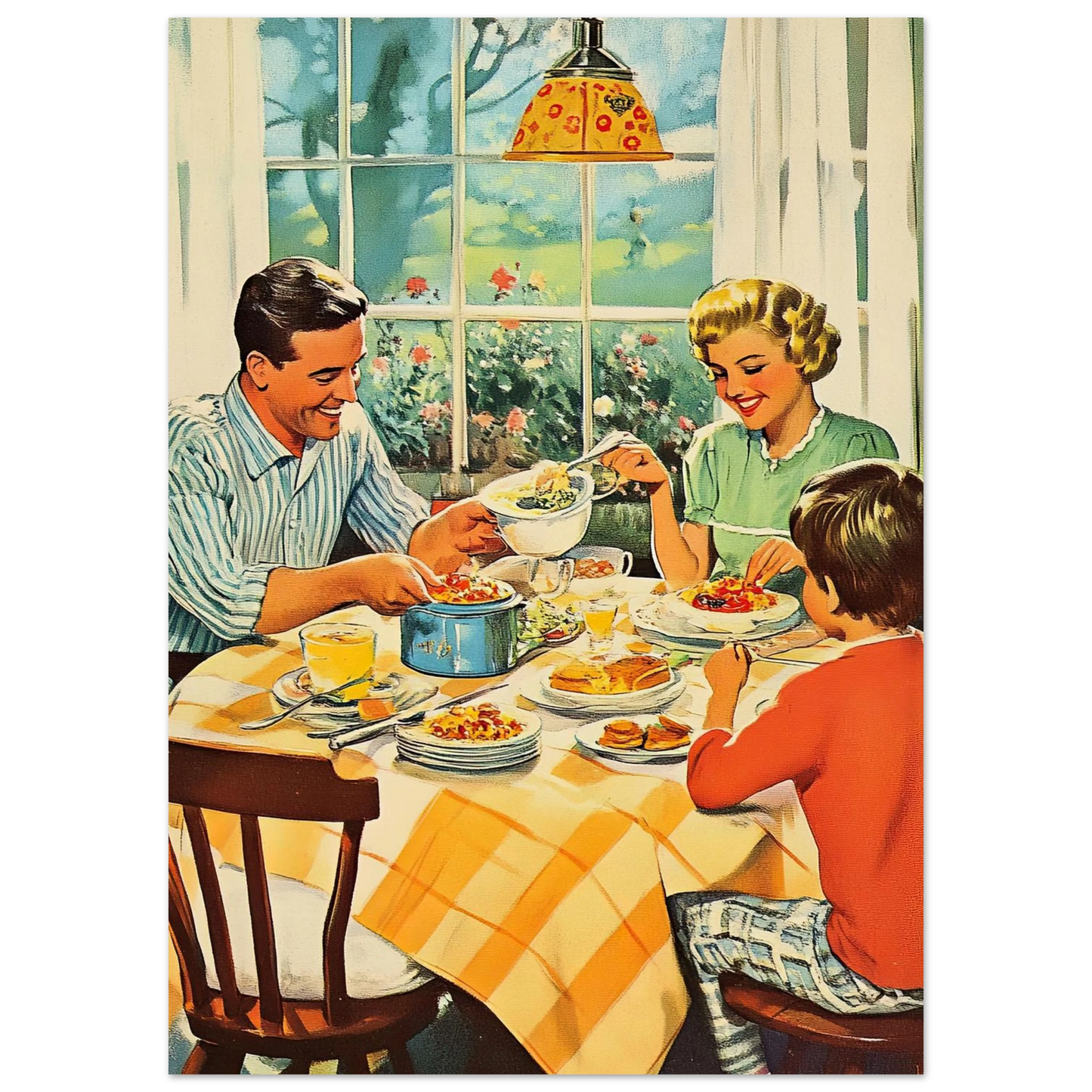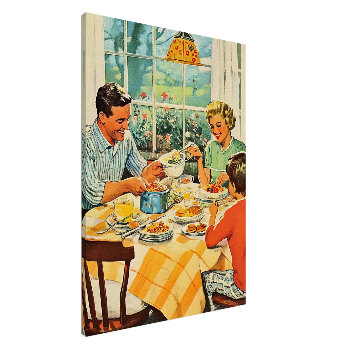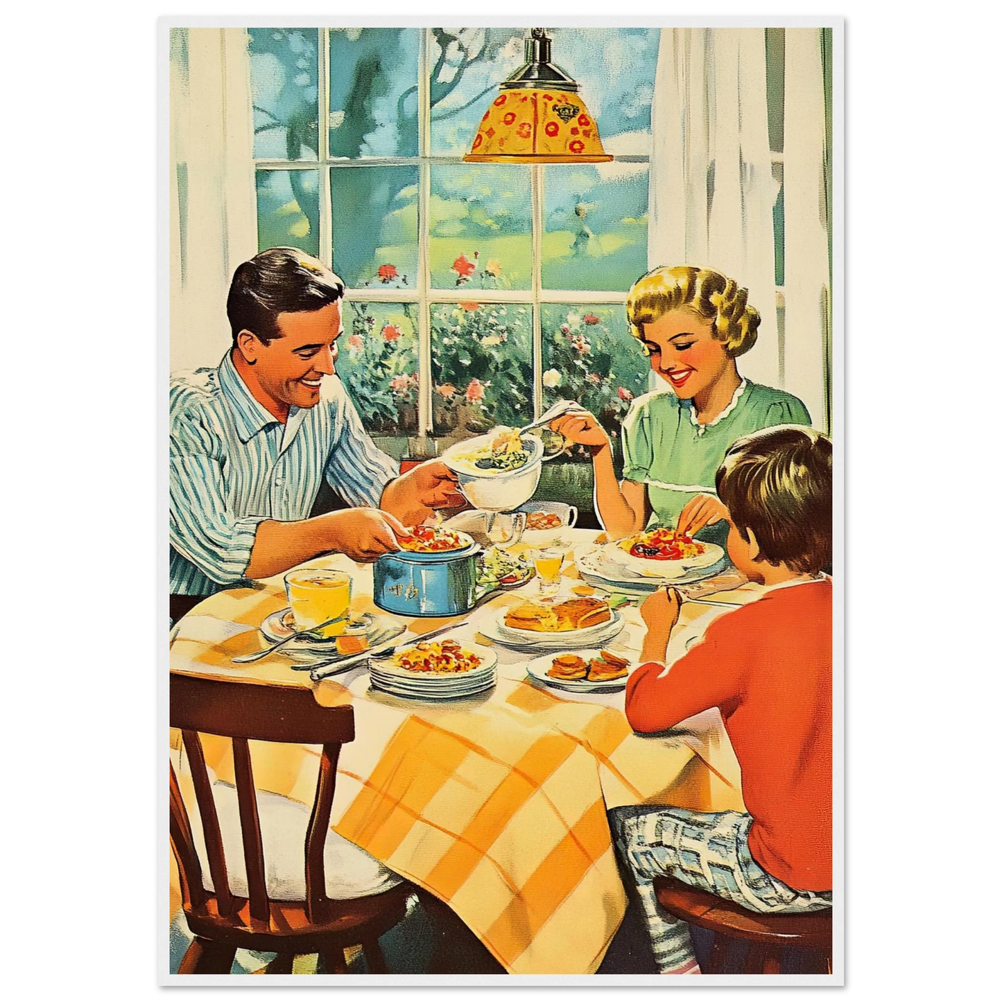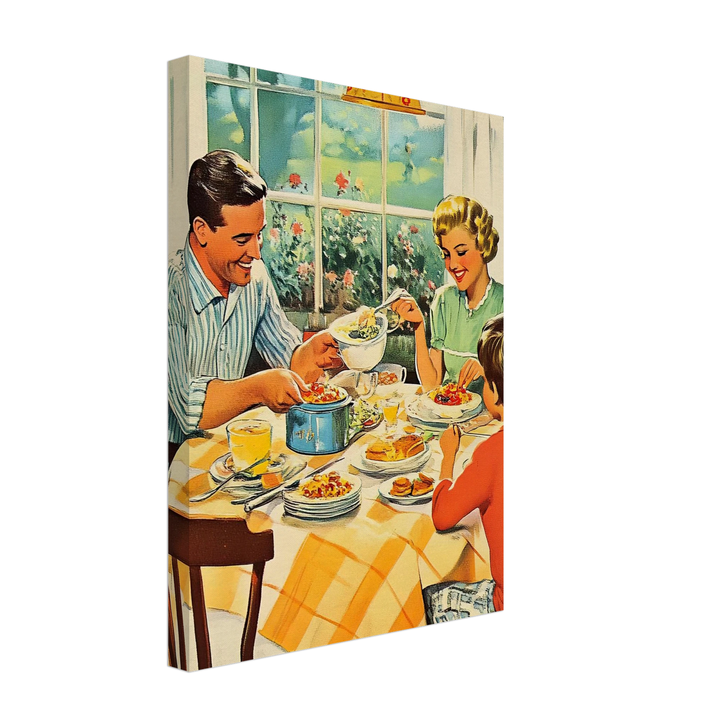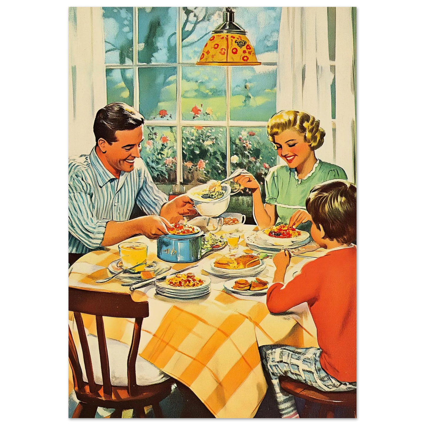 Et varmt og nostalgisk motiv som viser en klassisk familie samlet rundt middagsbordet, omgitt av lys, glede og fellesskap. De klare fargene, de tidstypiske detaljene og den idylliske stemningen gir bildet en ekte 50-talls atmosfære. Perfekt kunstverk for deg som vil tilføre hjemmet en følelse av trygghet, nostalgi og tidløs familiekos.