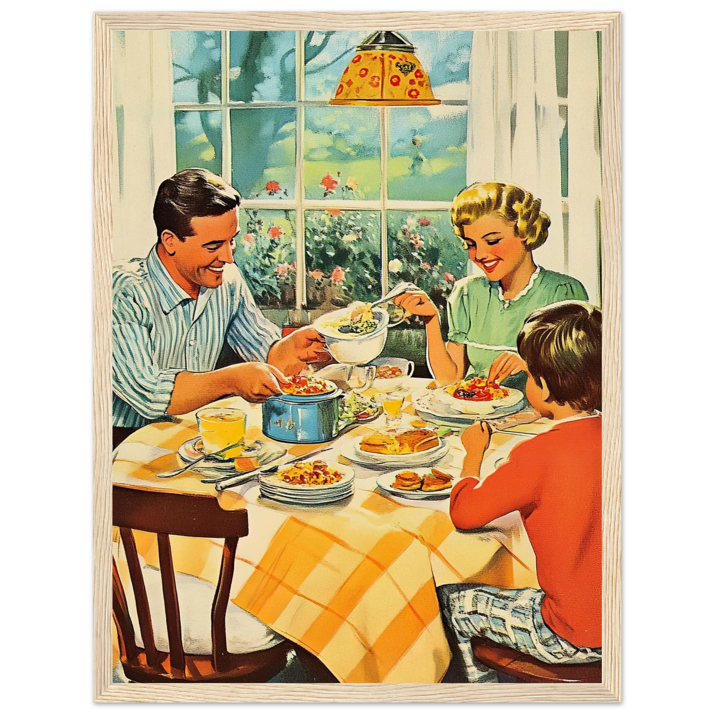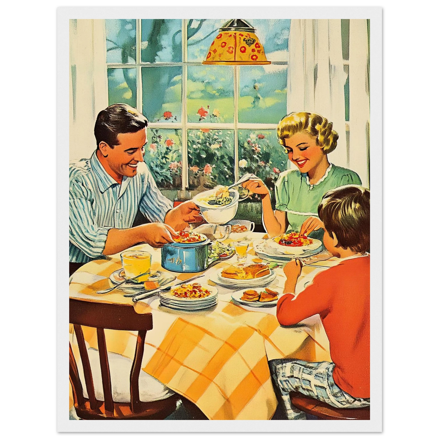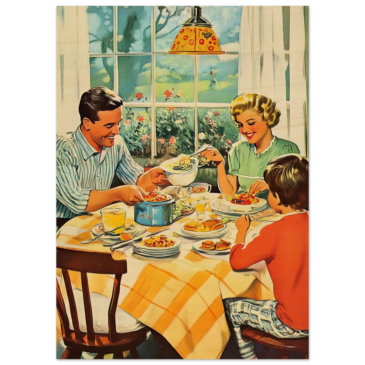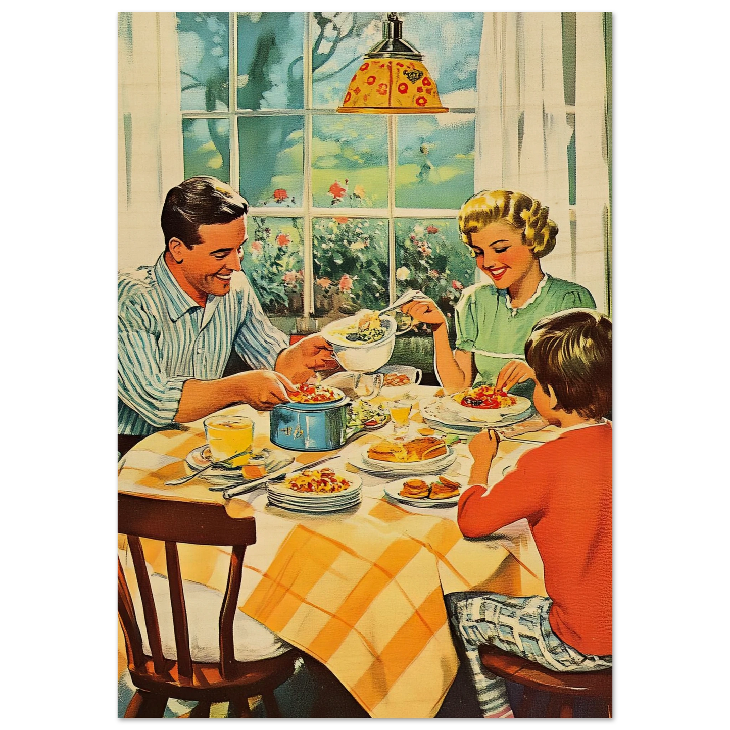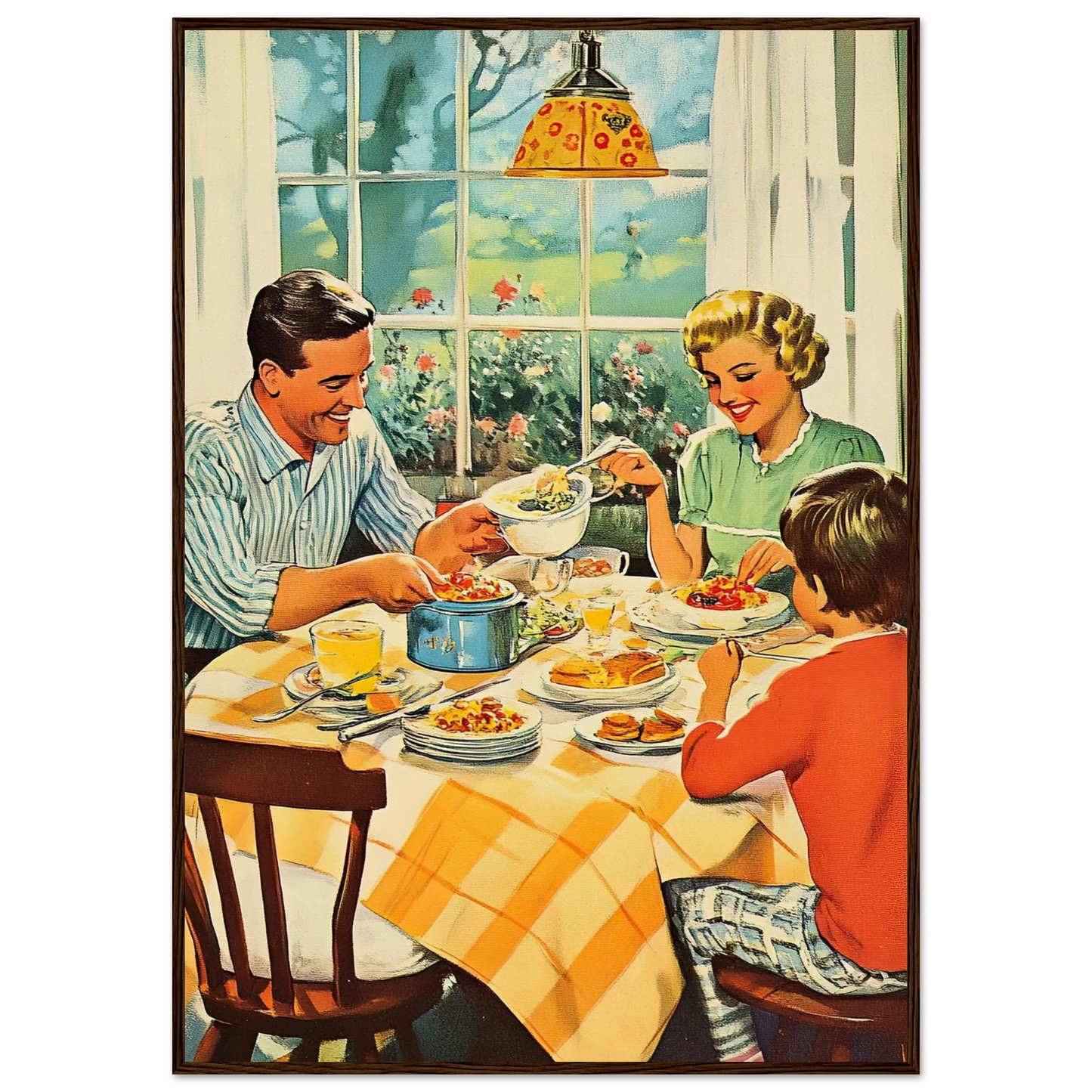 Et varmt og nostalgisk motiv som viser en klassisk familie samlet rundt middagsbordet, omgitt av lys, glede og fellesskap. De klare fargene, de tidstypiske detaljene og den idylliske stemningen gir bildet en ekte 50-talls atmosfære. Perfekt kunstverk for deg som vil tilføre hjemmet en følelse av trygghet, nostalgi og tidløs familiekos.