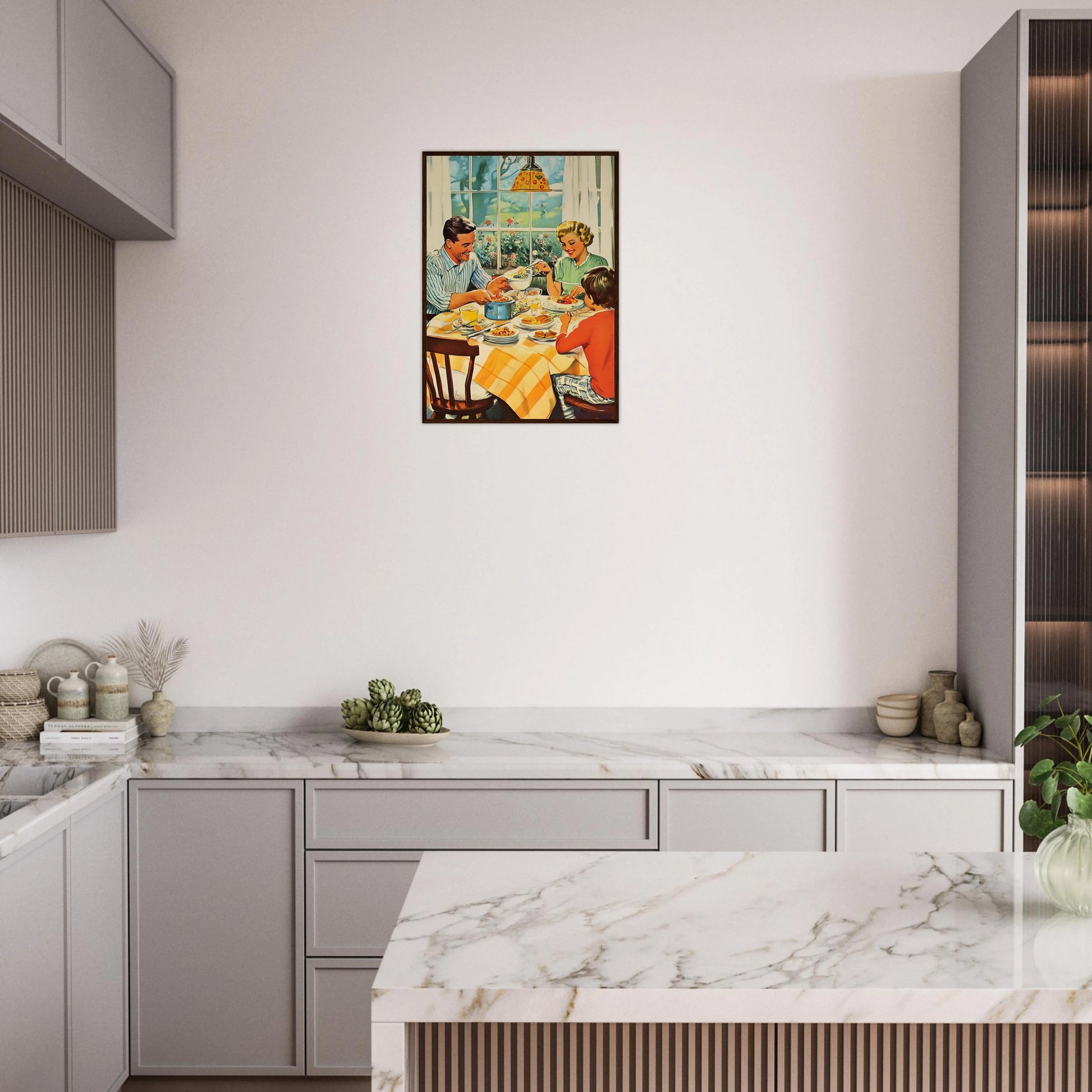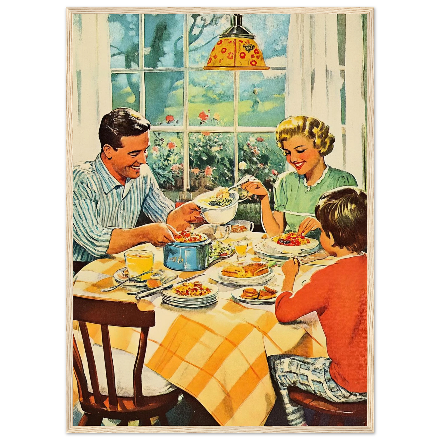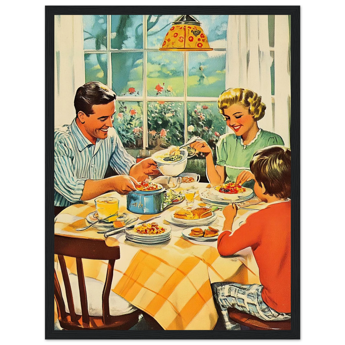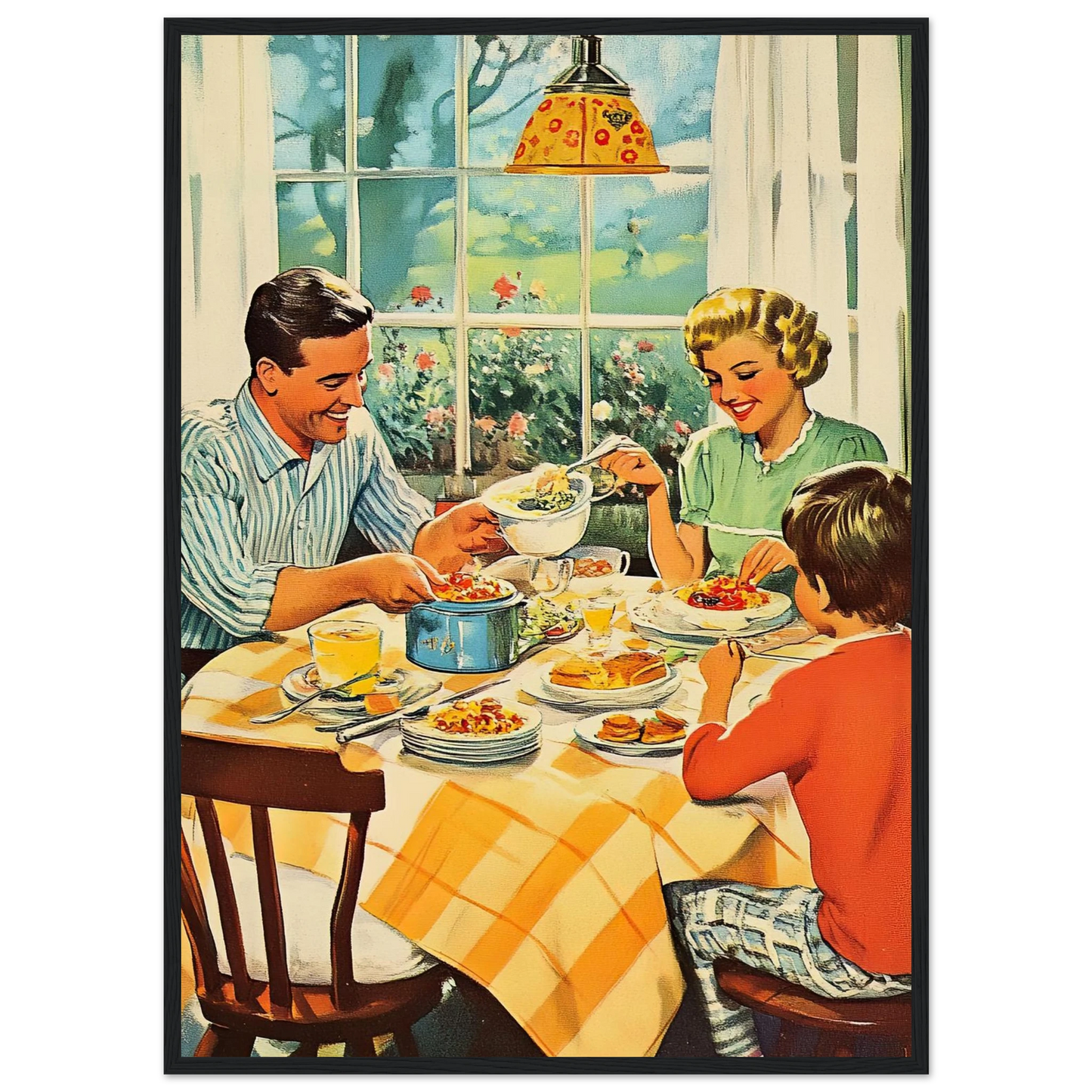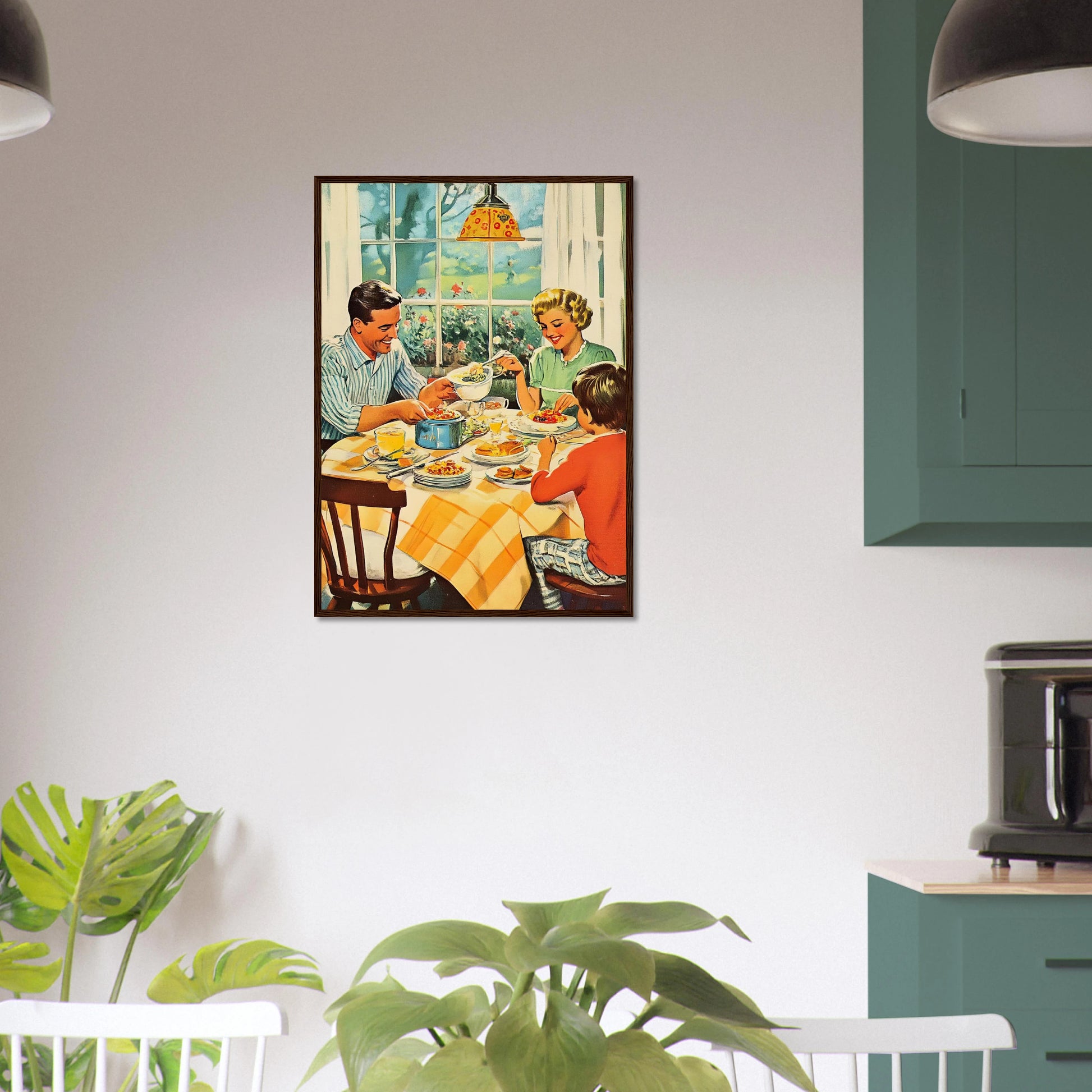 Et varmt og nostalgisk motiv som viser en klassisk familie samlet rundt middagsbordet, omgitt av lys, glede og fellesskap. De klare fargene, de tidstypiske detaljene og den idylliske stemningen gir bildet en ekte 50-talls atmosfære. Perfekt kunstverk for deg som vil tilføre hjemmet en følelse av trygghet, nostalgi og tidløs familiekos.
