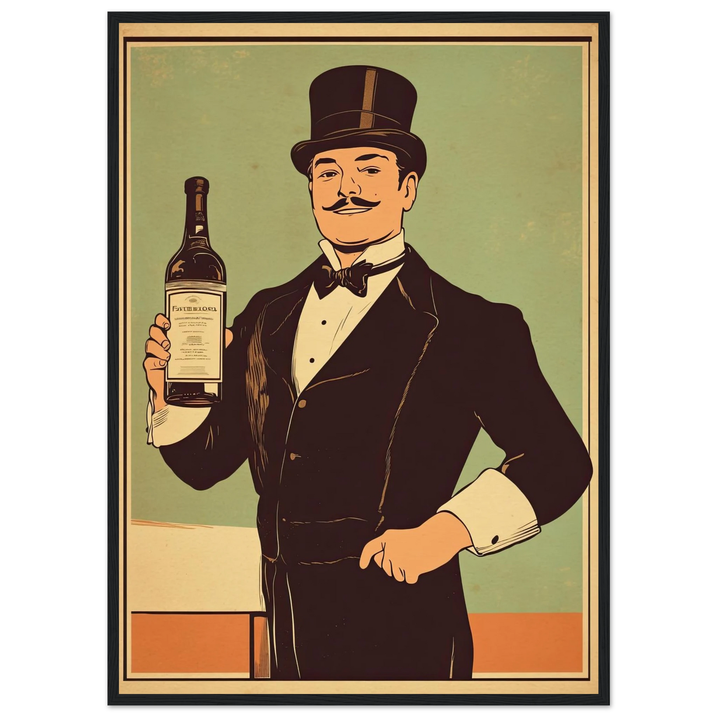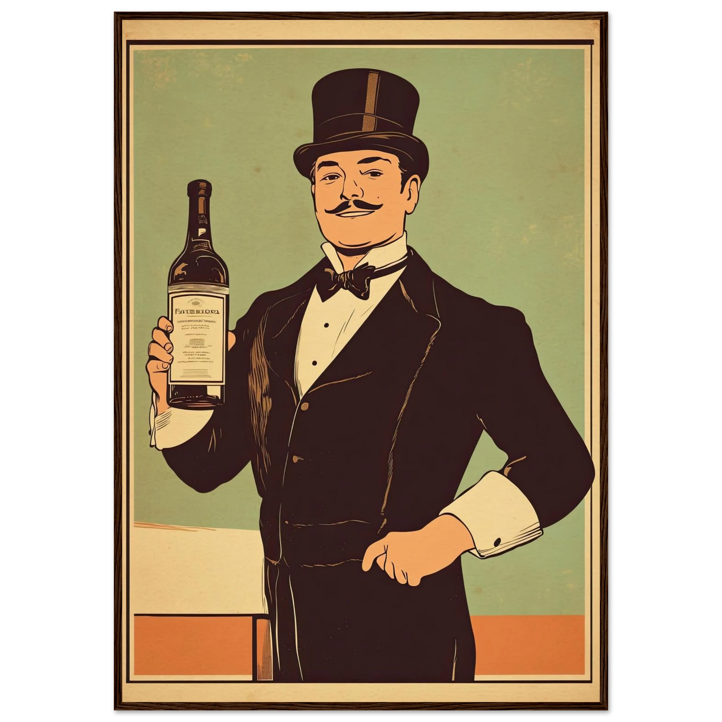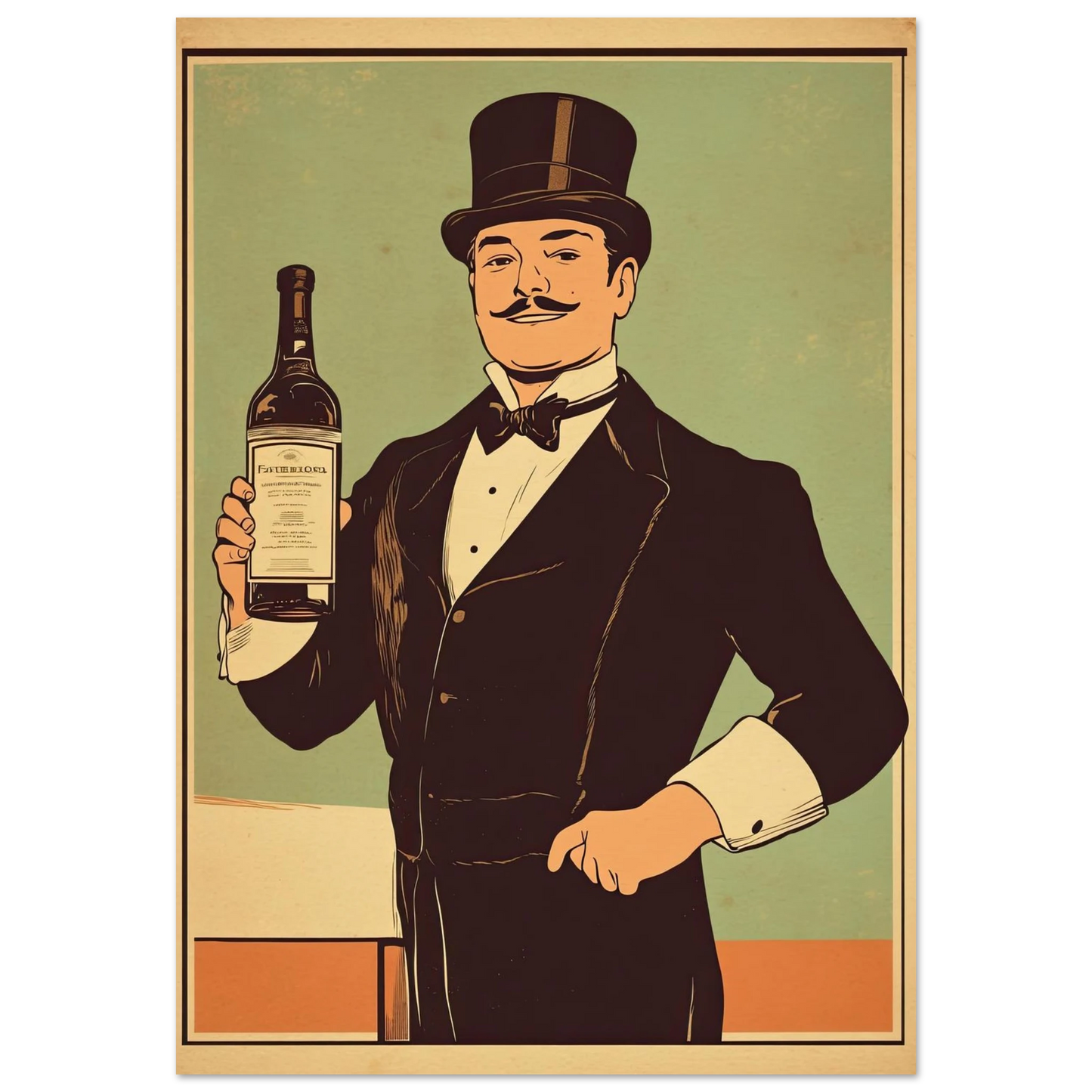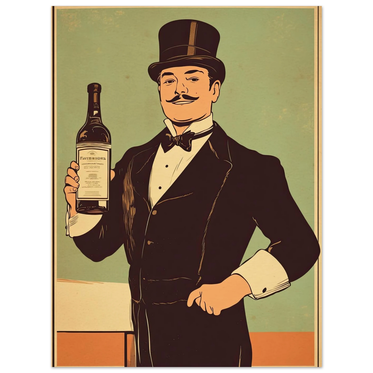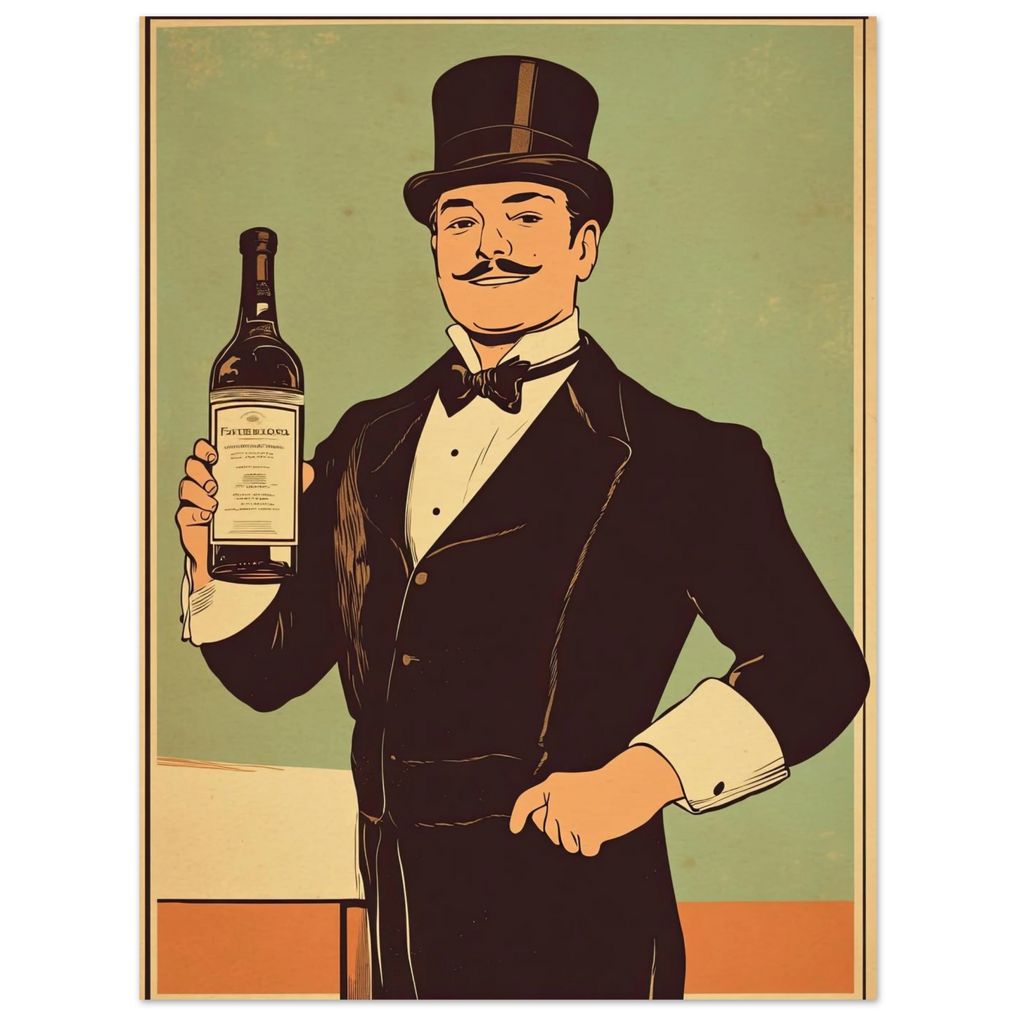 Et elegant retro-plakatmotiv som viser en smilende herre i smoking og flosshatt, stolt med en flaske i hånden. De klare linjene og den dempede fargepaletten gir kunstverket et tidløst uttrykk med luksus og sjarm. Perfekt for deg som vil tilføre interiøret en følelse av klassisk raffinement og nostalgisk eleganse.