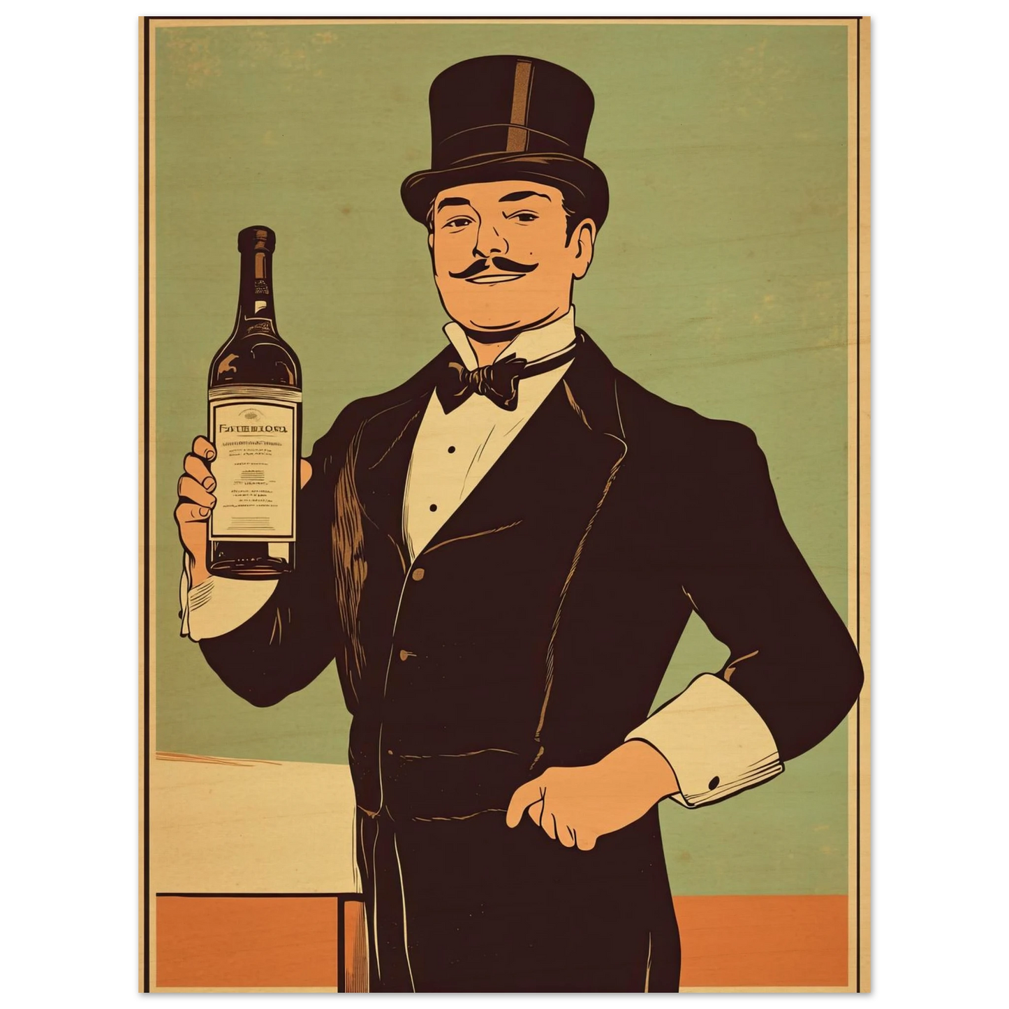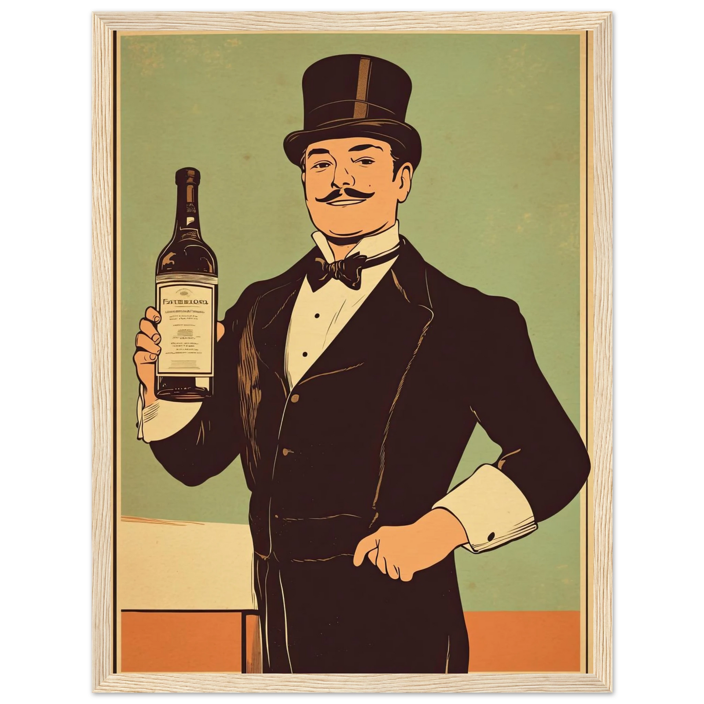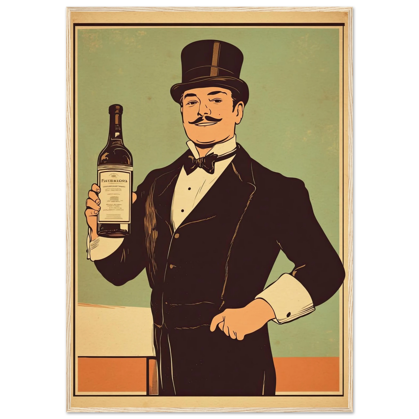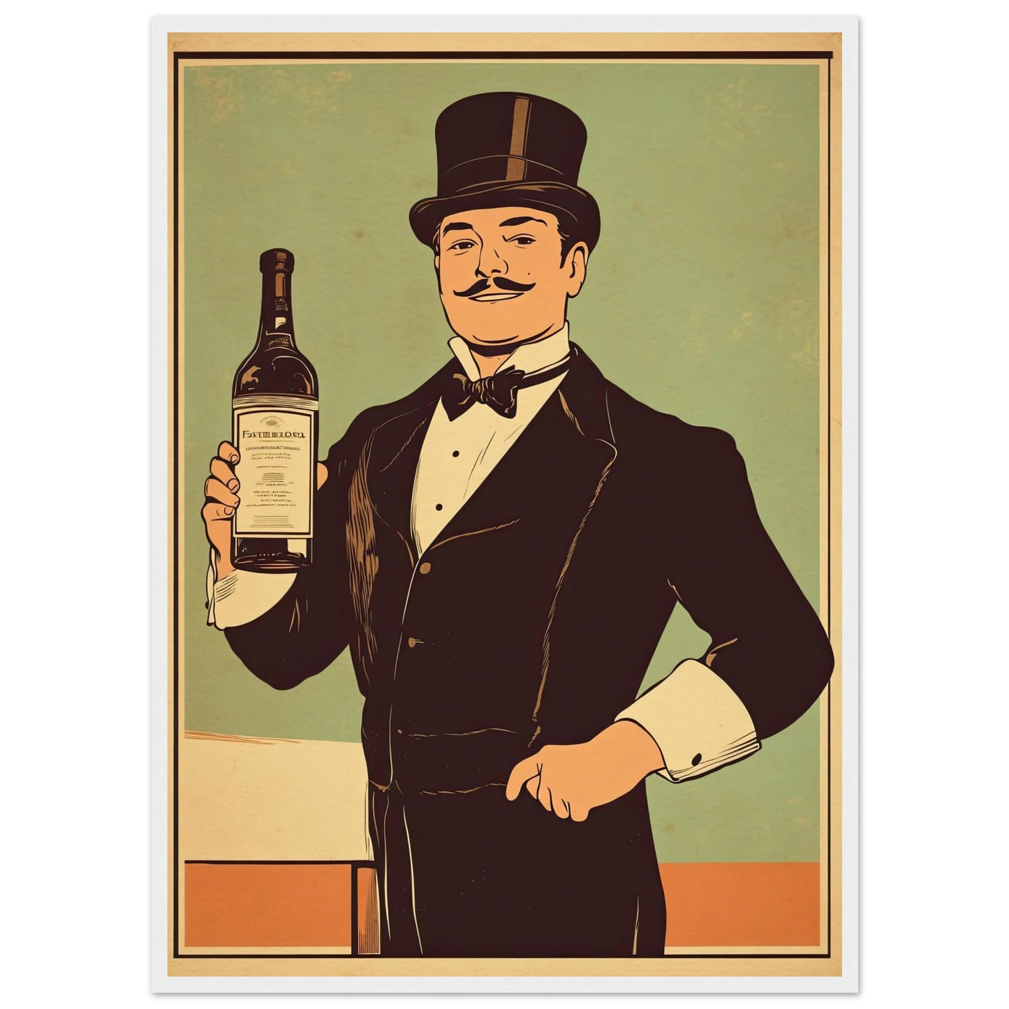 Et elegant retro-plakatmotiv som viser en smilende herre i smoking og flosshatt, stolt med en flaske i hånden. De klare linjene og den dempede fargepaletten gir kunstverket et tidløst uttrykk med luksus og sjarm. Perfekt for deg som vil tilføre interiøret en følelse av klassisk raffinement og nostalgisk eleganse.