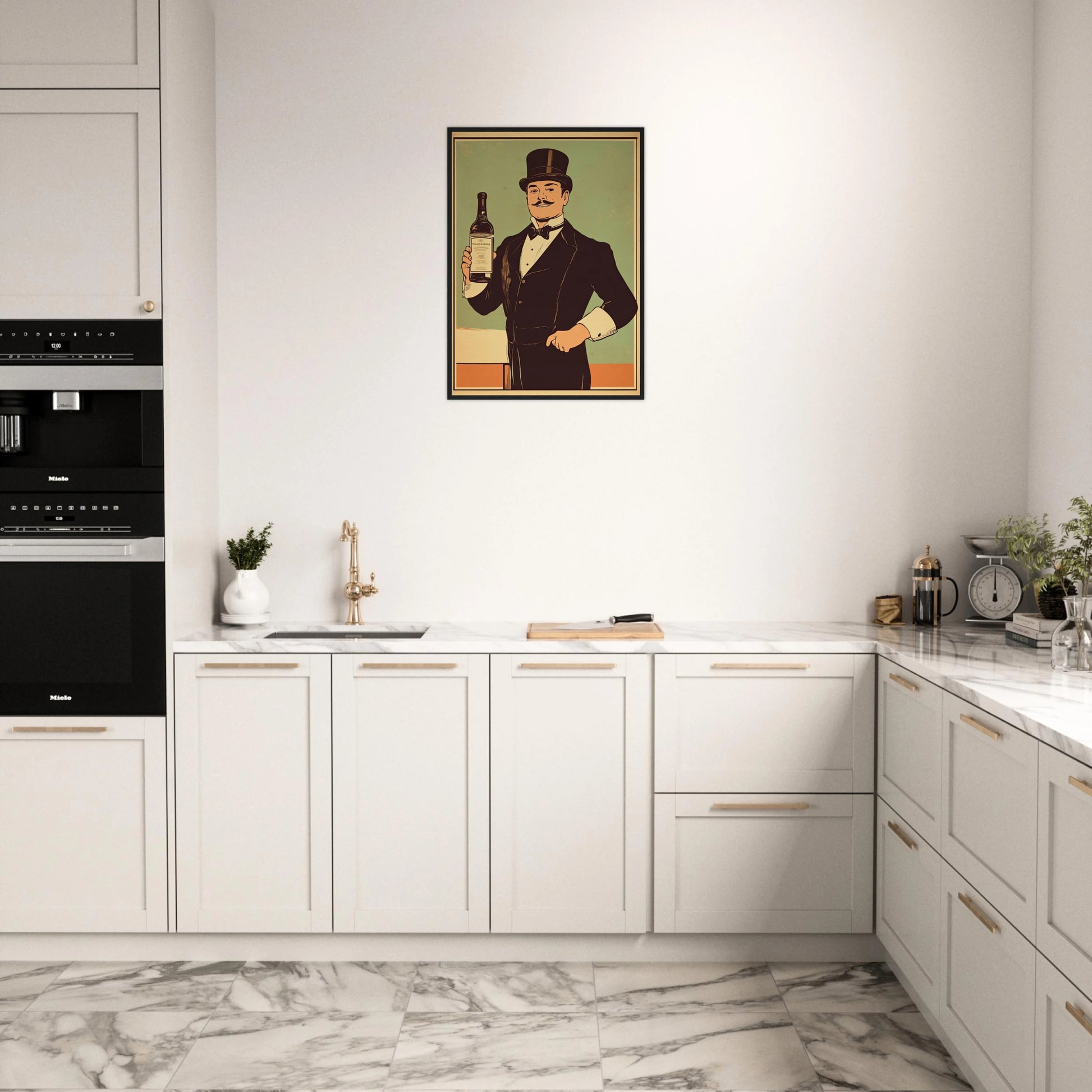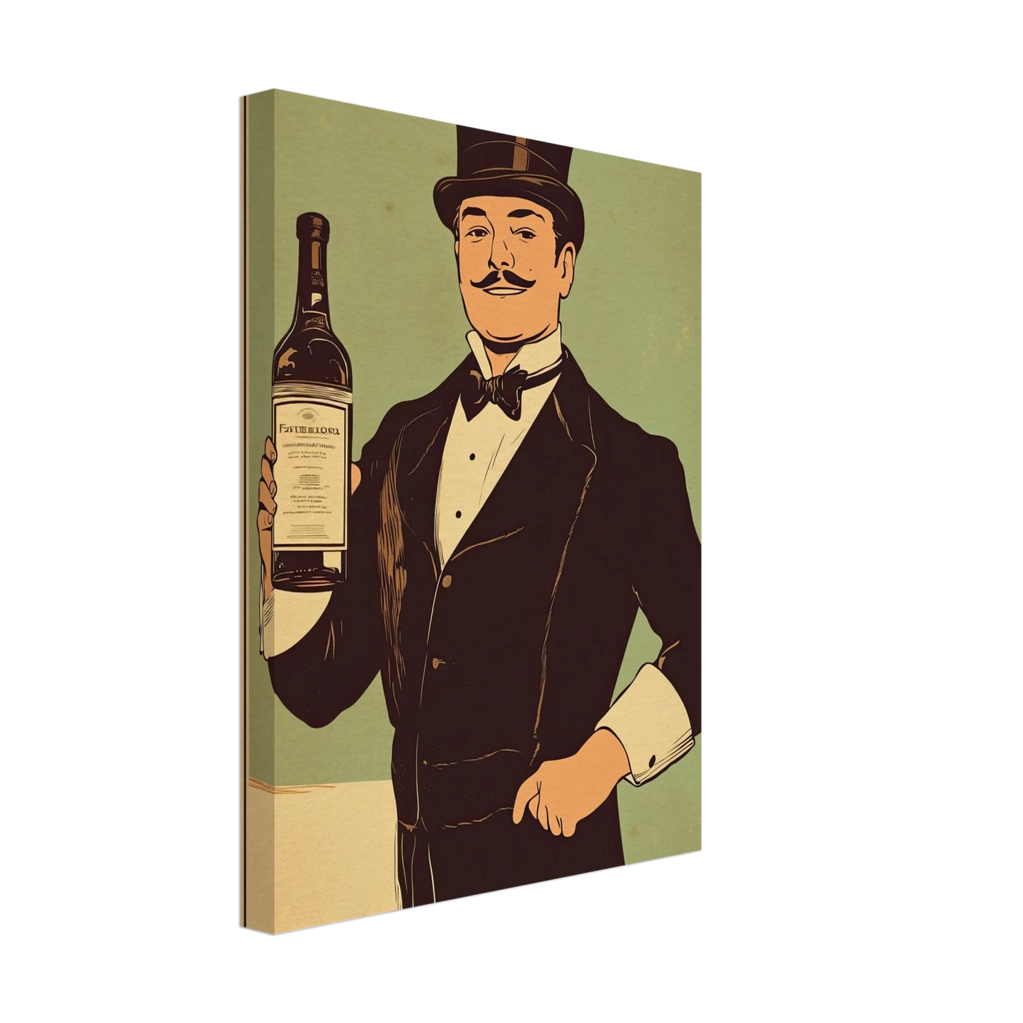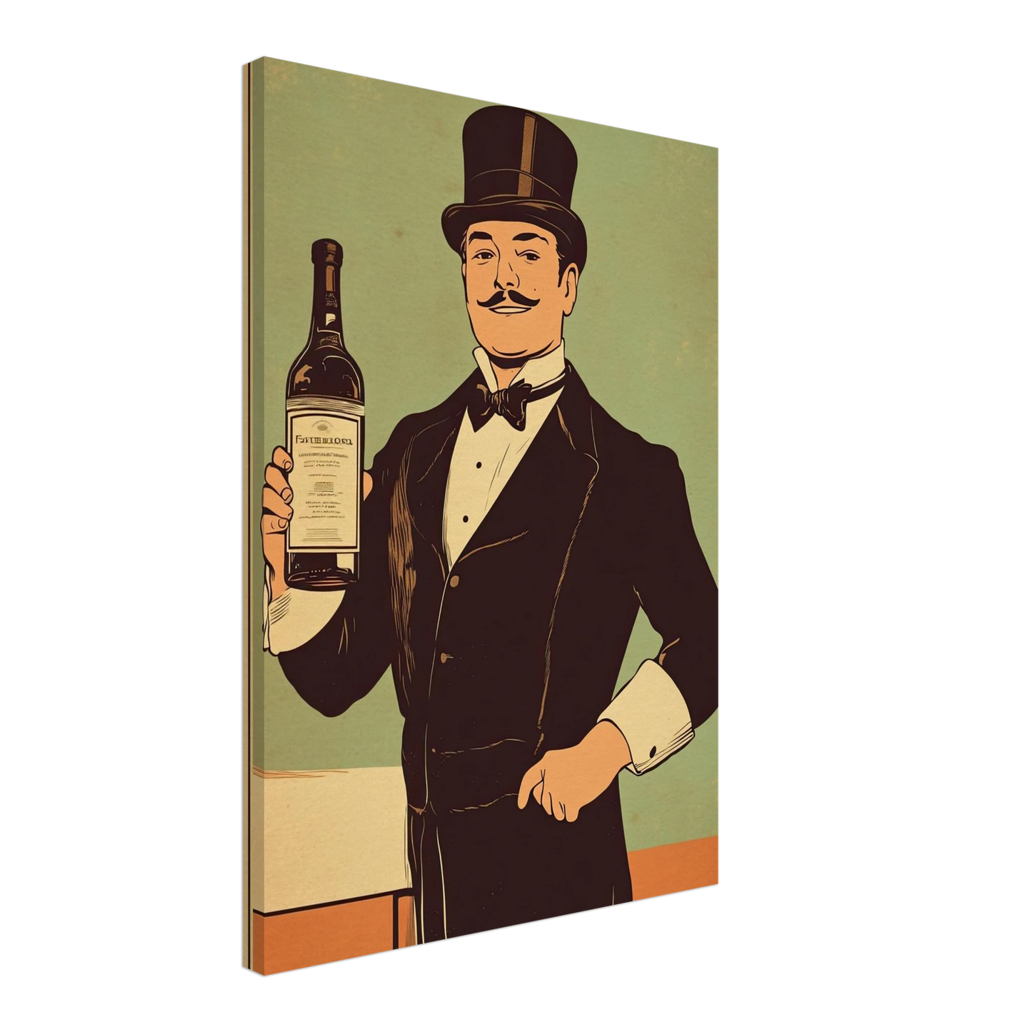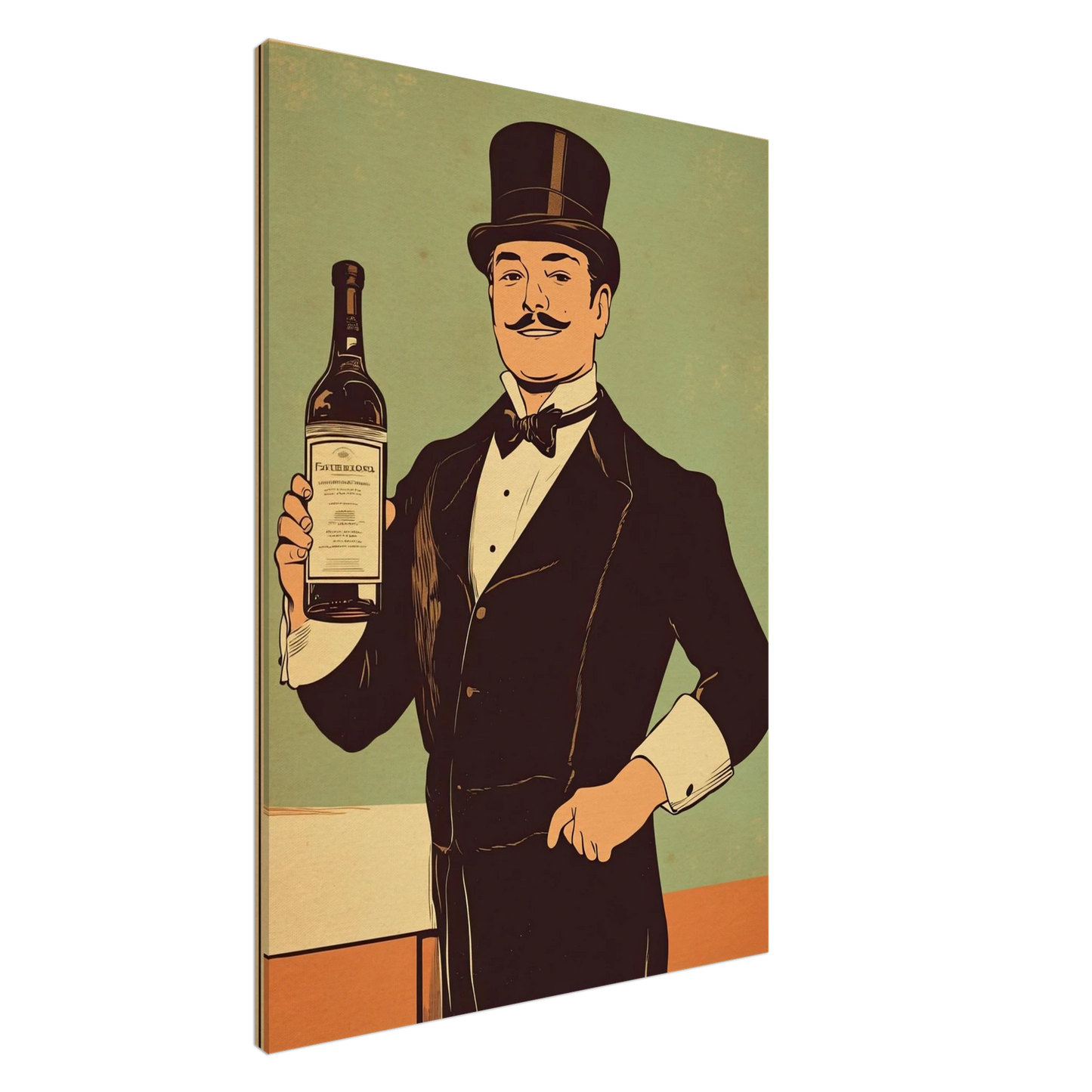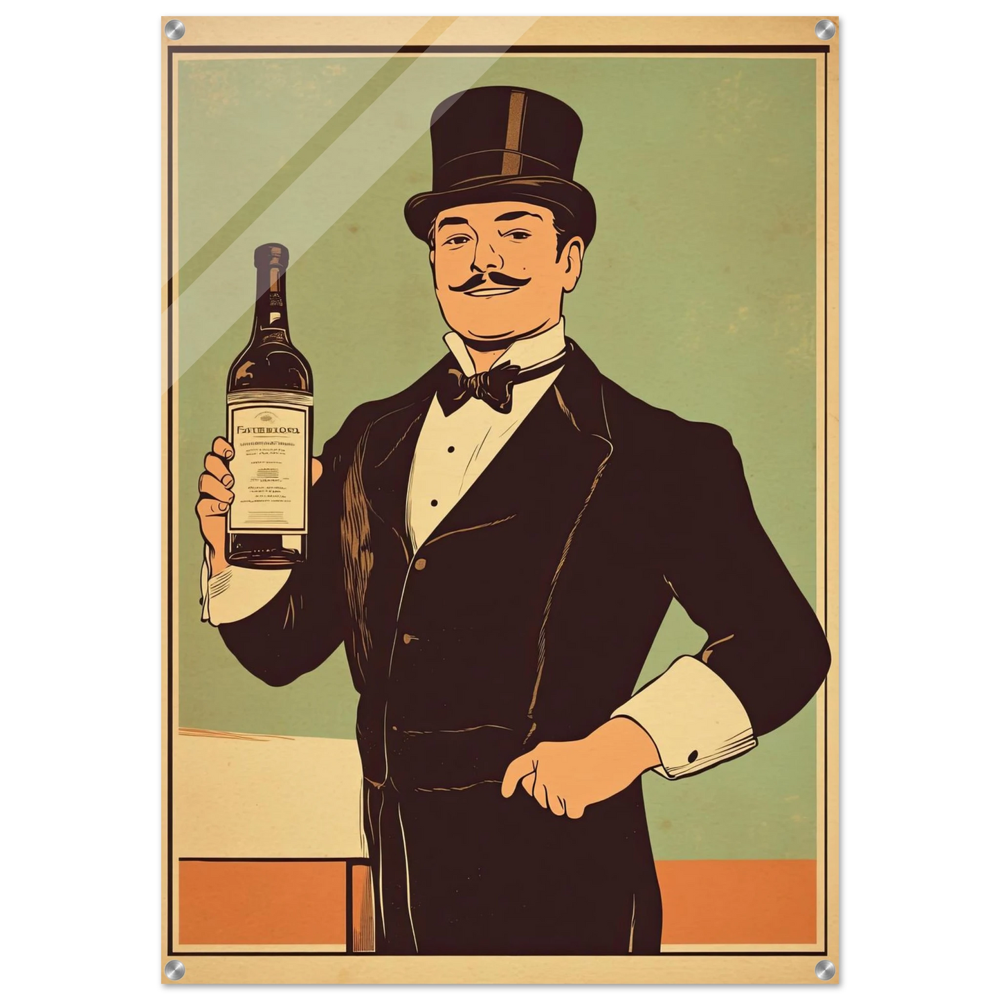 Et elegant retro-plakatmotiv som viser en smilende herre i smoking og flosshatt, stolt med en flaske i hånden. De klare linjene og den dempede fargepaletten gir kunstverket et tidløst uttrykk med luksus og sjarm. Perfekt for deg som vil tilføre interiøret en følelse av klassisk raffinement og nostalgisk eleganse.