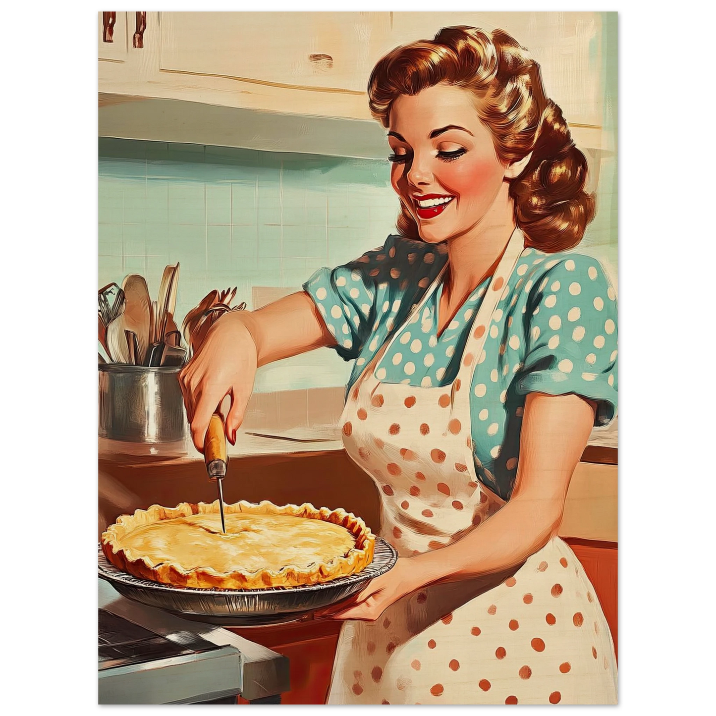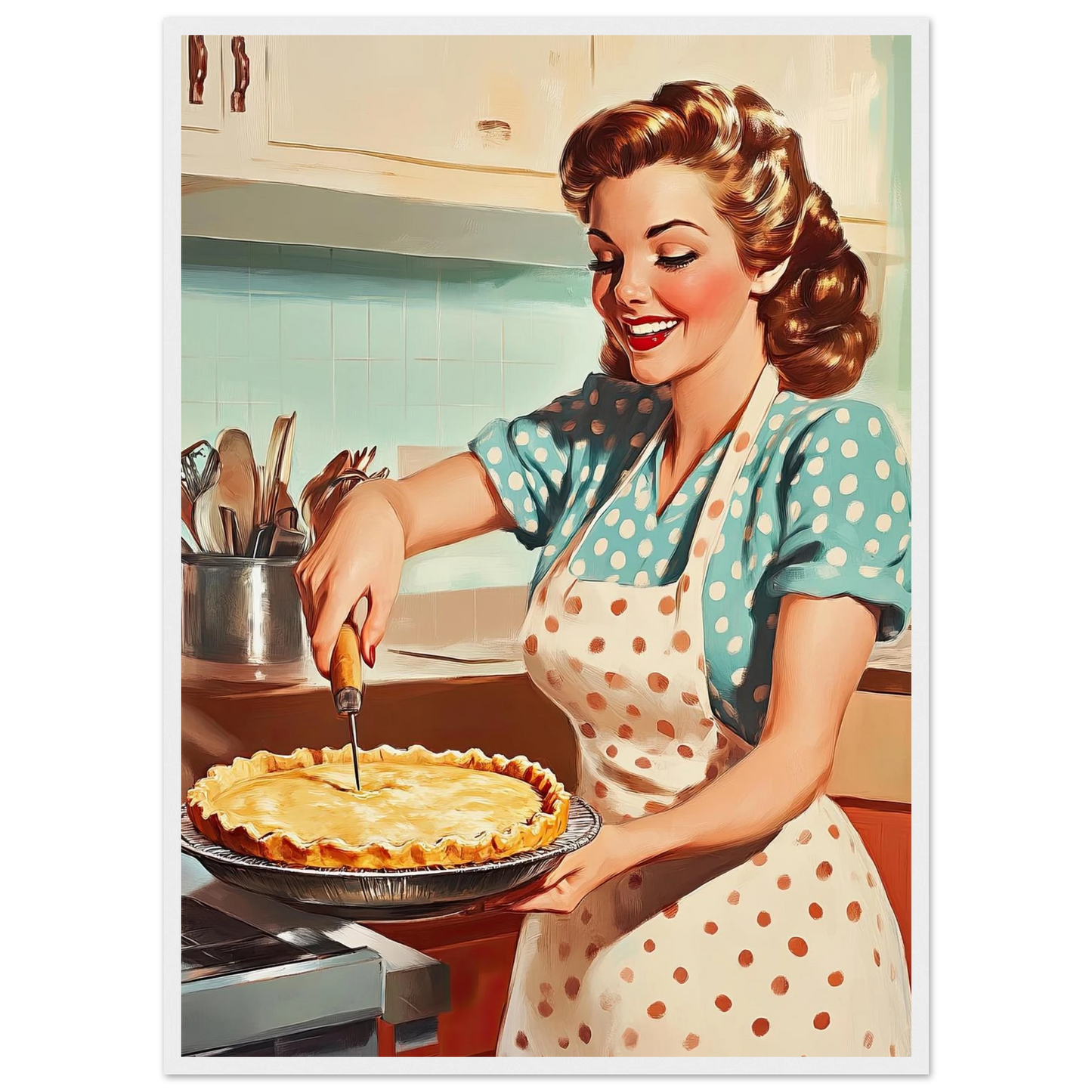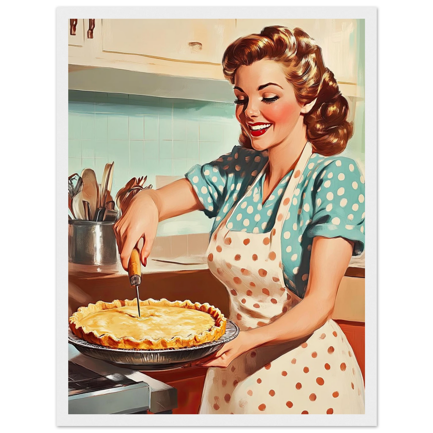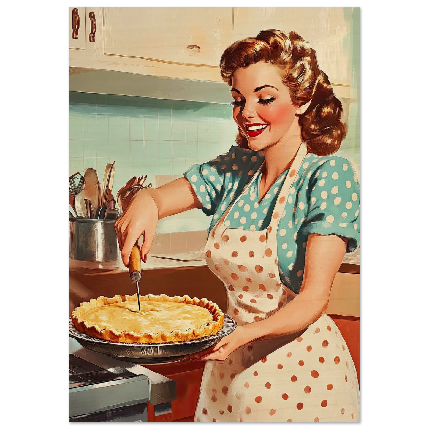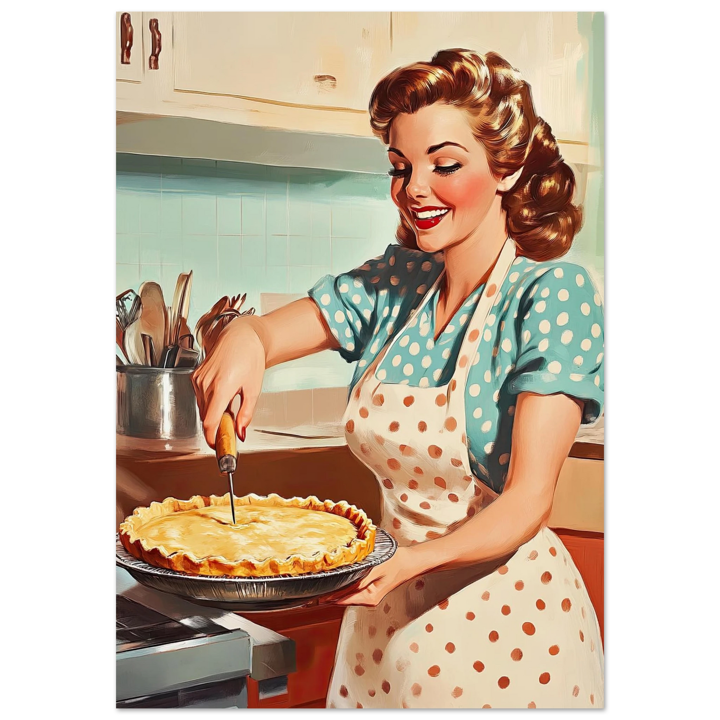 Et sjarmerende vintage-motiv i ekte 50-talls stil, med en smilende kvinne som serverer en nybakt pai på kjøkkenet. De klare fargene, de karakteristiske detaljene og den nostalgiske stemningen fanger essensen av hjemmekos og tidsriktig retro-estetikk. Perfekt kunstverk for deg som vil tilføre interiøret varme, glede og klassisk nostalgi.