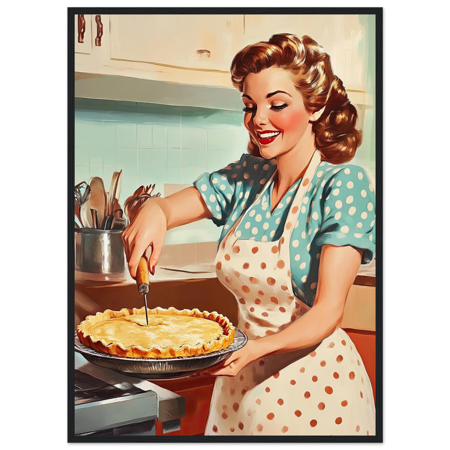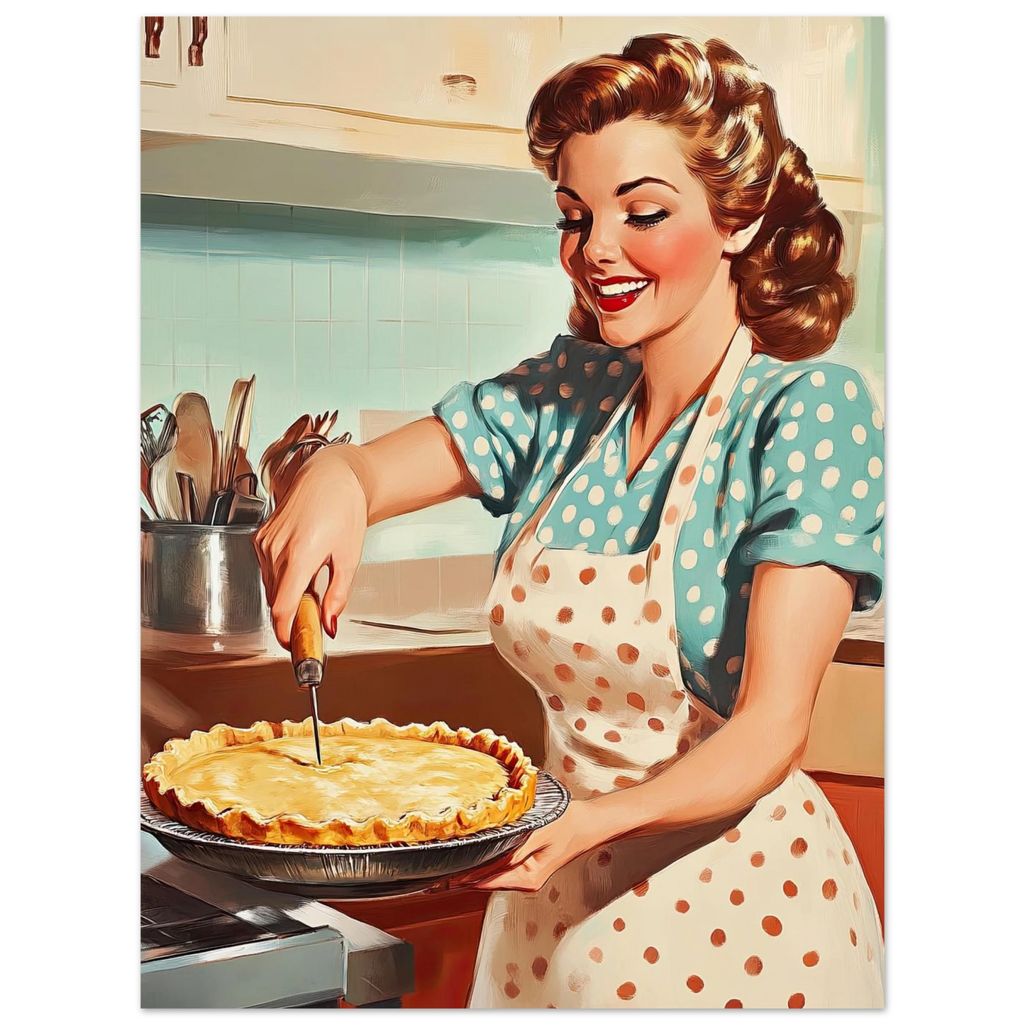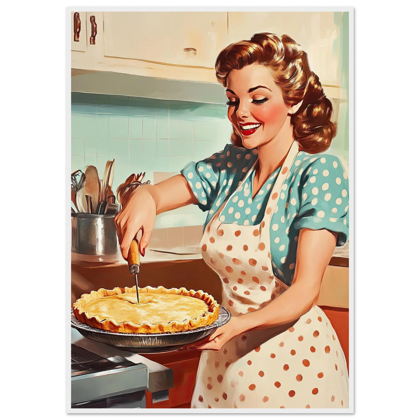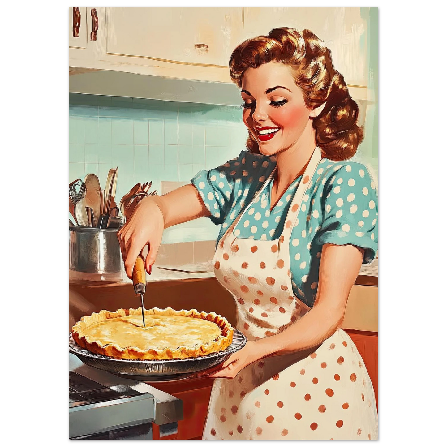 Et sjarmerende vintage-motiv i ekte 50-talls stil, med en smilende kvinne som serverer en nybakt pai på kjøkkenet. De klare fargene, de karakteristiske detaljene og den nostalgiske stemningen fanger essensen av hjemmekos og tidsriktig retro-estetikk. Perfekt kunstverk for deg som vil tilføre interiøret varme, glede og klassisk nostalgi.