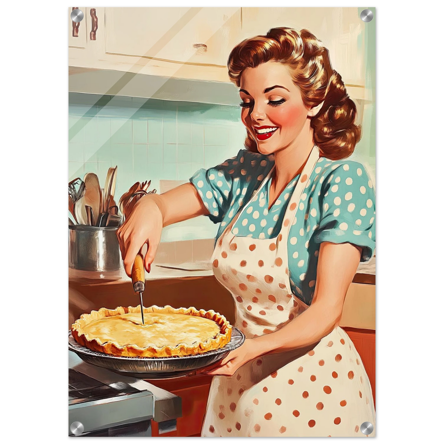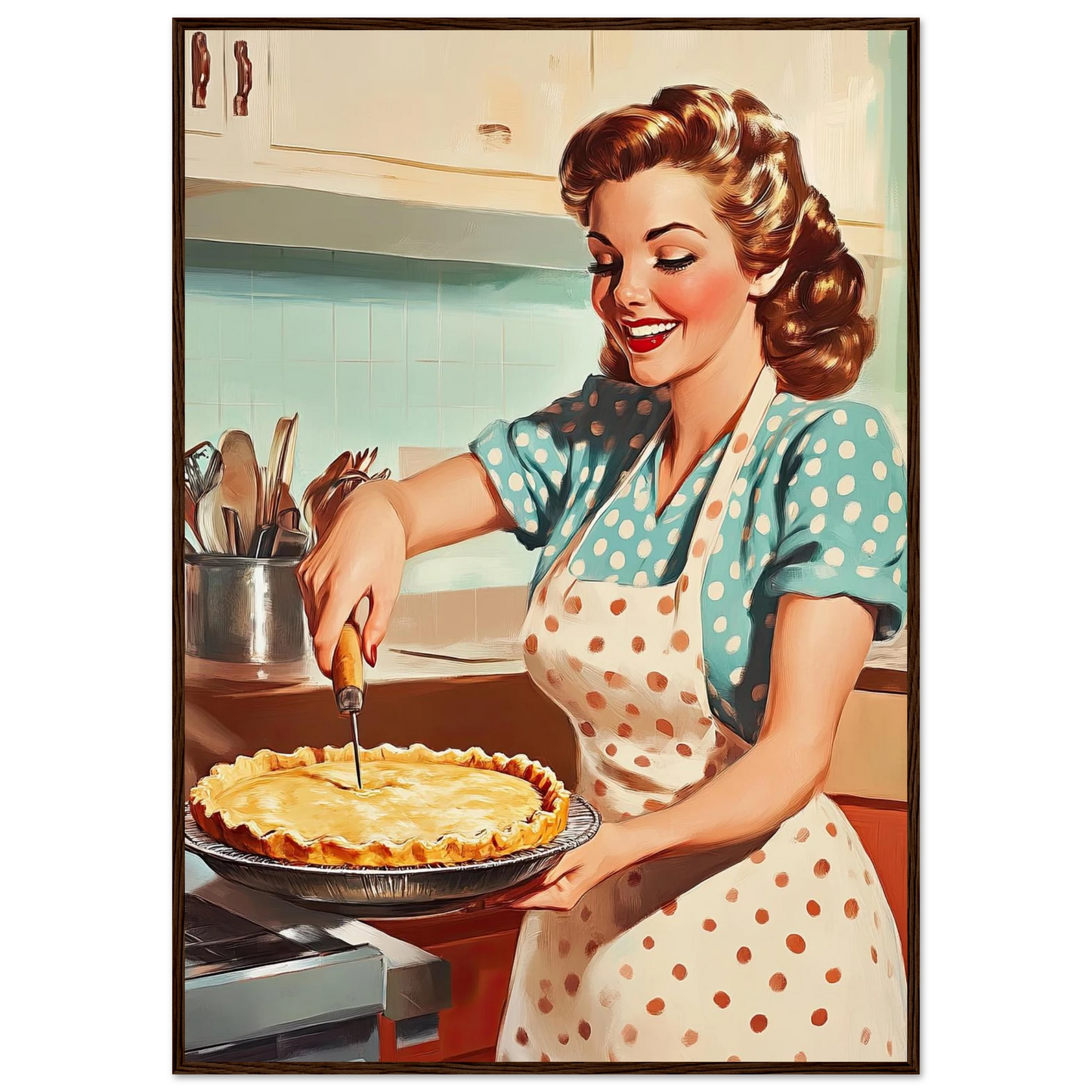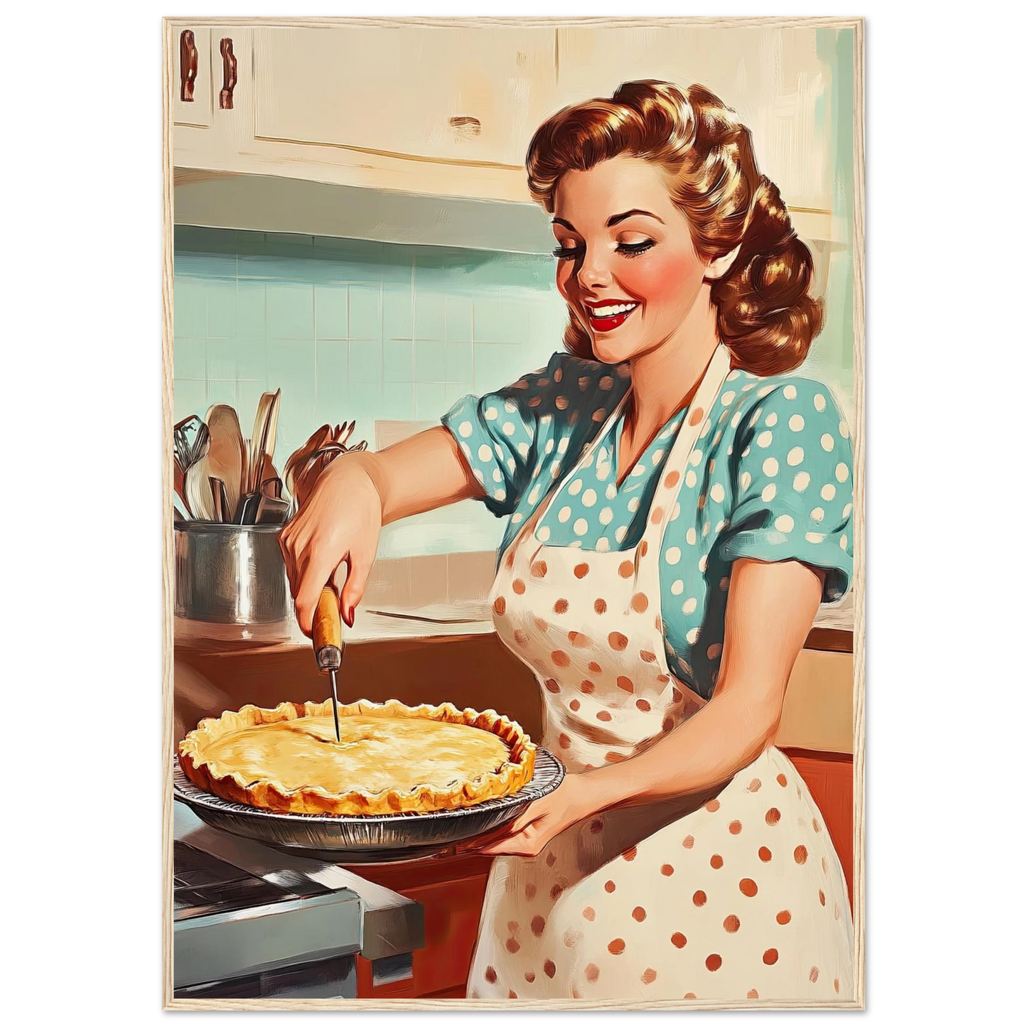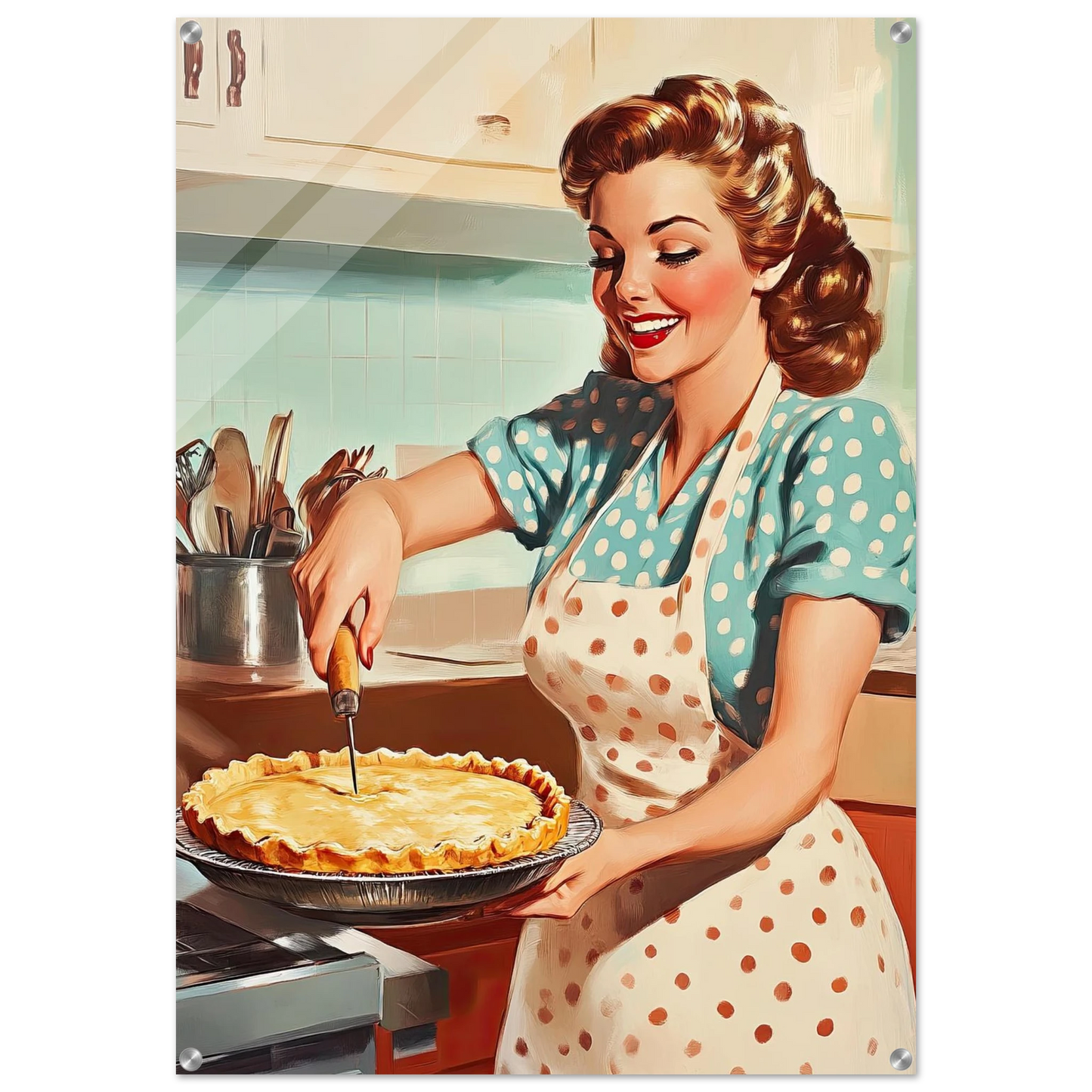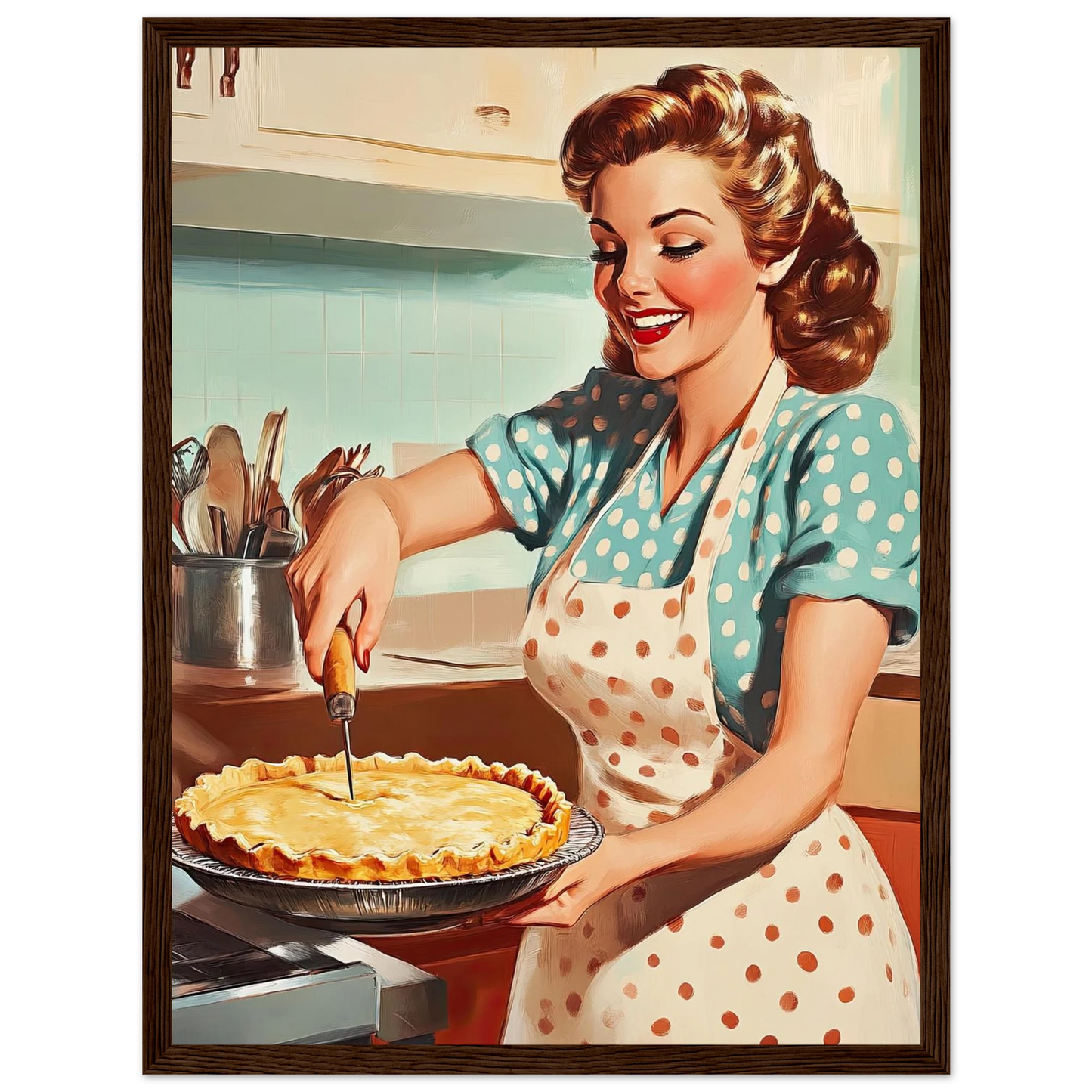 Et sjarmerende vintage-motiv i ekte 50-talls stil, med en smilende kvinne som serverer en nybakt pai på kjøkkenet. De klare fargene, de karakteristiske detaljene og den nostalgiske stemningen fanger essensen av hjemmekos og tidsriktig retro-estetikk. Perfekt kunstverk for deg som vil tilføre interiøret varme, glede og klassisk nostalgi.